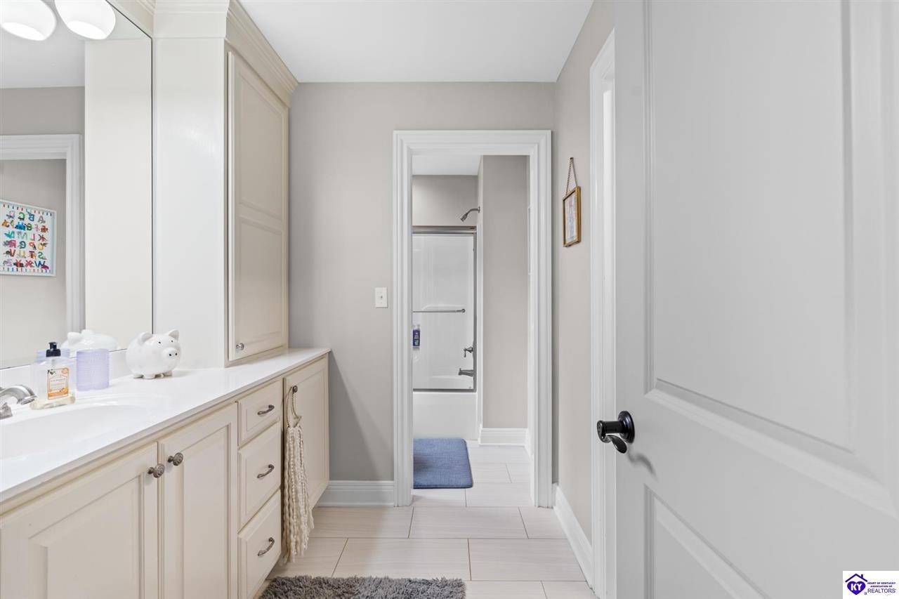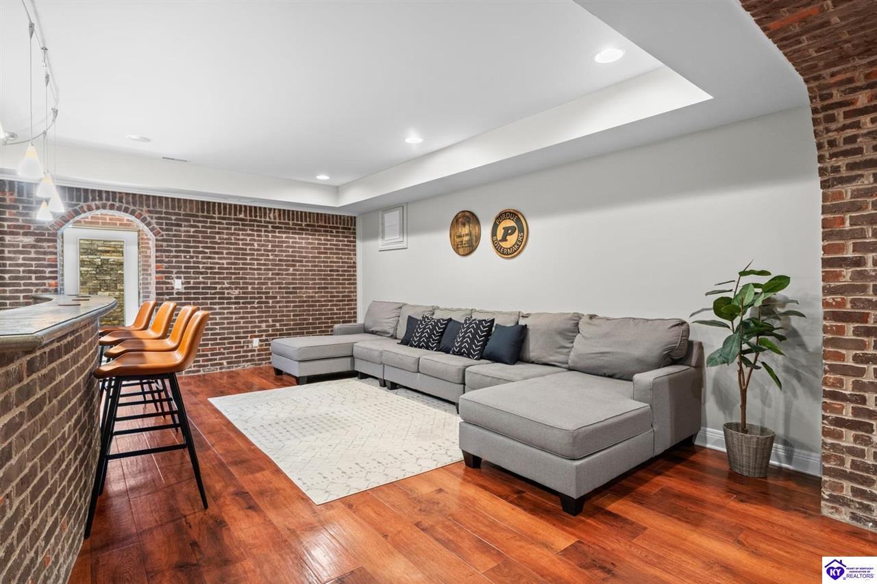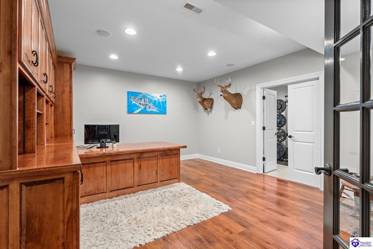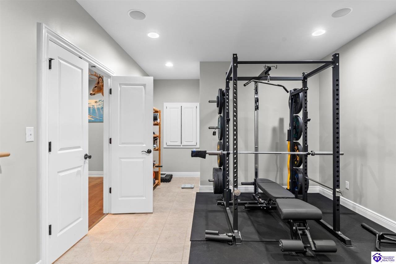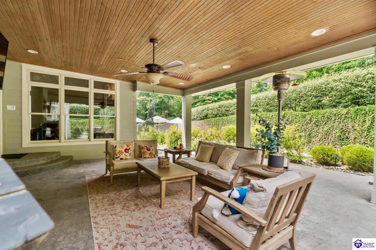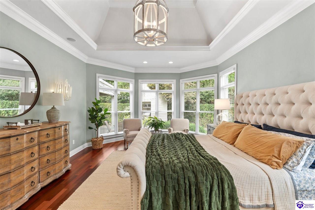 Realtor's notes: Experience refined luxury in this exceptional custom-built estate offering over 6,000 square feet of meticulously designed living space on nearly one acre situated on the Heartland Golf Course in one of Elizabethtown’s most prestigious settings. This 5-bedroom, 4 full and 2 half-bath luxury home blends timeless architecture with modern upgrades and premium finishes, complete with breathtaking golf course views. Recent improvements include a new roof (2023) on both the main residence and detached garage, whole-home generator, professional landscaping, multi-zone irrigation system, and integrated surround sound. Inside, rich hardwood floors, a dramatic two-story great room with gas fireplace, custom inlaid foyer, formal dining room, and elegant entertaining spaces create an impressive yet inviting atmosphere. The gourmet chef’s kitchen features Mouser inlaid cabinetry, marble countertops, dual islands, stainless steel appliances, and a sunlit breakfast area that opens seamlessly to a cozy family room. The main-level primary suite is a private retreat with tray ceilings, sitting area, spa-inspired bath with soaking tub, oversized tiled shower, dual vanities with dedicated makeup station, and separate walk-in closets. Upstairs, three spacious bedrooms each offer ensuite baths and access to a large bonus room. The finished walkout basement is an entertainer’s dream with a custom bourbon bar, home theater, game room, fitness room, executive office, and convenient pool bath. Step outside to your backyard oasis overlooking the golf course, featuring an expansive covered terrace with stone fireplace, built-in Firemagic outdoor kitchen, heated saltwater pool with fountains and waterslide, and professionally landscaped grounds, perfect for hosting and relaxing alike. A 2.5-car attached garage and oversized detached garage with upper loft storage complete this move-in ready, resort-style property. Luxury, privacy, golf course living, and prime Elizabethtown location near shopping, dining, and Fort Knox, this is more than a home, it’s a lifestyle.