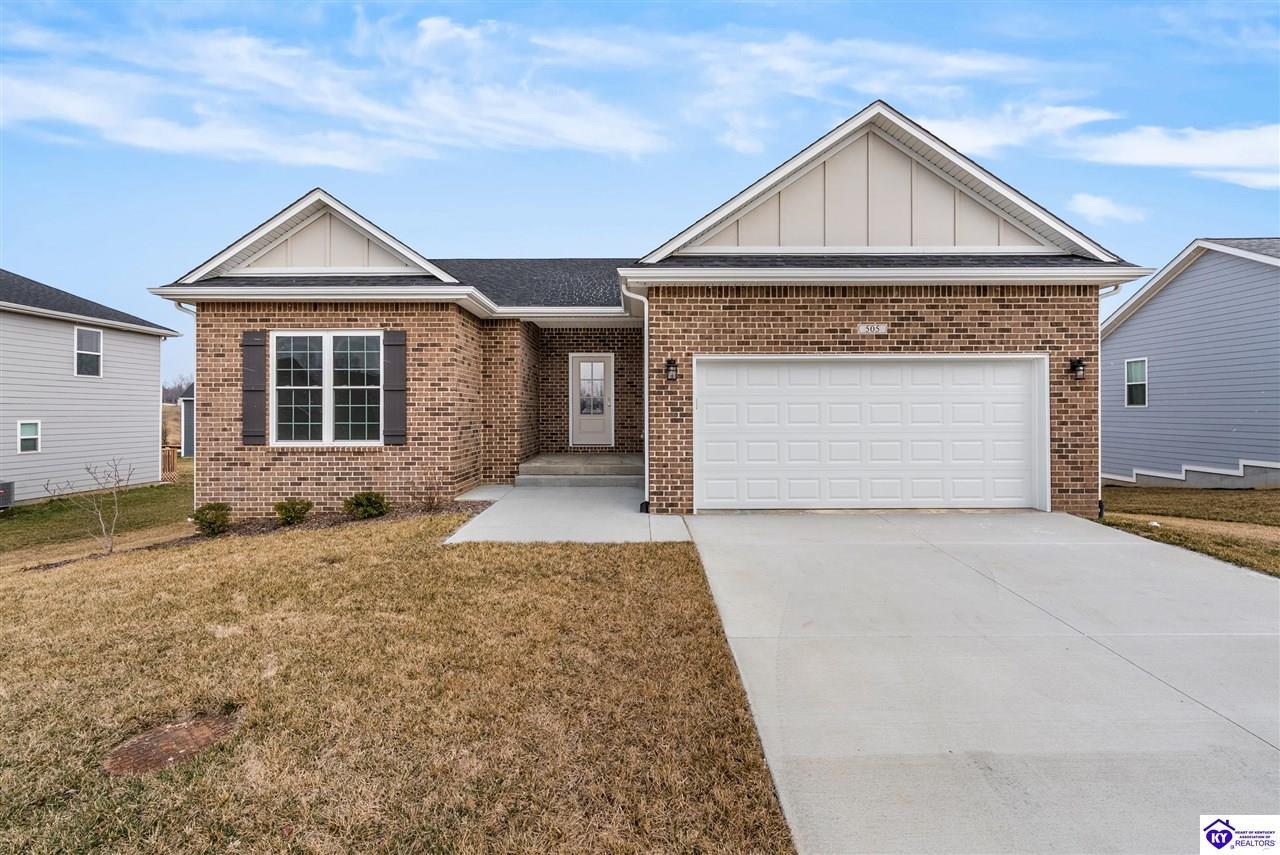Realtor's notes: Seller offering up to $8,500 in buyer concessions with acceptable offer! Stunning new construction 3 bedroom, 2 bath home in one of Elizabethtown's most sought-after neighborhoods, built by a respected local builder and designed with today's buyer in mind. This move-in ready home combines quality craftsmanship, modern finishes, and expansion potential—perfect for first-time home buyers, growing families, or anyone searching for new construction in Elizabethtown, KY. Step inside to an open-concept floor plan featuring hardwood floors in the great room, kitchen, dining area, and hallway. The spacious living room offers flexible layout options ideal for entertaining or relaxing. The fully appointed kitchen includes stainless steel appliances, granite countertops, white shaker-style cabinets, a pantry, and ample prep space. The combined kitchen and dining area provides plenty of room for gatherings with family and friends. The primary suite easily accommodates a king-size bed and offers a private en-suite bath with a tiled shower and cultured marble vanity top. Two additional bedrooms feature comfortable carpet flooring, while both bathrooms include durable ceramic tile floors. Downstairs, the unfinished walk-out basement adds incredible value and equity potential. Already rough-plumbed for a full bathroom, this space is ready to be finished into a fourth bedroom, additional living area, home office, gym, game room, or media room—allowing you to customize the home to fit your needs. A radon mitigation system has already been installed for added peace of mind. The yard offers great outdoor space, and the location is hard to beat—just minutes from shopping, dining, schools, and major employers. Conveniently located near Fort Knox and the Blue Oval SK Battery Park, this home provides easy access for commuters while still enjoying a desirable residential setting. If you're searching for a new construction home in Elizabethtown with granite countertops, hardwood floors, an unfinished walk-out basement, and seller-paid concessions, this property checks all the boxes. Schedule your private showing today before it's gone.