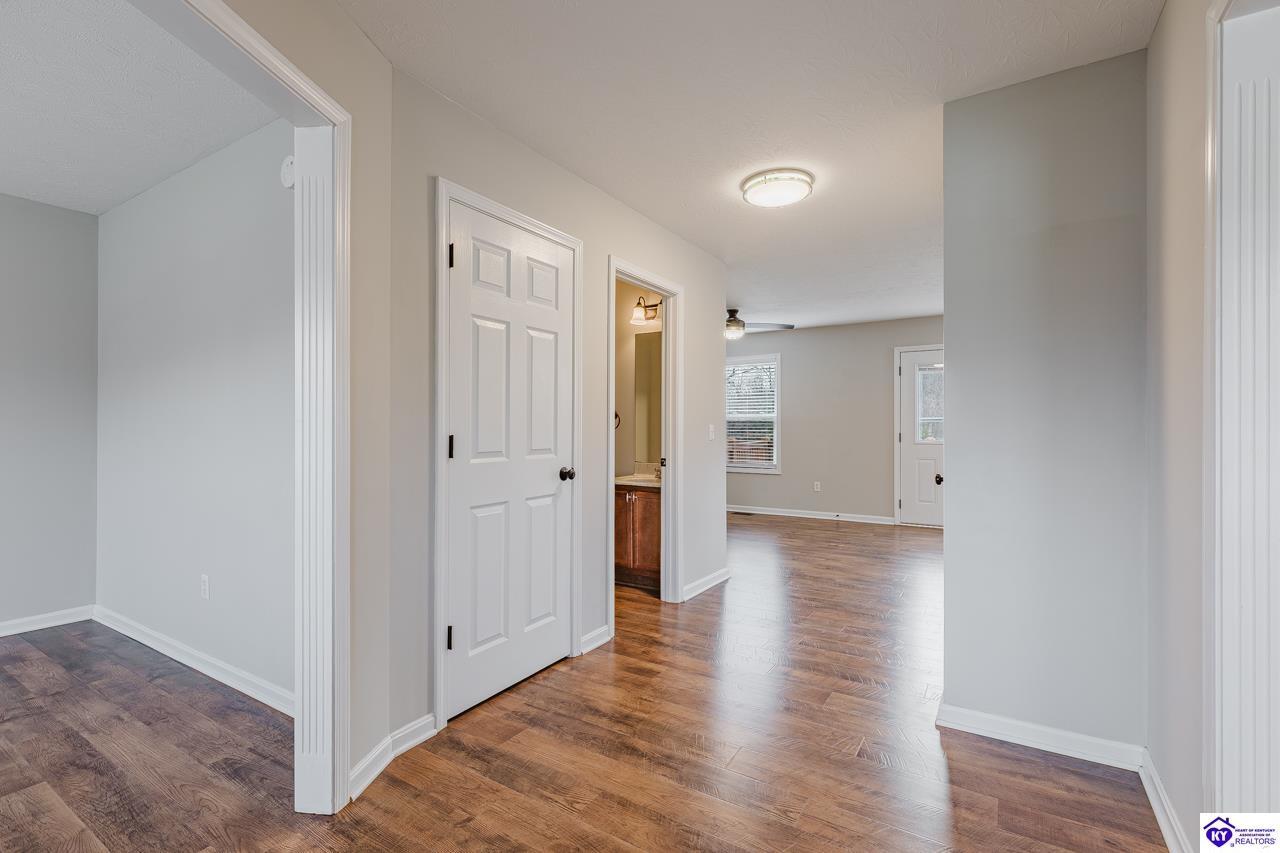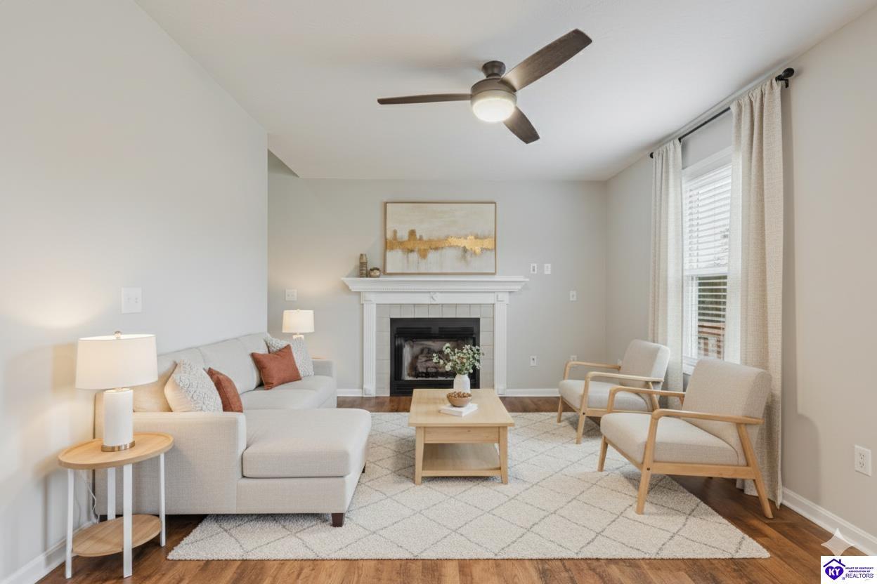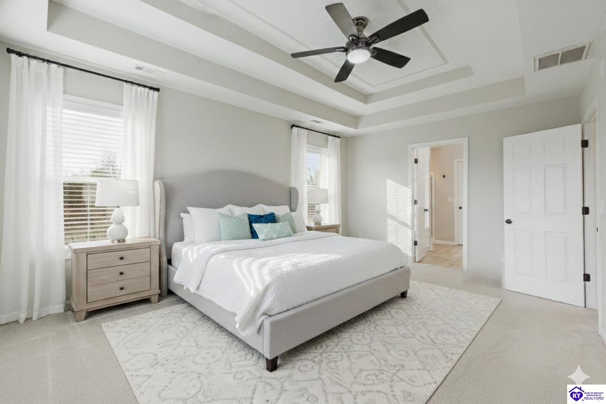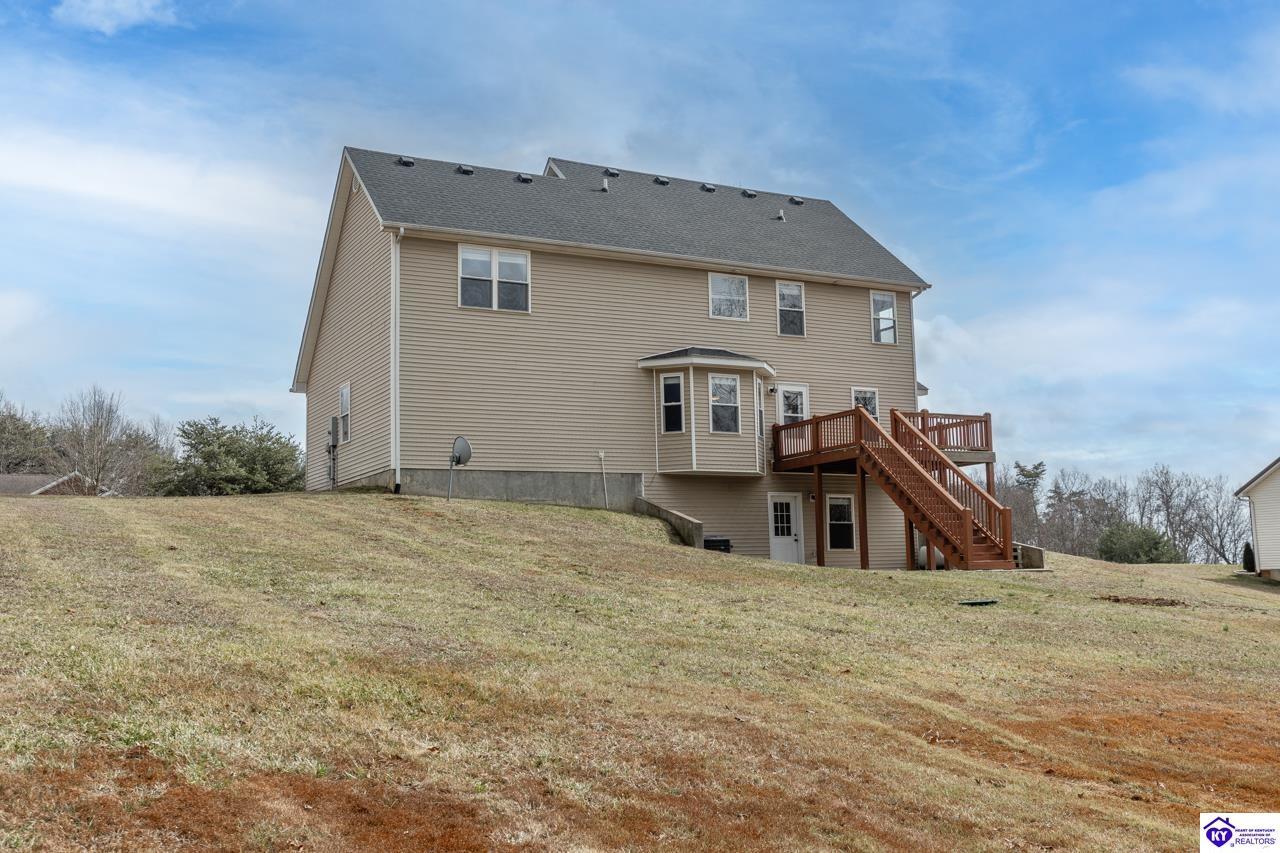 Realtor's notes: Located in the heart of Rineyville, 212 Berkshire Avenue is a stunning two-story residence that offers a versatile floor plan designed for modern living and functional comfort. The main level features a bright, expansive living area centered around a cozy fireplace, a sun-filled eat-in kitchen with a separate formal dining room, a convenient half bathroom, and a flexible extra room perfect for a quiet home office or study. Upstairs, the property boasts four spacious bedrooms and a full bathroom. It is highlighted by a generous primary retreat featuring an elegant tray ceiling, a massive walk-in closet, and a spa-like private bathroom complete with double vanities, a walk-in shower, and a separate soaking tub accented by a beautiful tile feature. The finished walk-out basement provides significant additional square footage with a large secondary living space, a third full bathroom, and a dedicated laundry area. For storage solutions, there are separate storage rooms. Plus, the basement features a versatile multi-use room perfect for a home gym, craft area, or media space. Outdoor enthusiasts will appreciate the large back porch accessible from the main living area, which leads down to an expansive, backyard ideal for activities and relaxation. With its combination of substantial living space, classic interior layout and generous outdoor appeal, this Rineyville home is a standout choice for those seeking comfort and convenience near Elizabethtown and Fort Knox.