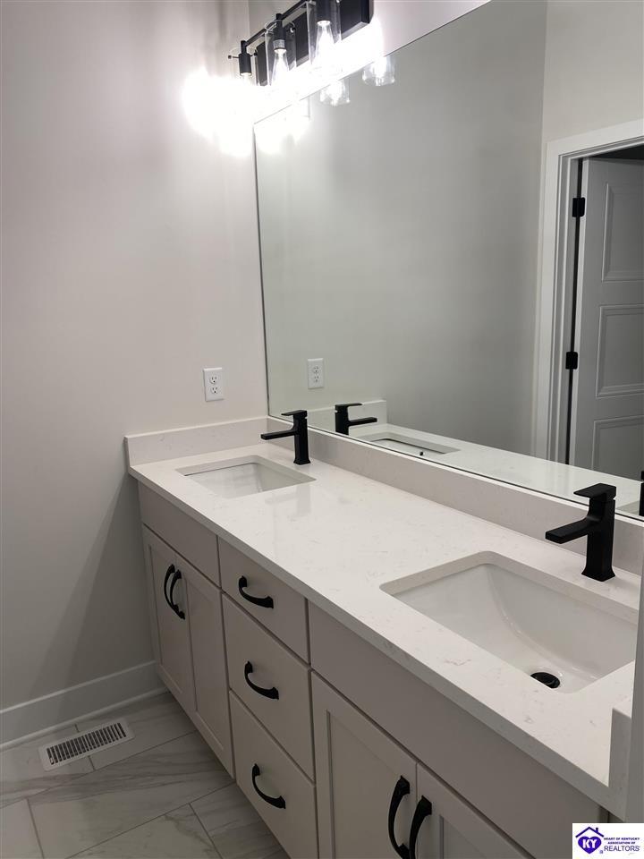 Realtor's notes: Welcome to this exceptional new construction custom-built brick ranch, ideally located just minutes from local hospitals, premier shopping, dining, and Fort Knox. Offering 2,454 square feet of thoughtfully designed living space, this 3-bedroom, 2.5-bath home combines timeless craftsmanship with modern efficiency. Soaring 9- and 10-foot ceilings create an open, airy feel, while hardwood flooring flows seamlessly throughout the main level. Every bedroom features custom-designed closets, and quartz countertops are showcased throughout the entire home, adding elegance and durability to every space. The heart of the home is equipped with premium GE Café appliances, including a gas range, perfect for both everyday cooking and entertaining. Energy efficiency and comfort were top priorities in construction, featuring a dual-fuel furnace, foam insulation, and additional insulation in interior bedroom and bathroom walls for enhanced soundproofing. A spacious laundry room adds convenience, and the oversized two-car garage provides ample storage. Step outside to enjoy the backyard, complete with a walking path that leads directly to the local sports park—ideal for recreation and outdoor enjoyment. The full basement offers an additional 1,600 square feet that can be finished to include a fourth bedroom and third full bath. The listing price reflects this additional potential living space, providing a valuable opportunity for expansion and increased equity. Currently offered at $684,000 with the basement unfinished, this home represents outstanding quality, comfort, and location in one remarkable package.