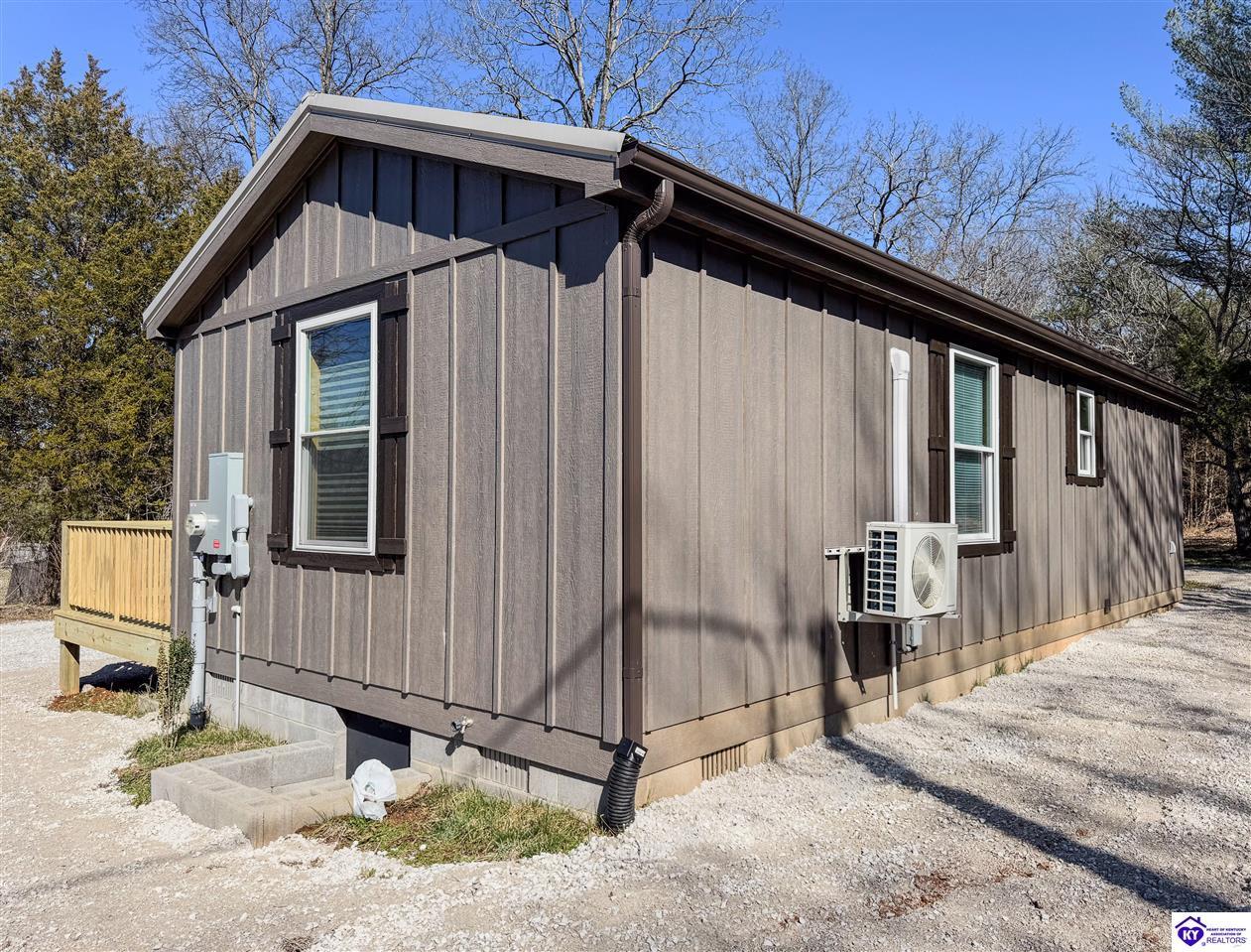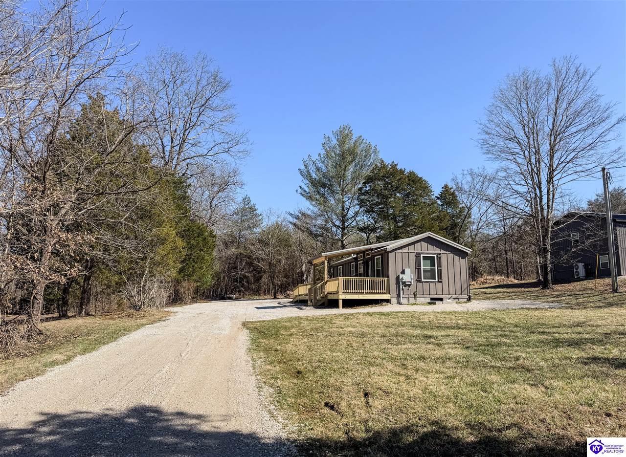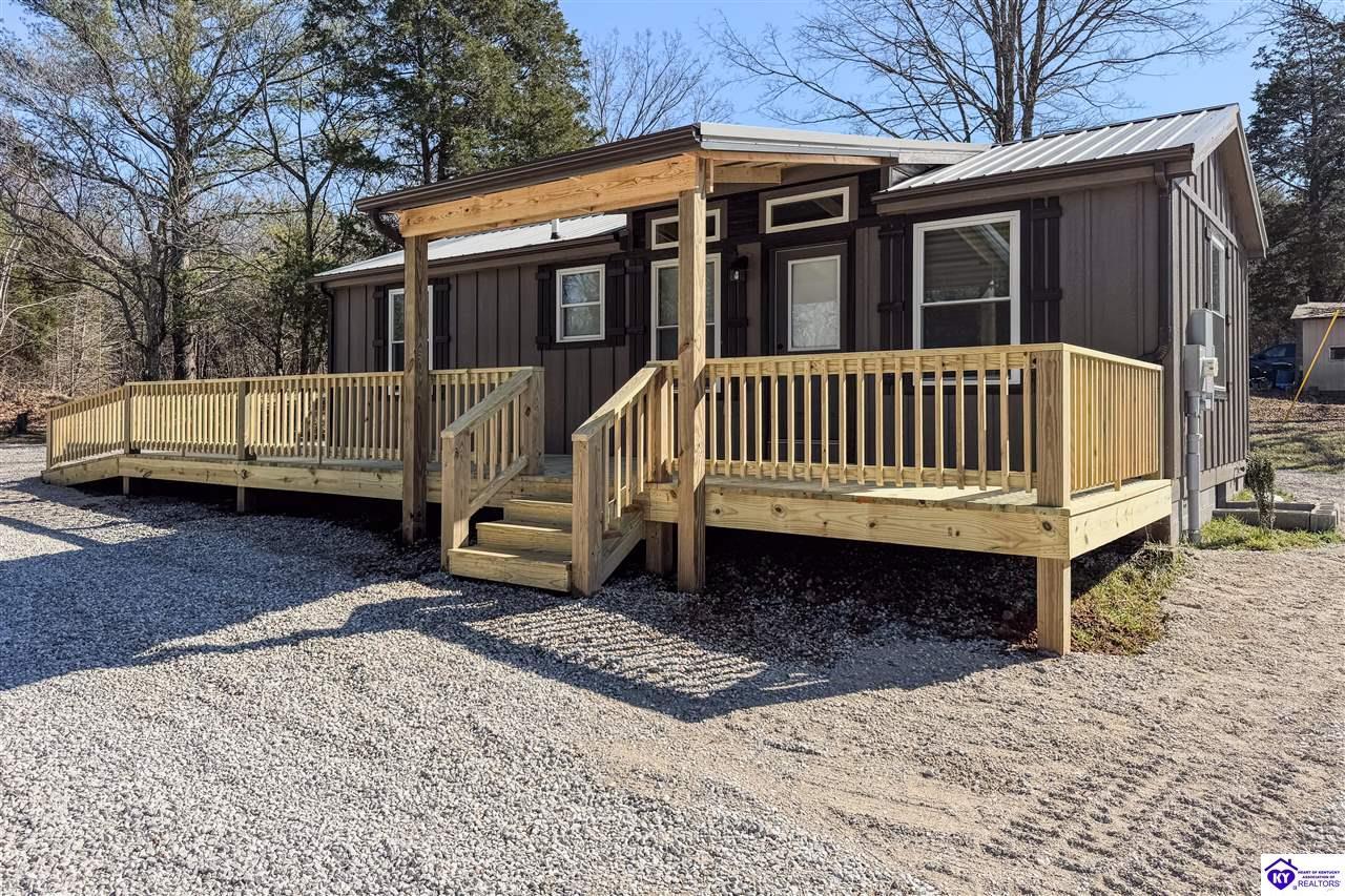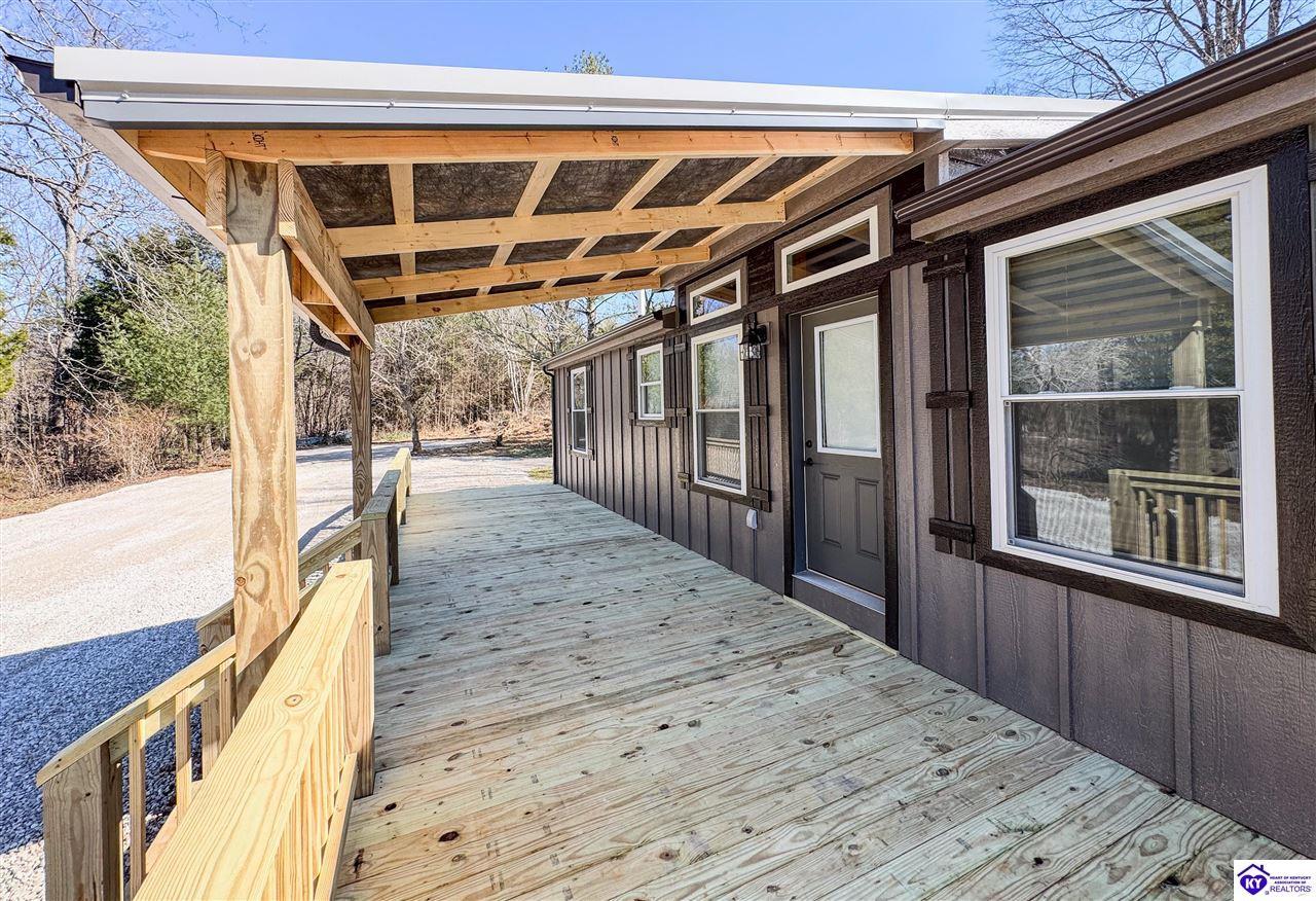 Realtor's notes: Relisted with New Seller — No Fault of the Property! Seller offering a $2,500 allowance toward appliances. This beautifully crafted Amish-built cabin offers the perfect blend of rustic charm and modern efficiency. Featuring 2 bedrooms and 1 full bath, this cozy home is situated in a peaceful, private setting while remaining conveniently located near local amenities and recreational attractions. Recent improvements include a newly constructed deck with covered overhang, providing the ideal space for outdoor relaxation and entertaining. The property also features wheelchair-accessible entry and a new turnaround driveway, allowing for easy access and convenient parking. The interior showcases warm wood finishes throughout, creating an inviting cabin atmosphere suitable for full-time living, a weekend retreat, or a short-term rental opportunity. Efficient heating and cooling systems provide year-round comfort with low-maintenance living. Located approximately 15 minutes from Nolin Lake and Wax Marina, this property offers excellent access to boating, fishing, and outdoor recreation, making it an ideal personal getaway or investment opportunity. Schedule your private showing today.