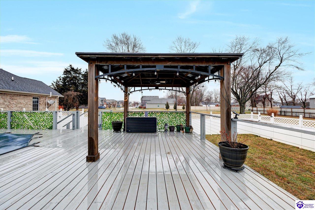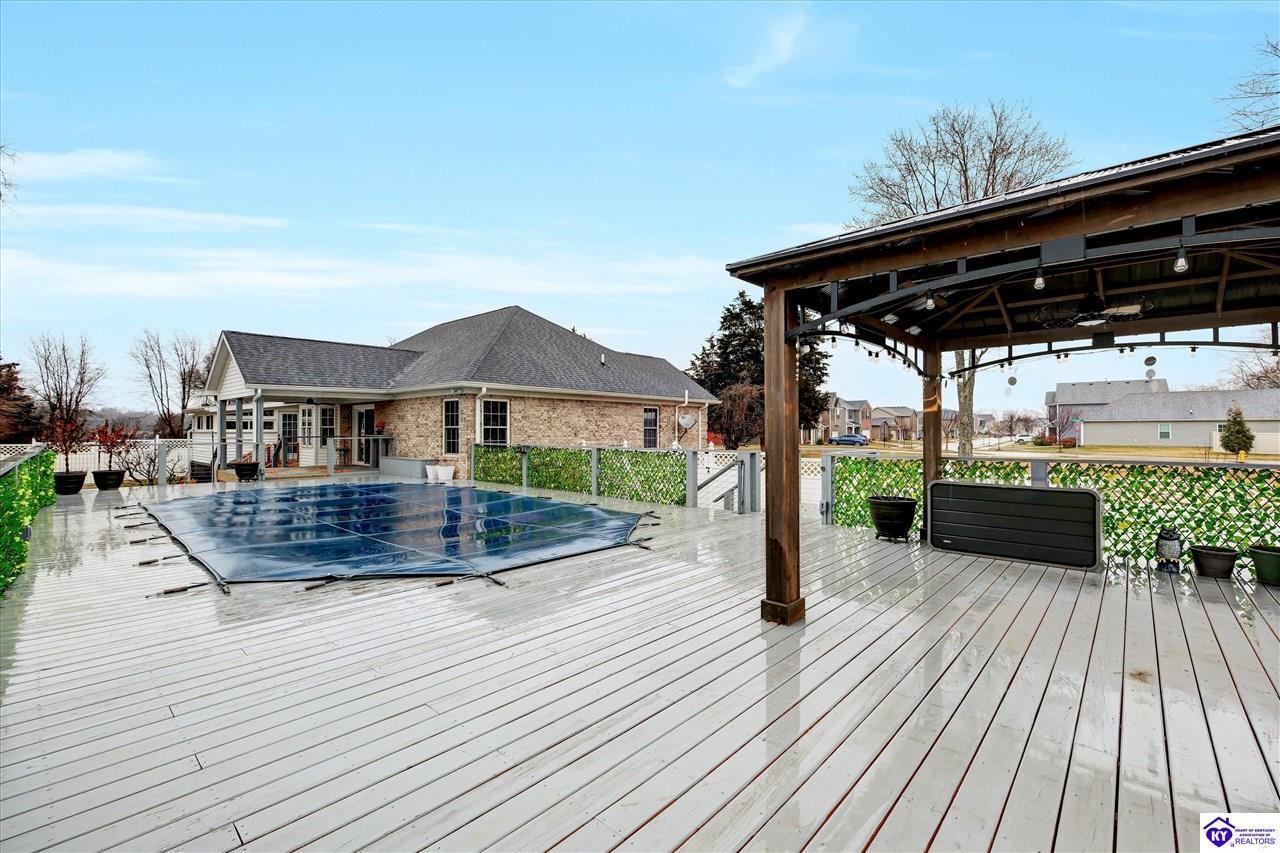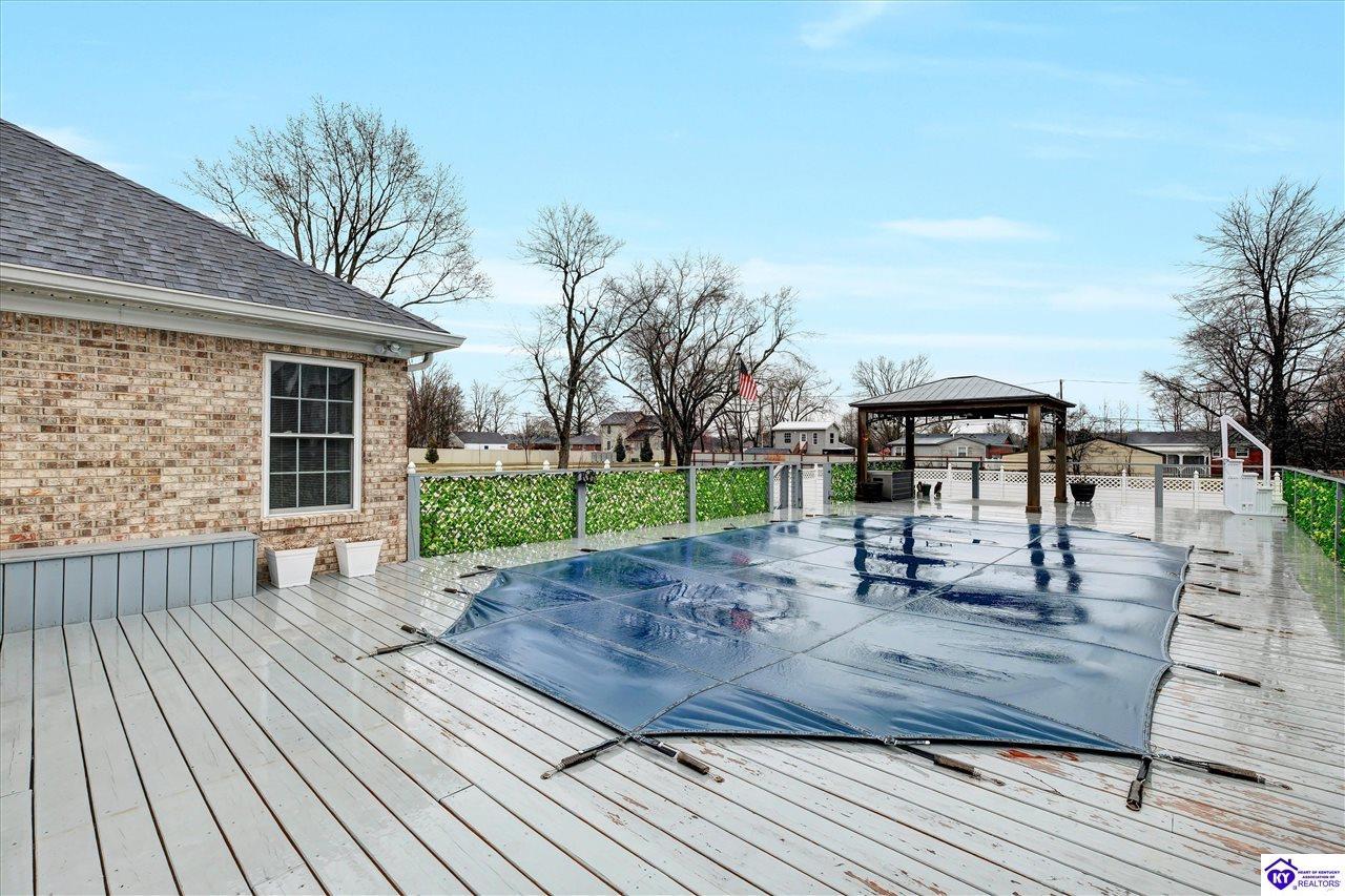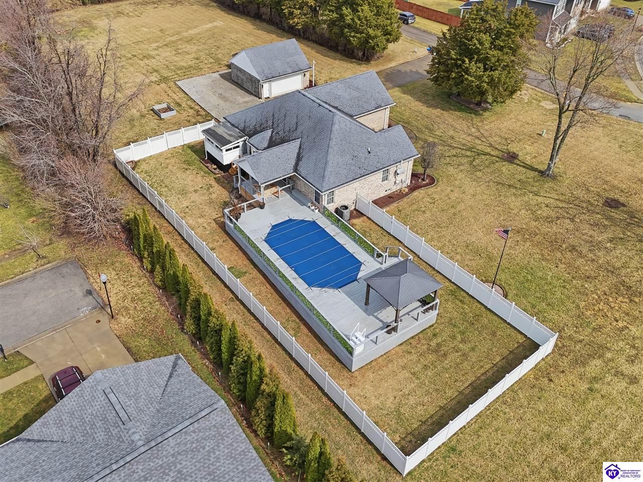Realtor's notes: Welcome to this stunning ranch-style home, where comfort meets style in an inviting open floor plan with split bedrooms. Nestled on a spacious 1.3 acre lot, this property features a privacy fenced backyard, making it a perfect retreat for outdoor living. The hip vaulted ceilings in the expansive great room, complete with a cozy fireplace, create an atmosphere ideal for family gatherings and entertaining. The gourmet kitchen boasts lots of workspace, stainless finished appliances, and a cozy bayed nook area that's perfect for casual dining. Retreat to the luxurious primary suite, which features a bonus sitting area and a private entrance to the expansive rear deck & heated pool area. Perfect for late night swims or stargazing. The back yard oasis is designed for year-round enjoyment, with ample decking that offers plenty of space for lounging and entertaining. A covered area provides the perfect option to easily screen in, allowing for comfortable outdoor living while enjoying the beauty of your surroundings. The pampering primary bath offers a whirlpool tub, a separate shower, a water closet, and double sinks, ensuring a serene space for relaxation. On the opposite side of the home, you'll find two additional bedrooms and a full bath, providing privacy and convenience for family or guests. With low-maintenance LVP flooring throughout, this home is as practical as it is beautiful. The functional layout continues with a laundry room conveniently located adjacent to the kitchen and garage. The finished lower level is a true gem, featuring a kitchenette/wet bar and five additional rooms that can be tailored to your needs, be it an office, exercise area, or craft room, along with a third full bath for added convenience. With an attached two-car garage and a detached two-car garage, this property is perfect for hobbyists, mechanics, or car enthusiasts. Security system and cameras will remain. This home beautifully blends comfort, style, and functionality, making it a must see. Schedule your visit today, you won't be disappointed!