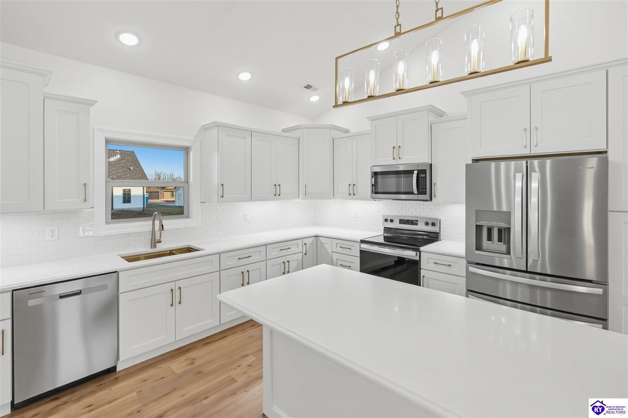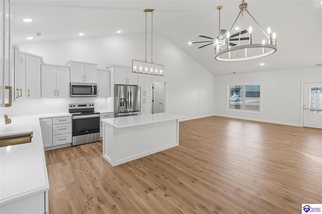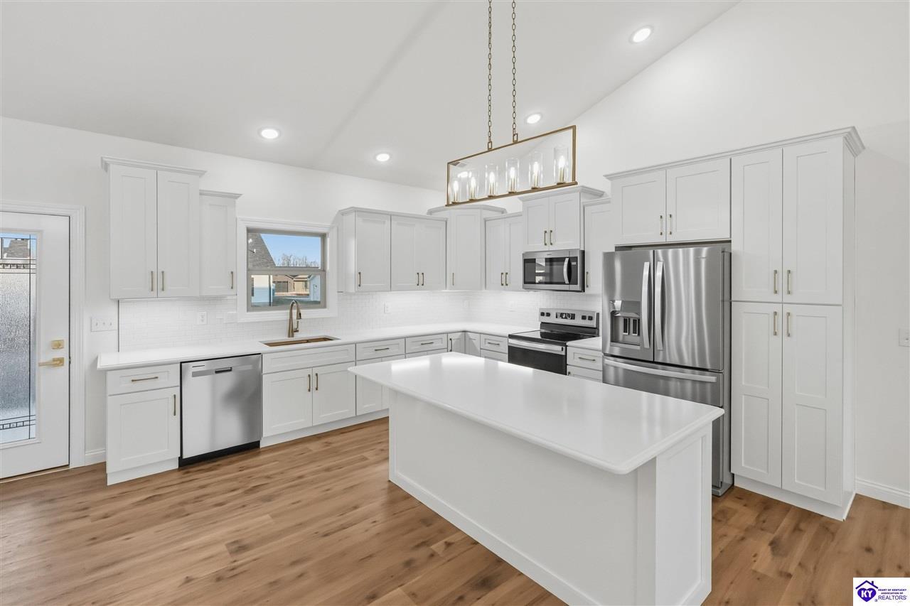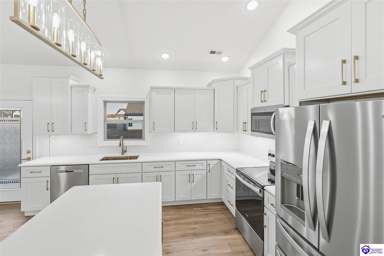 Realtor's notes: Welcome to this beautiful home located in the desirable Miller Woods Subdivision, conveniently situated within the city limits of Brandenburg. This 3 bedroom, 2 bathroom home offers 1,579 sq ft of living space with a spacious open floor plan designed for comfortable living and entertaining. The main living area flows seamlessly into the kitchen and dining space, featuring gorgeous cabinetry and plenty of room to gather with family and friends. Step outside and enjoy both a covered front porch and a covered patio, perfect for relaxing, entertaining, or enjoying your morning coffee. With its thoughtful layout and inviting outdoor spaces, this home offers the perfect blend of comfort and functionality. Enjoy the convenience of being close to local schools, shopping, dining, and everything Brandenburg has to offer while still enjoying the peaceful setting of a well-established neighborhood.