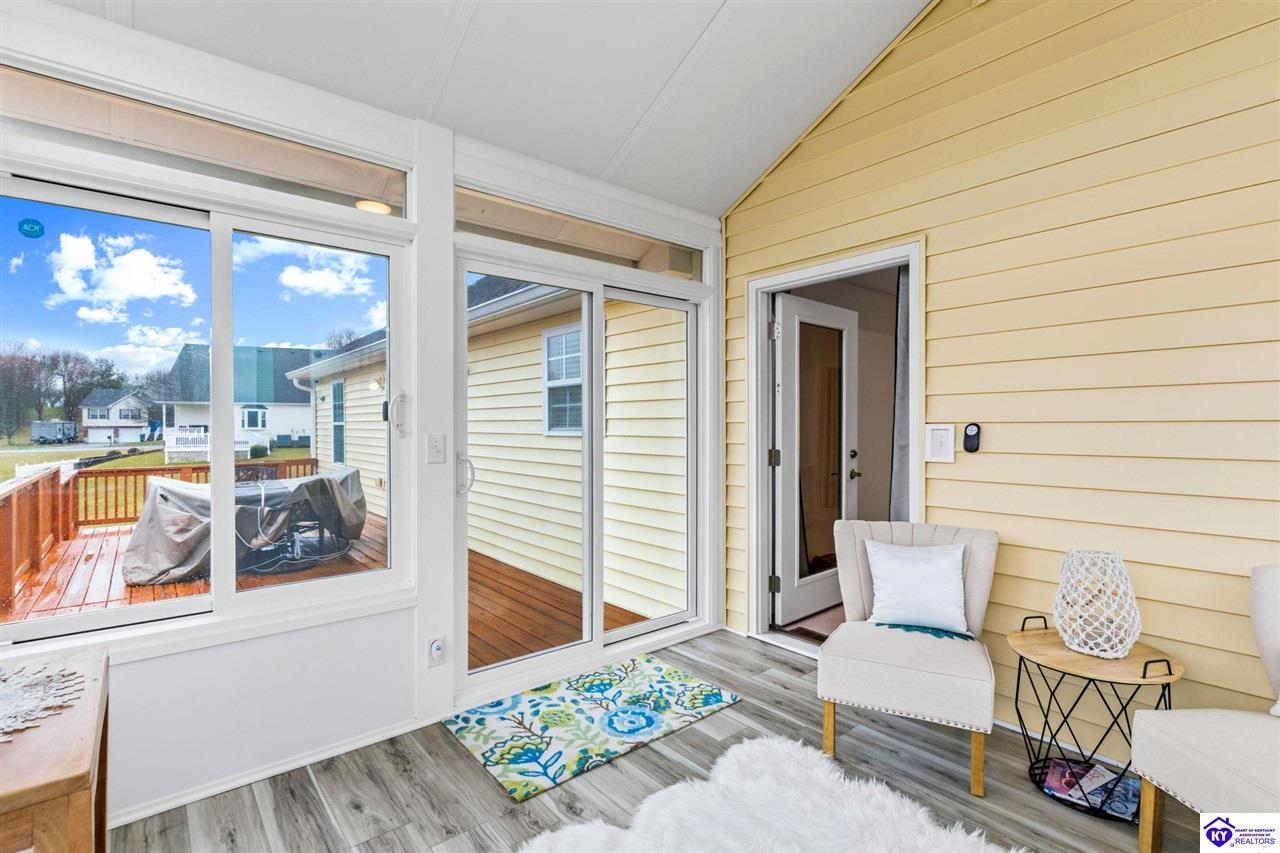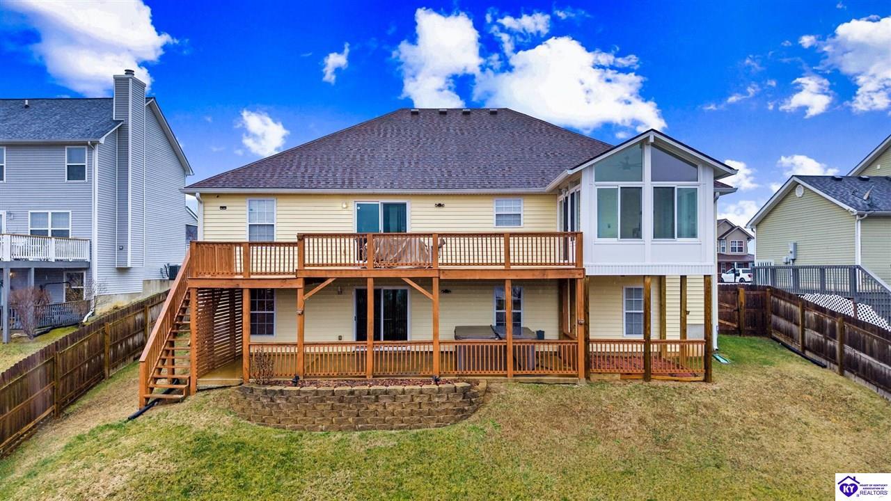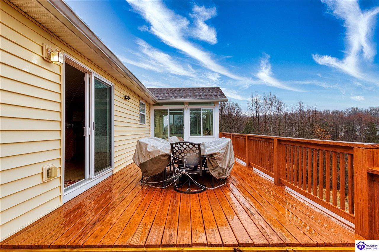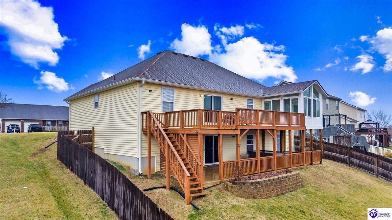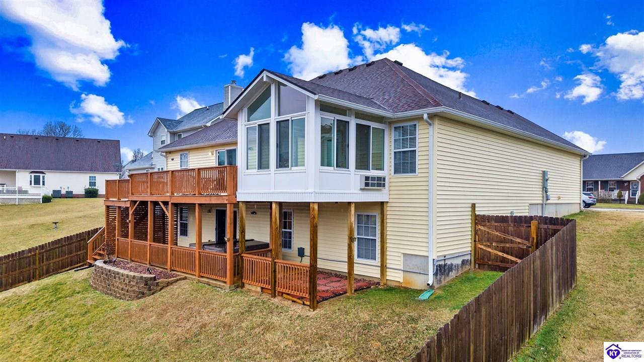 Realtor's notes: Come tour this spacious ranch in Shadow Creek—move-in ready and loaded with extras. This home offers 4-bedroom, 3-full-bath spacious ranch featuring a fully finished basement with kitchenette and an additional bedroom/bath—perfect for guests or in-law living. The primary suite includes walk-in closets and a wonderful custom sunroom off the bedroom. All bedrooms are generously sized. Enjoy a formal dining area and a vaulted great room for entertaining. Outside offers a large deck, patio and fenced yard. Minutes from schools, shopping, dining and Fort Knox—schedule your tour today.