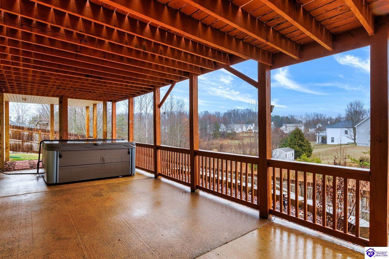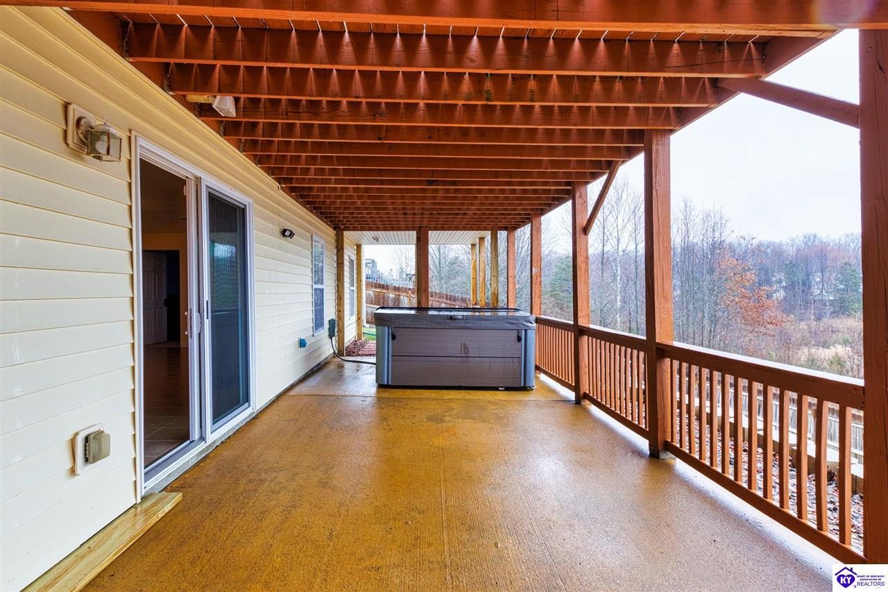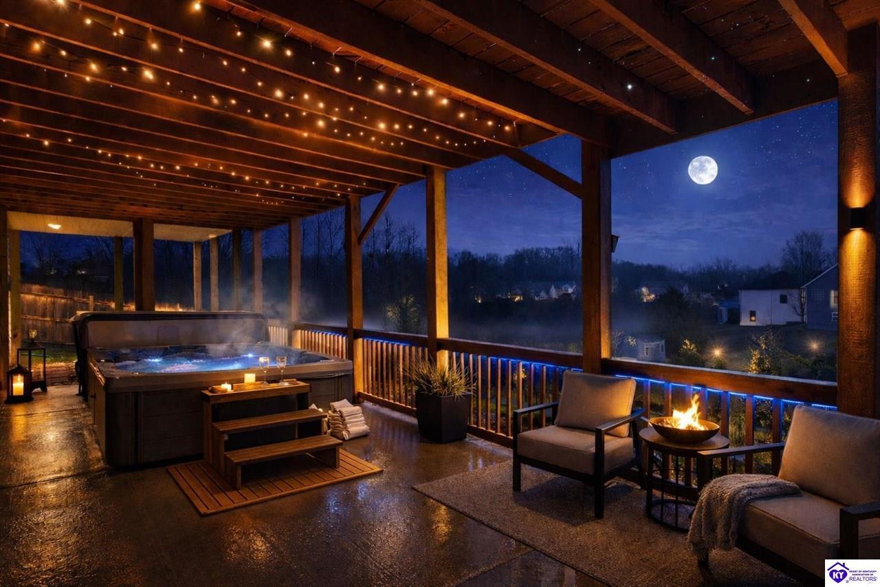 Exterior Covered Front Porch, Covered Deck, Deck, Exterior Lights, Hot Tub, Landscaping, Patio, Porch, Sun Room