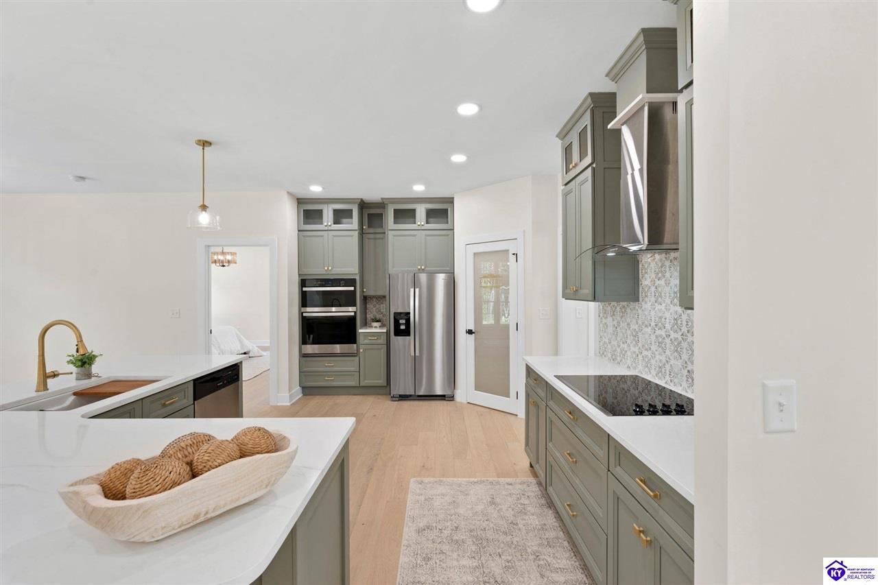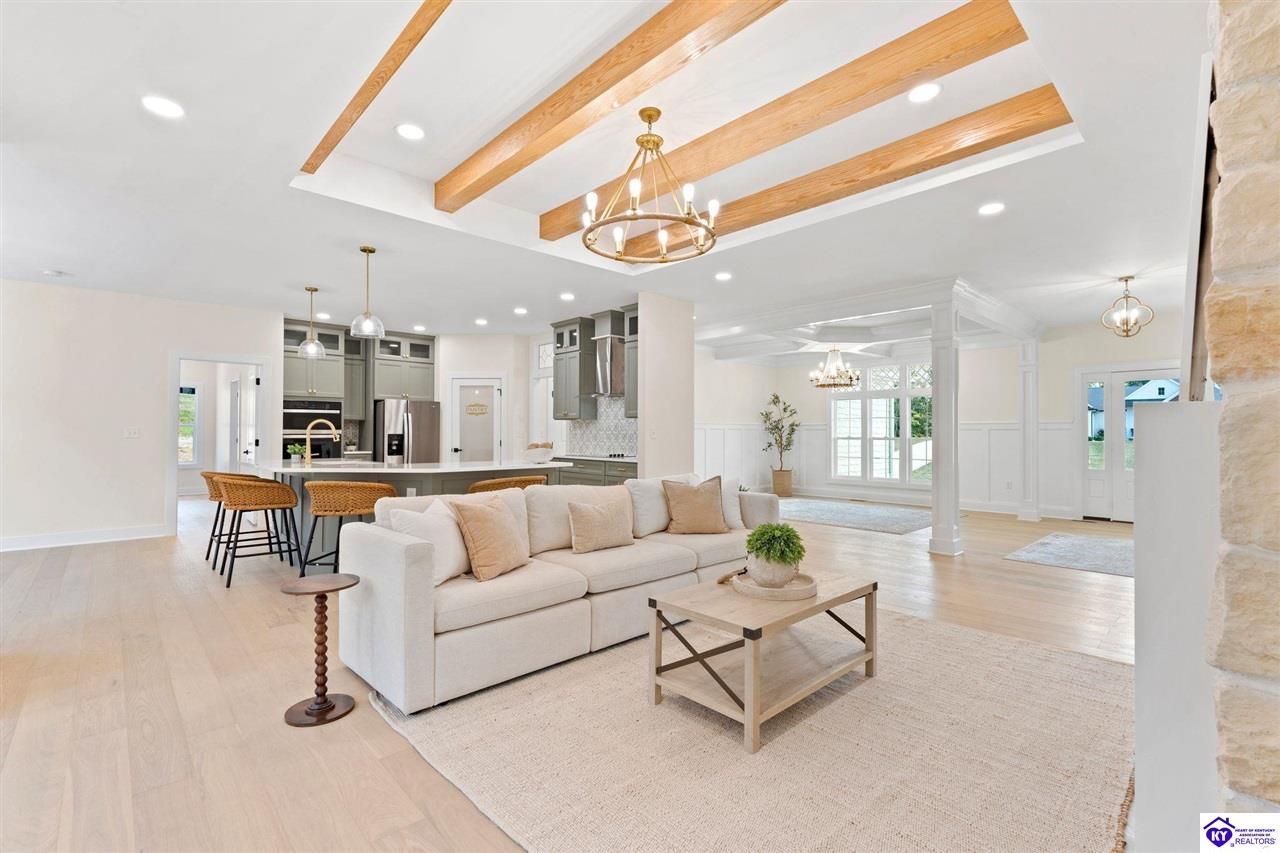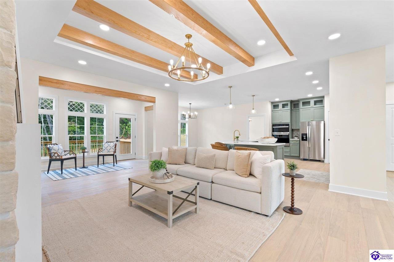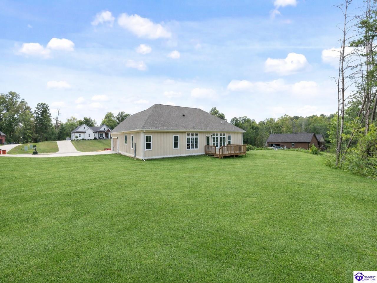 Realtor's notes: Welcome to this stunning 5-bedroom, 3-bath custom home offering 4,270 square feet of living space on over an acre in one of Hardin County’s most desirable subdivisions. Featuring new, custom-level construction with high-end finishes and exceptional craftsmanship throughout, this beautifully designed property combines luxury, space, and privacy while remaining conveniently located just minutes from Elizabethtown Country Club, shopping, dining, and quick access to I-65. Inside, the home showcases a bright open-concept floor plan with white oak hardwood flooring, a formal dining room with wood beam ceilings and custom trim, and a sunroom filled with natural light—perfect for relaxing or entertaining. The chef’s kitchen serves as the heart of the home and features quartz countertops, premium custom cabinetry, a large island with seating for six or more, a walk-in pantry, and a spacious breakfast area designed for gatherings. The main-level primary suite offers a private retreat with a freestanding soaking tub, tiled walk-in shower, dual vanities, and a spacious walk-in closet. Two additional bedrooms and a full bathroom are also located on the main level, providing flexible living options. The finished walkout basement expands the home’s functionality with two additional bedrooms, a full bathroom, and versatile living space ideal for a family room, home theater, home gym, or guest suite, along with abundant storage. Step outside to enjoy the private back deck overlooking the expansive tree-lined backyard, offering ample space for a future pool, outdoor kitchen, or custom outdoor living area. This exceptional property offers the perfect combination of luxury, privacy, modern design, and convenient access to everything Elizabethtown has to offer.