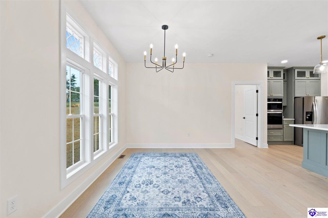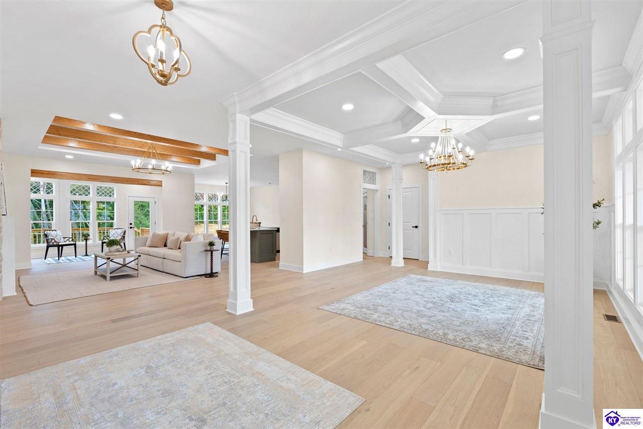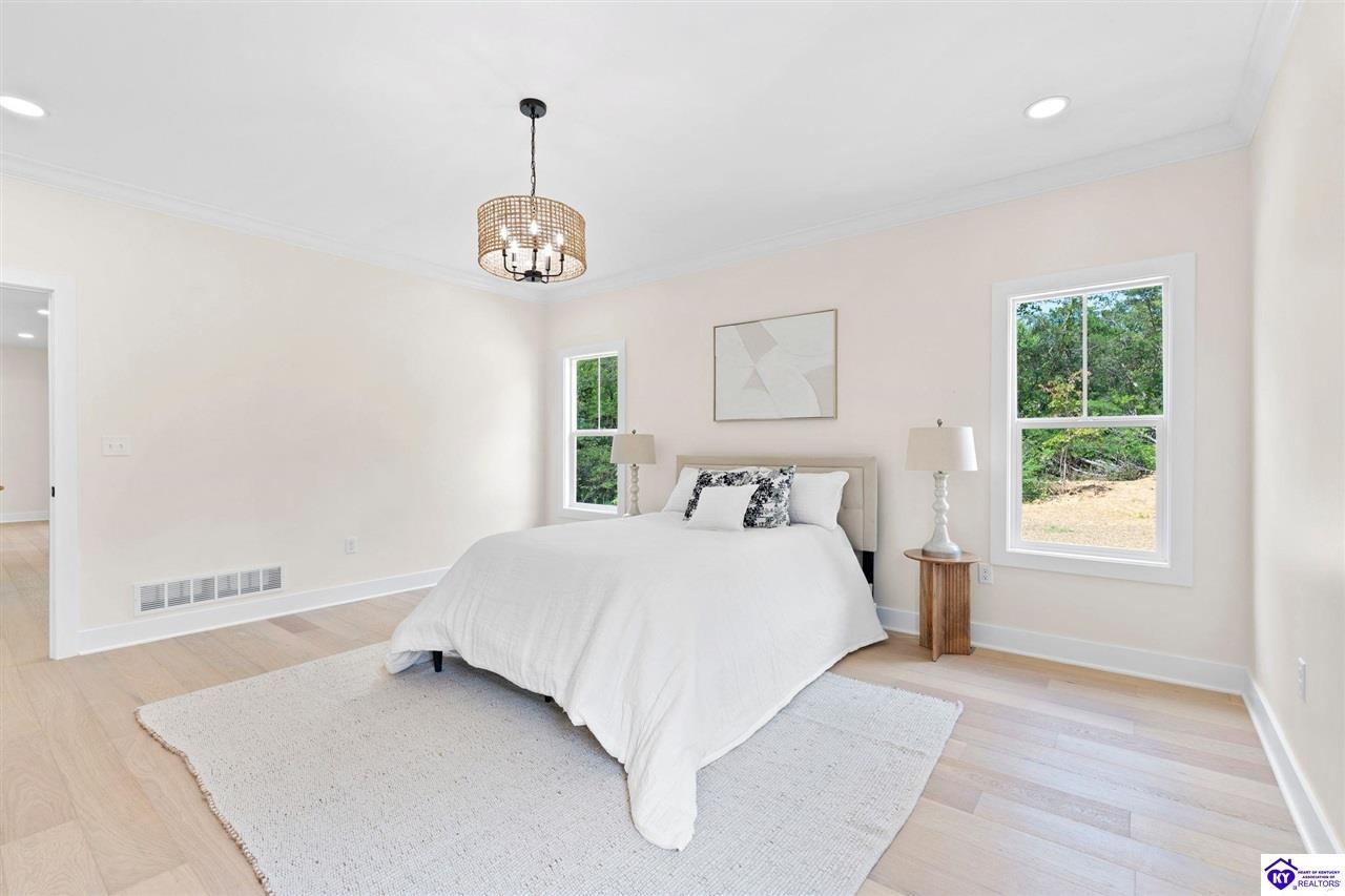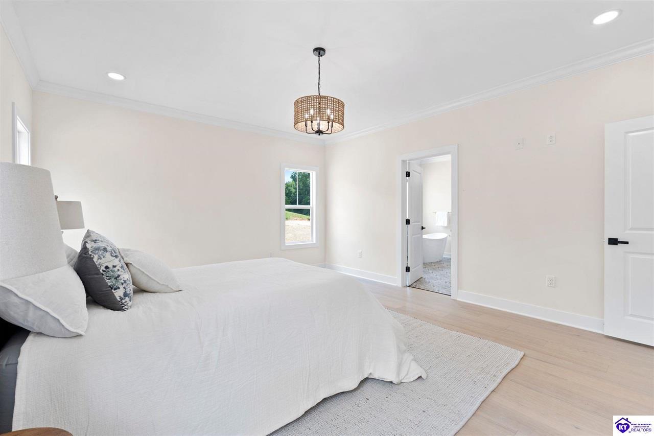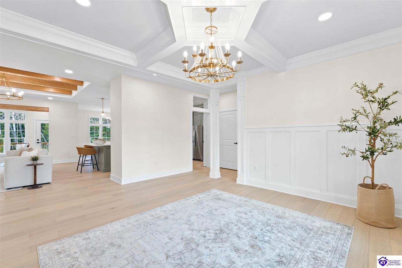 Realtor's notes: Welcome to this stunning 5-bedroom, 3-bath custom home offering 4,270 square feet of living space on over an acre in one of Hardin County’s most desirable subdivisions. Featuring new, custom-level construction with high-end finishes and exceptional craftsmanship throughout, this beautifully designed property combines luxury, space, and privacy while remaining conveniently located just minutes from Elizabethtown Country Club, shopping, dining, and quick access to I-65. Inside, the home showcases a bright open-concept floor plan with white oak hardwood flooring, a formal dining room with wood beam ceilings and custom trim, and a sunroom filled with natural light—perfect for relaxing or entertaining. The chef’s kitchen serves as the heart of the home and features quartz countertops, premium custom cabinetry, a large island with seating for six or more, a walk-in pantry, and a spacious breakfast area designed for gatherings. The main-level primary suite offers a private retreat with a freestanding soaking tub, tiled walk-in shower, dual vanities, and a spacious walk-in closet. Two additional bedrooms and a full bathroom are also located on the main level, providing flexible living options. The finished walkout basement expands the home’s functionality with two additional bedrooms, a full bathroom, and versatile living space ideal for a family room, home theater, home gym, or guest suite, along with abundant storage. Step outside to enjoy the private back deck overlooking the expansive tree-lined backyard, offering ample space for a future pool, outdoor kitchen, or custom outdoor living area. This exceptional property offers the perfect combination of luxury, privacy, modern design, and convenient access to everything Elizabethtown has to offer.