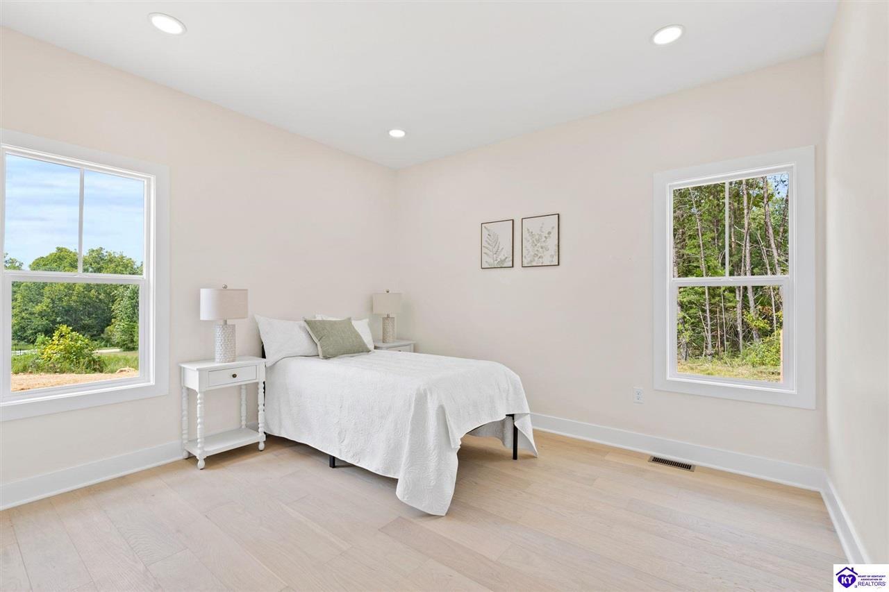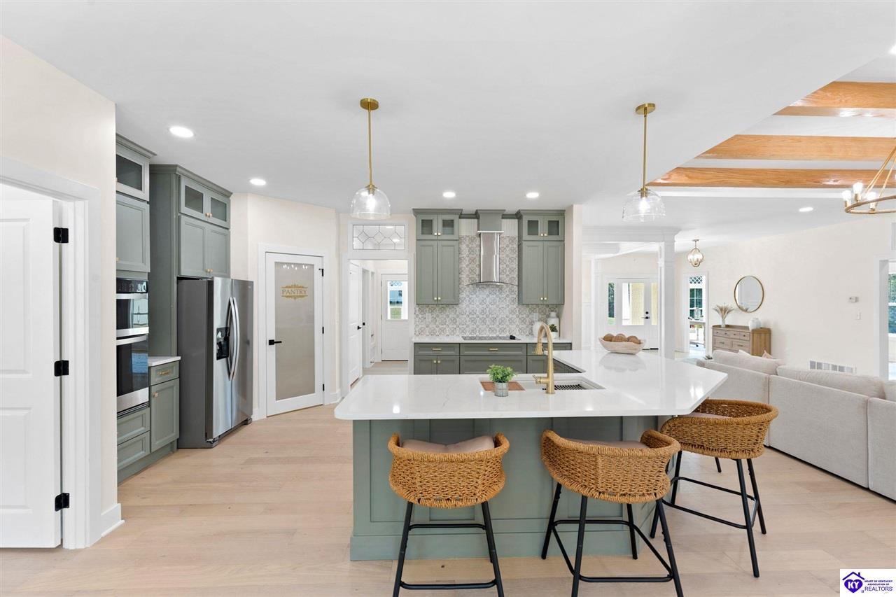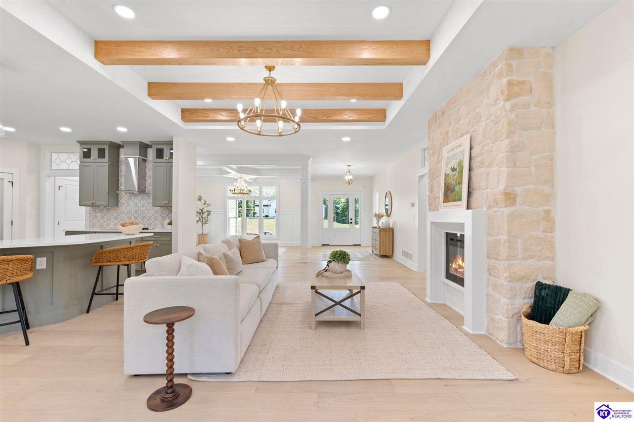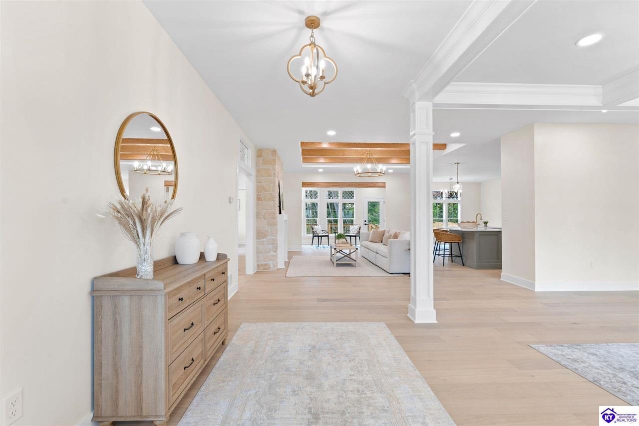 Realtor's notes: Welcome to this stunning 5-bedroom, 3-bath custom home offering 4,270 square feet of living space on over an acre in one of Hardin County’s most desirable subdivisions. Featuring new, custom-level construction with high-end finishes and exceptional craftsmanship throughout, this beautifully designed property combines luxury, space, and privacy while remaining conveniently located just minutes from Elizabethtown Country Club, shopping, dining, and quick access to I-65. Inside, the home showcases a bright open-concept floor plan with white oak hardwood flooring, a formal dining room with wood beam ceilings and custom trim, and a sunroom filled with natural light—perfect for relaxing or entertaining. The chef’s kitchen serves as the heart of the home and features quartz countertops, premium custom cabinetry, a large island with seating for six or more, a walk-in pantry, and a spacious breakfast area designed for gatherings. The main-level primary suite offers a private retreat with a freestanding soaking tub, tiled walk-in shower, dual vanities, and a spacious walk-in closet. Two additional bedrooms and a full bathroom are also located on the main level, providing flexible living options. The finished walkout basement expands the home’s functionality with two additional bedrooms, a full bathroom, and versatile living space ideal for a family room, home theater, home gym, or guest suite, along with abundant storage. Step outside to enjoy the private back deck overlooking the expansive tree-lined backyard, offering ample space for a future pool, outdoor kitchen, or custom outdoor living area. This exceptional property offers the perfect combination of luxury, privacy, modern design, and convenient access to everything Elizabethtown has to offer.