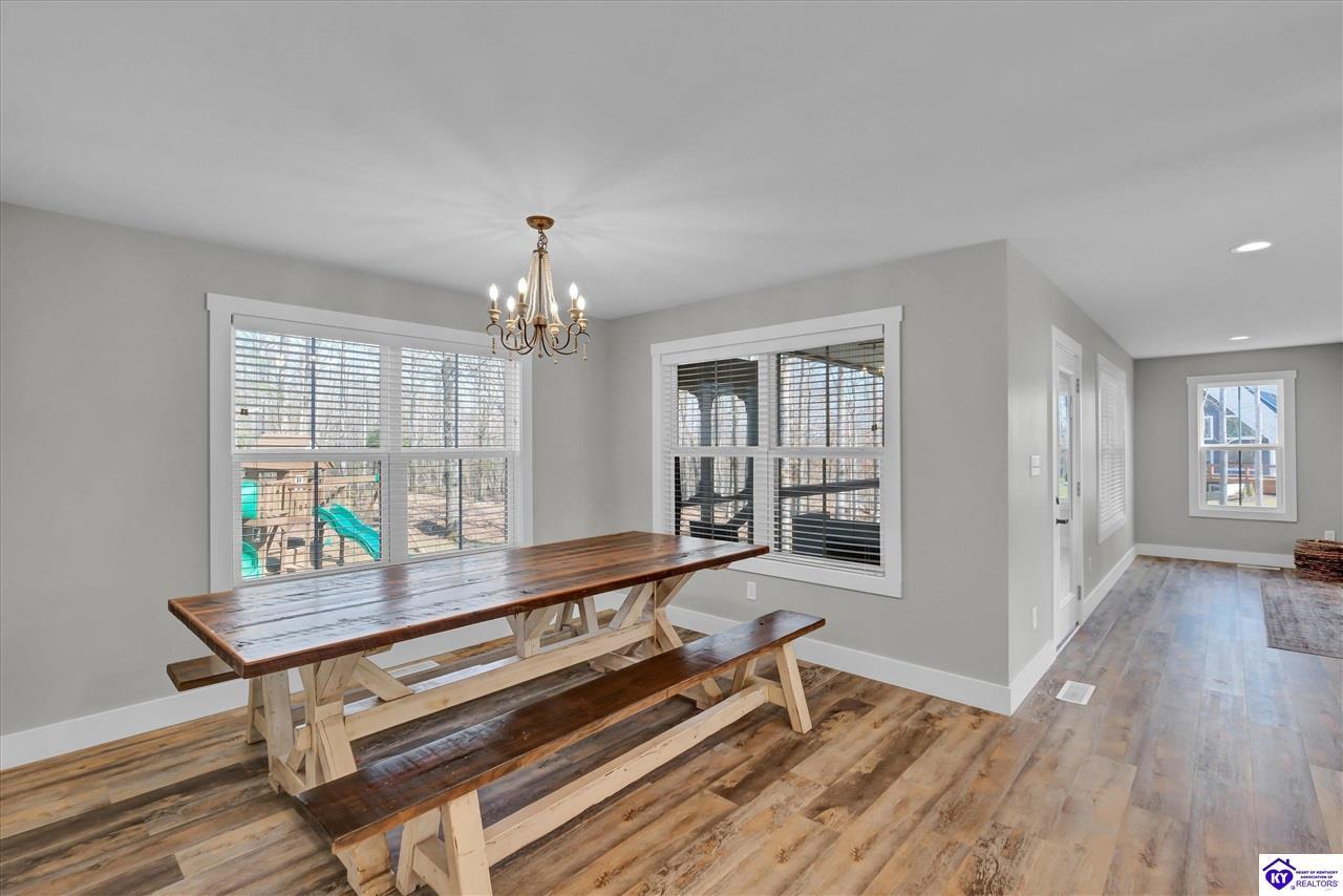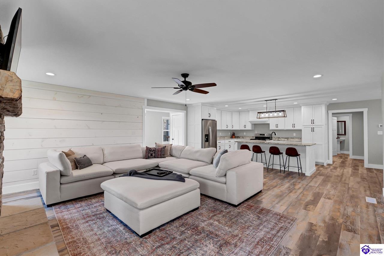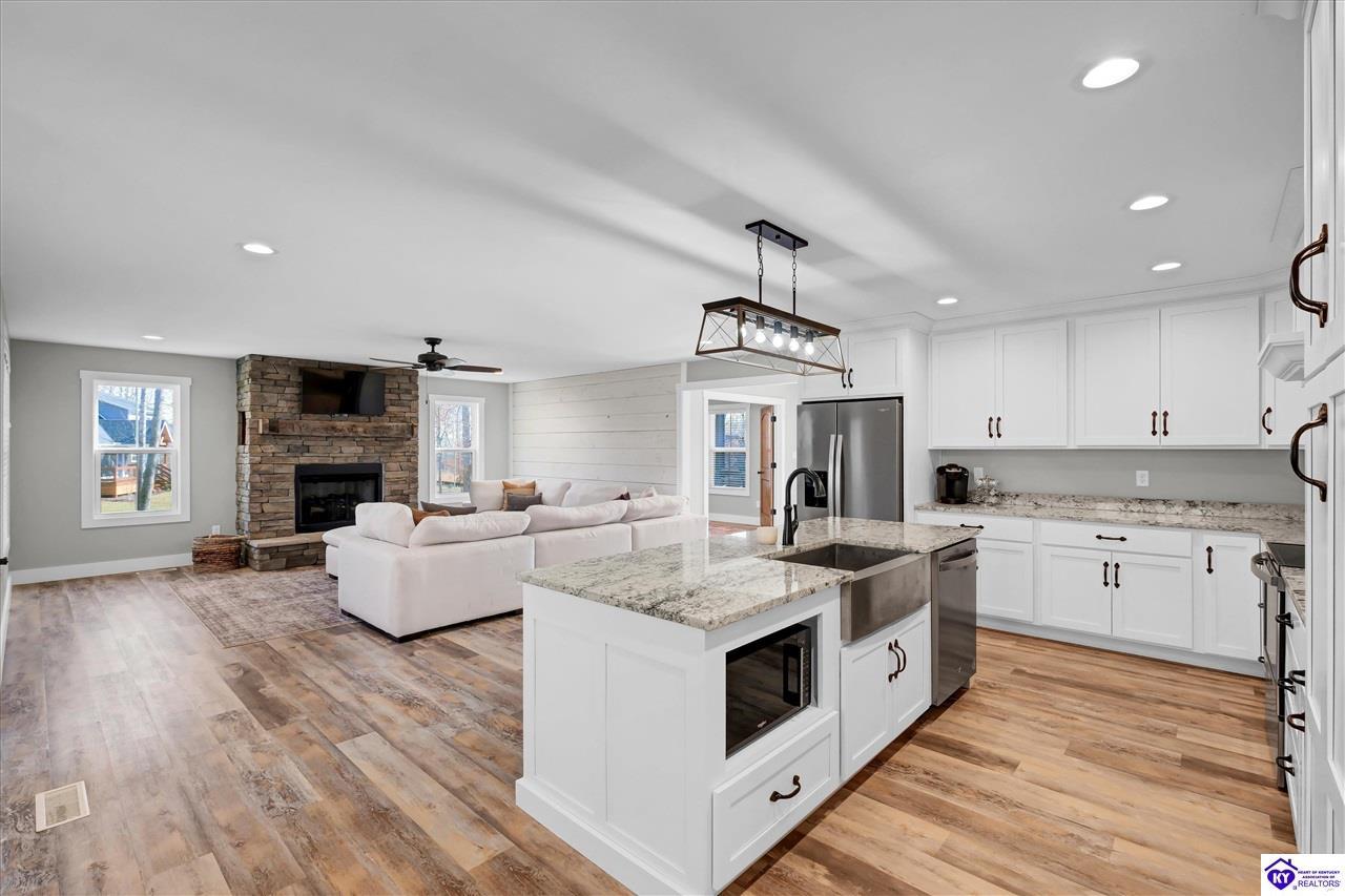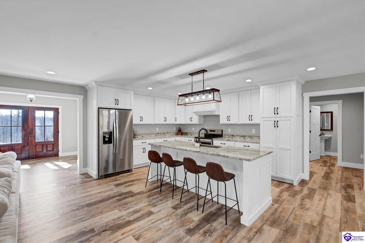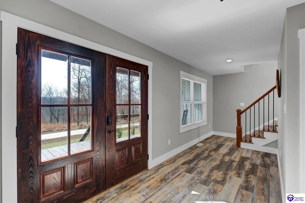 Realtor's notes: Welcome to 175 Falls Lane in Leitchfield, KY, where comfort, style, and lake life come together just minutes from Nolin Lake and a short drive to Moutardier Marina and boat ramp! After a fun-filled day on the water, come home to your own private retreat. Relax in the inground pool under starlit skies, or unwind on the screened rear porch surrounded by peaceful views of nature. Built just 5 years ago, this home truly shows like new and is loaded with upgraded finishes and thoughtful design throughout. An inviting front porch welcomes you into a spacious foyer with an adjoining flex room, perfect for a home office, craft room, or play area. The open-concept layout is ideal for both everyday living and entertaining. The great room features a stunning creekstone-faced fireplace and flows seamlessly into the beautifully appointed kitchen, complete with granite countertops, stainless steel appliances, a center island with farmhouse sink, abundant cabinetry, and a bright, sunlit dining area. The main-level primary suite is a true sanctuary, offering a luxurious bath with walk-in shower, garden tub, double bowl vanity, and dressing table area. The spacious walk-in closet conveniently connects directly to the laundry room. A functional mudroom with built-in cubbies sits just off the attached two-car garage, ideal for lake days and busy households. Upstairs, you'll find a versatile loft area, three additional bedrooms, and a bonus room currently set up as a bunk room, ideal for hosting family and friends after a day at the lake. High speed fiber internet available so you can work and play. Located in a short-term rental friendly community, this property offers excellent potential as a vacation rental or investment property while still serving as your own private lake getaway. If you've been searching for a nearly new home with upgraded features, poolside relaxation, and easy access to lake adventures, this is it. Schedule your showing today and start living the lake lifestyle you've been dreaming about!