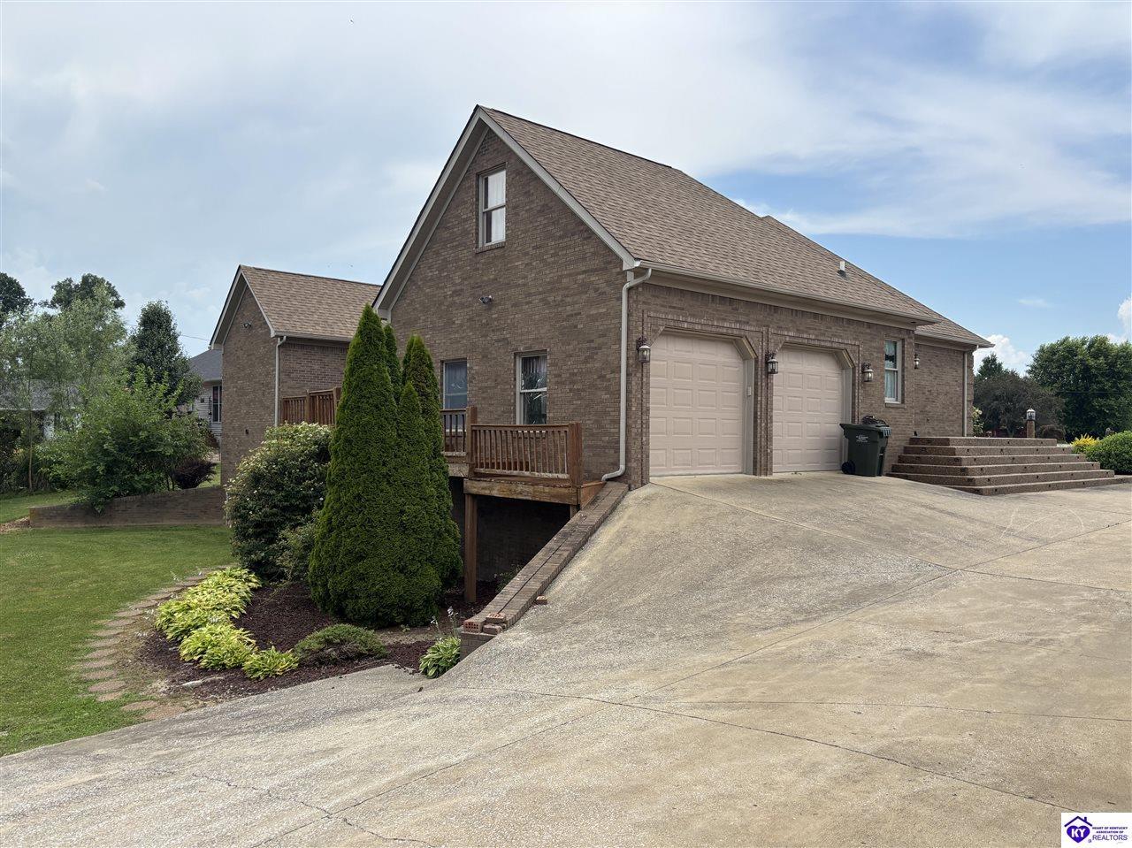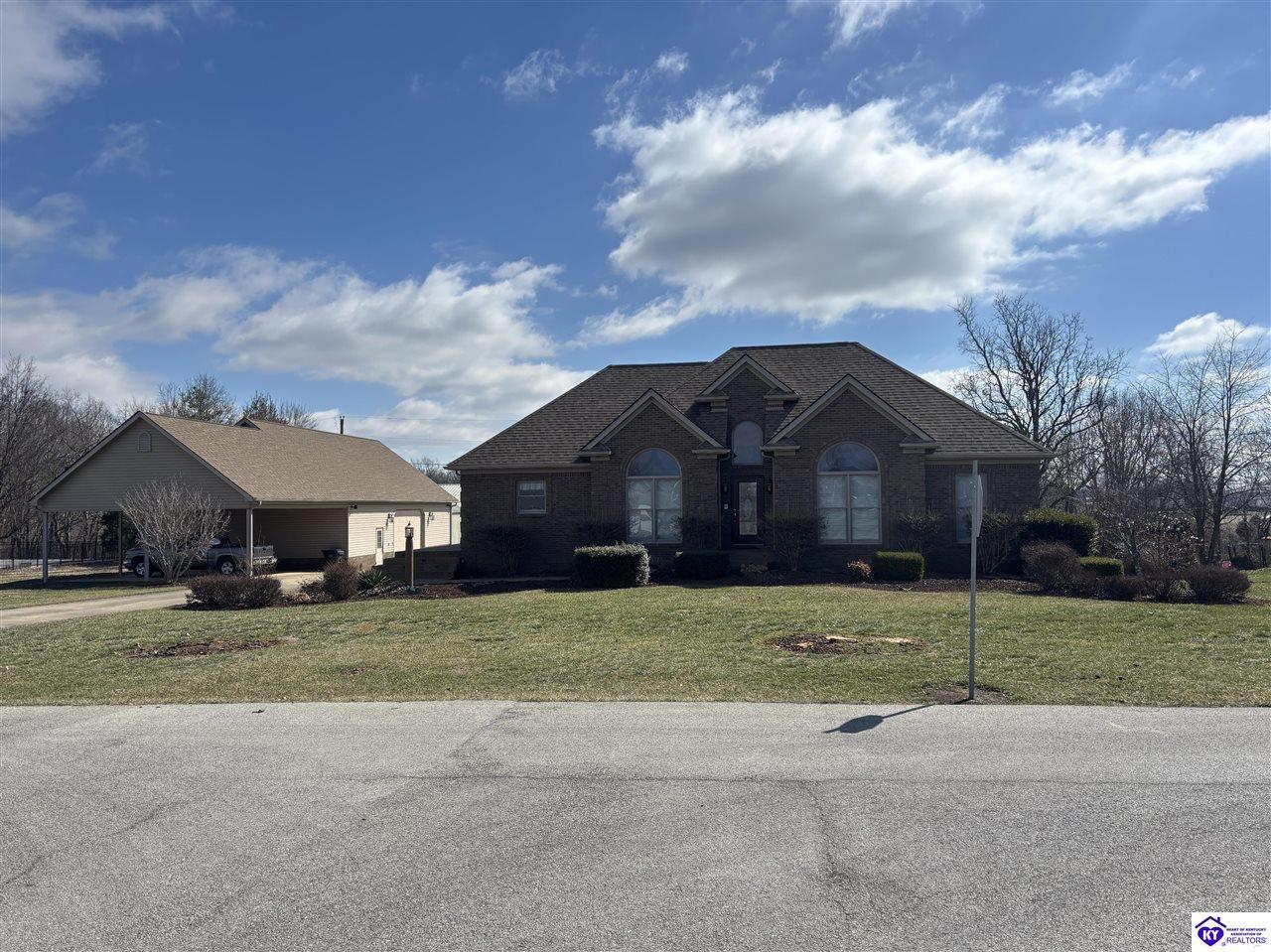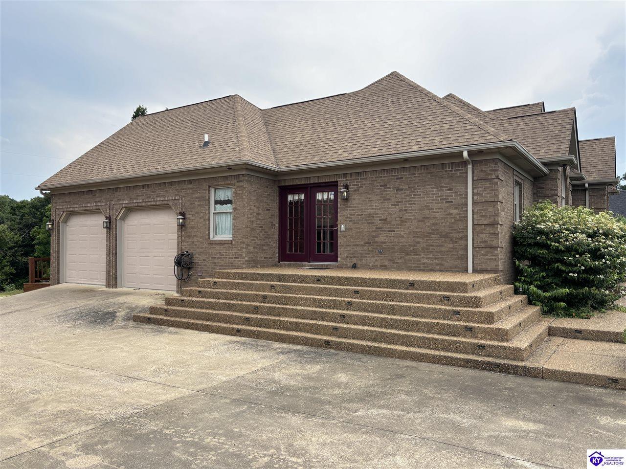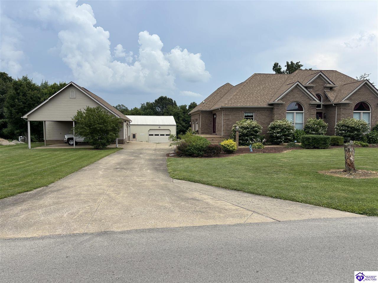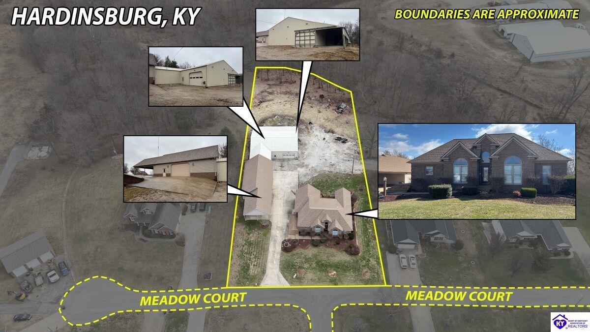 Realtor's notes: Going on the auction block, selling by online bidding only, will be a 1 1/2 story brick home having 5 bedrooms, 2 ½ baths, approximately 4,820 square feet (per PVA), and a full walkout basement. The main floor has approximately 1,824 square feet and consists of a kitchen/dining combination with ample cabinetry, utility room, half bath off the kitchen, living room with a natural gas fireplace, dining room, foyer, master bedroom with a full bath and walk-in closet, two additional bedrooms, another full bath, and a two-car attached garage. The upper level has approximately 360 square feet and consists of a single bedroom, storage room, and is accessed by way of a banister staircase. The full finished basement has approximately 2,636 square feet and consists of a living room, office/den, two storage rooms, and one bedroom. The home is heated by a natural gas furnace, has central air, hardwood, carpet and tile flooring, chandelier lighting, lots of closet space, and Hardinsburg City water and sewer. Other features include a 7 ft. x 19 ft. exposed aggregate concrete lighted patio and a 19 ft. x 22 ft. covered lower patio area with a storage room, 19 ft. x 22 ft. and 4 ft. x 30 ft. wooden back decks, exposed aggregate concrete outdoor lamp post, lighted sidewalks, aesthetic landscaping, and concrete driveway. Improvements include a 32 ft. x 52 ft. detached insulated garage having concrete floors, electric, storage loft, 22 ft. x 25 ft. addition, and a single garage door; a 34 ft. x 40 ft. detached insulated metal garage having concrete floors, electric, 14 ft. x 59 ft. equipment lean-to, and two garage doors; and a 27 ft. x 29 ft. two-car concrete carport. The home and improvements are situated on 1.501 acres fronting Meadow Court within the city limits of Hardinsburg, KY. The property is zoned R-1 Residential.