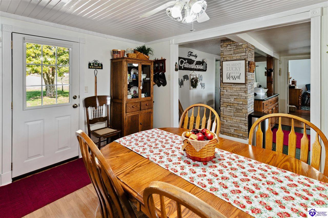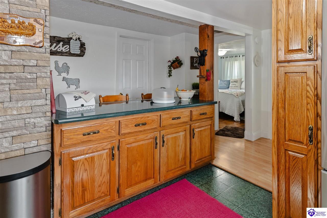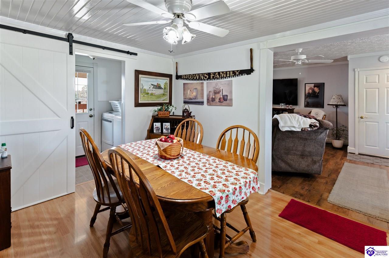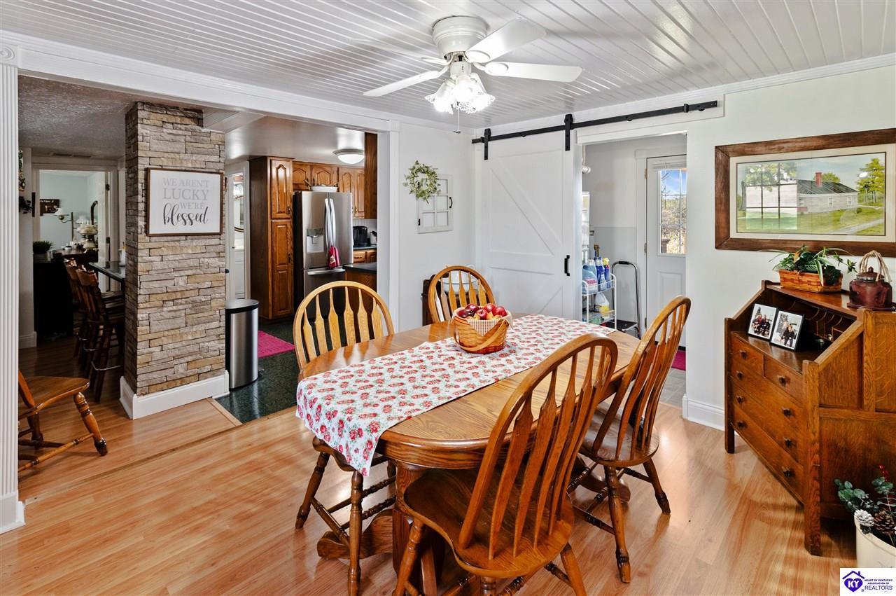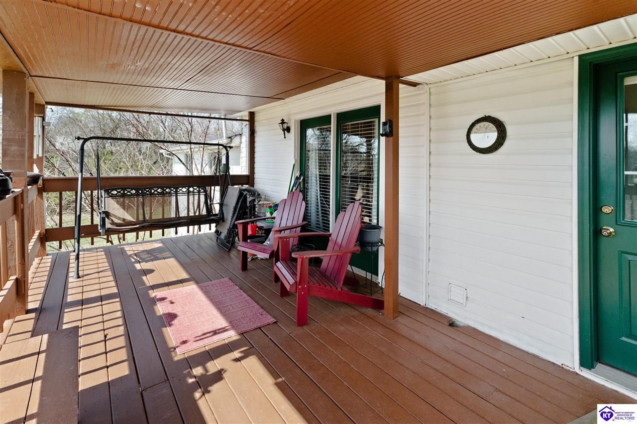 Realtor's notes: 3 bedroom ranch situated on 2 acres. Comfortable flow from the living room to the dining area and into the kitchen. The kitchen offers abundant cabinet space and features an island that provides additional seating and storage. Just off the kitchen is a convenient laundry room with built-in cabinetry for extra organization. The dining area opens to a covered deck, perfect for enjoying the peaceful views of the property. Additional features include a 2-car attached garage, storage shed, and an older barn. Only minutes from Mt. Washington. Bullitt County school district!