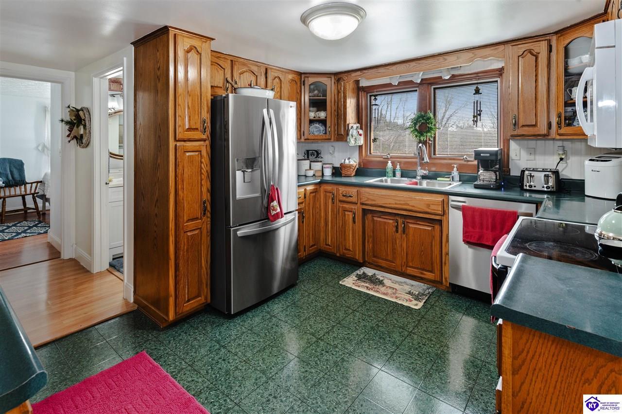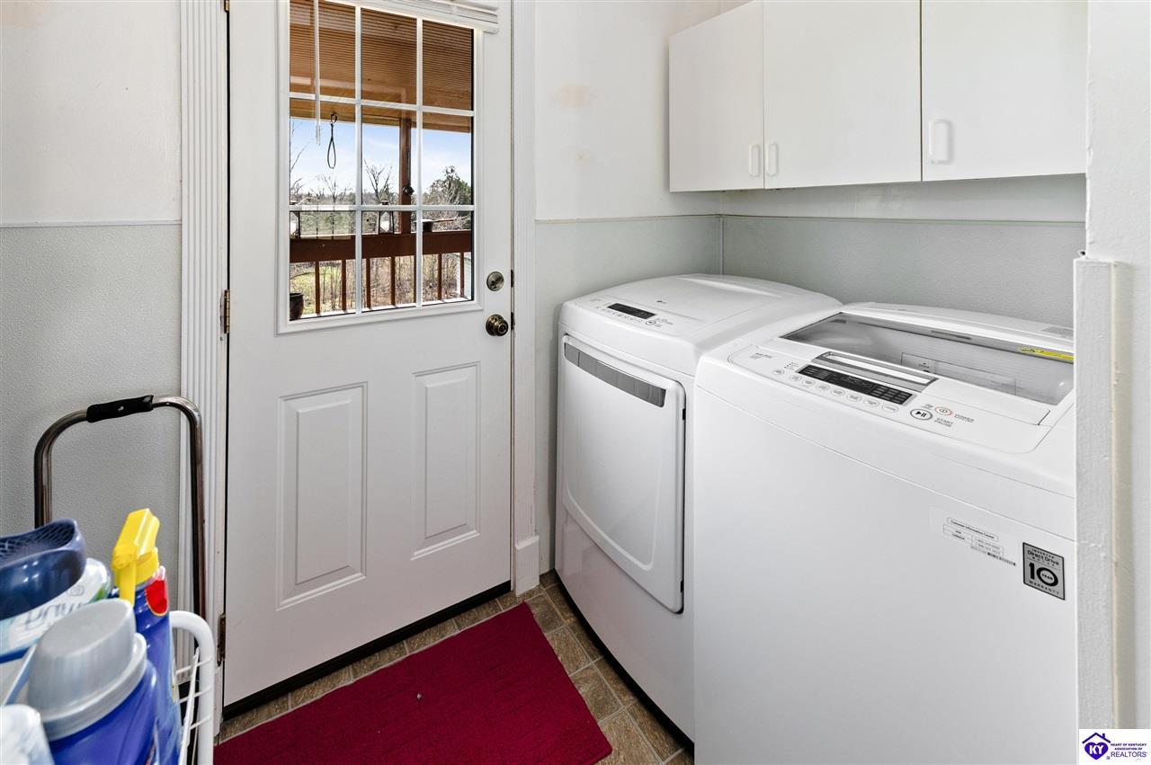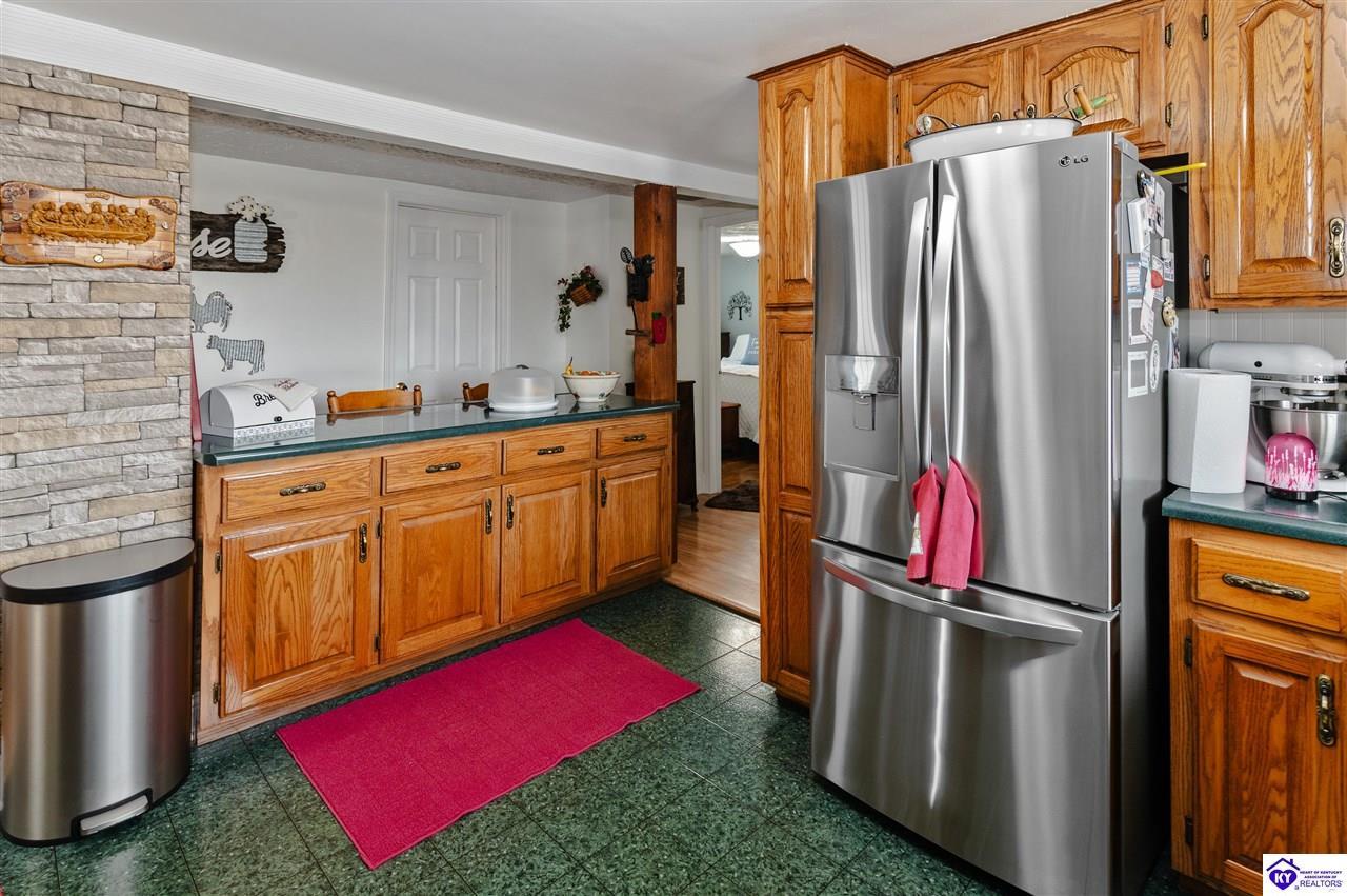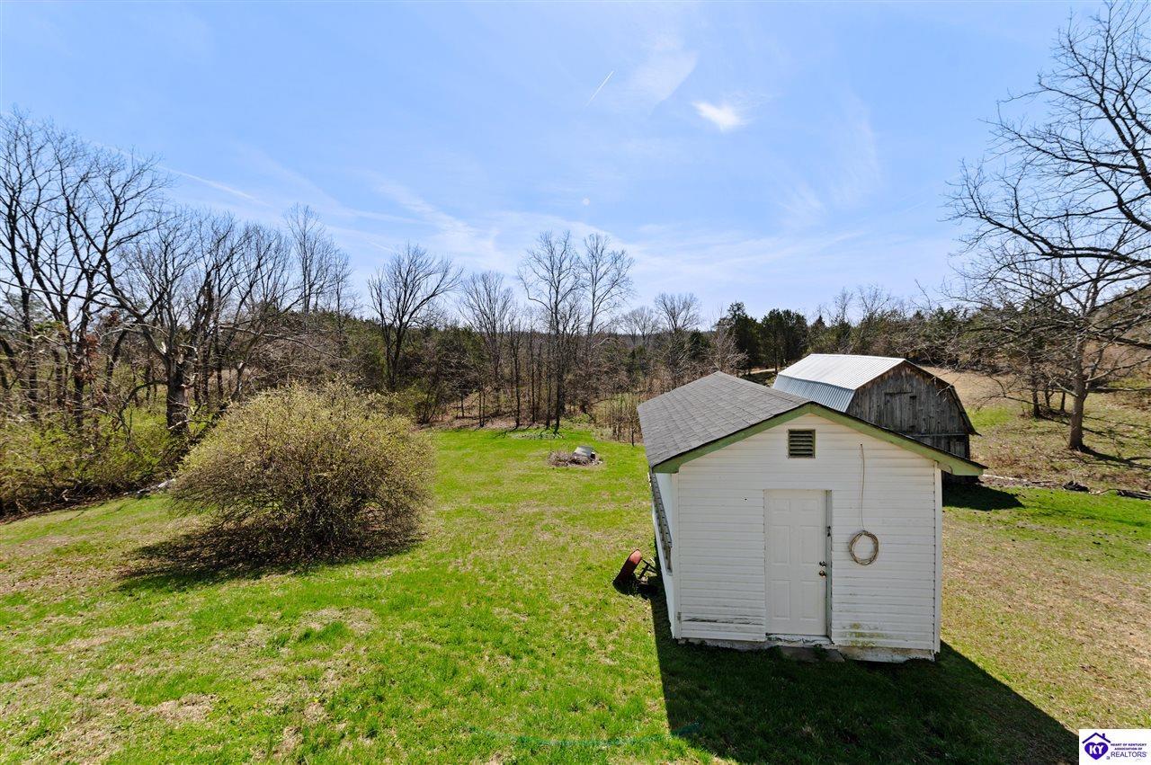 Realtor's notes: 3 bedroom ranch situated on 2 acres. Comfortable flow from the living room to the dining area and into the kitchen. The kitchen offers abundant cabinet space and features an island that provides additional seating and storage. Just off the kitchen is a convenient laundry room with built-in cabinetry for extra organization. The dining area opens to a covered deck, perfect for enjoying the peaceful views of the property. Additional features include a 2-car attached garage, storage shed, and an older barn. Only minutes from Mt. Washington. Bullitt County school district!