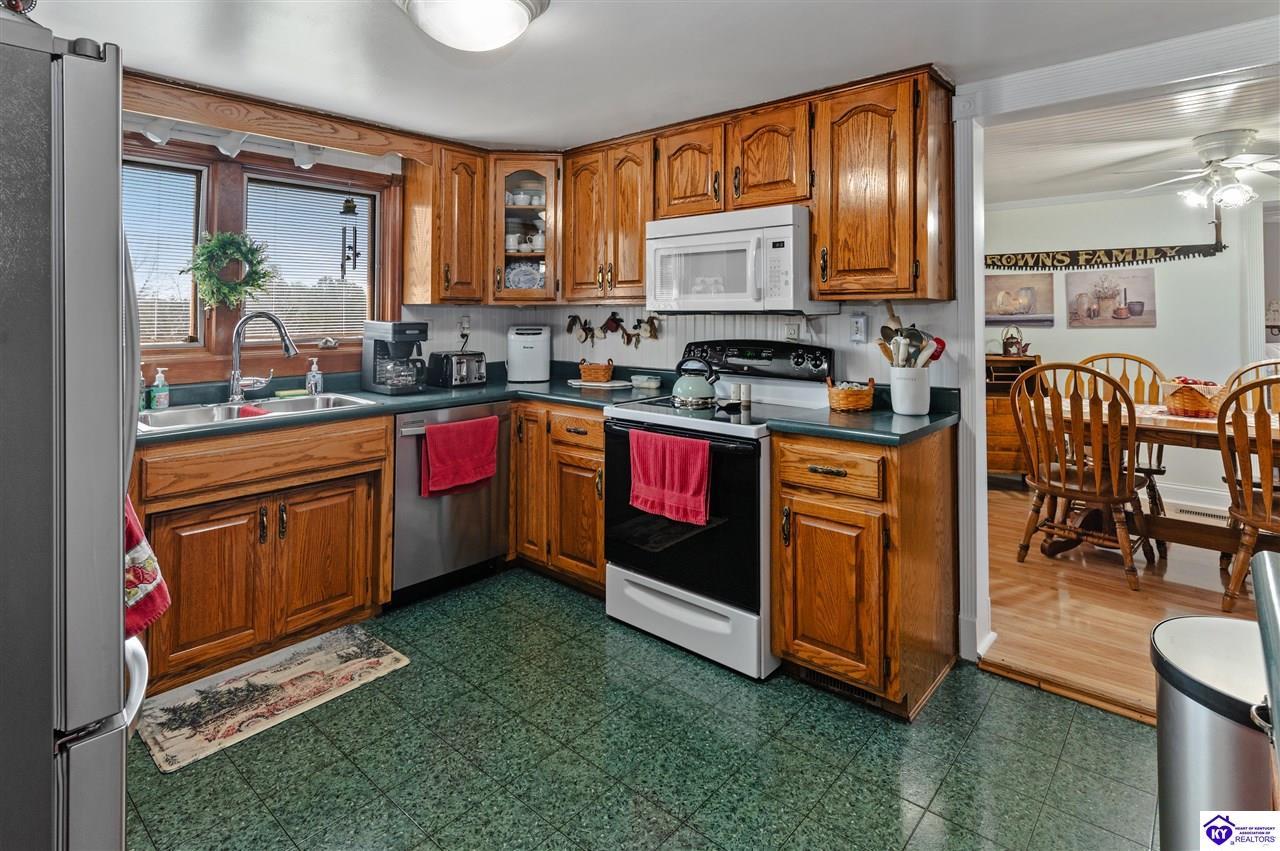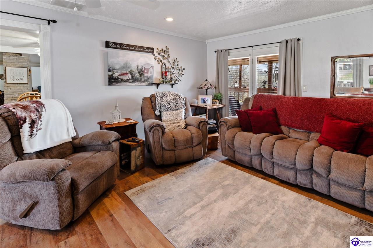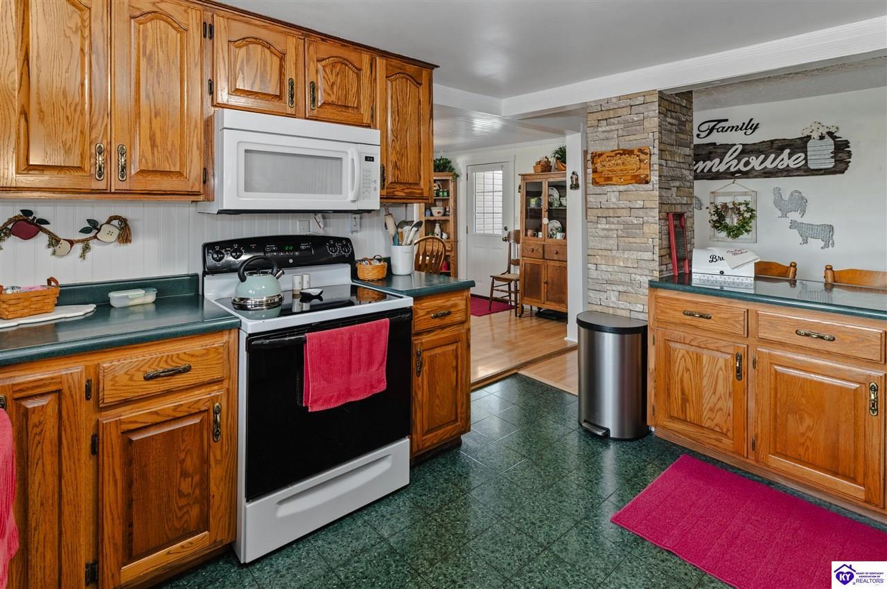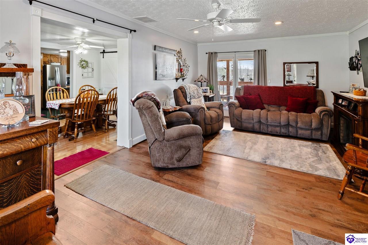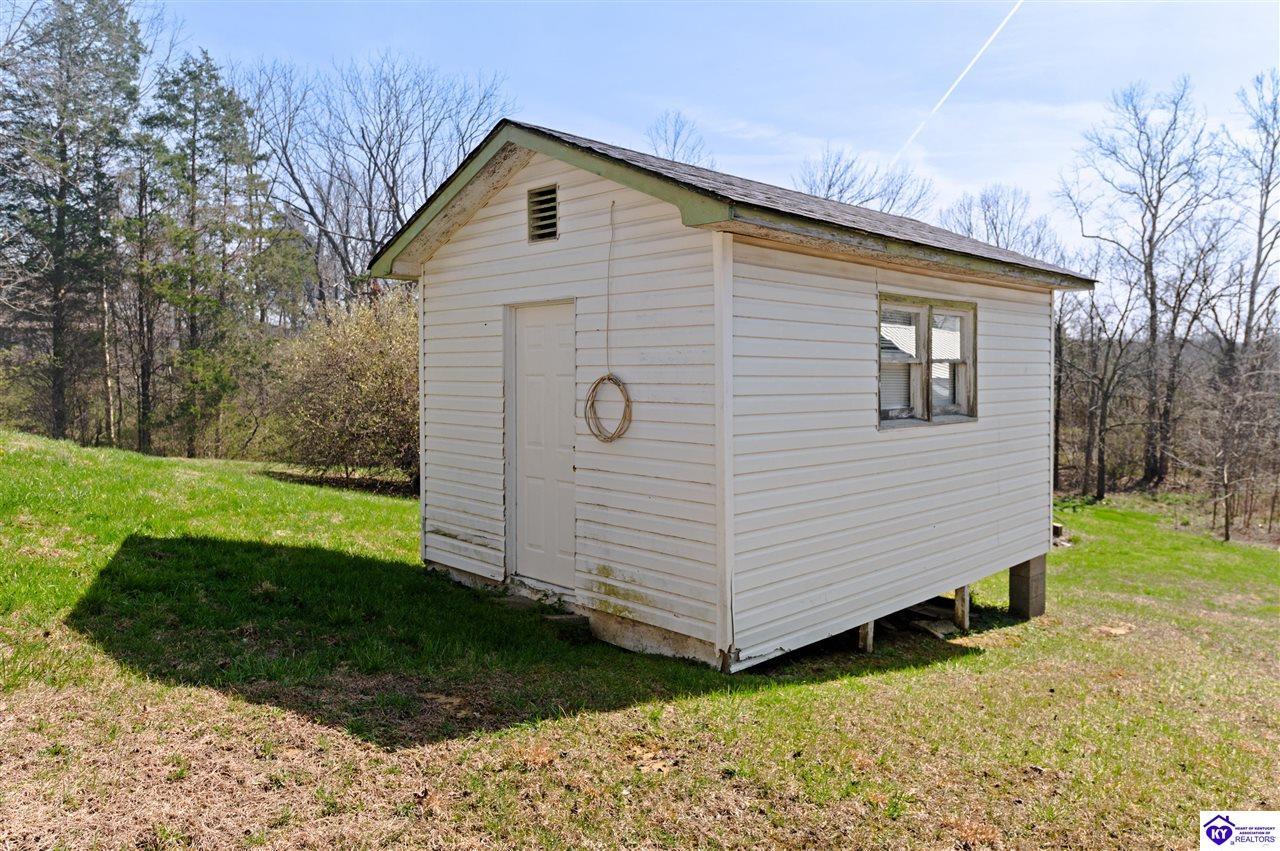 Realtor's notes: 3 bedroom ranch situated on 2 acres. Comfortable flow from the living room to the dining area and into the kitchen. The kitchen offers abundant cabinet space and features an island that provides additional seating and storage. Just off the kitchen is a convenient laundry room with built-in cabinetry for extra organization. The dining area opens to a covered deck, perfect for enjoying the peaceful views of the property. Additional features include a 2-car attached garage, storage shed, and an older barn. Only minutes from Mt. Washington. Bullitt County school district!