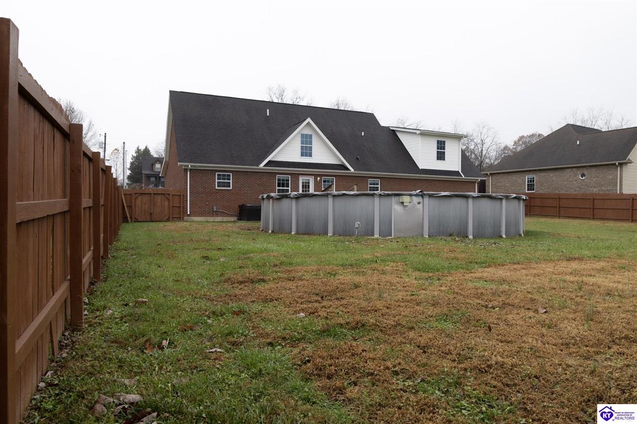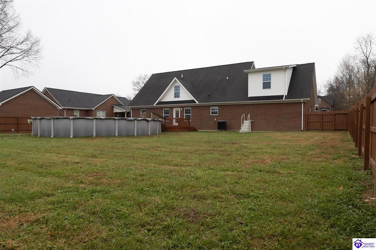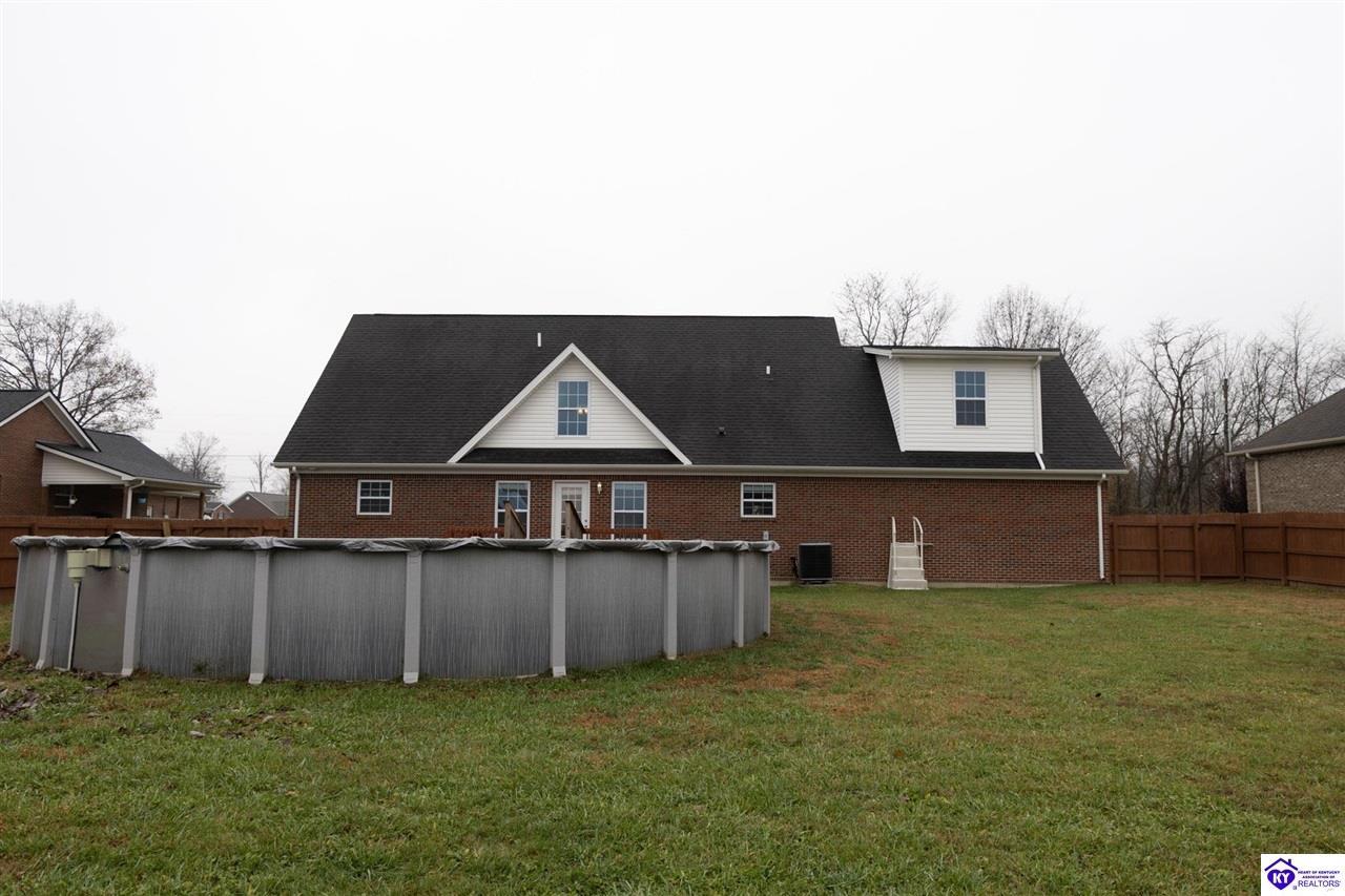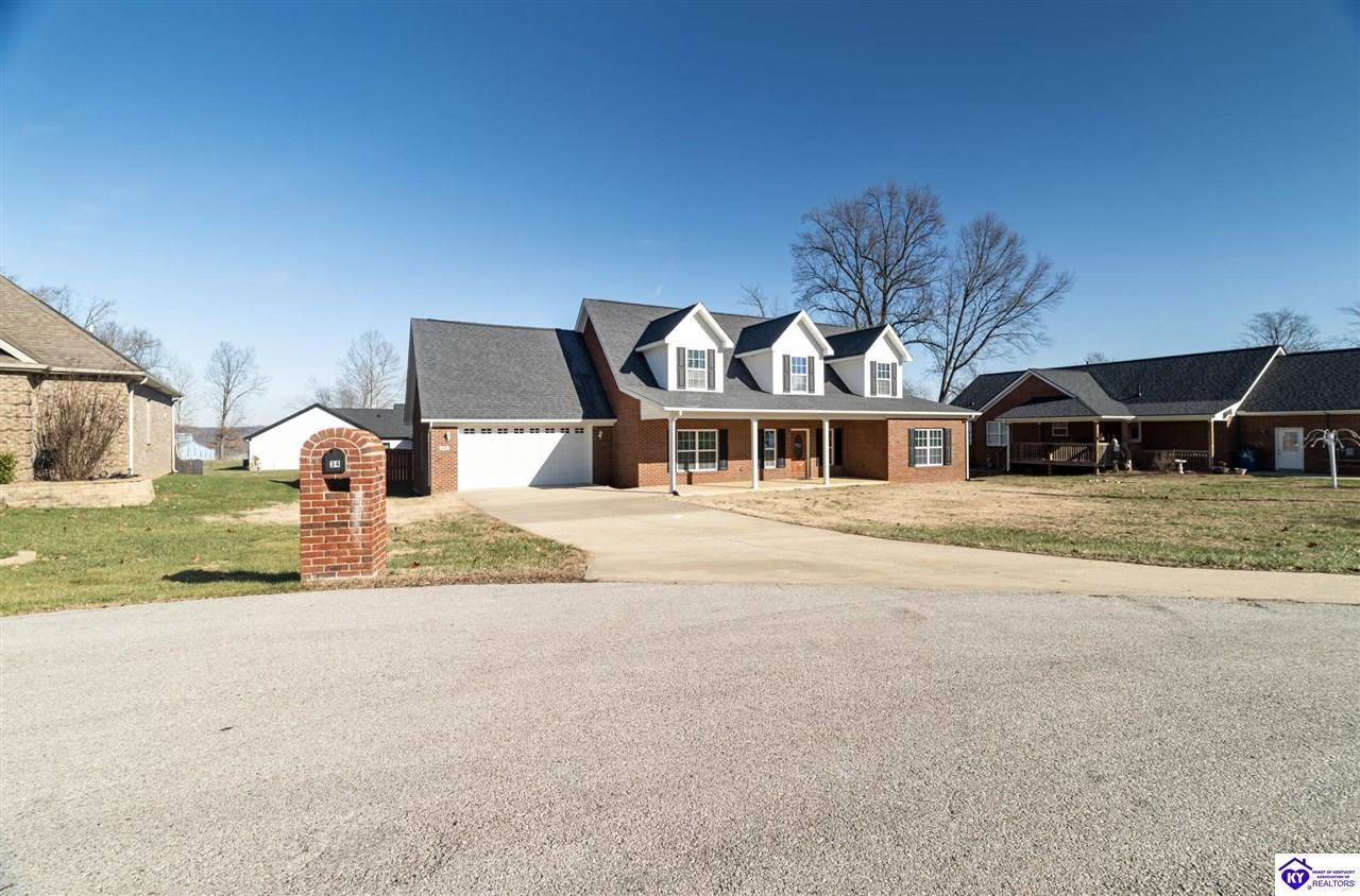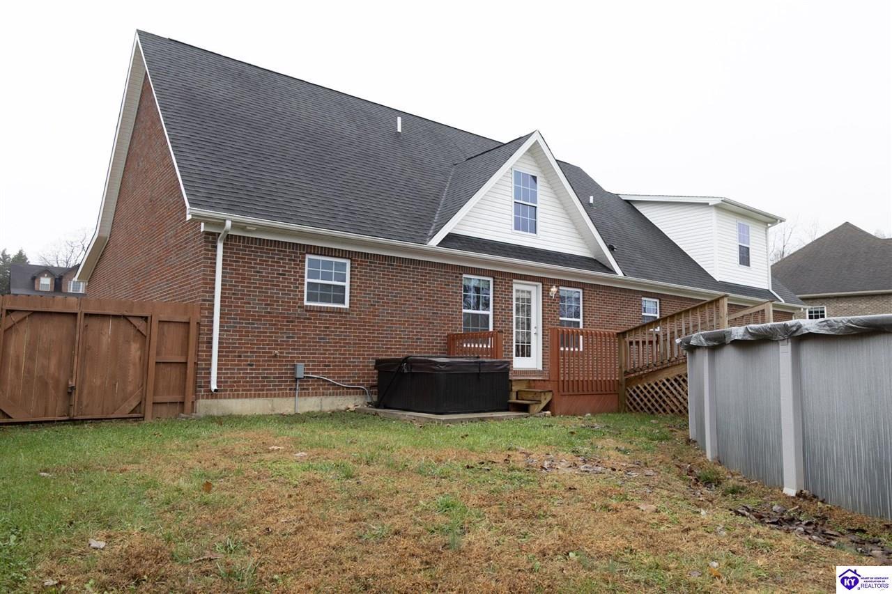 Realtor's notes: Discover this beautifully built, one-owner home tucked at the end of a cul-de-sac in River Cliff Estates. Built in 2016, the property offers a spacious layout and standout features inside and out. The backyard is designed for fun and functionality, complete with a 33-foot pool and hot tub added in fall of 2023, plus a fully fenced yard for pets, gatherings, and everyday use. The main level offers 9-foot ceilings and a dramatic vaulted living room accented by a dual staircase and an open balcony landing. The first floor is handicapped accessible and includes a large primary suite with dual vanities, a whirlpool tub, a separate shower, and a walk-in closet that doubles as a built-in storm shelter/safe room. Upstairs, two generously sized bedrooms and a large bonus room provide flexible space for work, play, or additional living space. A full bathroom with double sinks and abundant storage, thanks to double closets, completes the upper level. The kitchen is designed with cooking and baking in mind, offering extensive cabinet storage and a highly usable layout. A formal dining room with a tray ceiling provides the perfect spot for hosting meals and celebrations. The home also features a blue light HVAC system aimed at reducing mold and allergens. Located just 20 minutes from Fort Knox plus no HOA fees, this home is ready for its next owners. Schedule your private showing to see it in person!