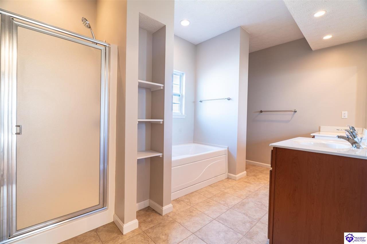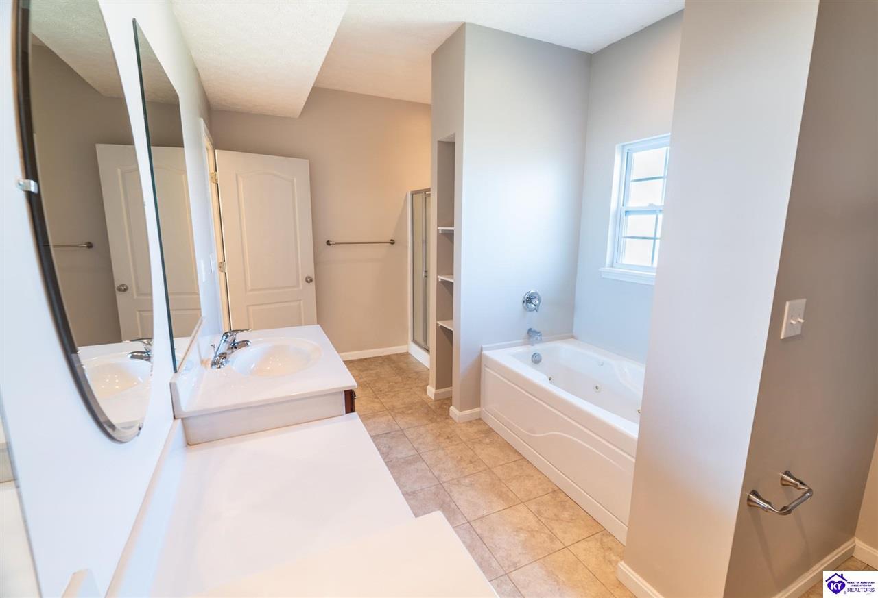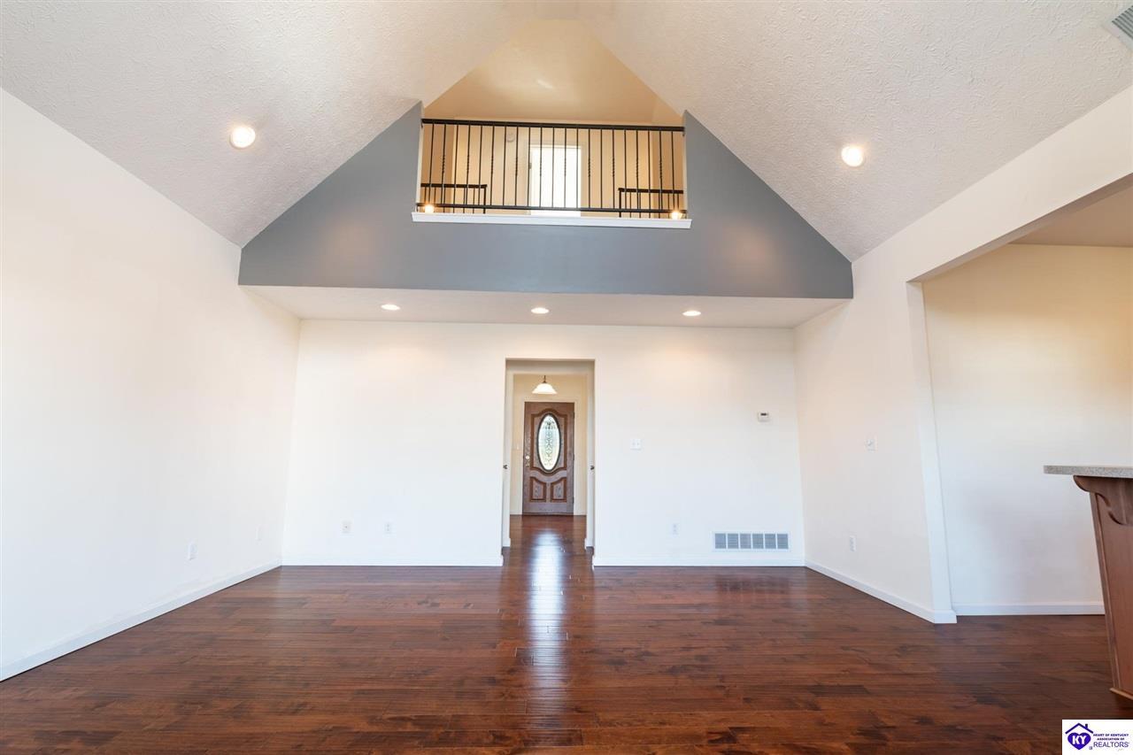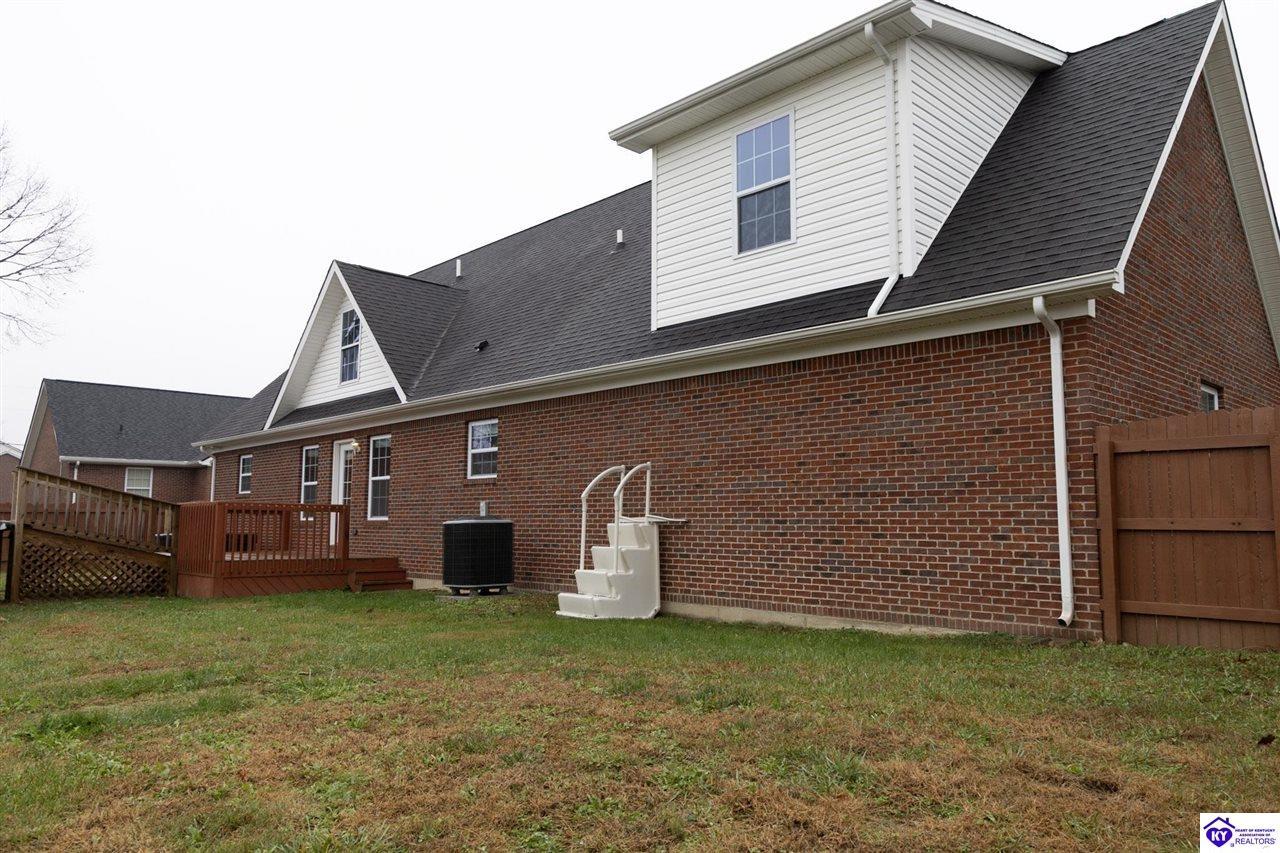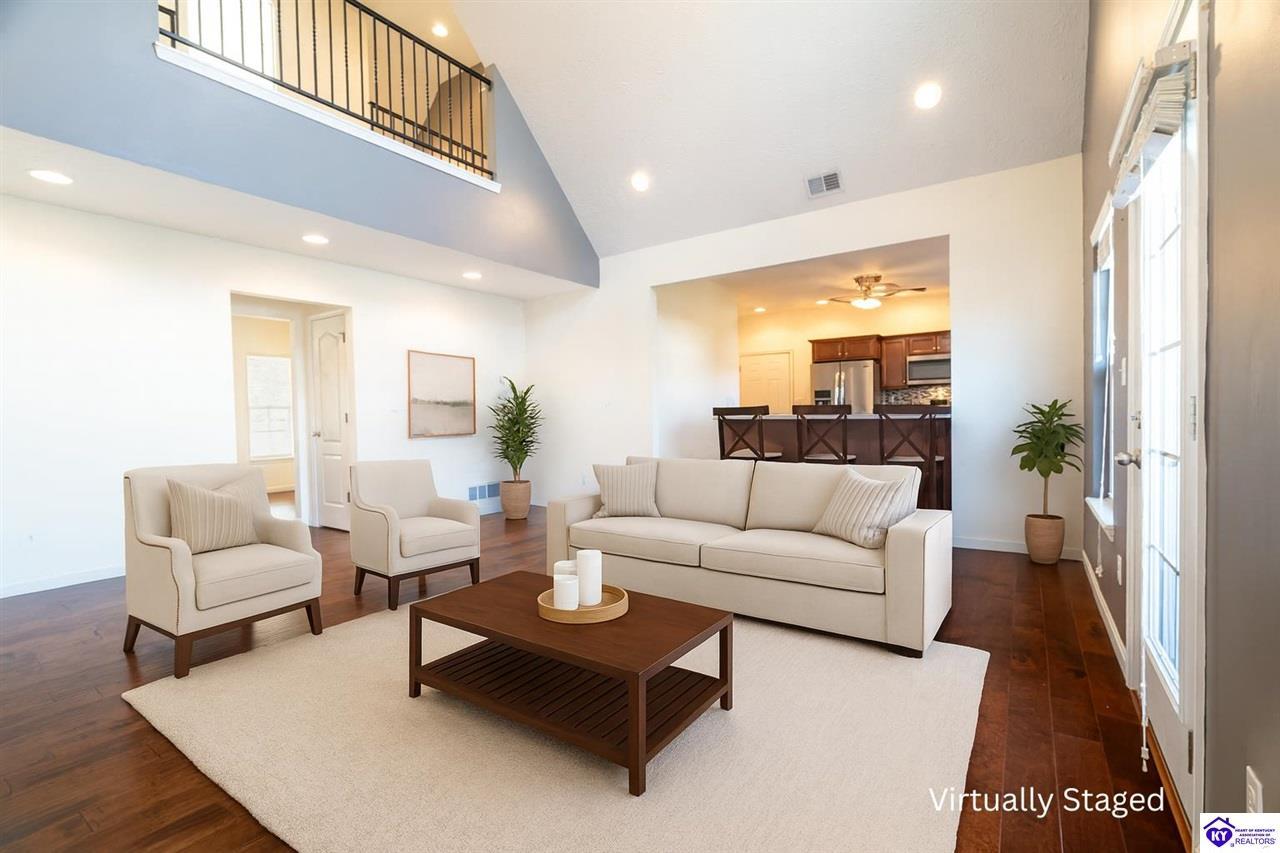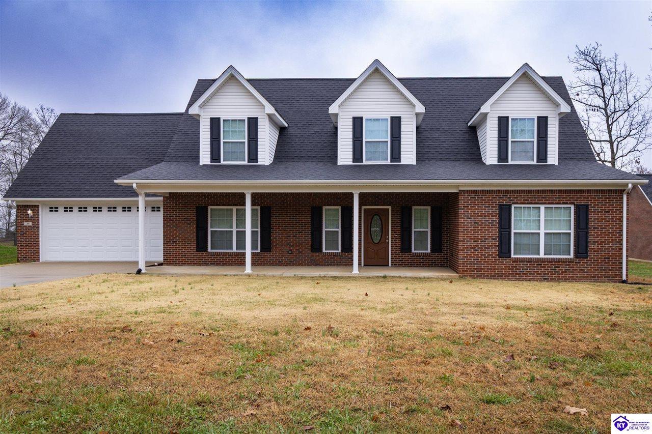 Realtor's notes: Discover this beautifully built, one-owner home tucked at the end of a cul-de-sac in River Cliff Estates. Built in 2016, the property offers a spacious layout and standout features inside and out. The backyard is designed for fun and functionality, complete with a 33-foot pool and hot tub added in fall of 2023, plus a fully fenced yard for pets, gatherings, and everyday use. The main level offers 9-foot ceilings and a dramatic vaulted living room accented by a dual staircase and an open balcony landing. The first floor is handicapped accessible and includes a large primary suite with dual vanities, a whirlpool tub, a separate shower, and a walk-in closet that doubles as a built-in storm shelter/safe room. Upstairs, two generously sized bedrooms and a large bonus room provide flexible space for work, play, or additional living space. A full bathroom with double sinks and abundant storage, thanks to double closets, completes the upper level. The kitchen is designed with cooking and baking in mind, offering extensive cabinet storage and a highly usable layout. A formal dining room with a tray ceiling provides the perfect spot for hosting meals and celebrations. The home also features a blue light HVAC system aimed at reducing mold and allergens. Located just 20 minutes from Fort Knox plus no HOA fees, this home is ready for its next owners. Schedule your private showing to see it in person!