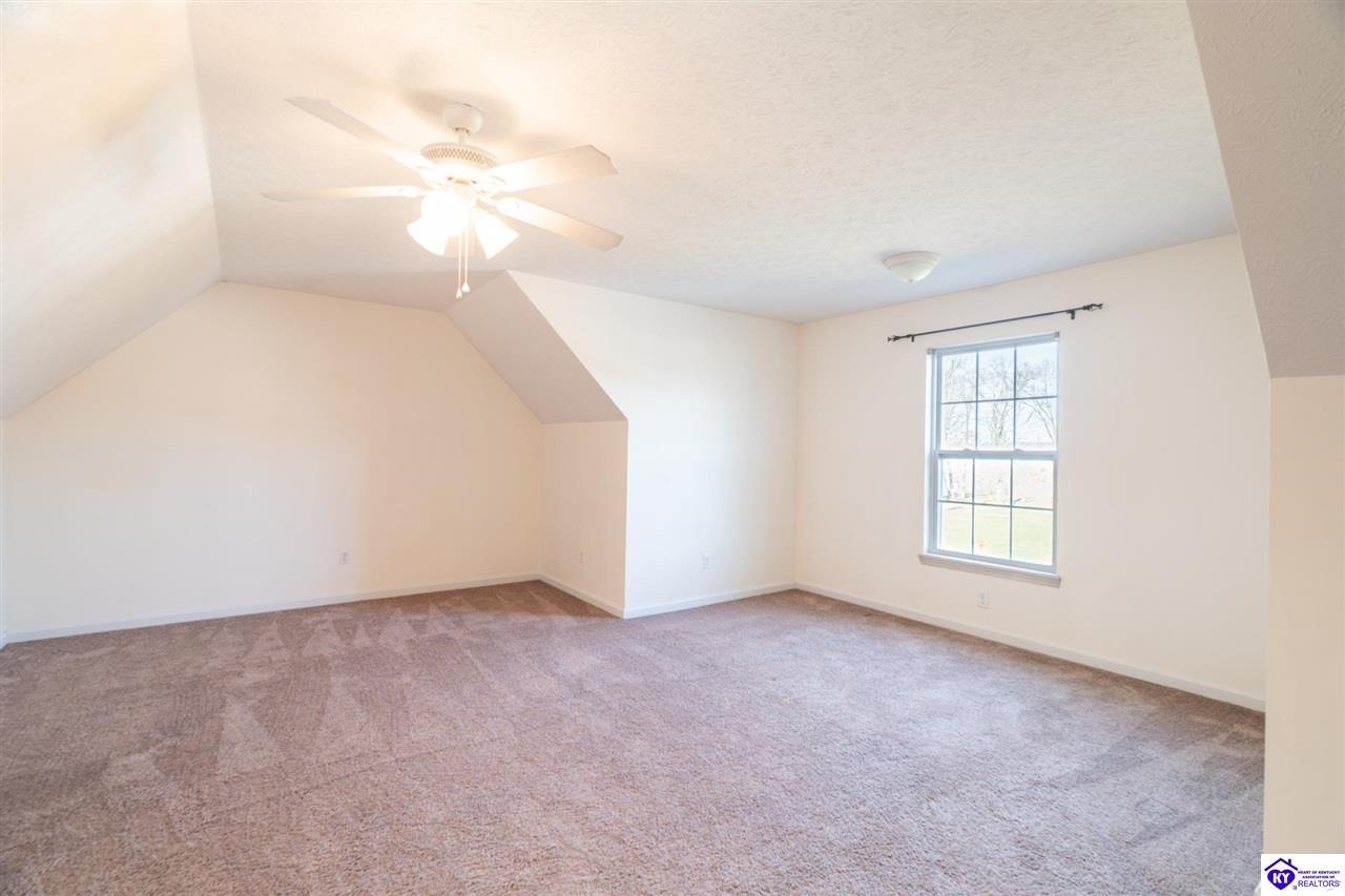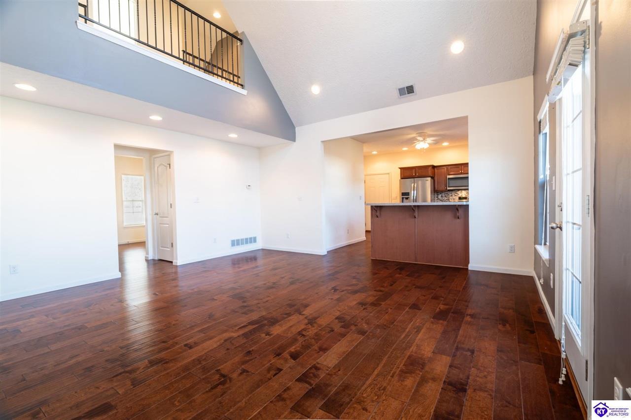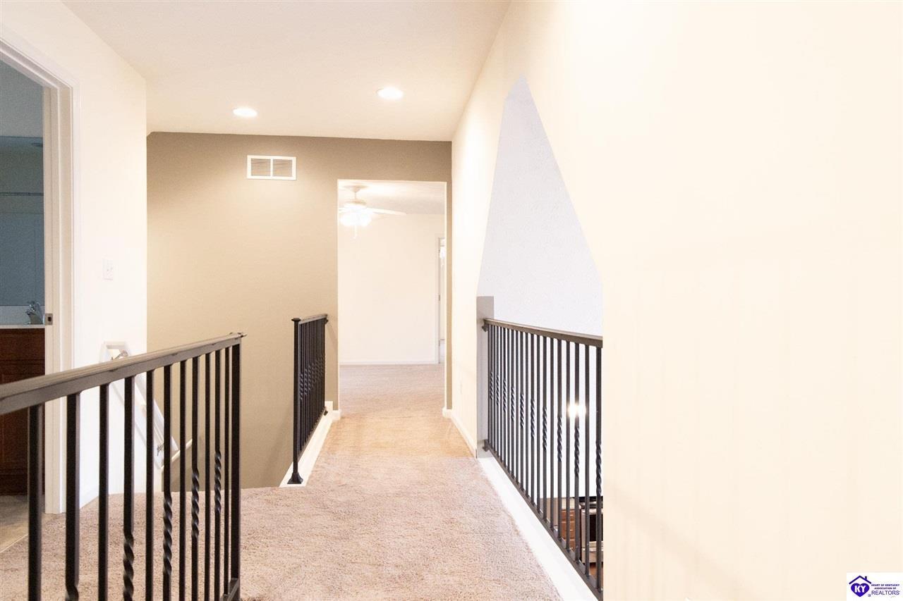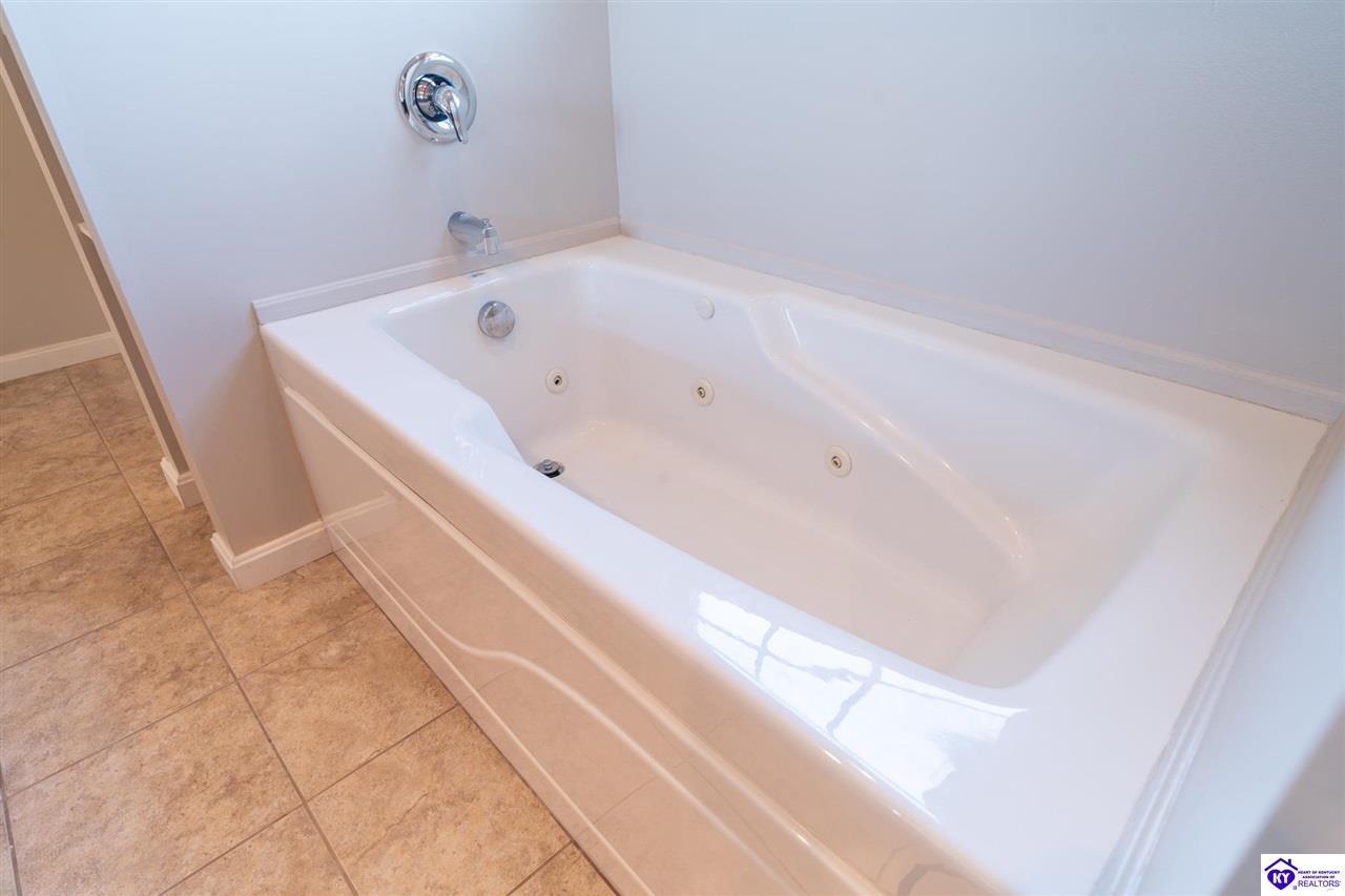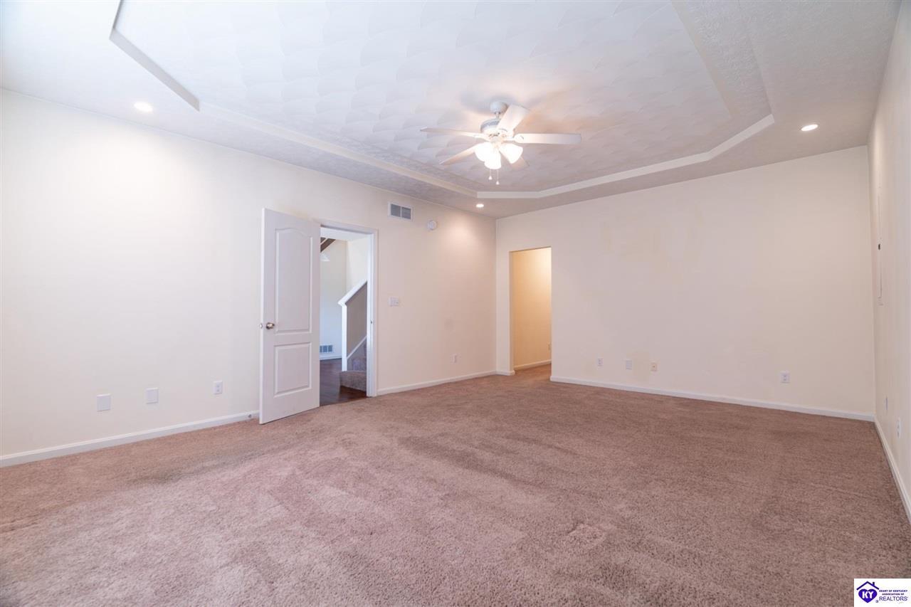 Realtor's notes: Discover this beautifully built, one-owner home tucked at the end of a cul-de-sac in River Cliff Estates. Built in 2016, the property offers a spacious layout and standout features inside and out. The backyard is designed for fun and functionality, complete with a 33-foot pool and hot tub added in fall of 2023, plus a fully fenced yard for pets, gatherings, and everyday use. The main level offers 9-foot ceilings and a dramatic vaulted living room accented by a dual staircase and an open balcony landing. The first floor is handicapped accessible and includes a large primary suite with dual vanities, a whirlpool tub, a separate shower, and a walk-in closet that doubles as a built-in storm shelter/safe room. Upstairs, two generously sized bedrooms and a large bonus room provide flexible space for work, play, or additional living space. A full bathroom with double sinks and abundant storage, thanks to double closets, completes the upper level. The kitchen is designed with cooking and baking in mind, offering extensive cabinet storage and a highly usable layout. A formal dining room with a tray ceiling provides the perfect spot for hosting meals and celebrations. The home also features a blue light HVAC system aimed at reducing mold and allergens. Located just 20 minutes from Fort Knox plus no HOA fees, this home is ready for its next owners. Schedule your private showing to see it in person!