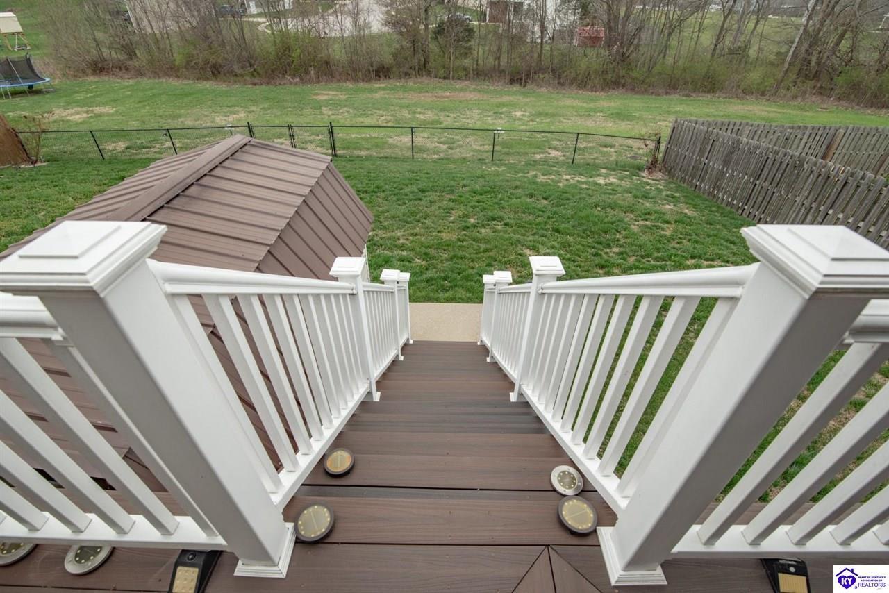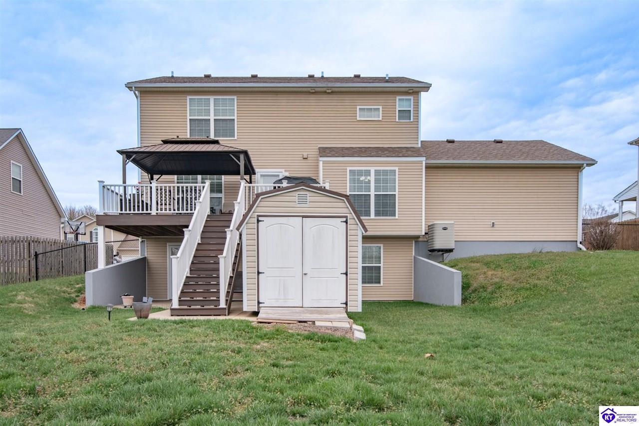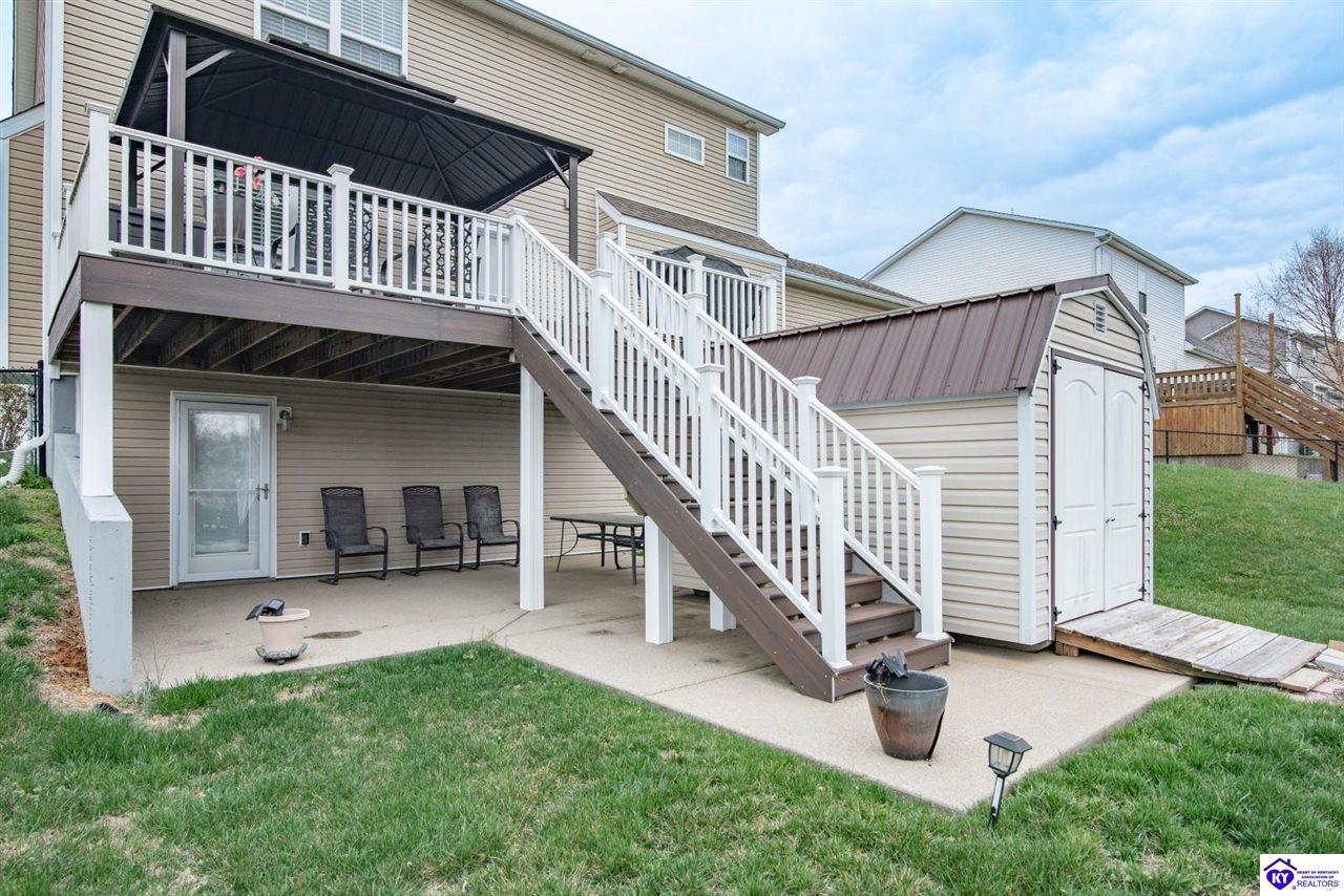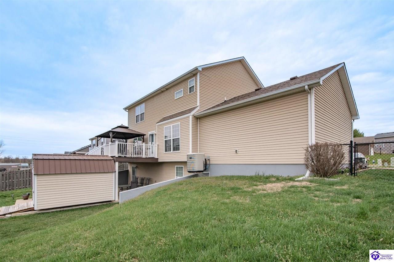 Realtor's notes: Spacious two-story home offering flexible living and plenty of room to grow! The upper level features three bedrooms, including a primary suite with ensuite bath and walk-in closet, plus a full bath and convenient upstairs laundry. The main floor includes a sitting or bonus room, formal dining room, open kitchen with dining area and a welcoming living room with electric fireplace and access to a large deck. The finished walkout basement provides a family room additional bedroom and full bath with access to a lower patio. Enjoy a fenced backyard with storage shed and an attached two car garage - perfect for comfortable everyday living and entertaining. Water softener, stove/range, refrigerator, microwave, dishwasher, washer and dryer, water filter included.