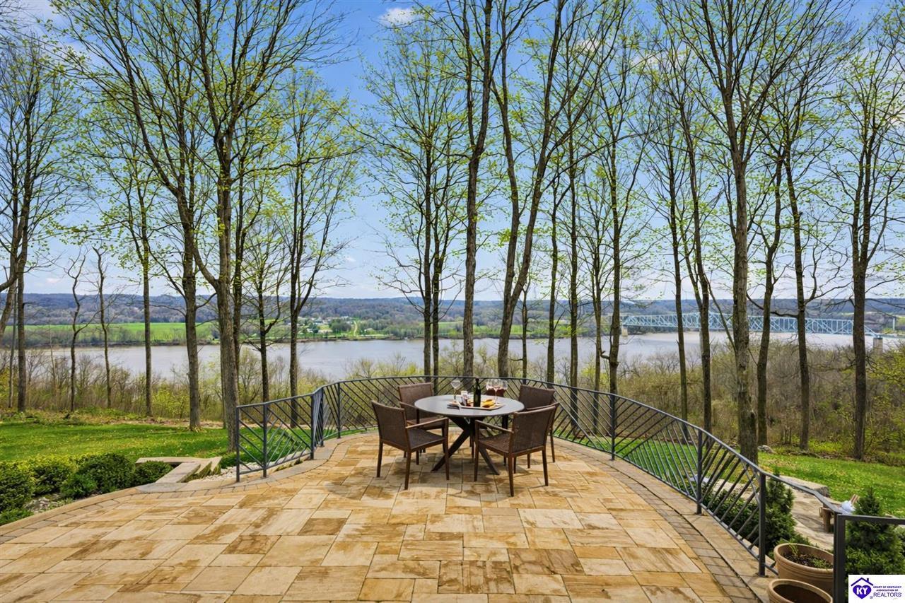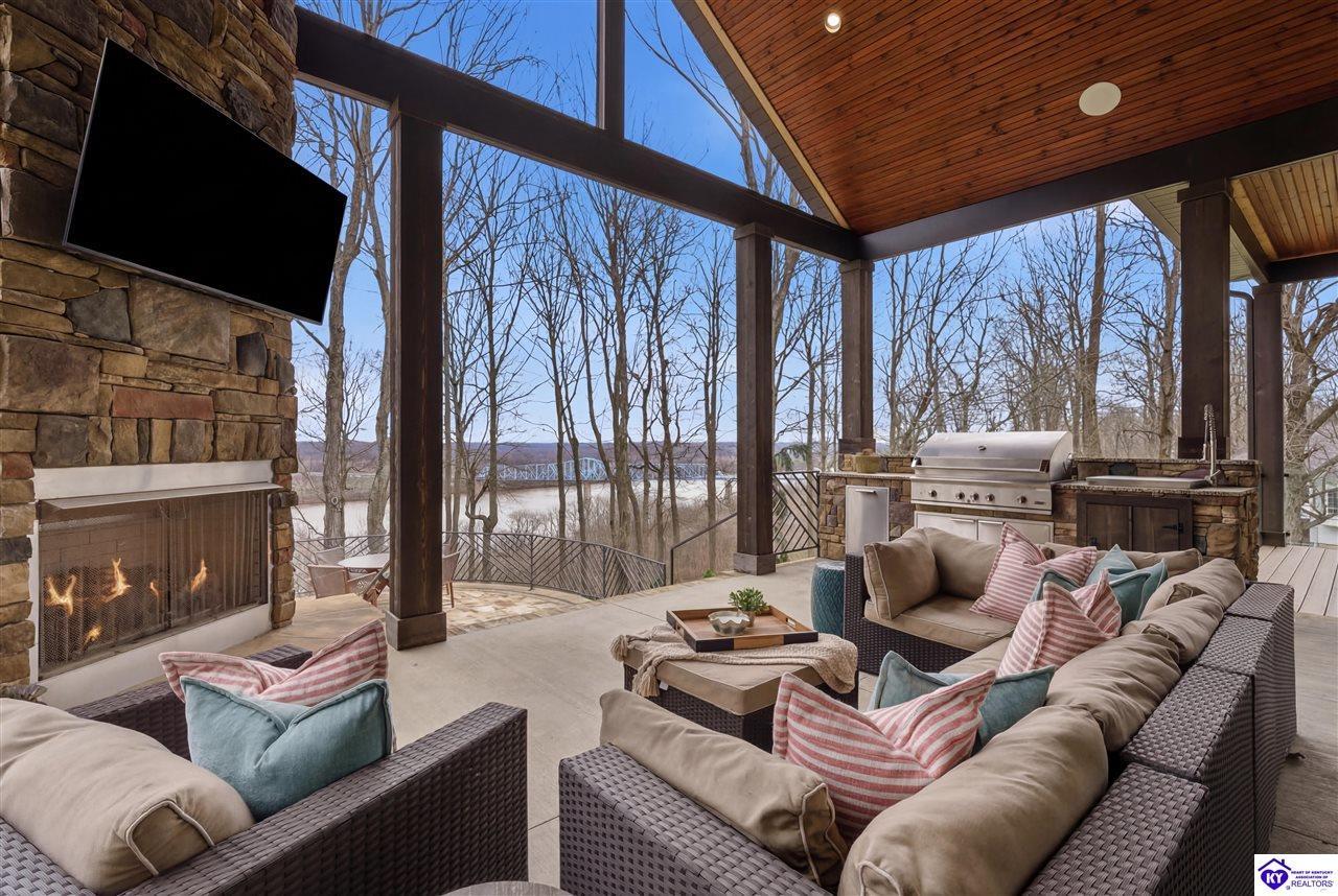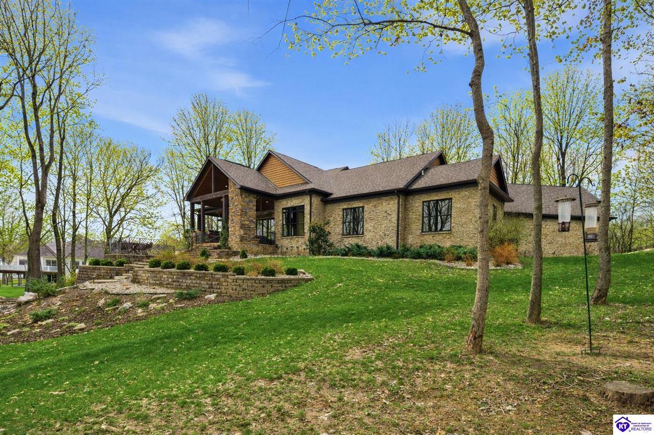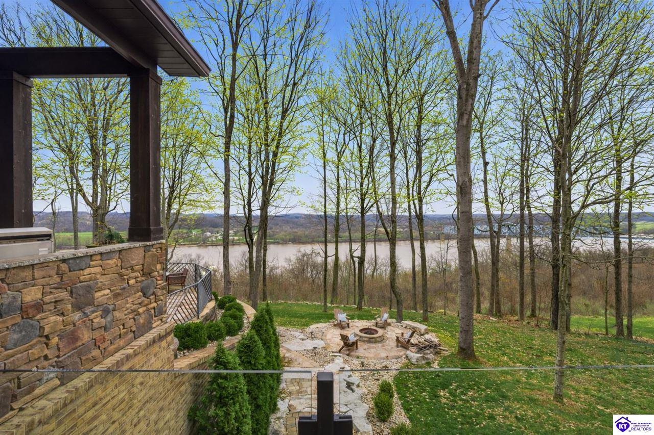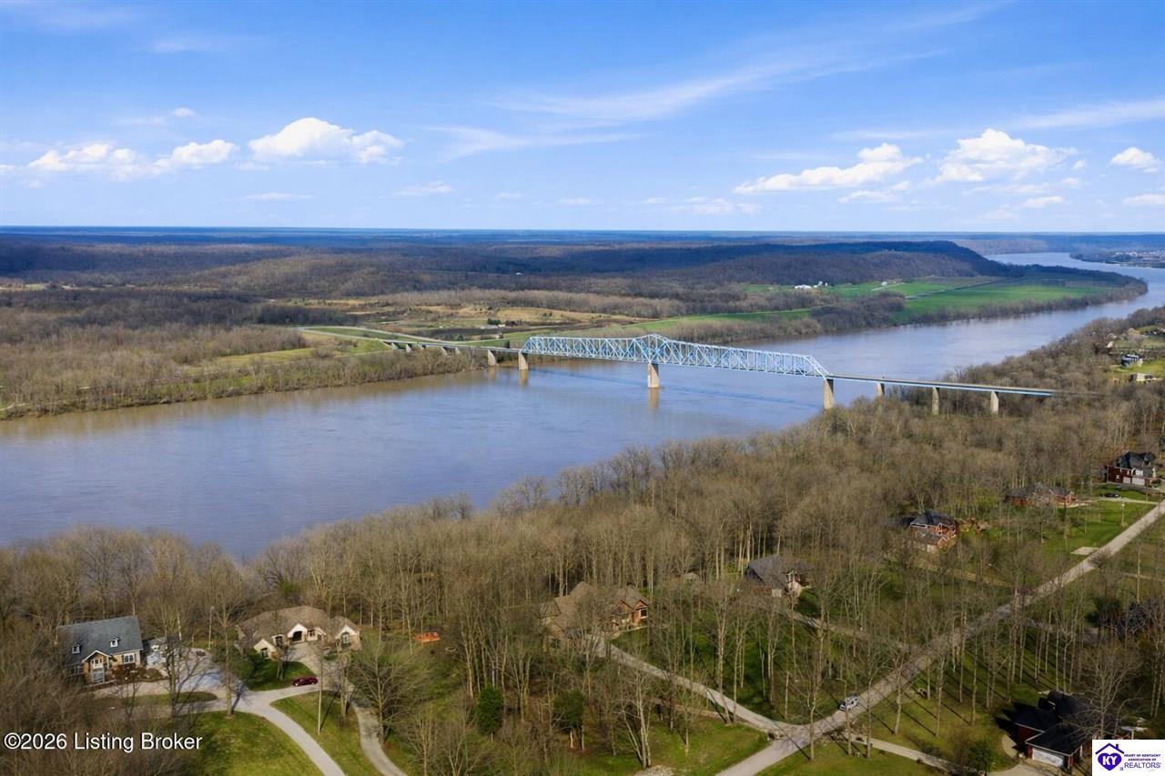 Realtor's notes: Perched above the tranquil waters of the Ohio River, this extraordinary custom-built riverview ranch in Brandenburg offers breathtaking panoramic river views, luxury finishes, and resort-style outdoor living. With nearly 5,000 square feet of finished living space, this remarkable property presents a rare opportunity to experience true riverfront luxury while remaining conveniently located to Louisville, New Albany, and Elizabethtown. A winding concrete driveway leads to a striking exterior of brick, cedar, and stone, highlighted by a deep front porch designed to capture the peaceful river setting. Inside, hand-scraped engineered wood flooring, premium materials, and thoughtful architectural details create a warm yet refined atmosphere. The home also offers over 800 square feet of storage and a dedicated storm shelter for added peace of mind. The heart of the home is a spectacular open-concept living space designed for both everyday living and entertaining. A dramatic floor-to-ceiling stone fireplace anchors the family room while expansive glass doors frame stunning river views and connect seamlessly to the outdoor living areas. The chef's kitchen features custom cabinetry, a large walk-in pantry, and a hidden coffee bar tucked within the cabinetry. Nearby, the dining room showcases a beautiful wood tray ceiling and connects to a private wine cellar, creating the perfect setting for entertaining. The luxurious primary suite serves as a private retreat with incredible river views and sliding doors that open directly to the outdoor living spaces. The spa-inspired primary bathroom includes a soaking tub, expansive walk-in shower, designer tilework, and a custom walk-in closet designed with both elegance and organization in mind. Outdoor living feels like a private riverfront resort, featuring a covered entertaining area with a full outdoor kitchen, fireplace with television, infrared heaters, and low-maintenance Trex decking. Tiered outdoor spaces provide multiple areas to relax, dine, and gather around the fire pit while overlooking the breathtaking Ohio River.
