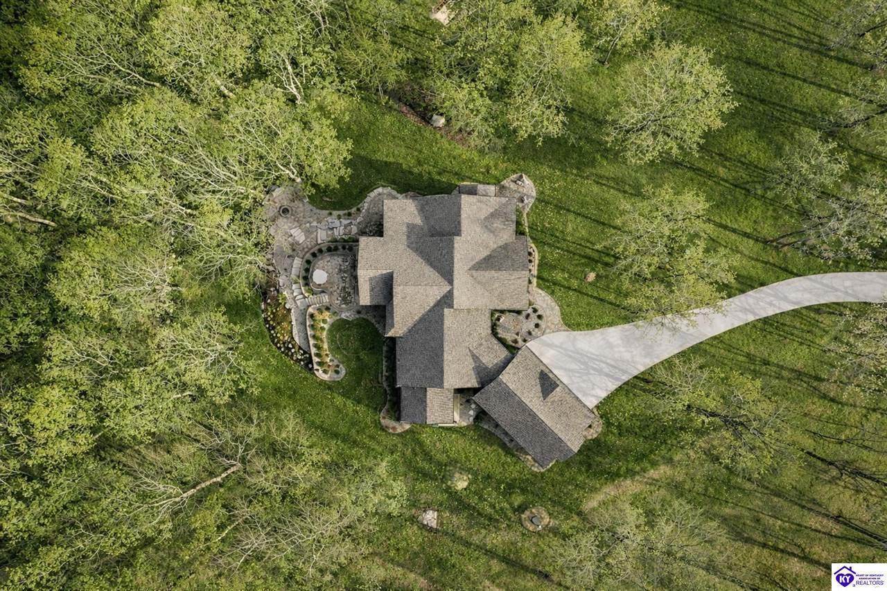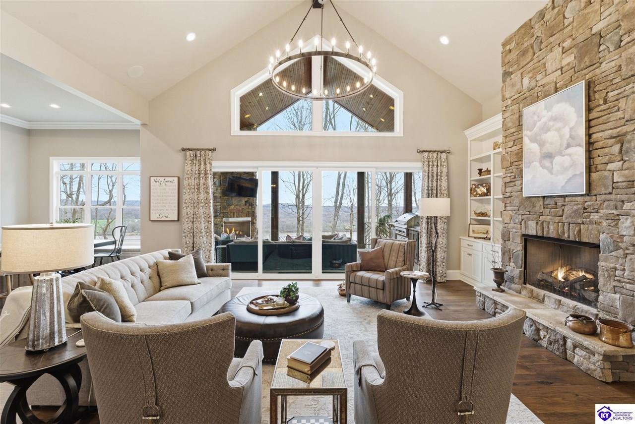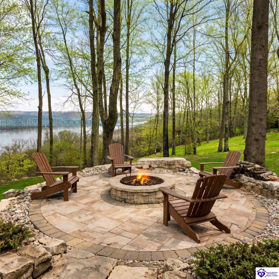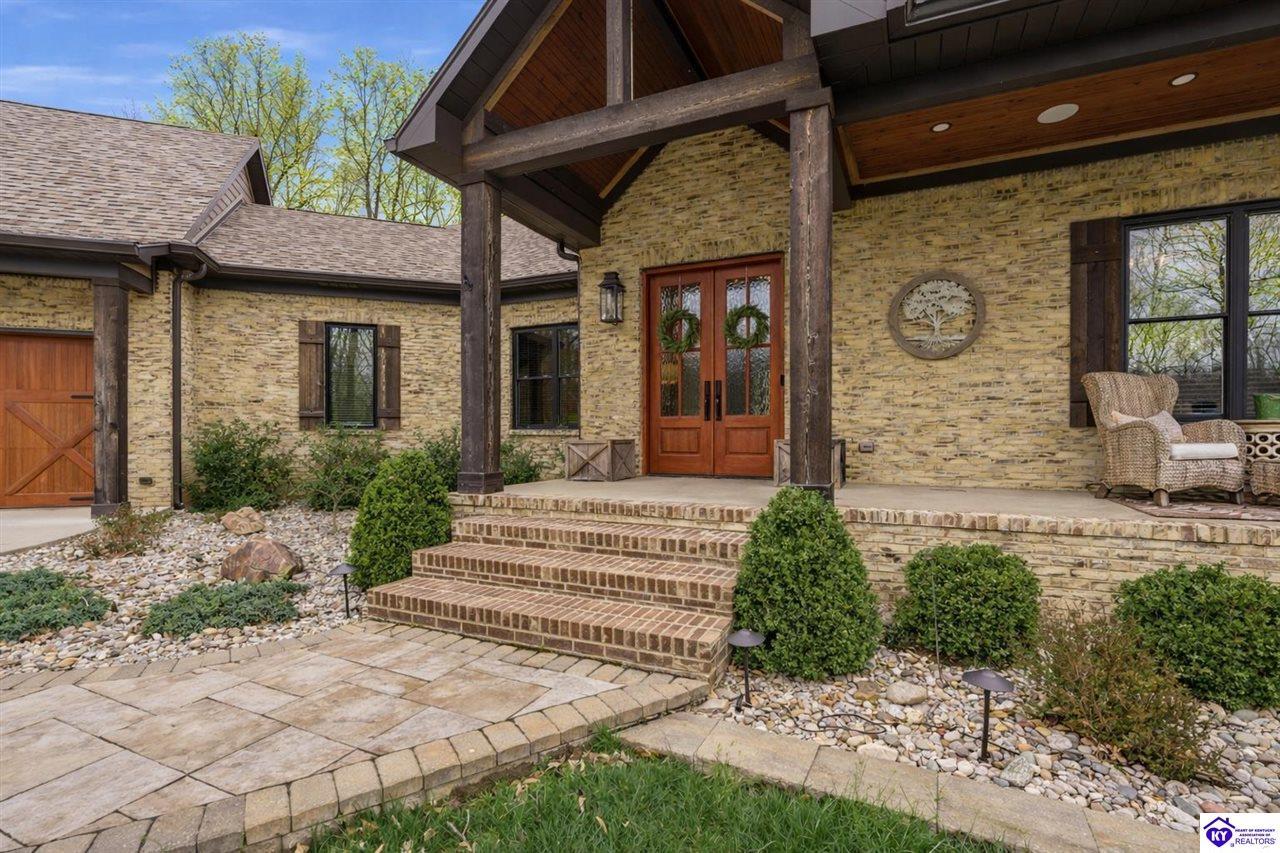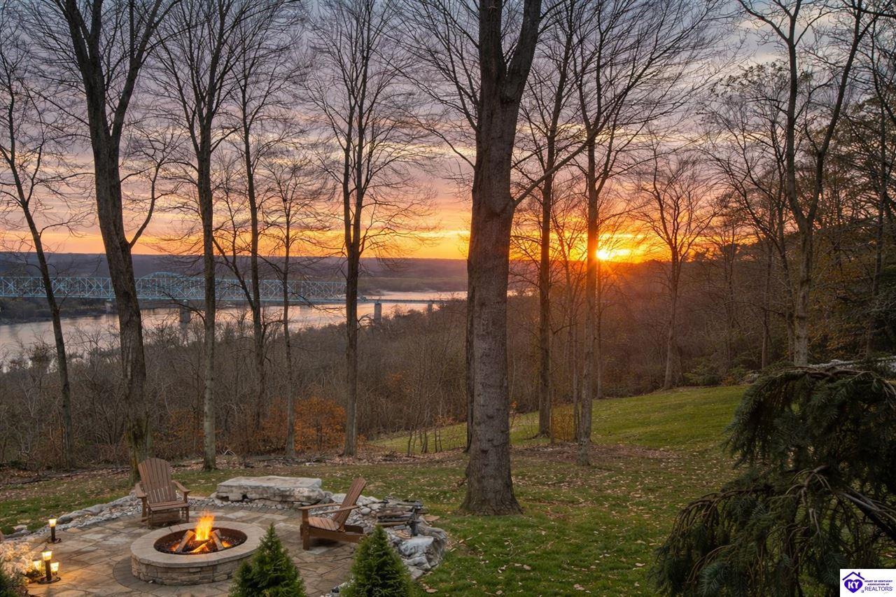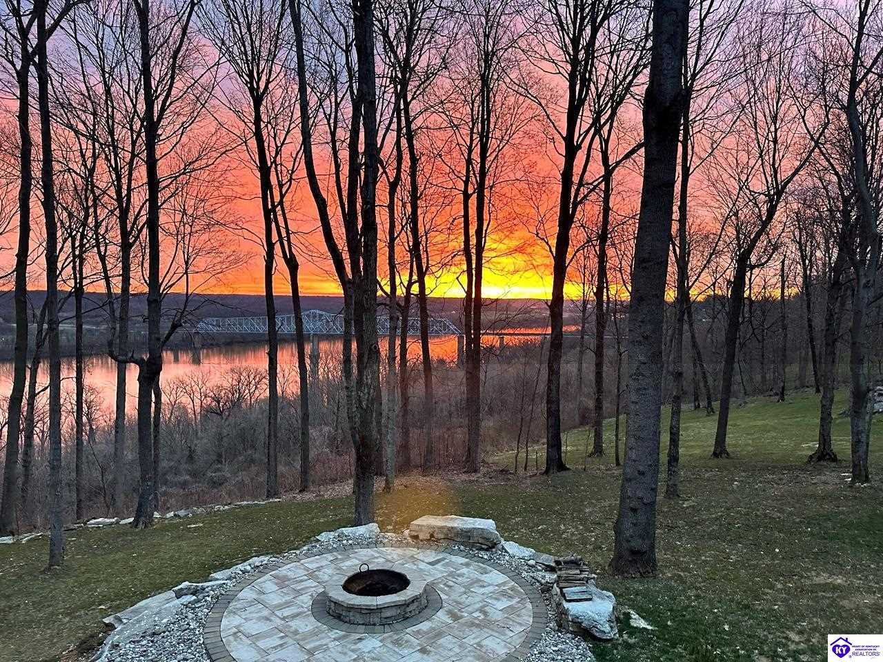 Realtor's notes: Perched above the tranquil waters of the Ohio River, this extraordinary custom-built riverview ranch in Brandenburg offers breathtaking panoramic river views, luxury finishes, and resort-style outdoor living. With nearly 5,000 square feet of finished living space, this remarkable property presents a rare opportunity to experience true riverfront luxury while remaining conveniently located to Louisville, New Albany, and Elizabethtown. A winding concrete driveway leads to a striking exterior of brick, cedar, and stone, highlighted by a deep front porch designed to capture the peaceful river setting. Inside, hand-scraped engineered wood flooring, premium materials, and thoughtful architectural details create a warm yet refined atmosphere. The home also offers over 800 square feet of storage and a dedicated storm shelter for added peace of mind. The heart of the home is a spectacular open-concept living space designed for both everyday living and entertaining. A dramatic floor-to-ceiling stone fireplace anchors the family room while expansive glass doors frame stunning river views and connect seamlessly to the outdoor living areas. The chef's kitchen features custom cabinetry, a large walk-in pantry, and a hidden coffee bar tucked within the cabinetry. Nearby, the dining room showcases a beautiful wood tray ceiling and connects to a private wine cellar, creating the perfect setting for entertaining. The luxurious primary suite serves as a private retreat with incredible river views and sliding doors that open directly to the outdoor living spaces. The spa-inspired primary bathroom includes a soaking tub, expansive walk-in shower, designer tilework, and a custom walk-in closet designed with both elegance and organization in mind. Outdoor living feels like a private riverfront resort, featuring a covered entertaining area with a full outdoor kitchen, fireplace with television, infrared heaters, and low-maintenance Trex decking. Tiered outdoor spaces provide multiple areas to relax, dine, and gather around the fire pit while overlooking the breathtaking Ohio River.