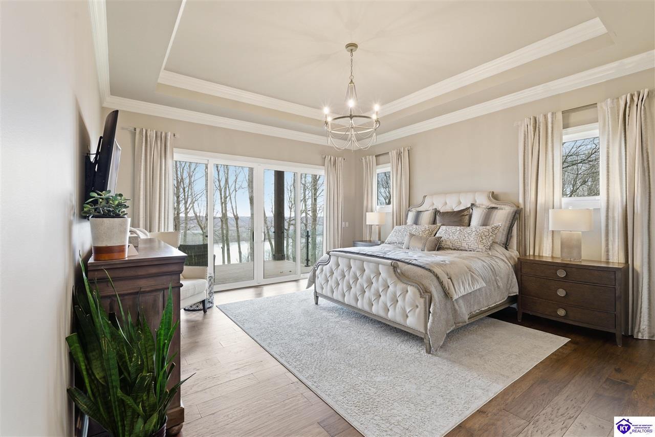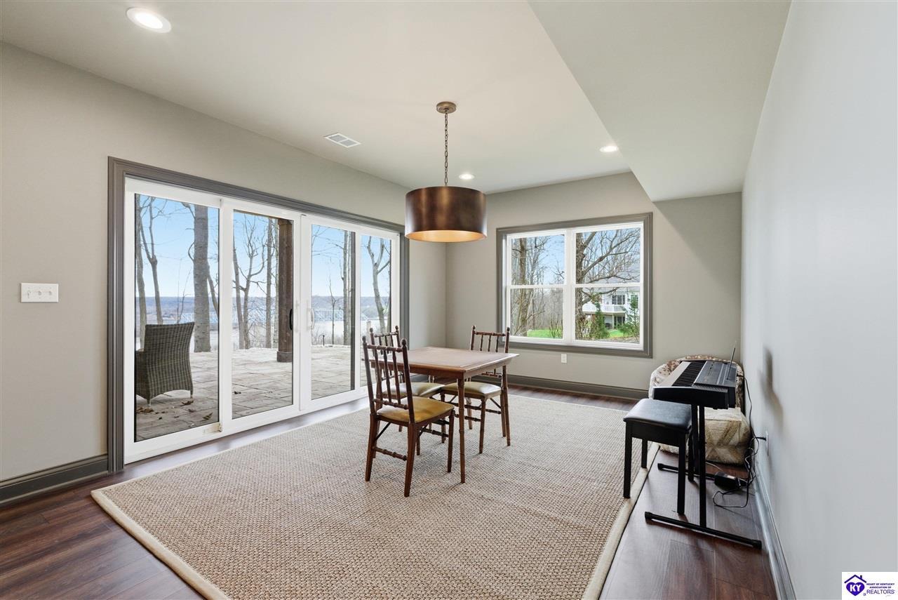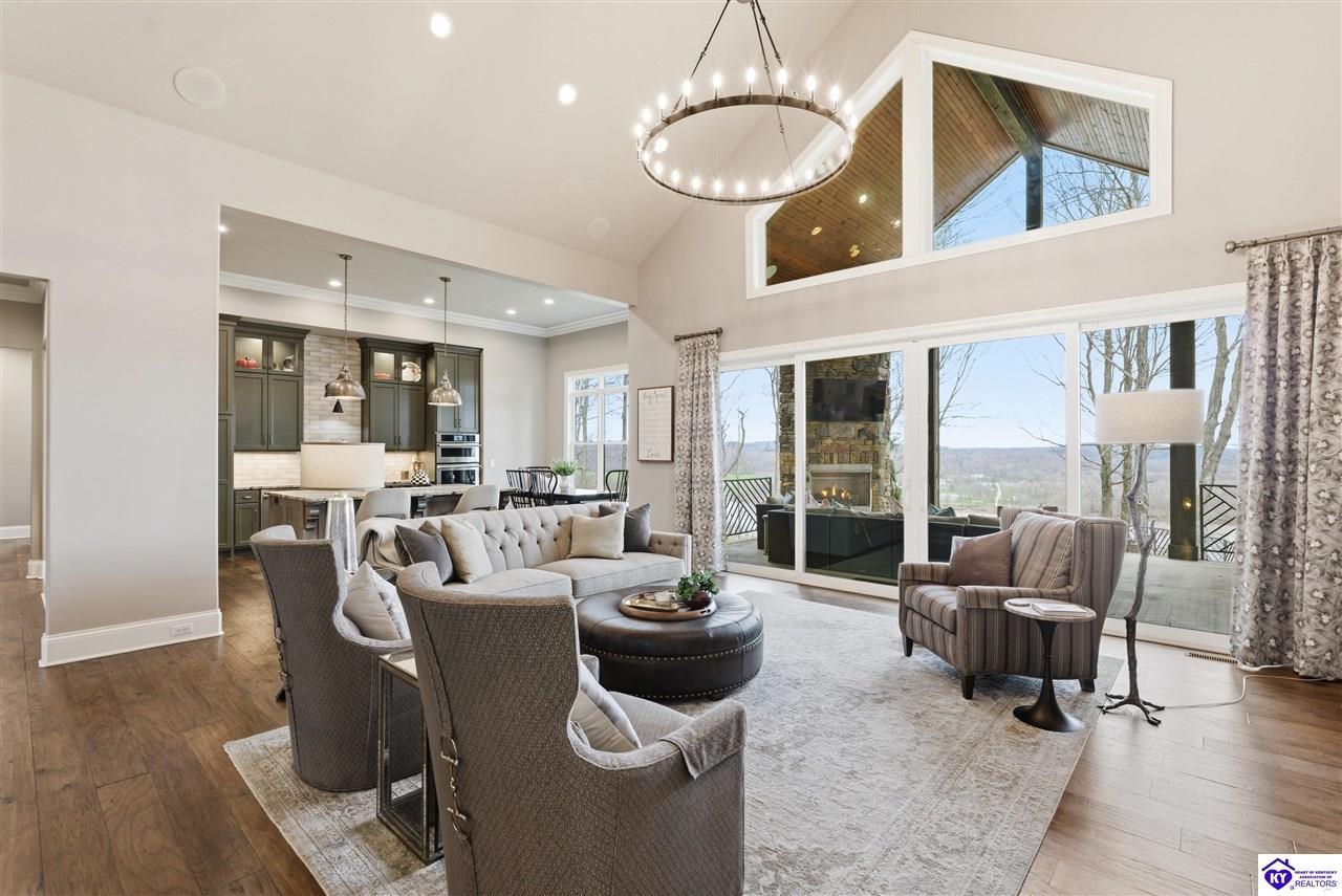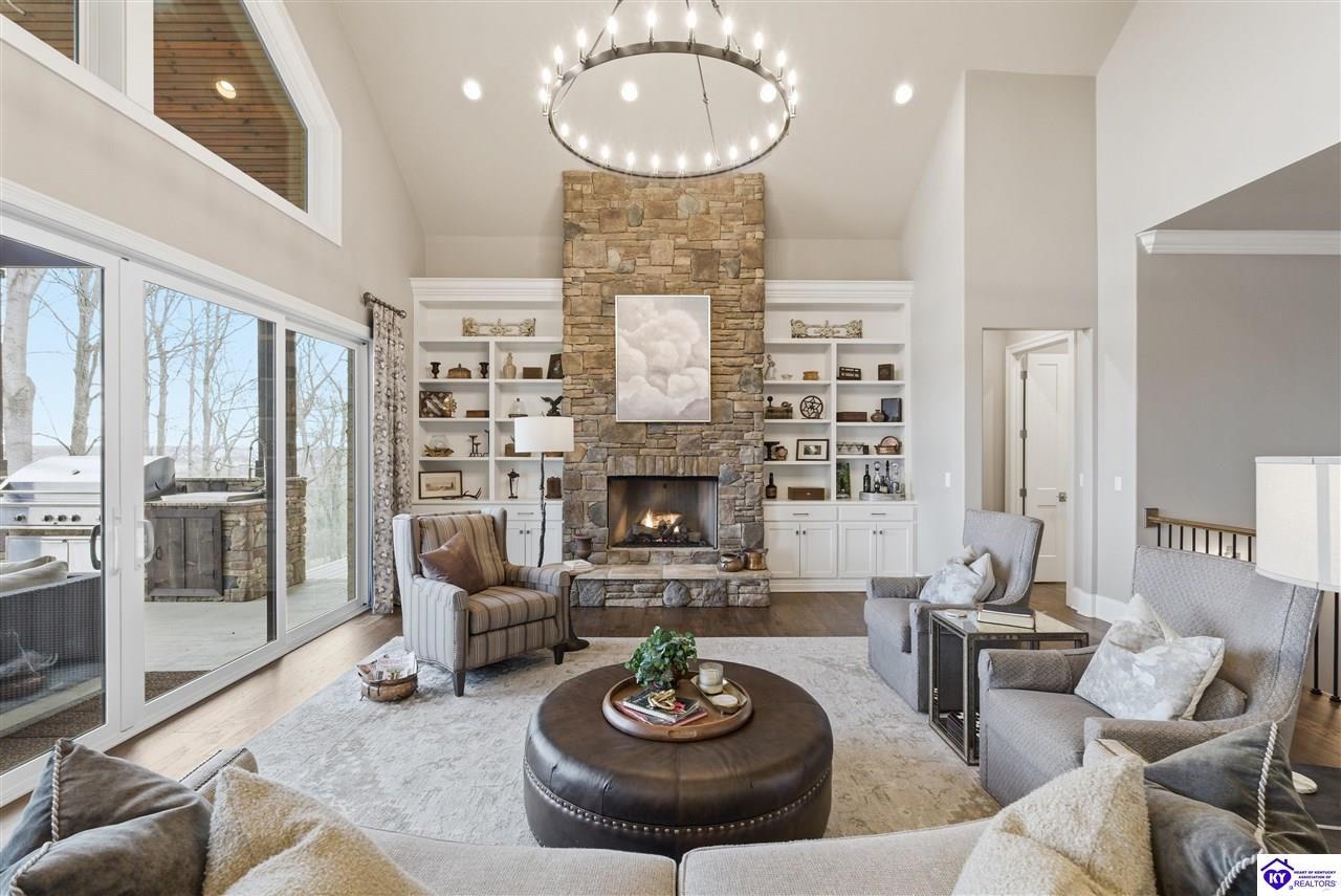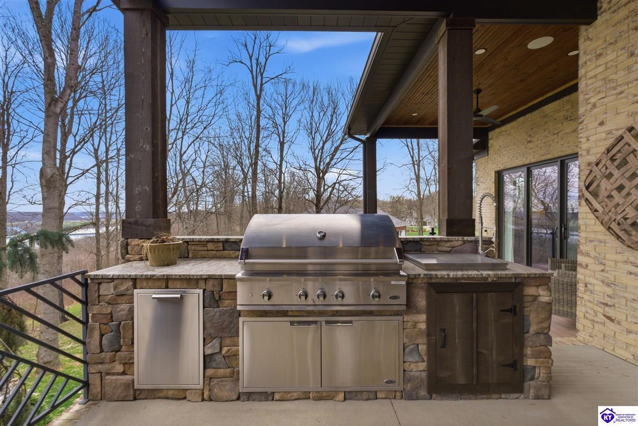 Realtor's notes: Perched above the tranquil waters of the Ohio River, this extraordinary custom-built riverview ranch in Brandenburg offers breathtaking panoramic river views, luxury finishes, and resort-style outdoor living. With nearly 5,000 square feet of finished living space, this remarkable property presents a rare opportunity to experience true riverfront luxury while remaining conveniently located to Louisville, New Albany, and Elizabethtown. A winding concrete driveway leads to a striking exterior of brick, cedar, and stone, highlighted by a deep front porch designed to capture the peaceful river setting. Inside, hand-scraped engineered wood flooring, premium materials, and thoughtful architectural details create a warm yet refined atmosphere. The home also offers over 800 square feet of storage and a dedicated storm shelter for added peace of mind. The heart of the home is a spectacular open-concept living space designed for both everyday living and entertaining. A dramatic floor-to-ceiling stone fireplace anchors the family room while expansive glass doors frame stunning river views and connect seamlessly to the outdoor living areas. The chef's kitchen features custom cabinetry, a large walk-in pantry, and a hidden coffee bar tucked within the cabinetry. Nearby, the dining room showcases a beautiful wood tray ceiling and connects to a private wine cellar, creating the perfect setting for entertaining. The luxurious primary suite serves as a private retreat with incredible river views and sliding doors that open directly to the outdoor living spaces. The spa-inspired primary bathroom includes a soaking tub, expansive walk-in shower, designer tilework, and a custom walk-in closet designed with both elegance and organization in mind. Outdoor living feels like a private riverfront resort, featuring a covered entertaining area with a full outdoor kitchen, fireplace with television, infrared heaters, and low-maintenance Trex decking. Tiered outdoor spaces provide multiple areas to relax, dine, and gather around the fire pit while overlooking the breathtaking Ohio River.