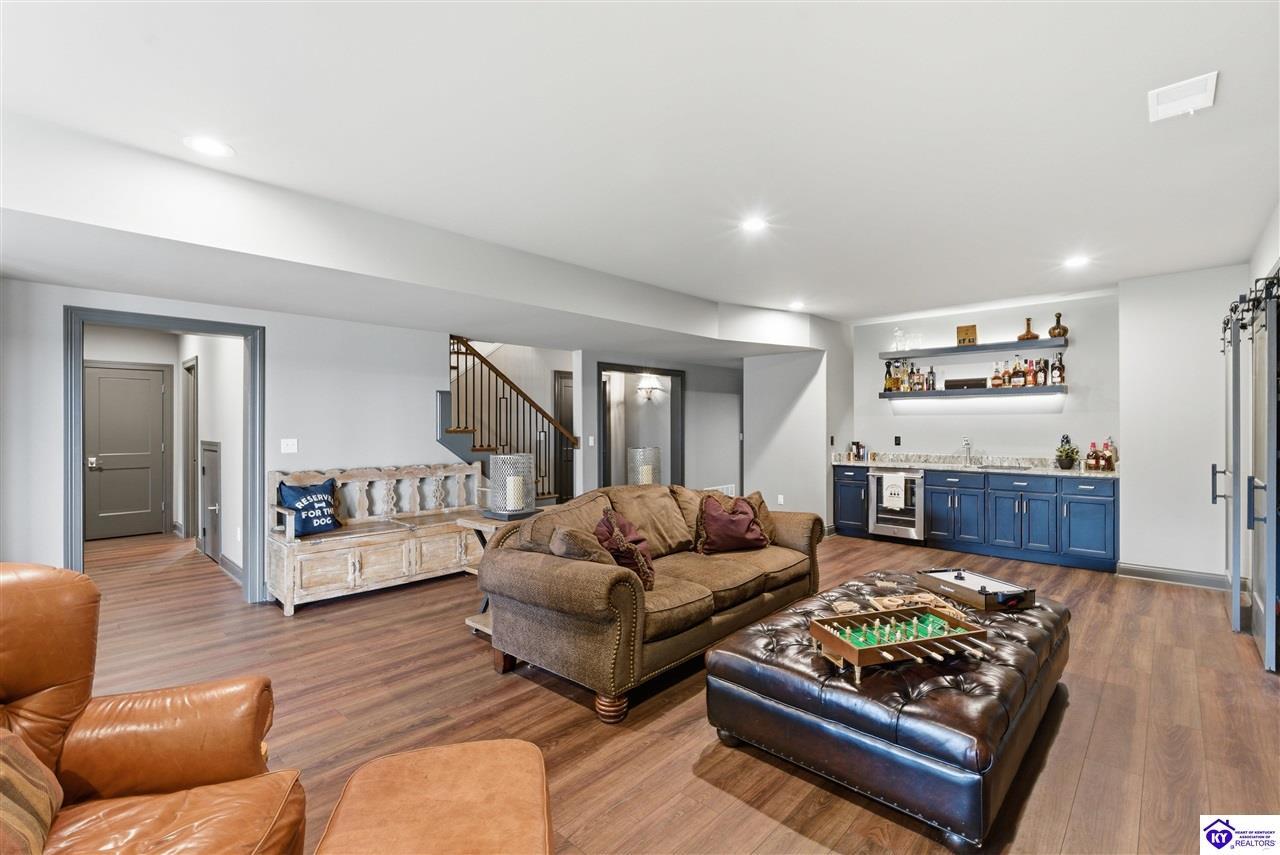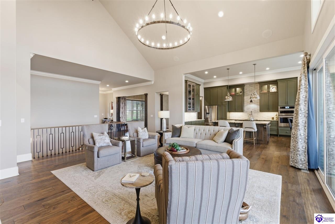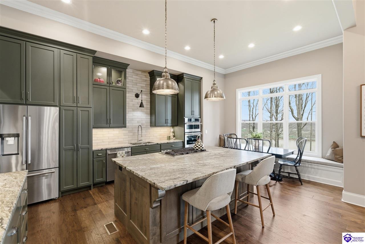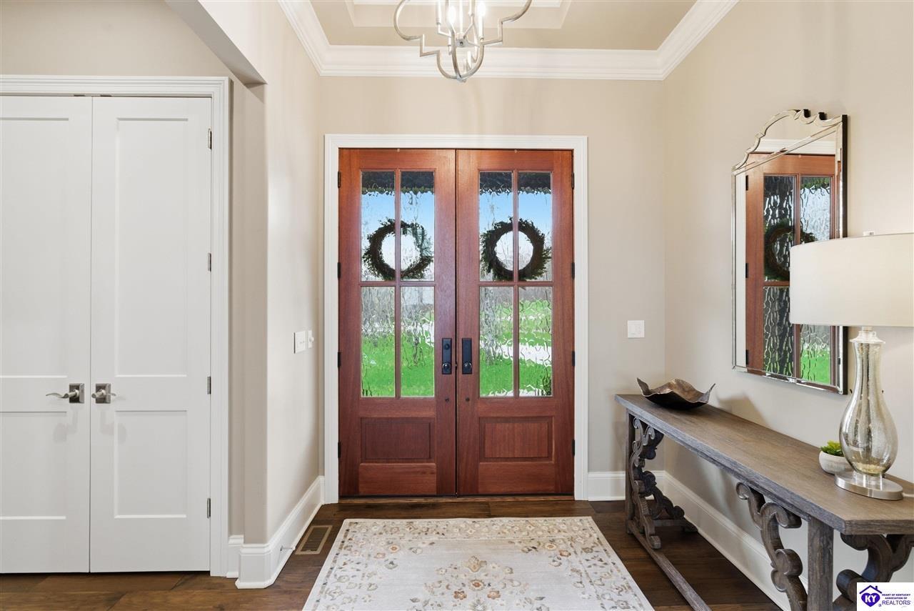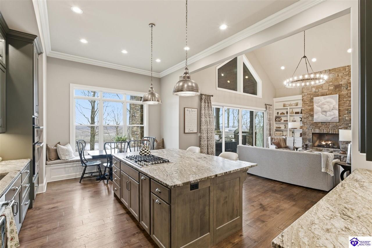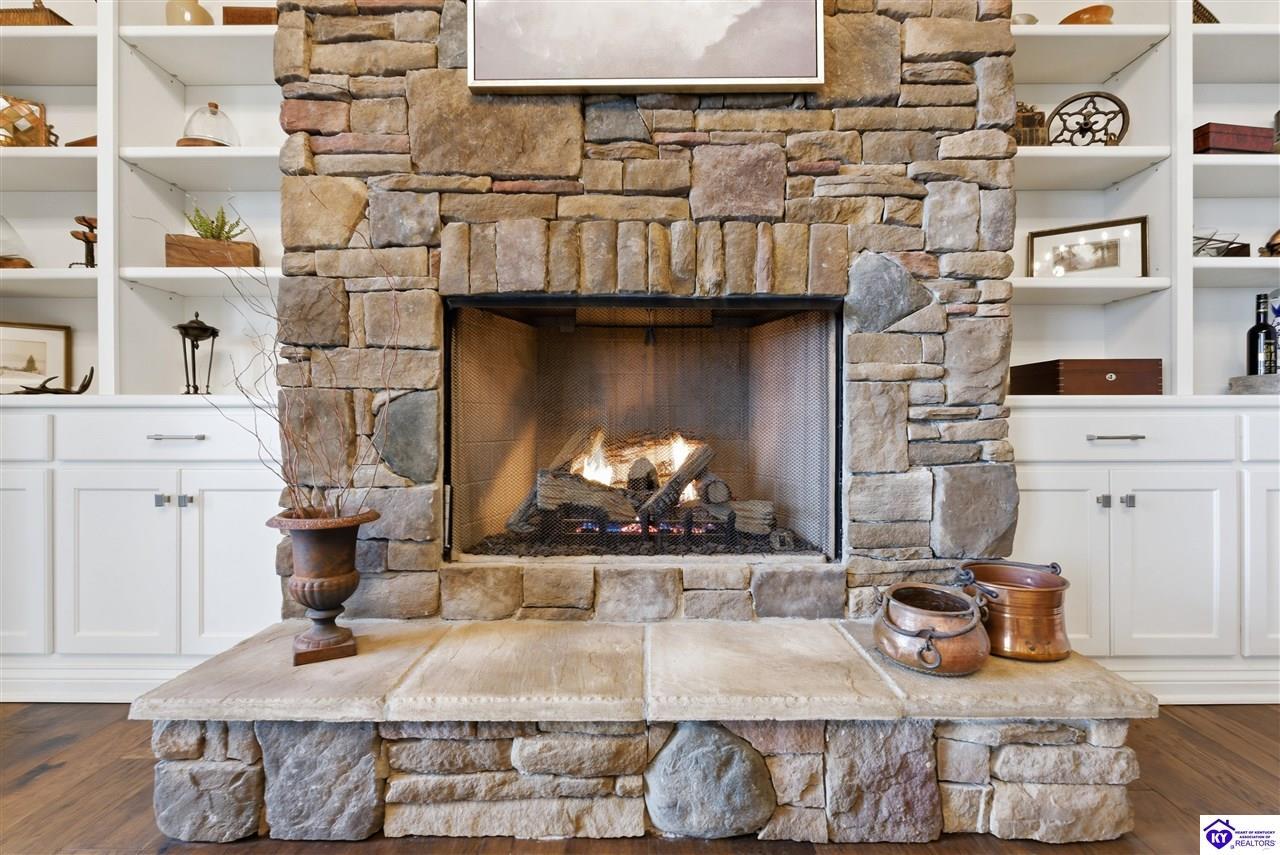 Realtor's notes: Perched above the tranquil waters of the Ohio River, this extraordinary custom-built riverview ranch in Brandenburg offers breathtaking panoramic river views, luxury finishes, and resort-style outdoor living. With nearly 5,000 square feet of finished living space, this remarkable property presents a rare opportunity to experience true riverfront luxury while remaining conveniently located to Louisville, New Albany, and Elizabethtown. A winding concrete driveway leads to a striking exterior of brick, cedar, and stone, highlighted by a deep front porch designed to capture the peaceful river setting. Inside, hand-scraped engineered wood flooring, premium materials, and thoughtful architectural details create a warm yet refined atmosphere. The home also offers over 800 square feet of storage and a dedicated storm shelter for added peace of mind. The heart of the home is a spectacular open-concept living space designed for both everyday living and entertaining. A dramatic floor-to-ceiling stone fireplace anchors the family room while expansive glass doors frame stunning river views and connect seamlessly to the outdoor living areas. The chef's kitchen features custom cabinetry, a large walk-in pantry, and a hidden coffee bar tucked within the cabinetry. Nearby, the dining room showcases a beautiful wood tray ceiling and connects to a private wine cellar, creating the perfect setting for entertaining. The luxurious primary suite serves as a private retreat with incredible river views and sliding doors that open directly to the outdoor living spaces. The spa-inspired primary bathroom includes a soaking tub, expansive walk-in shower, designer tilework, and a custom walk-in closet designed with both elegance and organization in mind. Outdoor living feels like a private riverfront resort, featuring a covered entertaining area with a full outdoor kitchen, fireplace with television, infrared heaters, and low-maintenance Trex decking. Tiered outdoor spaces provide multiple areas to relax, dine, and gather around the fire pit while overlooking the breathtaking Ohio River.