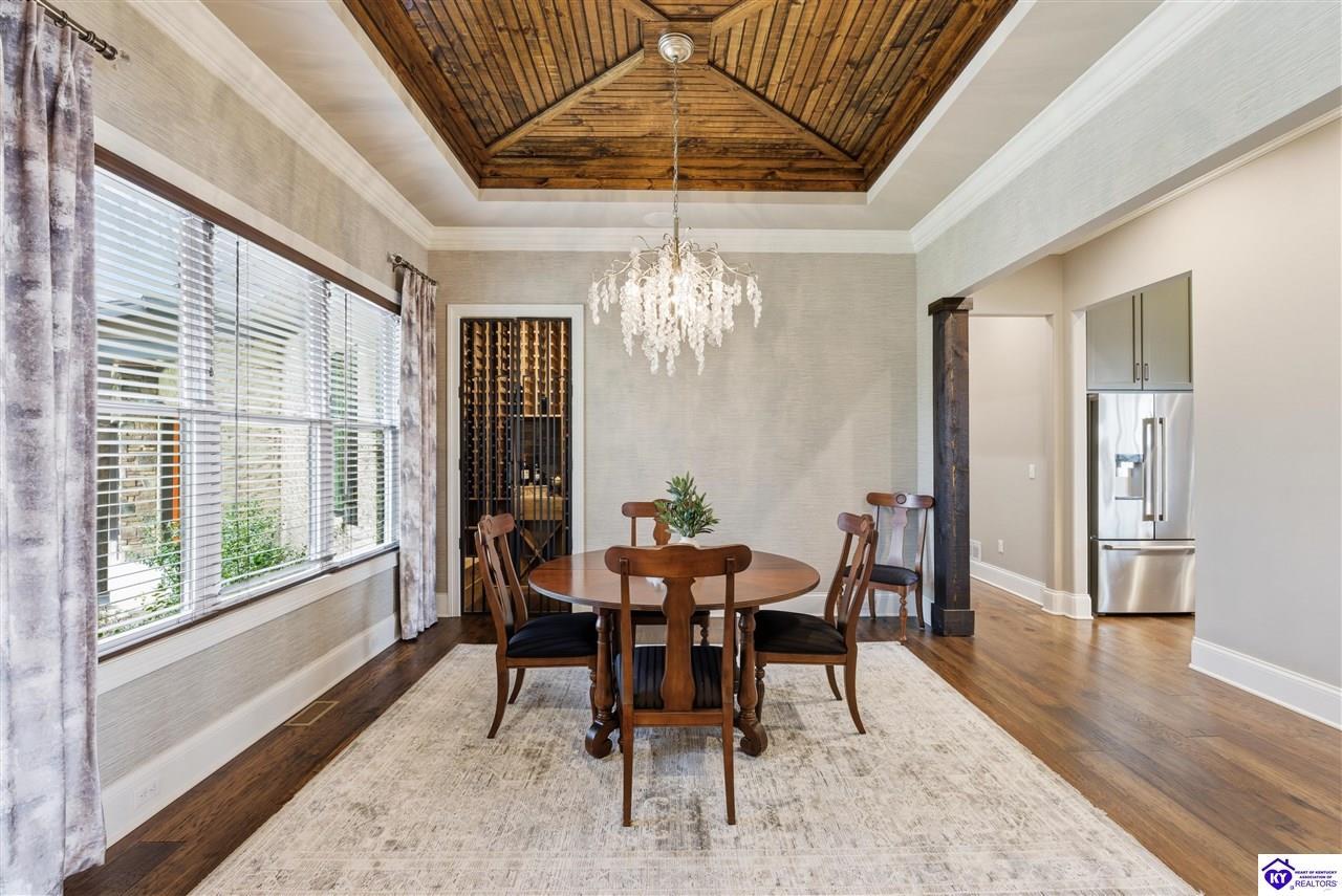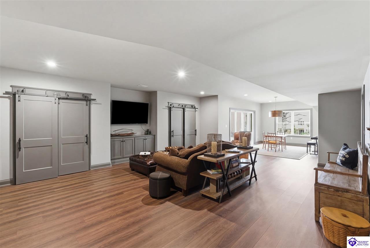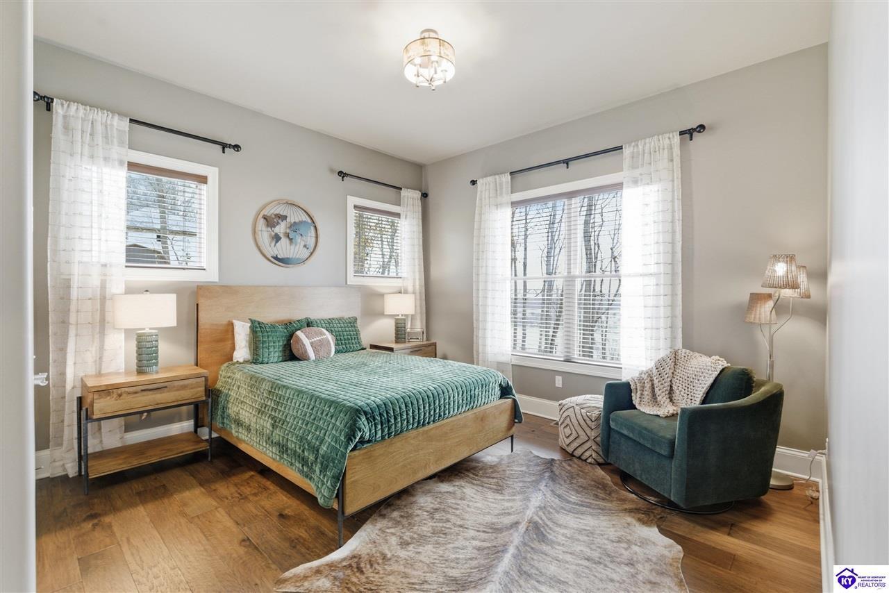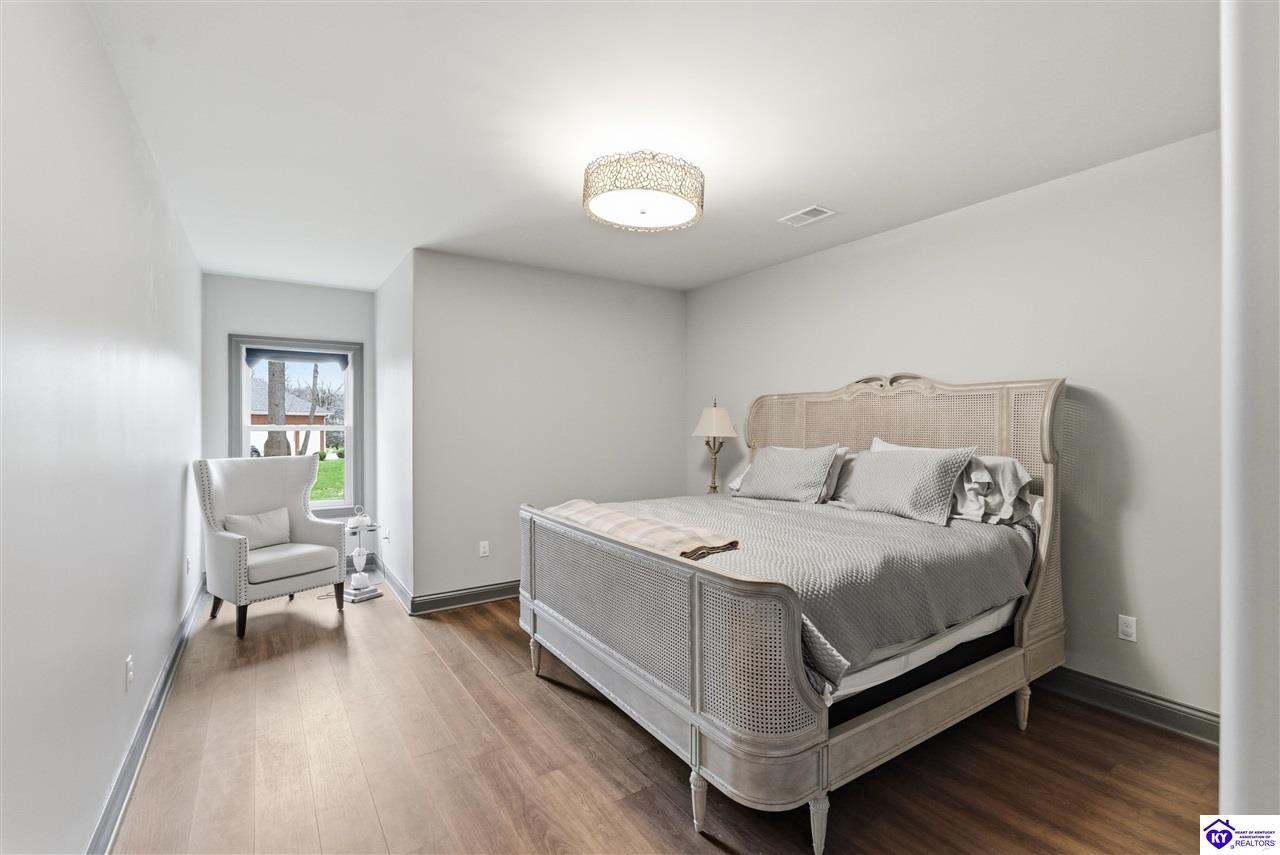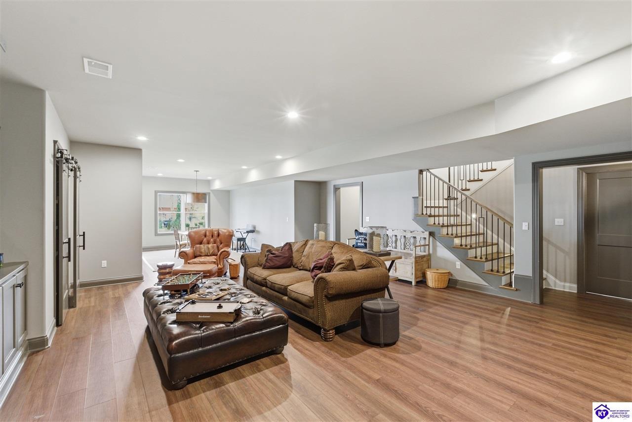 Realtor's notes: Perched above the tranquil waters of the Ohio River, this extraordinary custom-built riverview ranch in Brandenburg offers breathtaking panoramic river views, luxury finishes, and resort-style outdoor living. With nearly 5,000 square feet of finished living space, this remarkable property presents a rare opportunity to experience true riverfront luxury while remaining conveniently located to Louisville, New Albany, and Elizabethtown. A winding concrete driveway leads to a striking exterior of brick, cedar, and stone, highlighted by a deep front porch designed to capture the peaceful river setting. Inside, hand-scraped engineered wood flooring, premium materials, and thoughtful architectural details create a warm yet refined atmosphere. The home also offers over 800 square feet of storage and a dedicated storm shelter for added peace of mind. The heart of the home is a spectacular open-concept living space designed for both everyday living and entertaining. A dramatic floor-to-ceiling stone fireplace anchors the family room while expansive glass doors frame stunning river views and connect seamlessly to the outdoor living areas. The chef's kitchen features custom cabinetry, a large walk-in pantry, and a hidden coffee bar tucked within the cabinetry. Nearby, the dining room showcases a beautiful wood tray ceiling and connects to a private wine cellar, creating the perfect setting for entertaining. The luxurious primary suite serves as a private retreat with incredible river views and sliding doors that open directly to the outdoor living spaces. The spa-inspired primary bathroom includes a soaking tub, expansive walk-in shower, designer tilework, and a custom walk-in closet designed with both elegance and organization in mind. Outdoor living feels like a private riverfront resort, featuring a covered entertaining area with a full outdoor kitchen, fireplace with television, infrared heaters, and low-maintenance Trex decking. Tiered outdoor spaces provide multiple areas to relax, dine, and gather around the fire pit while overlooking the breathtaking Ohio River.