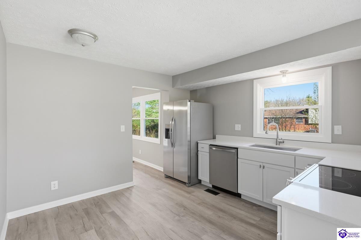 Realtor's notes: Welcome to this beautifully renovated home in the highly sought-after St. John’s Estates—one of Elizabethtown’s most established neighborhoods, known for its prime location and timeless appeal. Tucked at the end of a quiet cul-de-sac, this move-in-ready home offers the rare advantage that everything has been done for you. Completely transformed from top to bottom, updates include a brand new roof, all new windows, new flooring throughout, and fresh interior and exterior paint. Every detail has been thoughtfully upgraded with all new doors, trim, and brand new garage doors and system. At the heart of the home is a stunning floor-to-ceiling new kitchen, featuring quartz countertops, all new cabinetry, upgraded appliances, and a bright eat-in dining space designed for both everyday living and effortless entertaining. The home offers 3 bedrooms and 2 fully renovated bathrooms with modern, cohesive finishes. A flexible layout provides multiple living areas, including a spacious family room and a second bonus living space—perfect for a home office, playroom, or additional lounge. The full unfinished basement offers excellent storage and future expansion potential, complete with a lifetime guaranteed waterproofing system for added peace of mind. Step outside to a large, fully fenced backyard—ideal for relaxing, entertaining, or enjoying your own private outdoor space. Don't miss this rare opportunity to own a fully remodeled home in a premium location with no projects, no updates, and no compromises—just move in and enjoy!