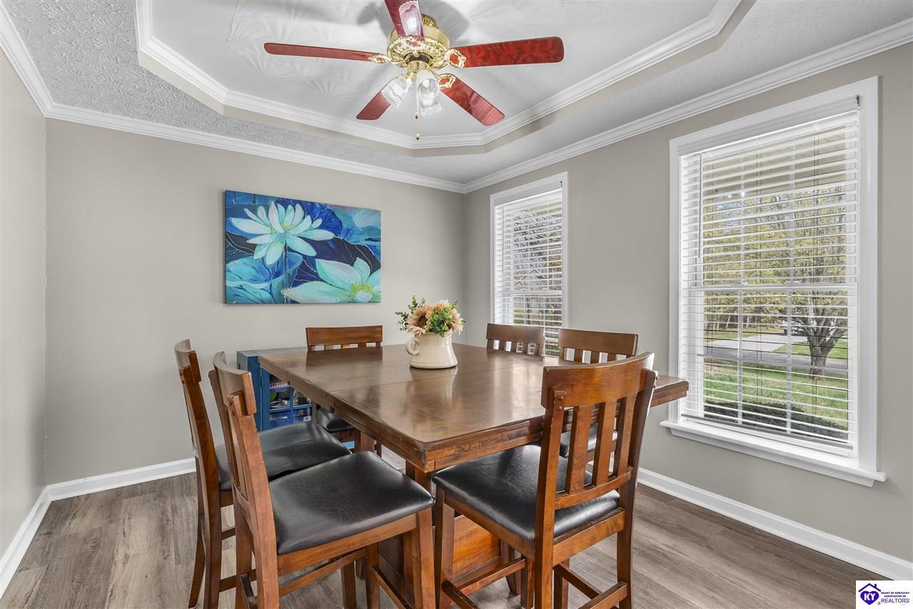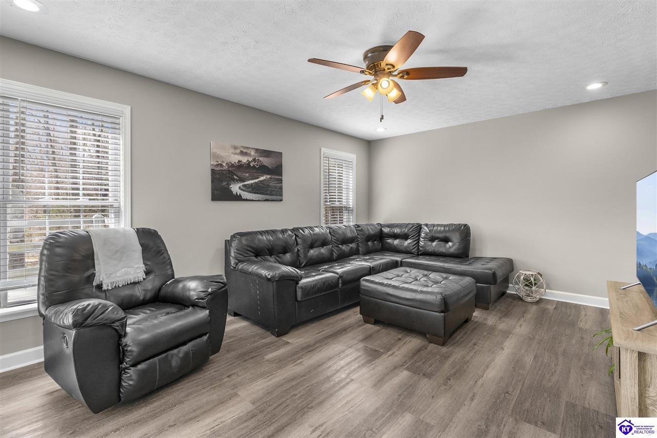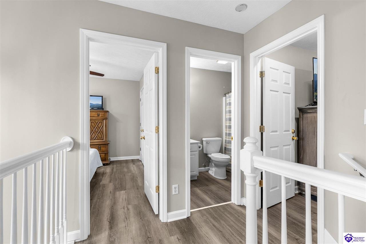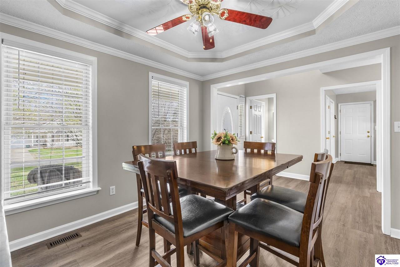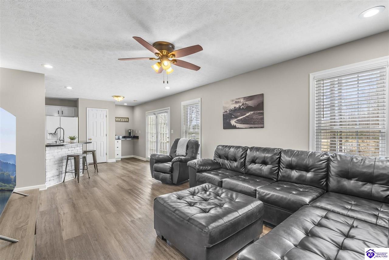 Realtor's notes: Located in the gated lake community of Doe Valley in Brandenburg, KY, this move-in ready 3-bedroom, 2.5-bath home offers a functional layout with multiple living areas and flexible space to fit a variety of needs. The main level features a spacious living room, dining area, and kitchen with ample cabinetry, pantry, and eat-in space. A main-level flex room adds versatility—ideal for a formal dining room, home office, or playroom. Upstairs, the primary suite includes a private bath with soaking tub, separate shower, and walk-in closet. Two additional bedrooms and a full bath complete the upper level. The lower level provides additional space perfect for a recreation room, home gym, or additional living area. Exterior features include a covered front porch, rear deck, 0.43-acre lot, 2-car attached garage, and paved driveway. Enjoy resort-style living in Doe Valley with gated access, a private lake and marina, golf course, swimming pool, clubhouse, and beaches. Conveniently located near Fort Knox, Elizabethtown, and Louisville—ideal for commuters or those relocating to the area.