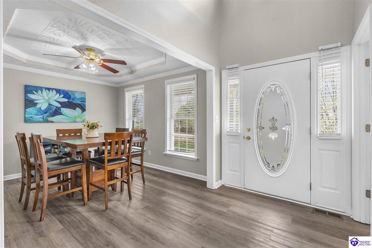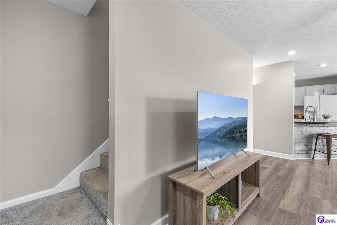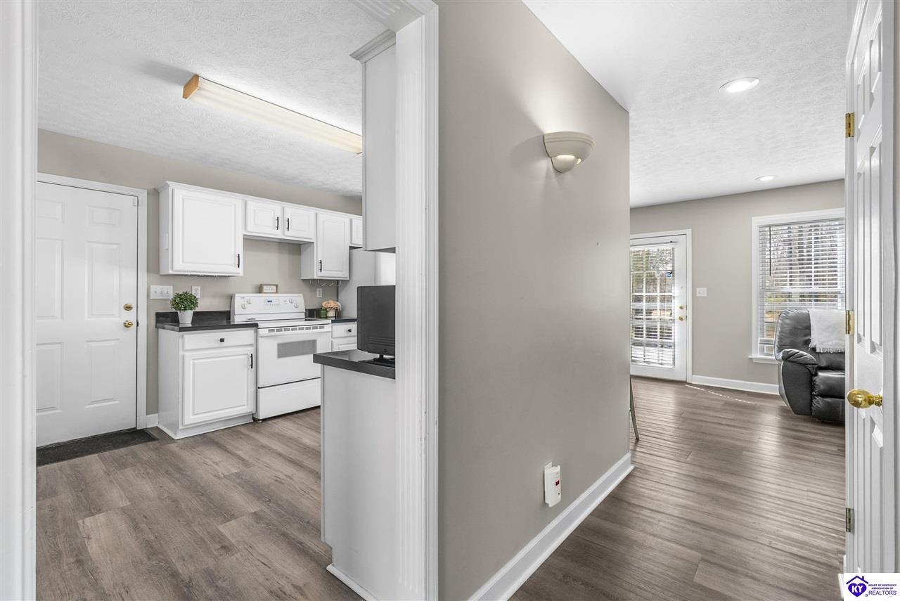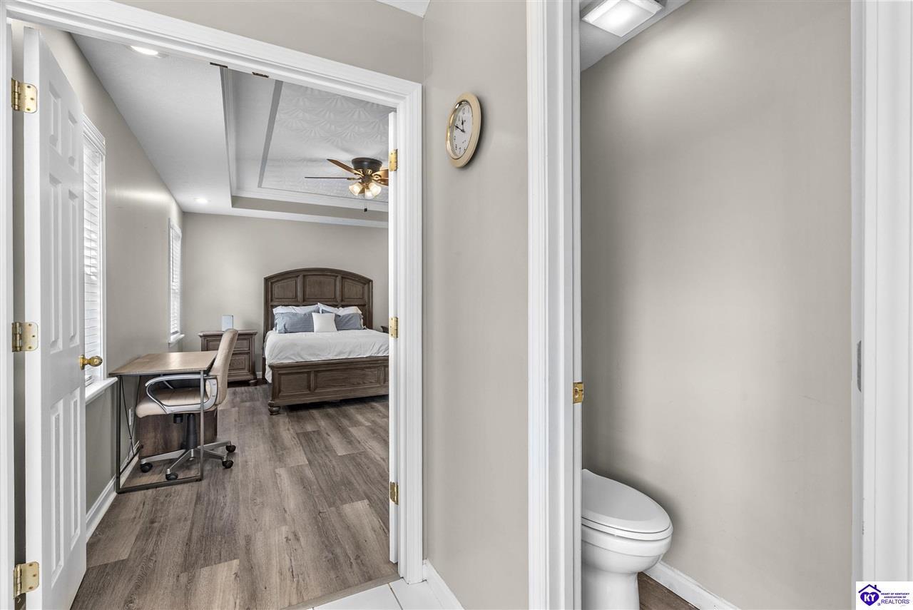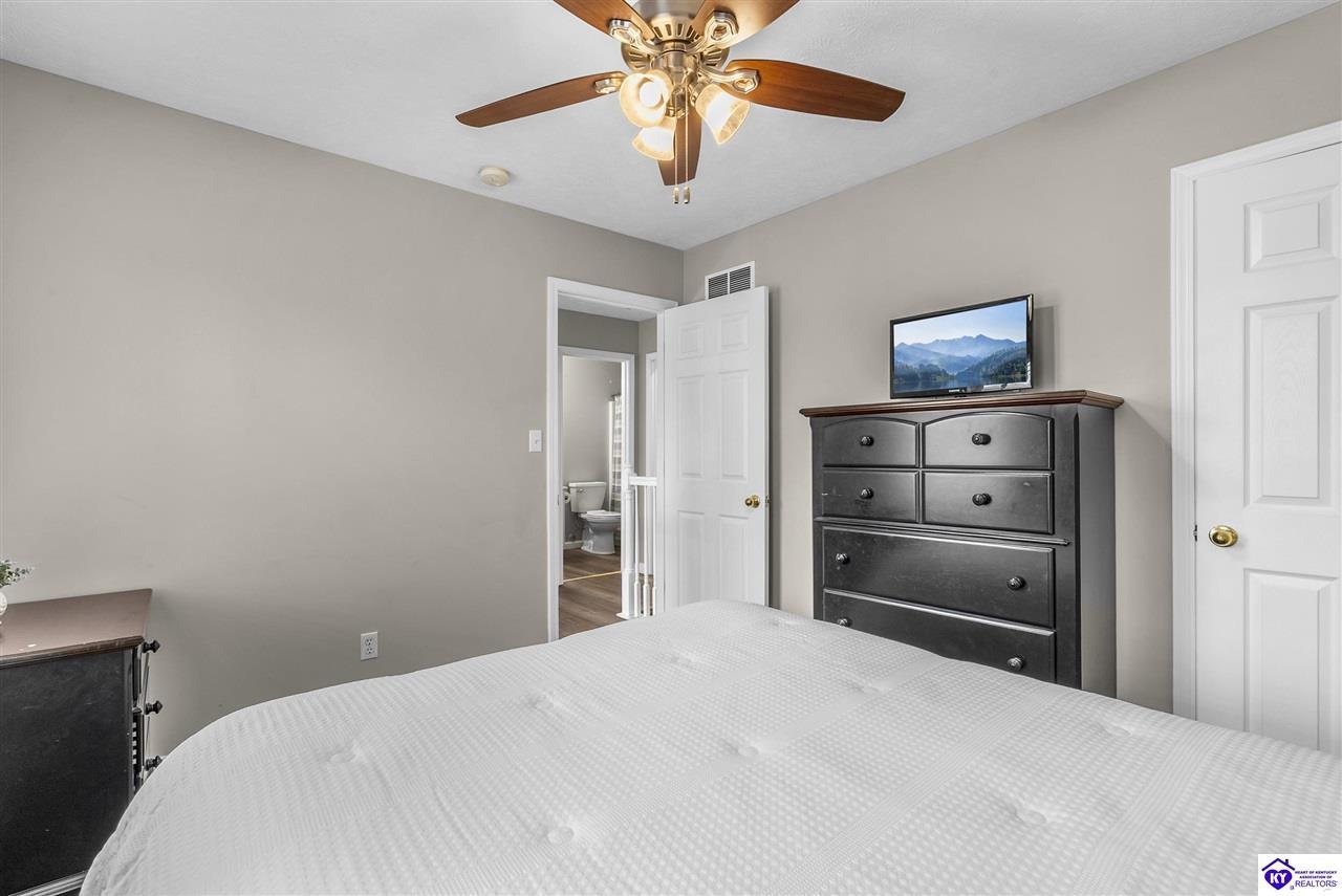 Realtor's notes: Located in the gated lake community of Doe Valley in Brandenburg, KY, this move-in ready 3-bedroom, 2.5-bath home offers a functional layout with multiple living areas and flexible space to fit a variety of needs. The main level features a spacious living room, dining area, and kitchen with ample cabinetry, pantry, and eat-in space. A main-level flex room adds versatility—ideal for a formal dining room, home office, or playroom. Upstairs, the primary suite includes a private bath with soaking tub, separate shower, and walk-in closet. Two additional bedrooms and a full bath complete the upper level. The lower level provides additional space perfect for a recreation room, home gym, or additional living area. Exterior features include a covered front porch, rear deck, 0.43-acre lot, 2-car attached garage, and paved driveway. Enjoy resort-style living in Doe Valley with gated access, a private lake and marina, golf course, swimming pool, clubhouse, and beaches. Conveniently located near Fort Knox, Elizabethtown, and Louisville—ideal for commuters or those relocating to the area.