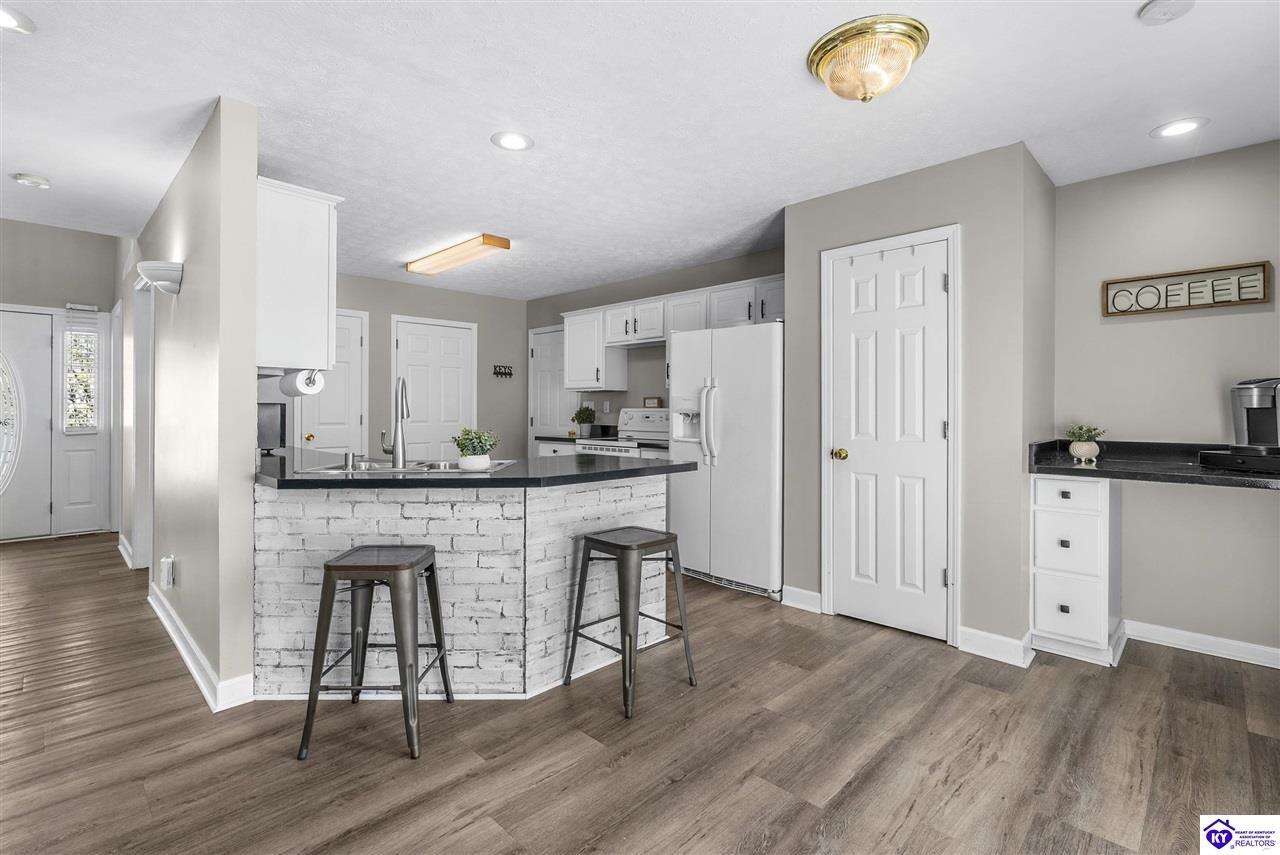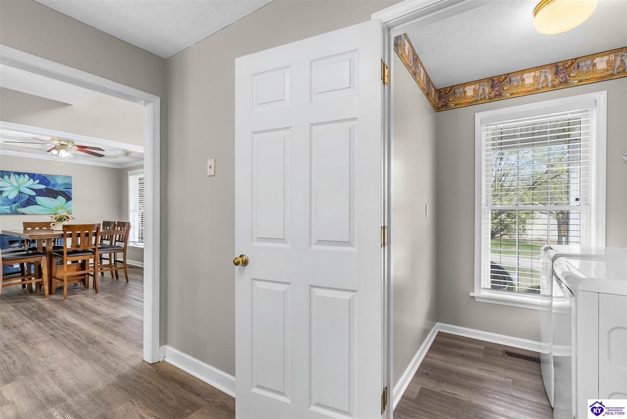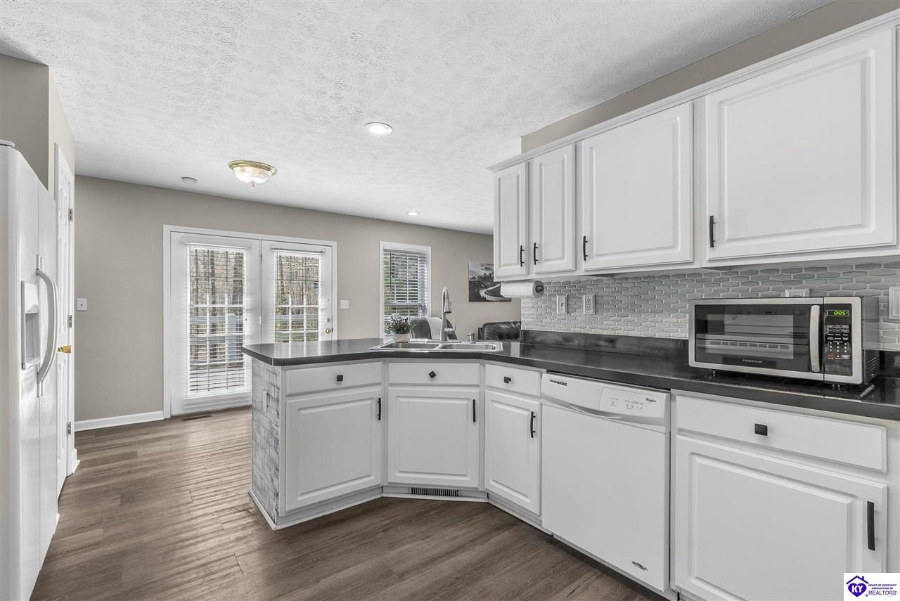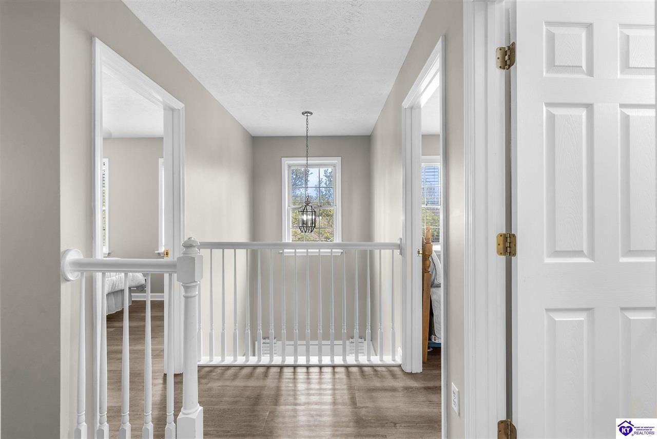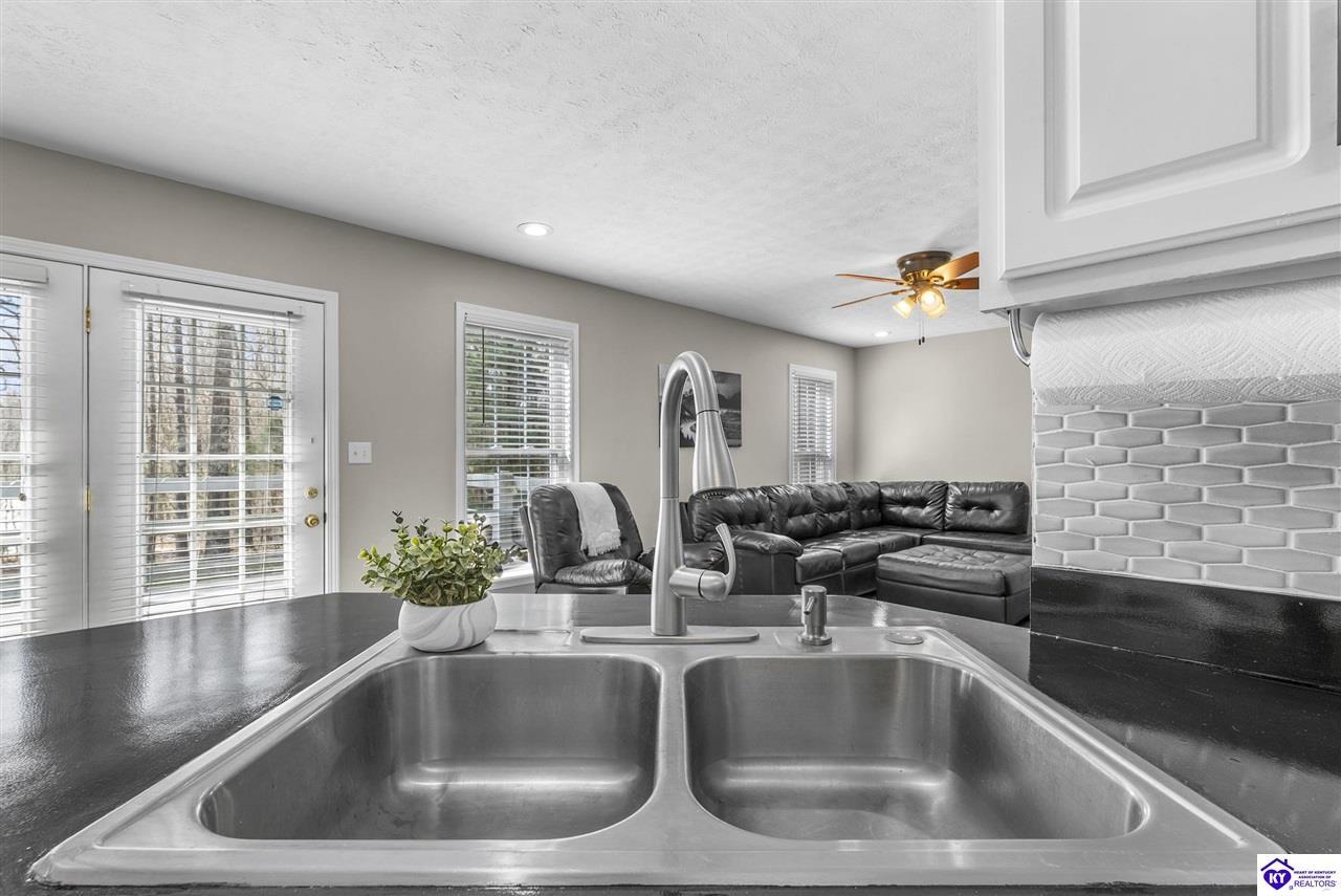 Realtor's notes: Located in the gated lake community of Doe Valley in Brandenburg, KY, this move-in ready 3-bedroom, 2.5-bath home offers a functional layout with multiple living areas and flexible space to fit a variety of needs. The main level features a spacious living room, dining area, and kitchen with ample cabinetry, pantry, and eat-in space. A main-level flex room adds versatility—ideal for a formal dining room, home office, or playroom. Upstairs, the primary suite includes a private bath with soaking tub, separate shower, and walk-in closet. Two additional bedrooms and a full bath complete the upper level. The lower level provides additional space perfect for a recreation room, home gym, or additional living area. Exterior features include a covered front porch, rear deck, 0.43-acre lot, 2-car attached garage, and paved driveway. Enjoy resort-style living in Doe Valley with gated access, a private lake and marina, golf course, swimming pool, clubhouse, and beaches. Conveniently located near Fort Knox, Elizabethtown, and Louisville—ideal for commuters or those relocating to the area.