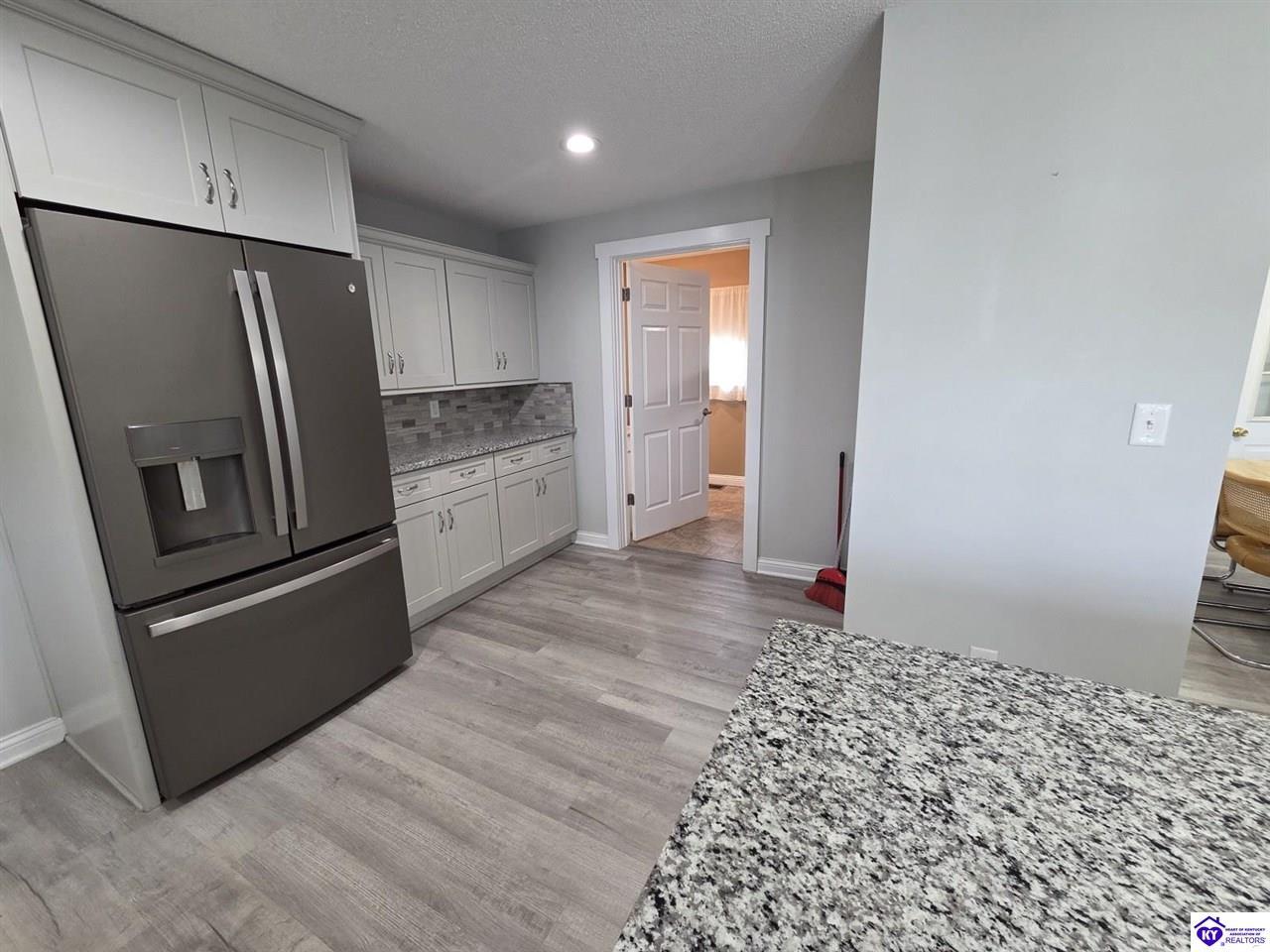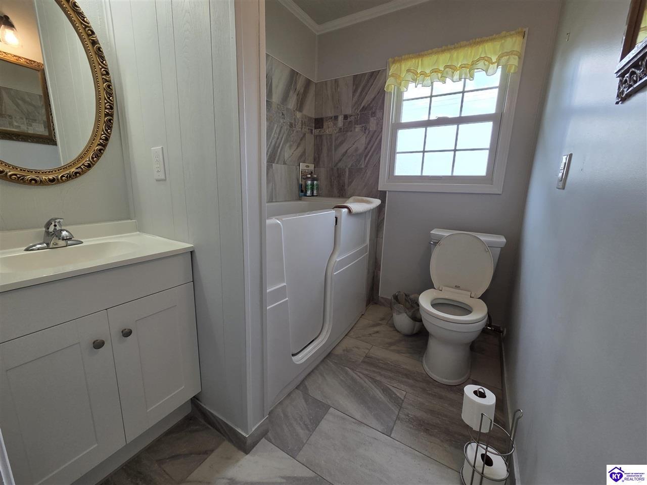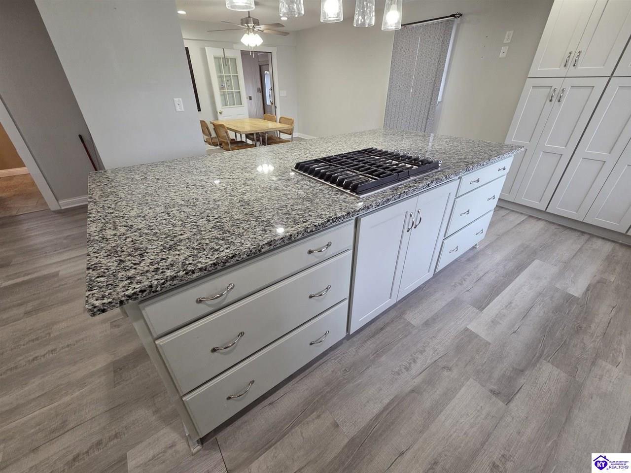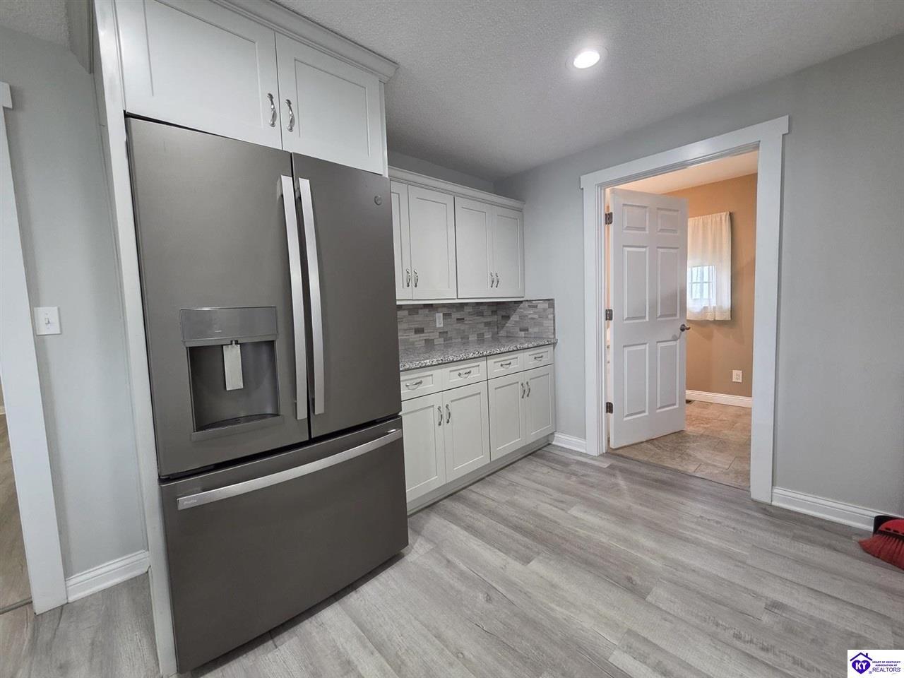 Realtor's notes: This beautifully updated 4-bedroom, 2-bath stone ranch in the heart of Elizabethtown offers nearly 2,000 square feet of comfortable living space on a convenient in-town lot. The classic Bedford stone exterior gives the home tremendous curb appeal, while the thoughtfully renovated interior leaves little to be desired. The stunning kitchen features granite countertops, a gas cooktop island, GE Profile appliances including an over-the-range oven and microwave, dishwasher, refrigerator, and soft-close cabinets. The first full bath impresses with a walk-in tile shower, ceramic tile flooring, and granite finishes, while the second full bath offers a walk-in tub with jacuzzi jets. A spacious enclosed back porch serves as a family room/den and includes laundry hookups and a water softener — a versatile bonus space that adds real everyday functionality. The dining area includes a pantry closet, and the home also features a covered front porch, a deck, and a fenced backyard. Major updates include a new natural gas furnace, on-demand water heater, triple pane windows, and a new roof. The detached metal garage is exceptional — foam insulated and fully equipped with a 15-foot overhead door, a standard overhead door, concrete floors, 220-amp electric, water, a natural gas heater, a fan, and two loft storage areas. A vinyl-sided shed with wood floors completes this outstanding package. Situated just minutes from US-31W with convenient access to all of Elizabethtown's shopping, dining, and services, within walking distance of the beautiful Freeman Lake Park, and only a short drive to Fort Knox, this move-in ready home truly has it all.