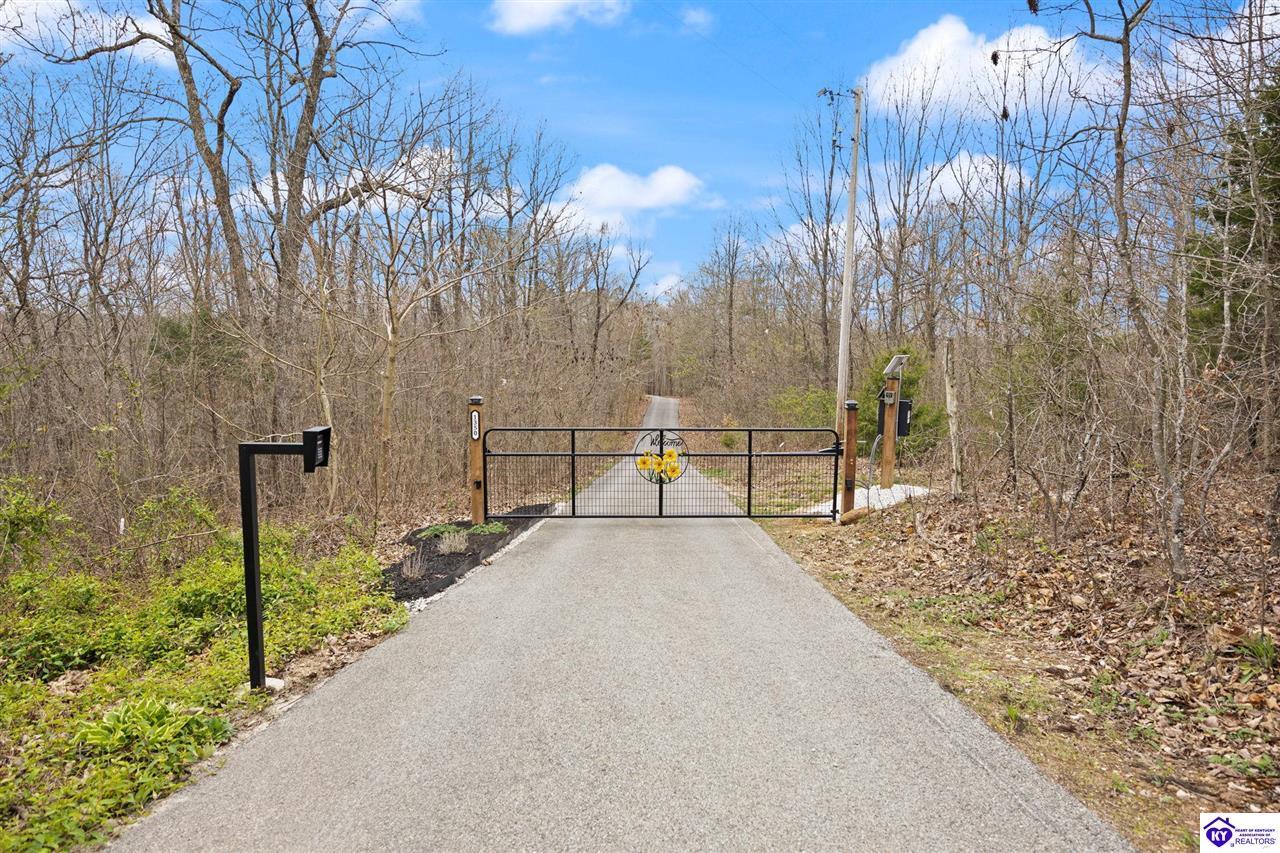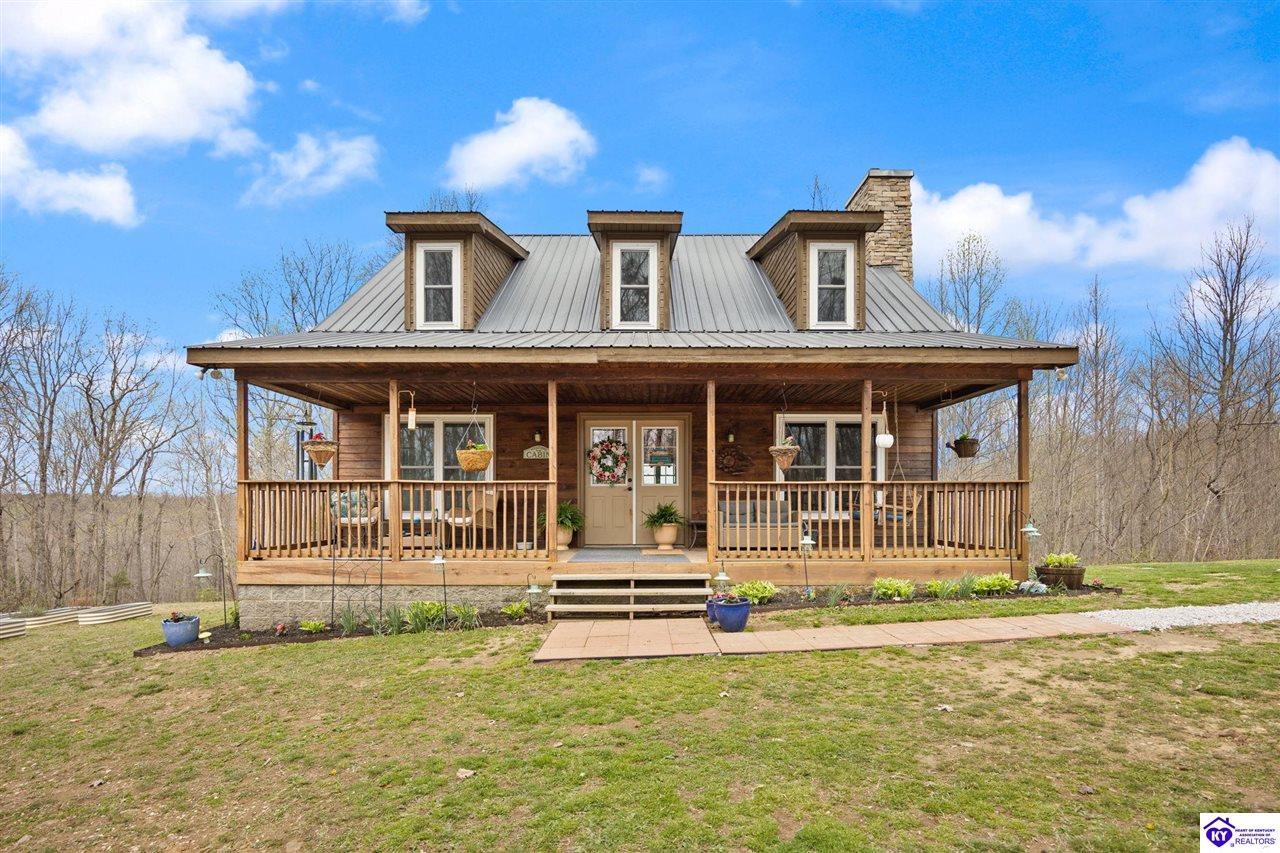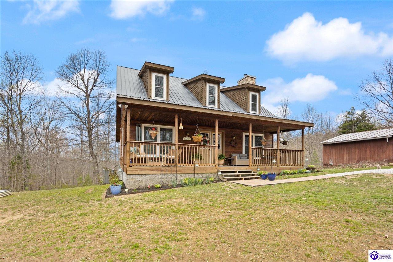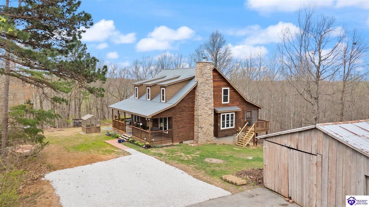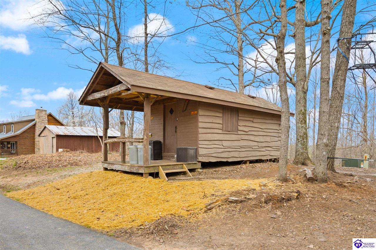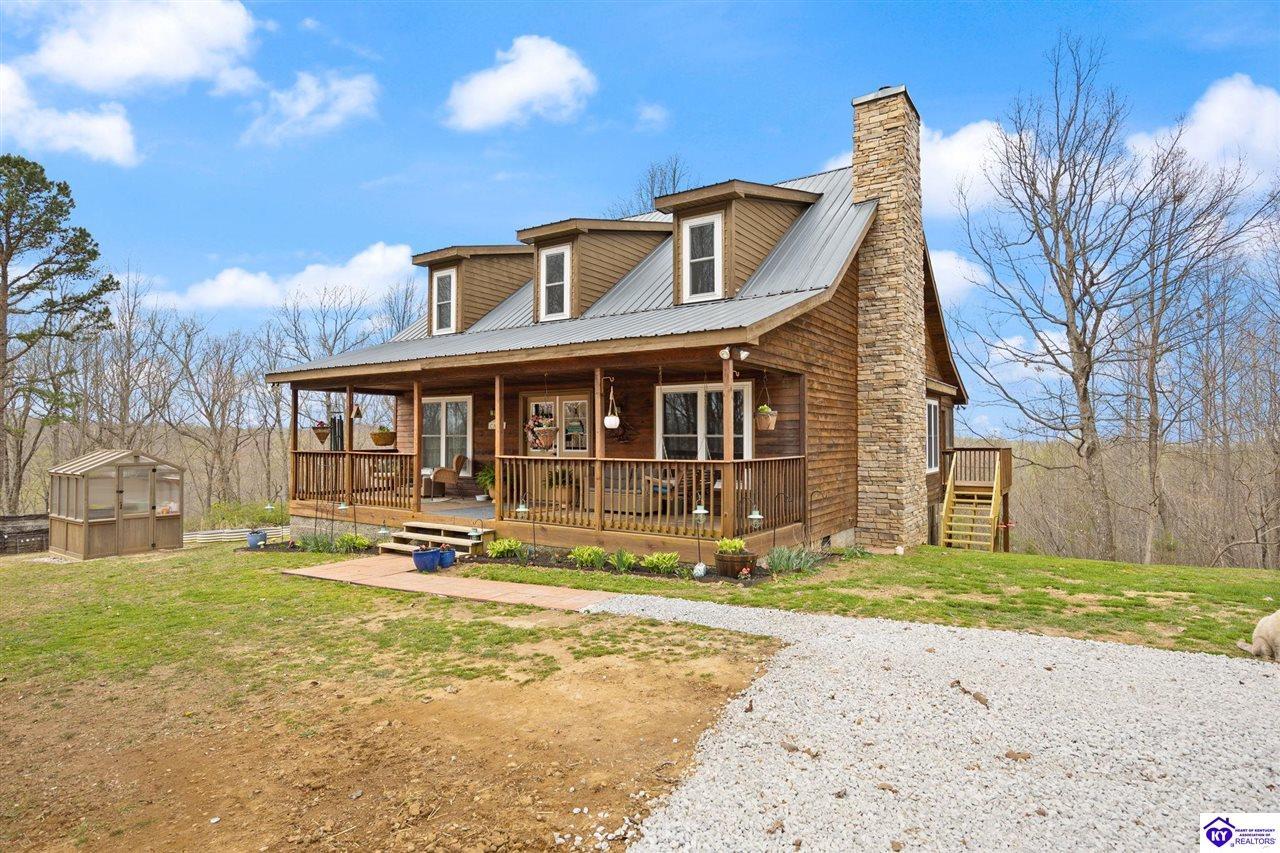 Realtor's notes: Escape to your own private retreat in the heart of Munfordville, KY! Nestled on an incredible 71 wooded acres, this beautiful cabin with wood siding offers the perfect blend of seclusion, comfort, and natural beauty. This 3-bedroom, 2 full bath home features soaring vaulted ceilings and a stunning stacked stone fireplace with chimney, creating a warm and inviting atmosphere. The open living space is filled with natural light and showcases breathtaking views of the surrounding landscape. Upstairs, a loft area provides a peaceful vantage point overlooking the property, while the expansive screened-in back porch—spanning the full length of the home—offers the perfect place to relax and take in the sights and sounds of nature or use as an office space with the fiber internet that is at the property. Accessed by a long blacktop drive behind an electronic security gate at the end of a dead-end county road, this property ensures ultimate privacy. The land itself is truly remarkable, featuring mature hardwoods, three large waterfalls, and an established trail system ideal for ATVs or hiking. The rolling terrain naturally creates prime wildlife corridors, making this a dream property for outdoor enthusiasts, hunters, or anyone seeking a serene escape. For those interested in homesteading, the property is already equipped with a greenhouse and a custom chicken coop. Additional improvements include a 21’ x 31’ detached garage and a 10’ x 20’ shed, providing ample space for storage, hobbies, or equipment. Whether you’re looking for a full-time residence, a weekend getaway, or a private recreational haven, this one-of-a-kind property offers endless possibilities.