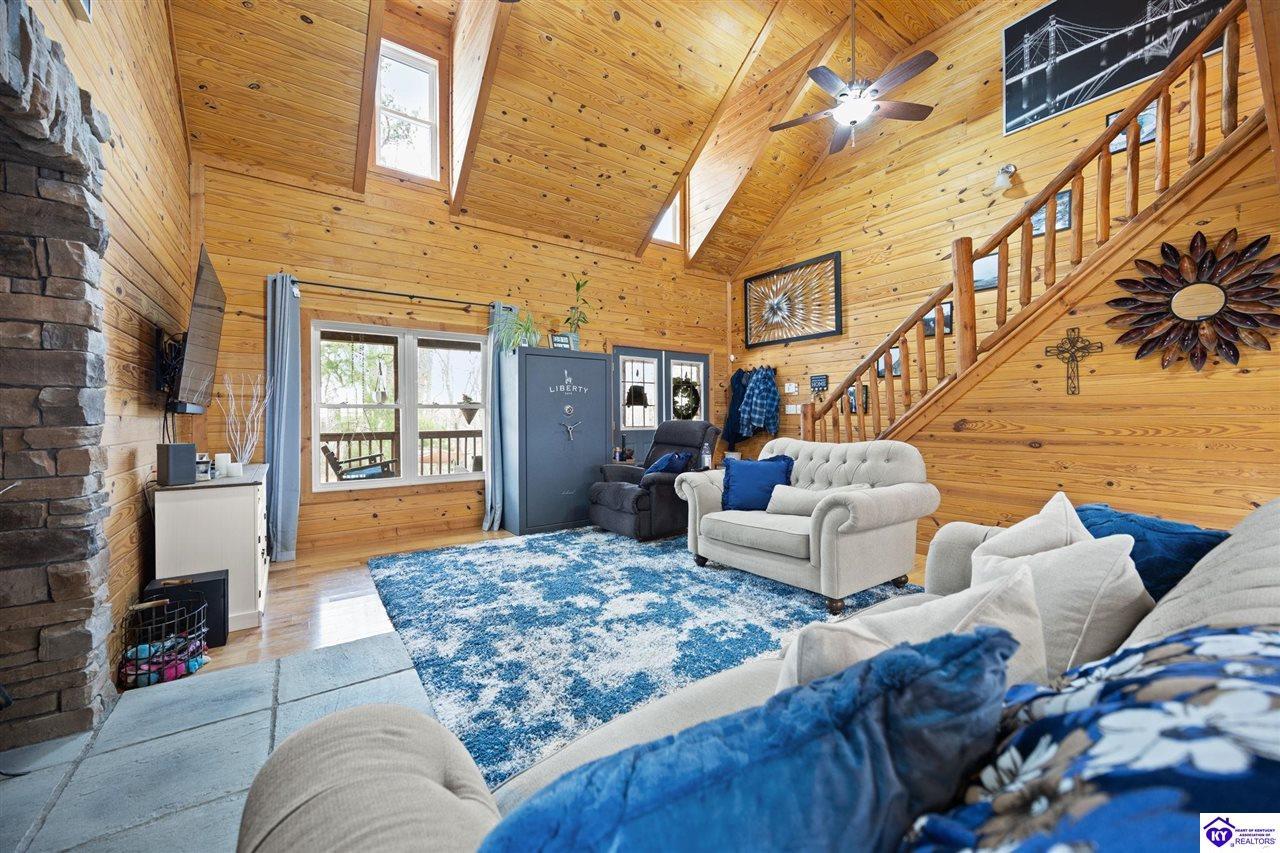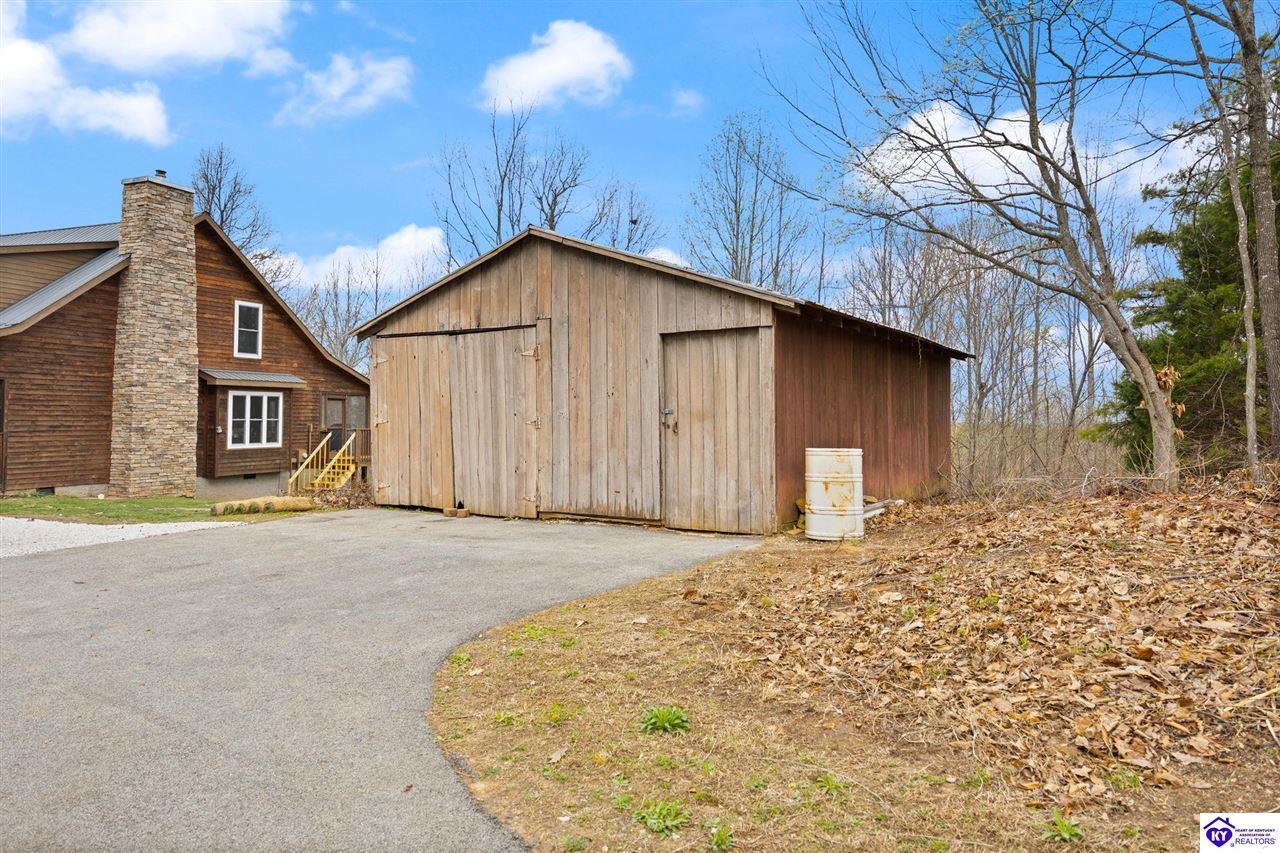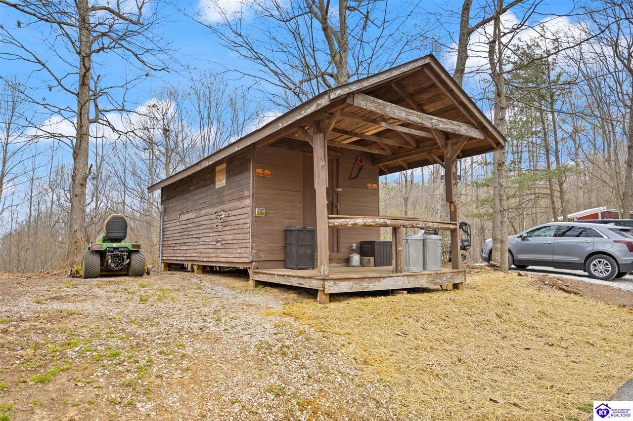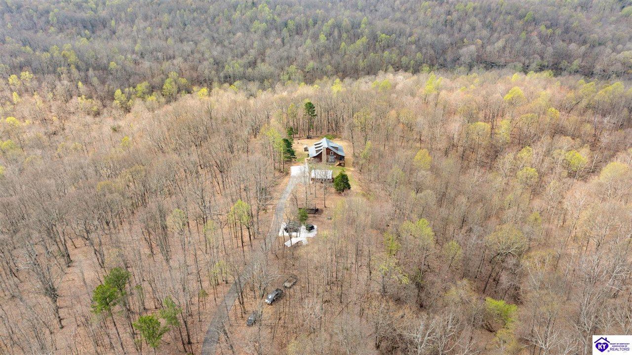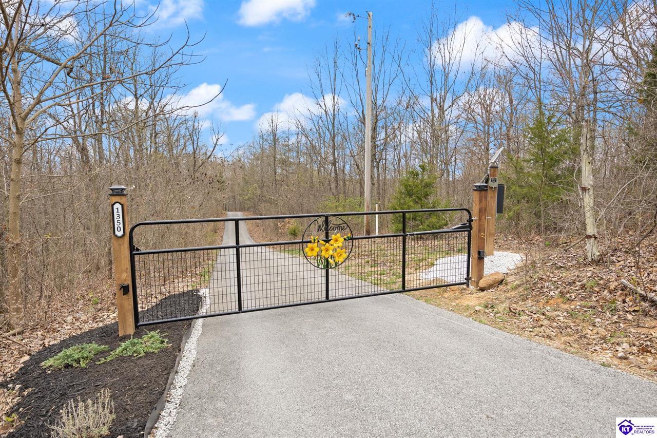 Realtor's notes: Escape to your own private retreat in the heart of Munfordville, KY! Nestled on an incredible 71 wooded acres, this beautiful cabin with wood siding offers the perfect blend of seclusion, comfort, and natural beauty. This 3-bedroom, 2 full bath home features soaring vaulted ceilings and a stunning stacked stone fireplace with chimney, creating a warm and inviting atmosphere. The open living space is filled with natural light and showcases breathtaking views of the surrounding landscape. Upstairs, a loft area provides a peaceful vantage point overlooking the property, while the expansive screened-in back porch—spanning the full length of the home—offers the perfect place to relax and take in the sights and sounds of nature or use as an office space with the fiber internet that is at the property. Accessed by a long blacktop drive behind an electronic security gate at the end of a dead-end county road, this property ensures ultimate privacy. The land itself is truly remarkable, featuring mature hardwoods, three large waterfalls, and an established trail system ideal for ATVs or hiking. The rolling terrain naturally creates prime wildlife corridors, making this a dream property for outdoor enthusiasts, hunters, or anyone seeking a serene escape. For those interested in homesteading, the property is already equipped with a greenhouse and a custom chicken coop. Additional improvements include a 21’ x 31’ detached garage and a 10’ x 20’ shed, providing ample space for storage, hobbies, or equipment. Whether you’re looking for a full-time residence, a weekend getaway, or a private recreational haven, this one-of-a-kind property offers endless possibilities.