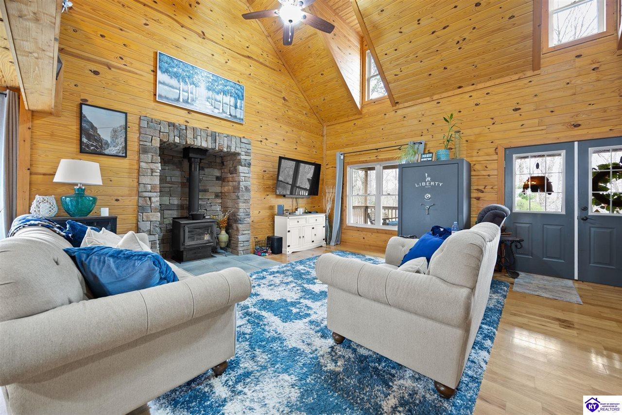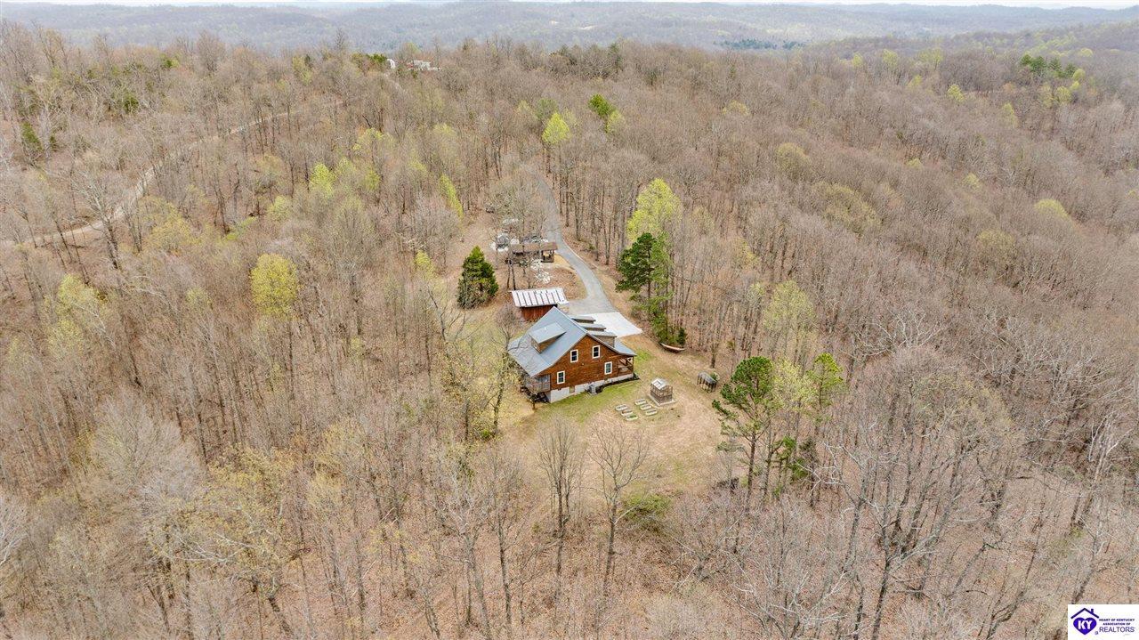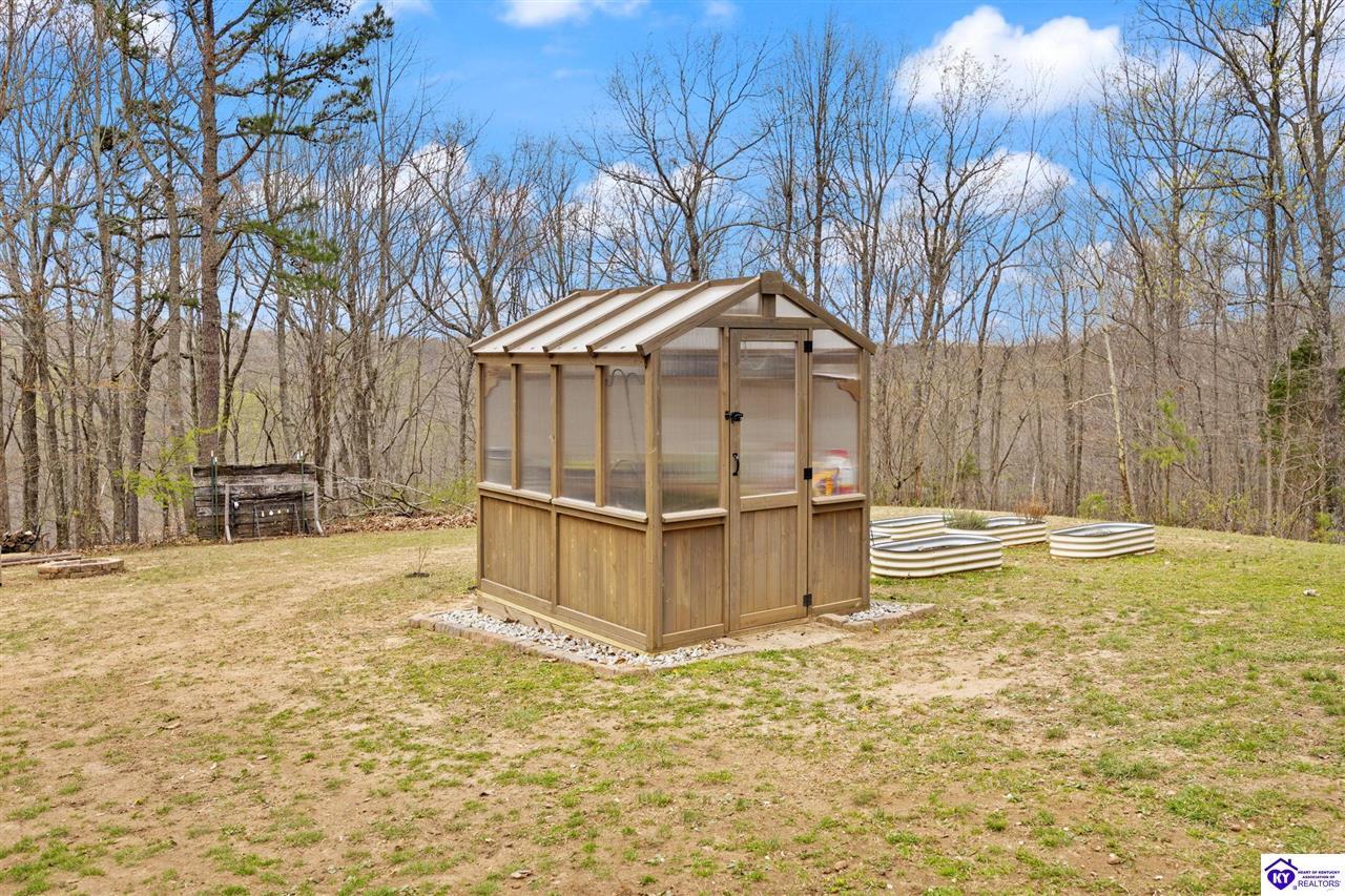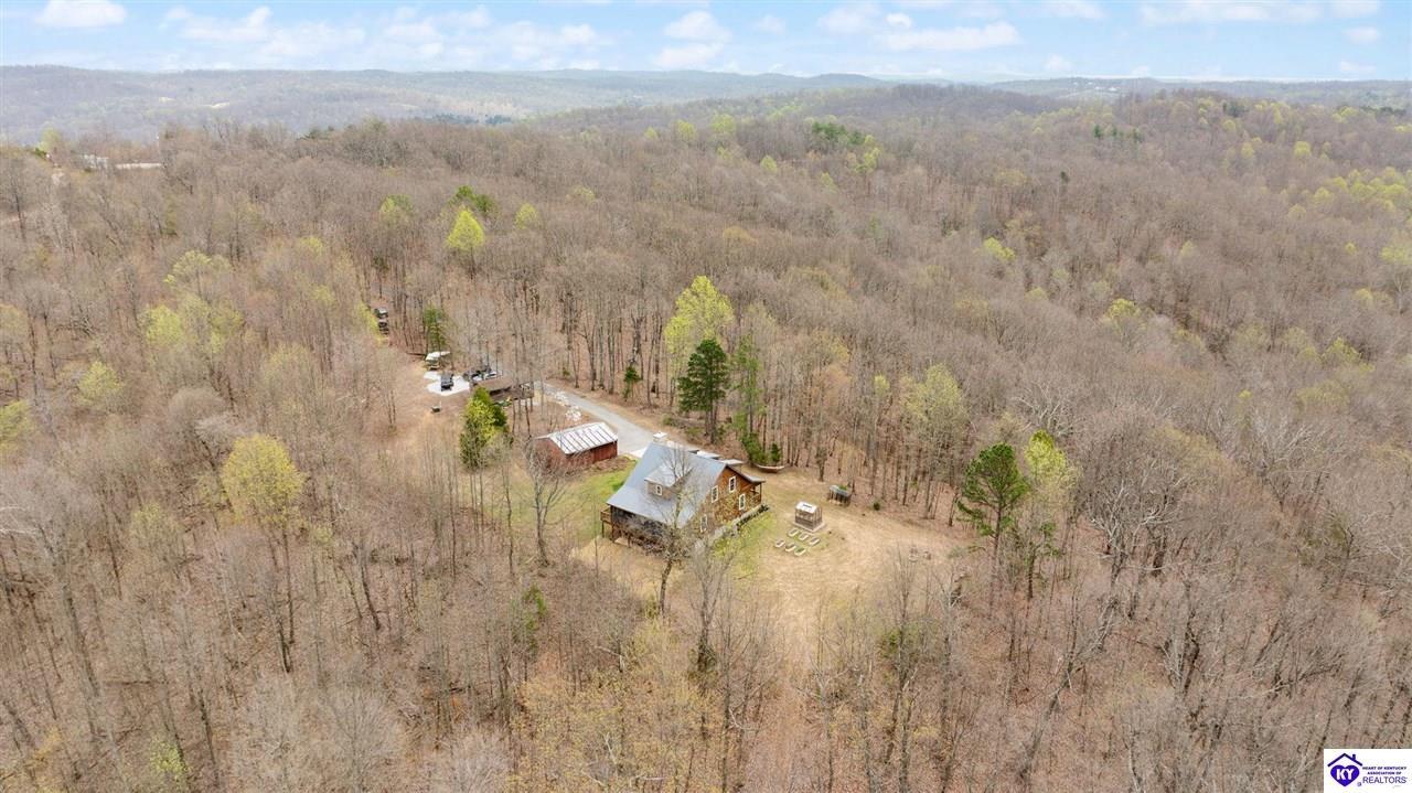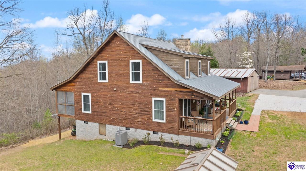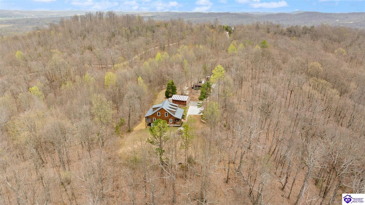 Realtor's notes: Escape to your own private retreat in the heart of Munfordville, KY! Nestled on an incredible 71 wooded acres, this beautiful cabin with wood siding offers the perfect blend of seclusion, comfort, and natural beauty. This 3-bedroom, 2 full bath home features soaring vaulted ceilings and a stunning stacked stone fireplace with chimney, creating a warm and inviting atmosphere. The open living space is filled with natural light and showcases breathtaking views of the surrounding landscape. Upstairs, a loft area provides a peaceful vantage point overlooking the property, while the expansive screened-in back porch—spanning the full length of the home—offers the perfect place to relax and take in the sights and sounds of nature or use as an office space with the fiber internet that is at the property. Accessed by a long blacktop drive behind an electronic security gate at the end of a dead-end county road, this property ensures ultimate privacy. The land itself is truly remarkable, featuring mature hardwoods, three large waterfalls, and an established trail system ideal for ATVs or hiking. The rolling terrain naturally creates prime wildlife corridors, making this a dream property for outdoor enthusiasts, hunters, or anyone seeking a serene escape. For those interested in homesteading, the property is already equipped with a greenhouse and a custom chicken coop. Additional improvements include a 21’ x 31’ detached garage and a 10’ x 20’ shed, providing ample space for storage, hobbies, or equipment. Whether you’re looking for a full-time residence, a weekend getaway, or a private recreational haven, this one-of-a-kind property offers endless possibilities.