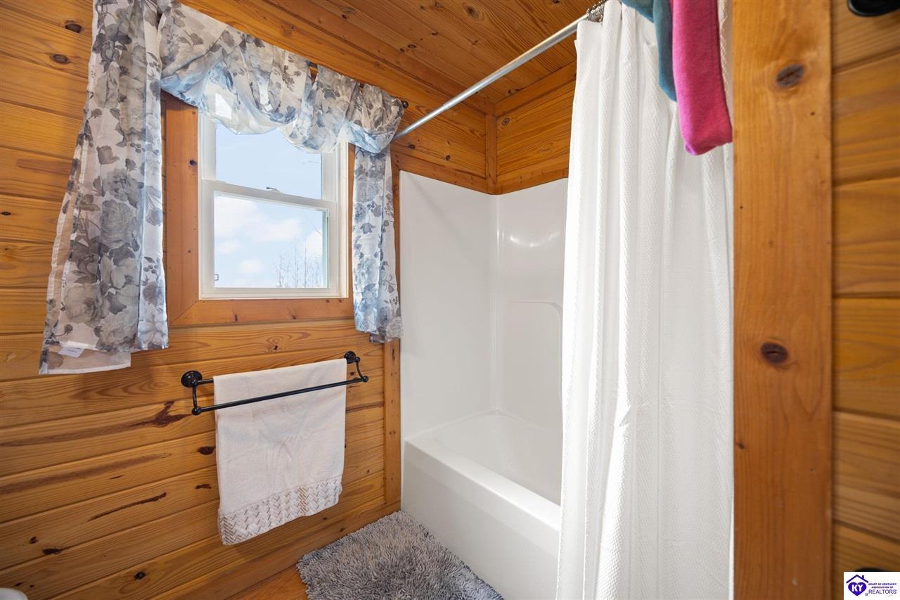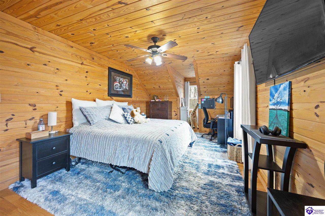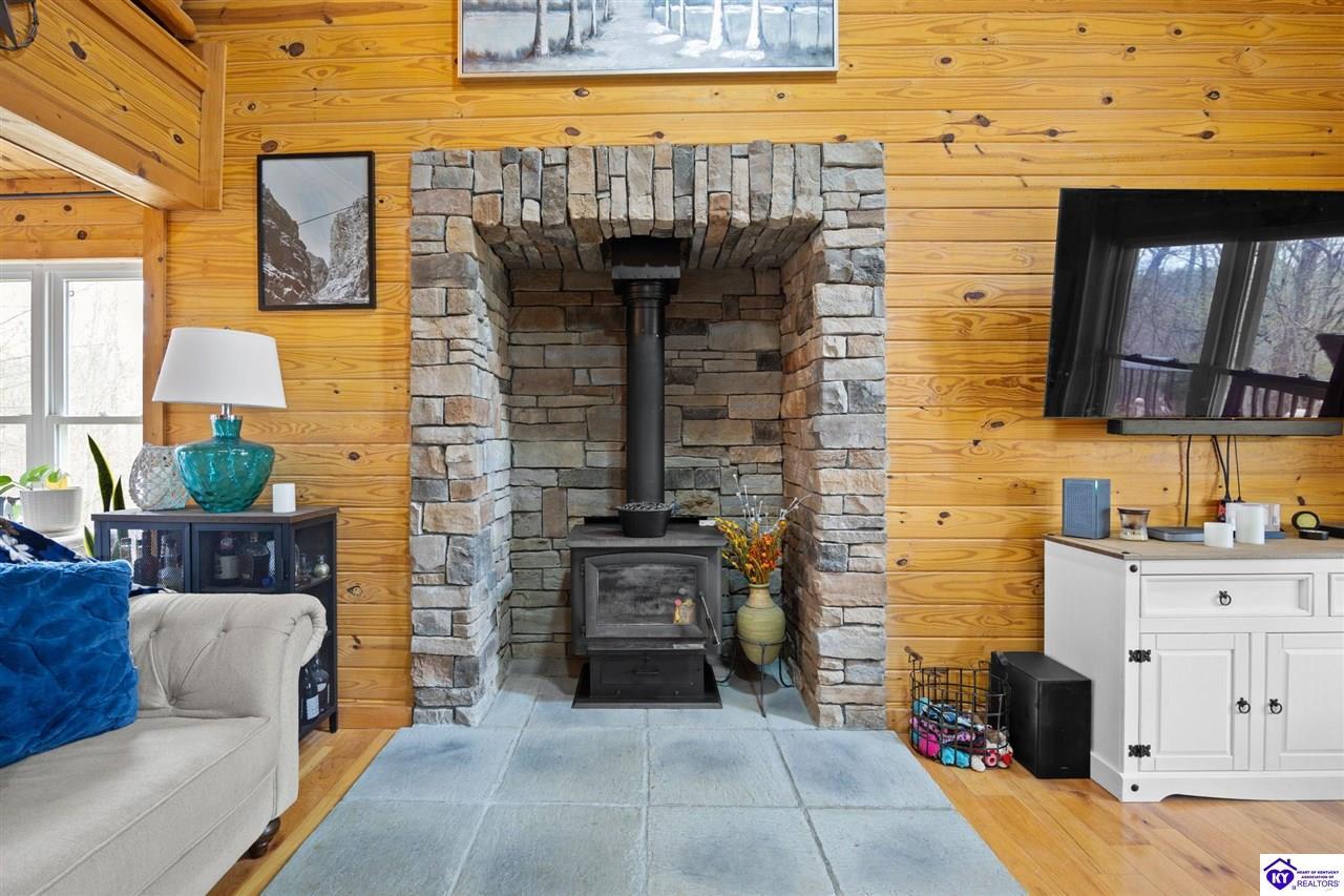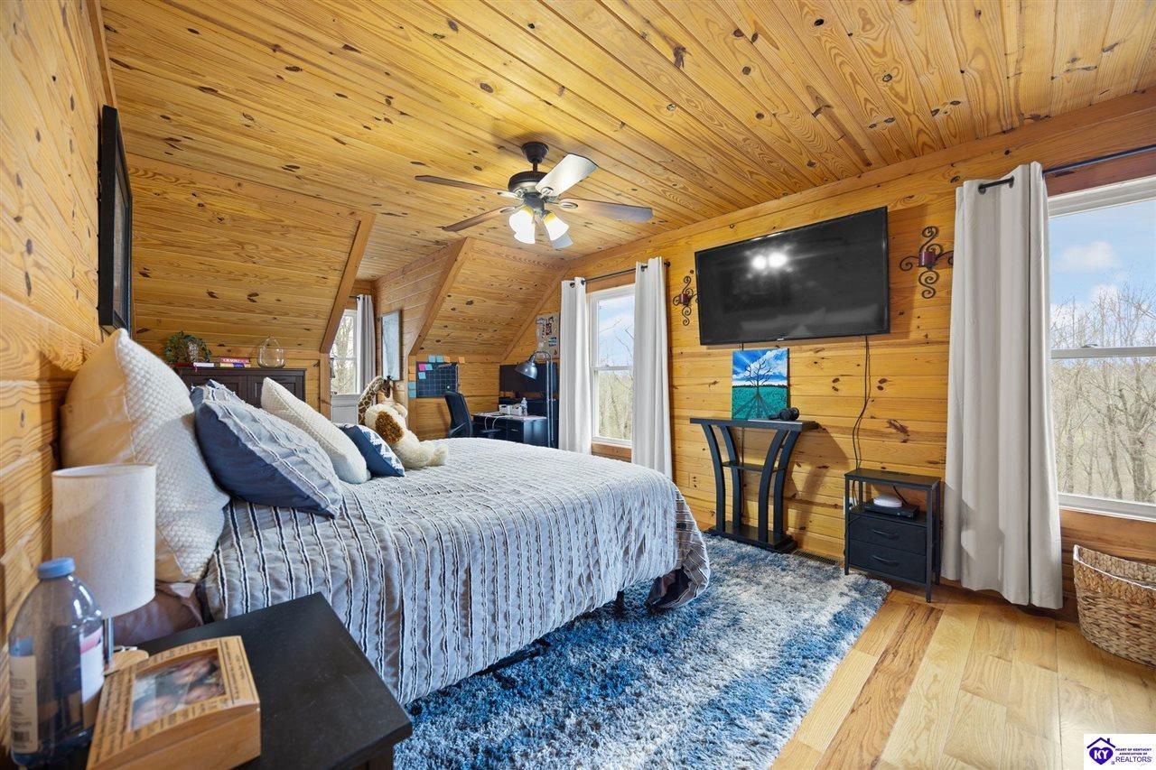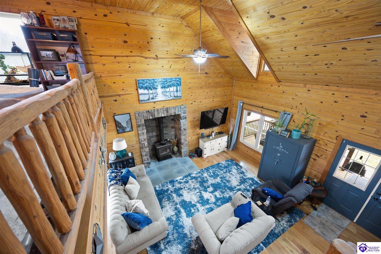 Realtor's notes: Escape to your own private retreat in the heart of Munfordville, KY! Nestled on an incredible 71 wooded acres, this beautiful cabin with wood siding offers the perfect blend of seclusion, comfort, and natural beauty. This 3-bedroom, 2 full bath home features soaring vaulted ceilings and a stunning stacked stone fireplace with chimney, creating a warm and inviting atmosphere. The open living space is filled with natural light and showcases breathtaking views of the surrounding landscape. Upstairs, a loft area provides a peaceful vantage point overlooking the property, while the expansive screened-in back porch—spanning the full length of the home—offers the perfect place to relax and take in the sights and sounds of nature or use as an office space with the fiber internet that is at the property. Accessed by a long blacktop drive behind an electronic security gate at the end of a dead-end county road, this property ensures ultimate privacy. The land itself is truly remarkable, featuring mature hardwoods, three large waterfalls, and an established trail system ideal for ATVs or hiking. The rolling terrain naturally creates prime wildlife corridors, making this a dream property for outdoor enthusiasts, hunters, or anyone seeking a serene escape. For those interested in homesteading, the property is already equipped with a greenhouse and a custom chicken coop. Additional improvements include a 21’ x 31’ detached garage and a 10’ x 20’ shed, providing ample space for storage, hobbies, or equipment. Whether you’re looking for a full-time residence, a weekend getaway, or a private recreational haven, this one-of-a-kind property offers endless possibilities.