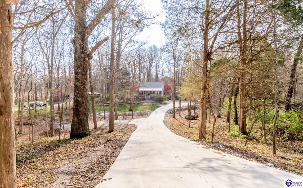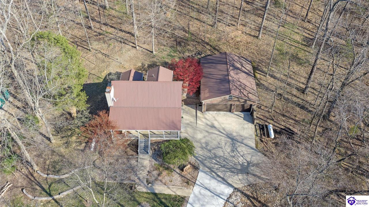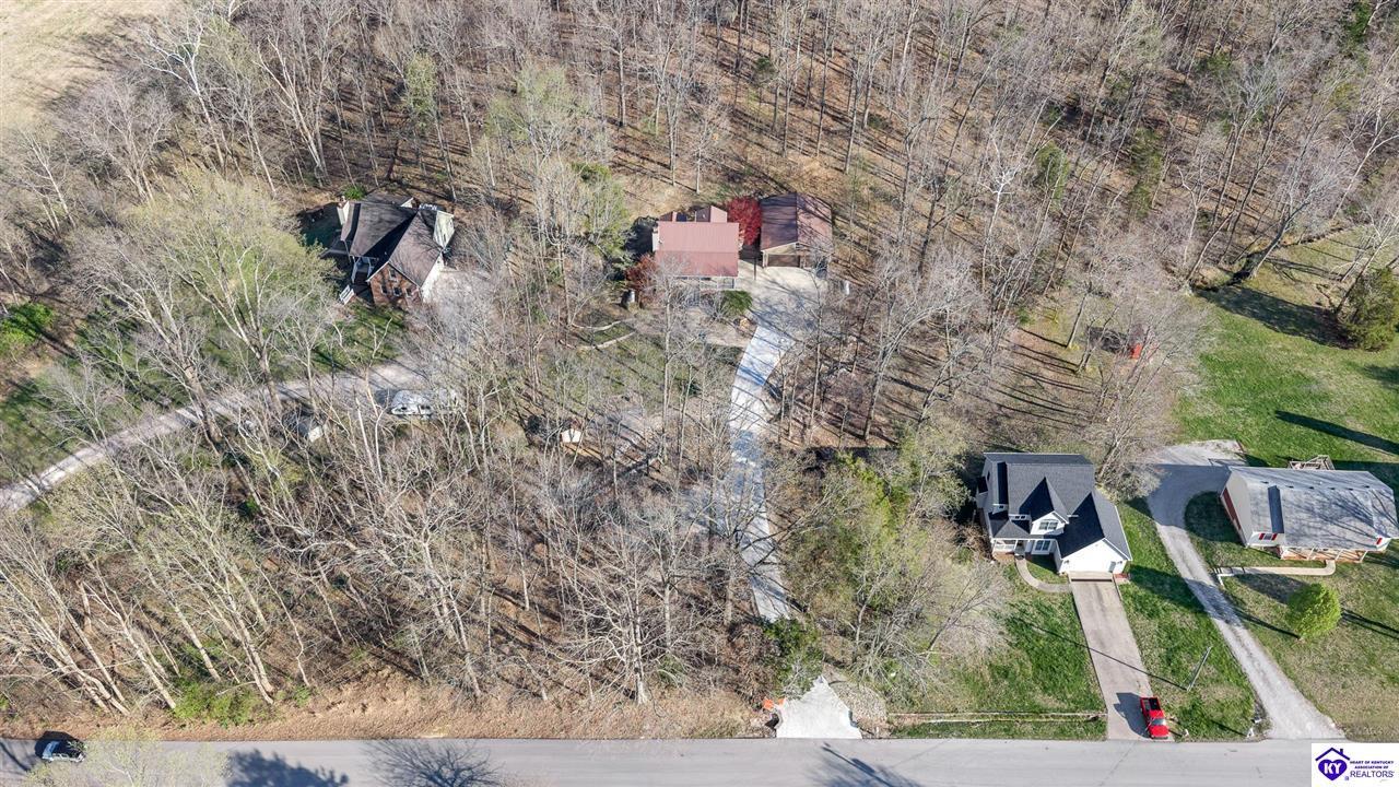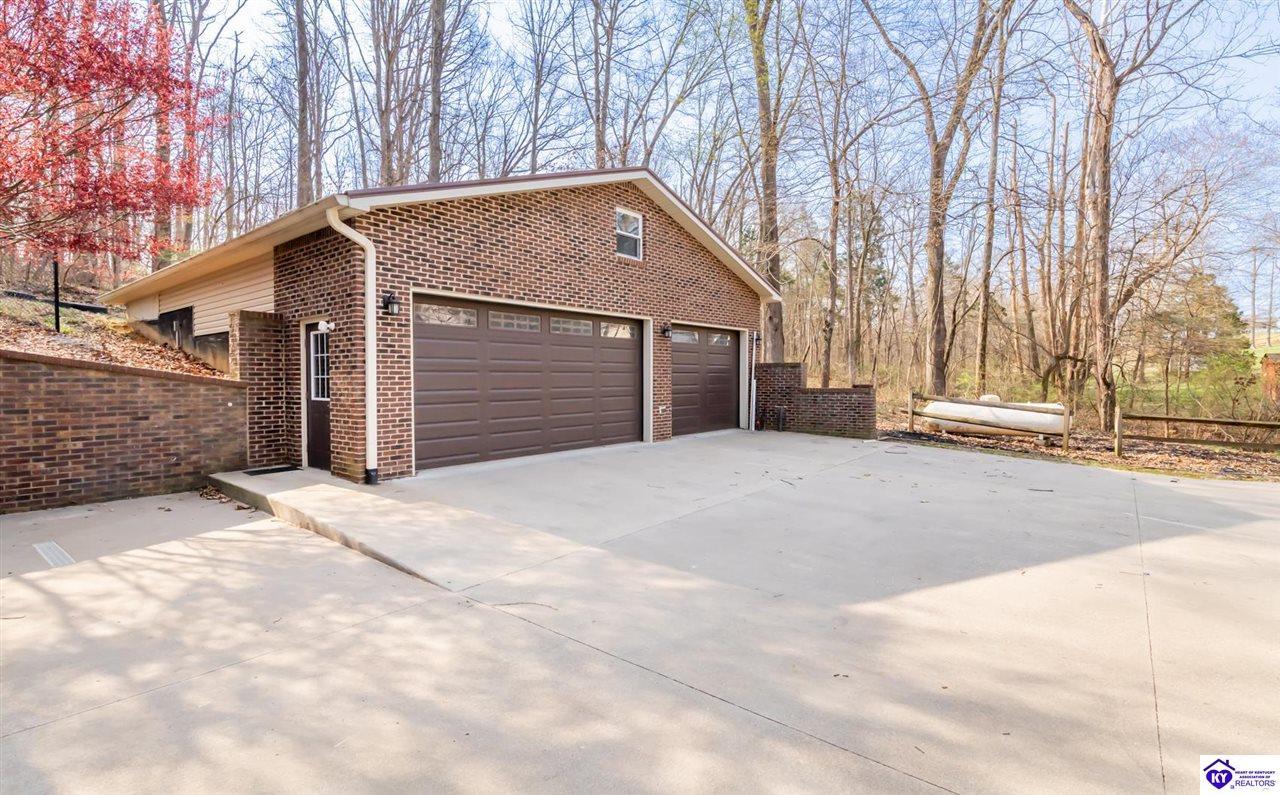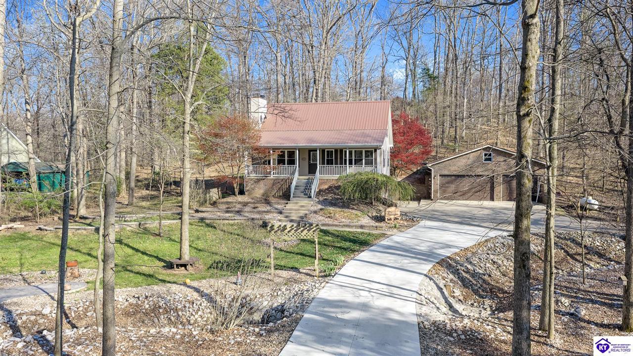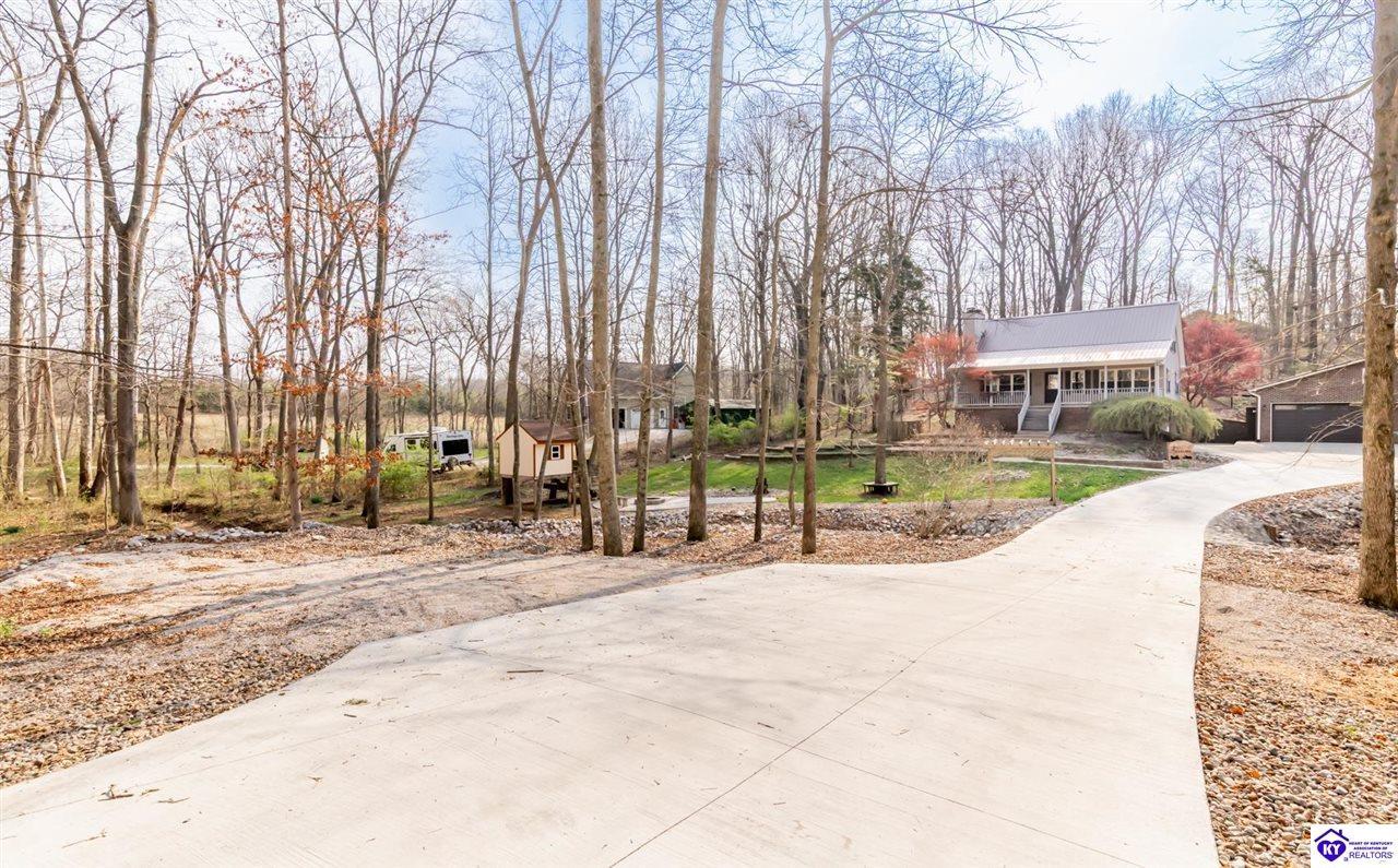 Realtor's notes: This Cape-style home features a unique and thoughtfully designed floorplan that stands apart from the typical Cape layout. Situated on a beautifully landscaped, wooded, and private park-like acre in Elizabethtown, KY, the home offers approximately 2,700 square feet with 3 bedrooms and 3 full bathrooms. The main living area showcases vaulted ceilings and an open layout with a dedicated dining area. The updated kitchen features granite countertops, a gorgeous tile backsplash, and a large eat-in bar. An open loft adds flexible space, while two propane fireplaces provide warmth and character. The home is equipped with an efficient gas furnace and central air conditioning to help keep utility costs manageable. The partially finished basement includes additional living or recreational space, a full bathroom, and an in-home tornado shelter. Outdoor features include a fenced backyard, a deck off the back of the home, and a large covered front porch overlooking the peaceful setting. The property offers exceptional garage and workspace options, including an attached 1-car garage with workshop area and a 32x40 detached garage built by Phillips Homes in 2015. This structure includes one 16 door, one 10 door, matching exterior finishes, loft space, a 100-amp panel, ventless propane heater, and reinforced concrete walls. With solid construction, a distinctive layout, and a wide range of functional features, this property presents a rare opportunity in a desirable Elizabethtown location.