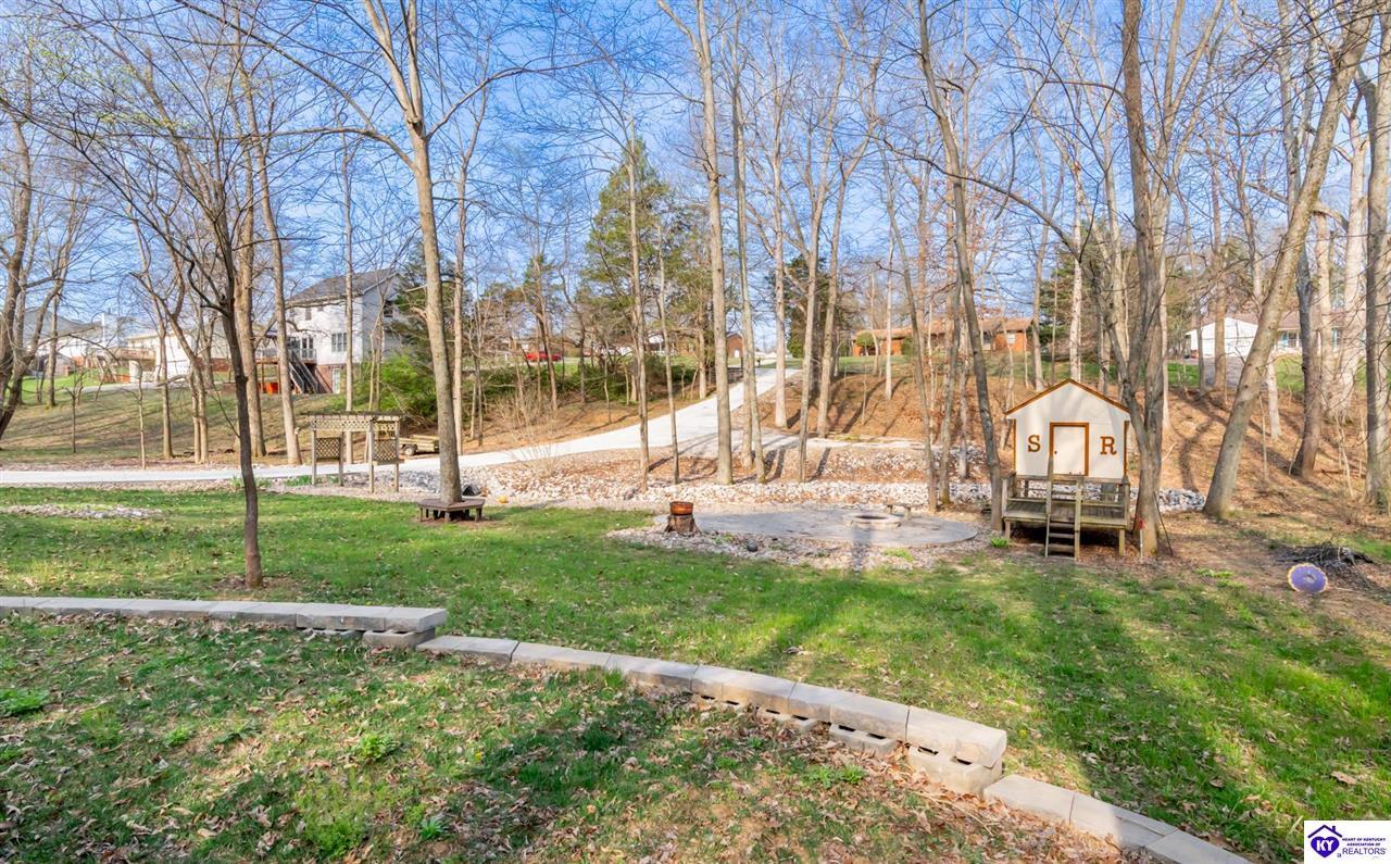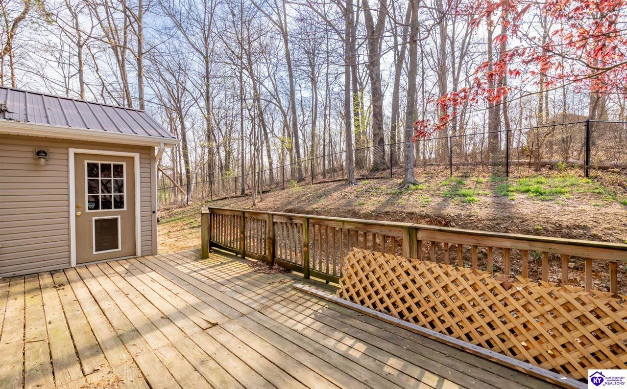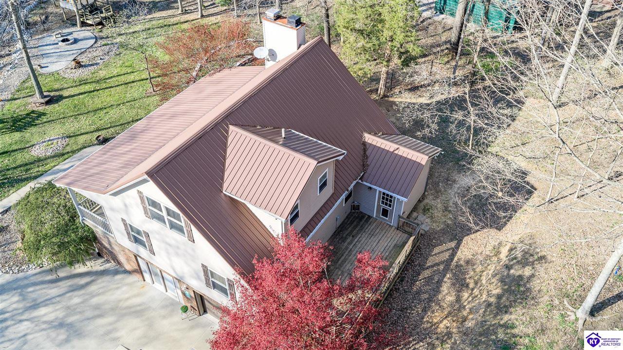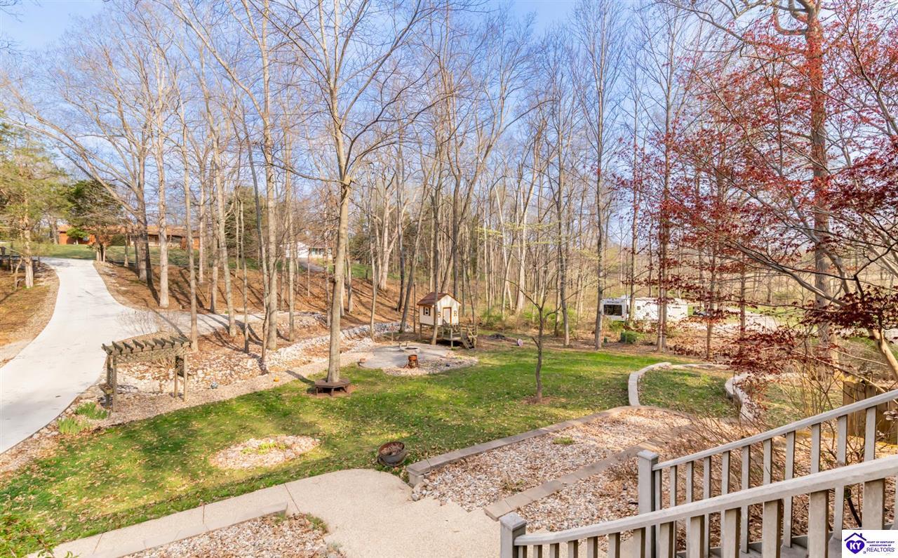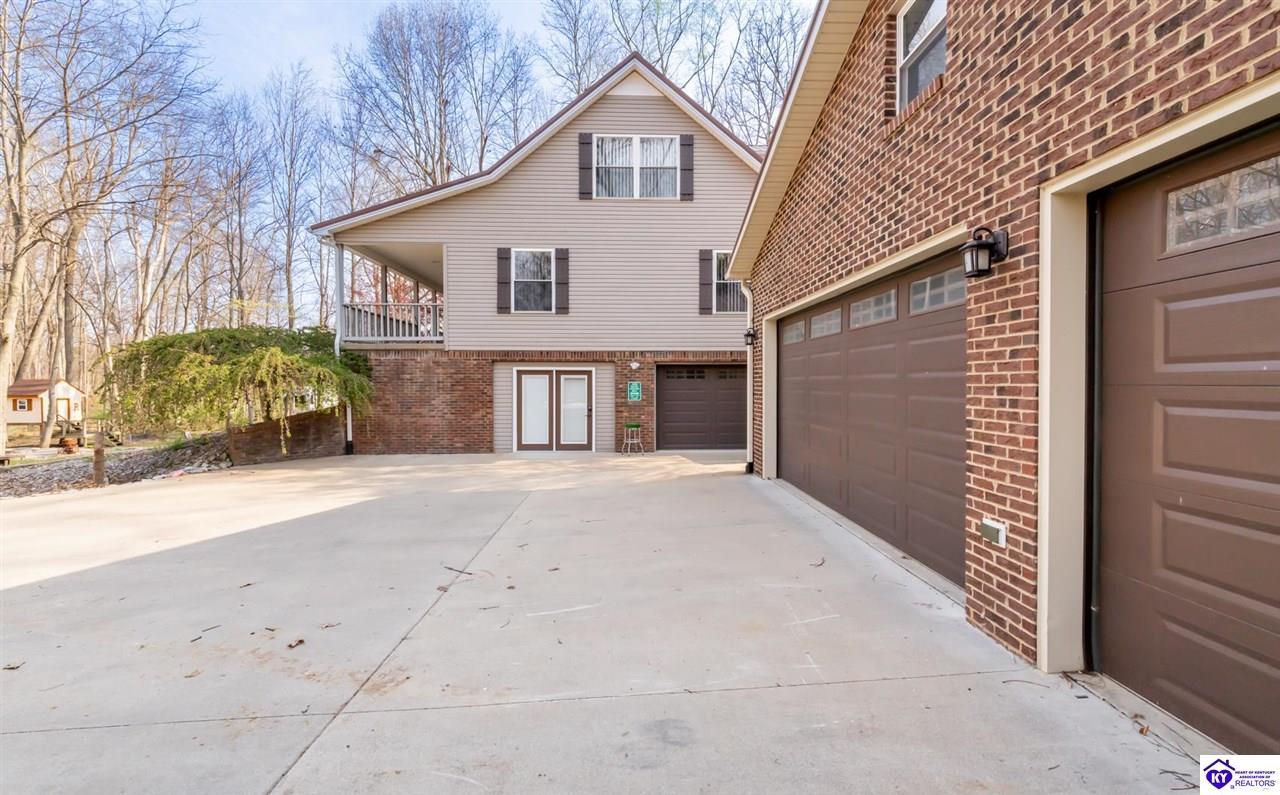 Realtor's notes: This Cape-style home features a unique and thoughtfully designed floorplan that stands apart from the typical Cape layout. Situated on a beautifully landscaped, wooded, and private park-like acre in Elizabethtown, KY, the home offers approximately 2,700 square feet with 3 bedrooms and 3 full bathrooms. The main living area showcases vaulted ceilings and an open layout with a dedicated dining area. The updated kitchen features granite countertops, a gorgeous tile backsplash, and a large eat-in bar. An open loft adds flexible space, while two propane fireplaces provide warmth and character. The home is equipped with an efficient gas furnace and central air conditioning to help keep utility costs manageable. The partially finished basement includes additional living or recreational space, a full bathroom, and an in-home tornado shelter. Outdoor features include a fenced backyard, a deck off the back of the home, and a large covered front porch overlooking the peaceful setting. The property offers exceptional garage and workspace options, including an attached 1-car garage with workshop area and a 32x40 detached garage built by Phillips Homes in 2015. This structure includes one 16 door, one 10 door, matching exterior finishes, loft space, a 100-amp panel, ventless propane heater, and reinforced concrete walls. With solid construction, a distinctive layout, and a wide range of functional features, this property presents a rare opportunity in a desirable Elizabethtown location.