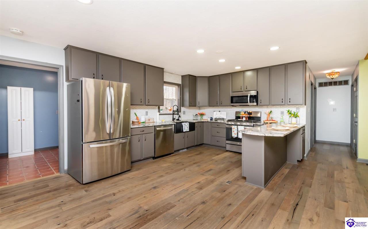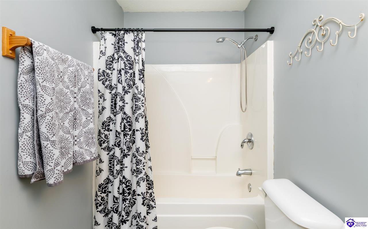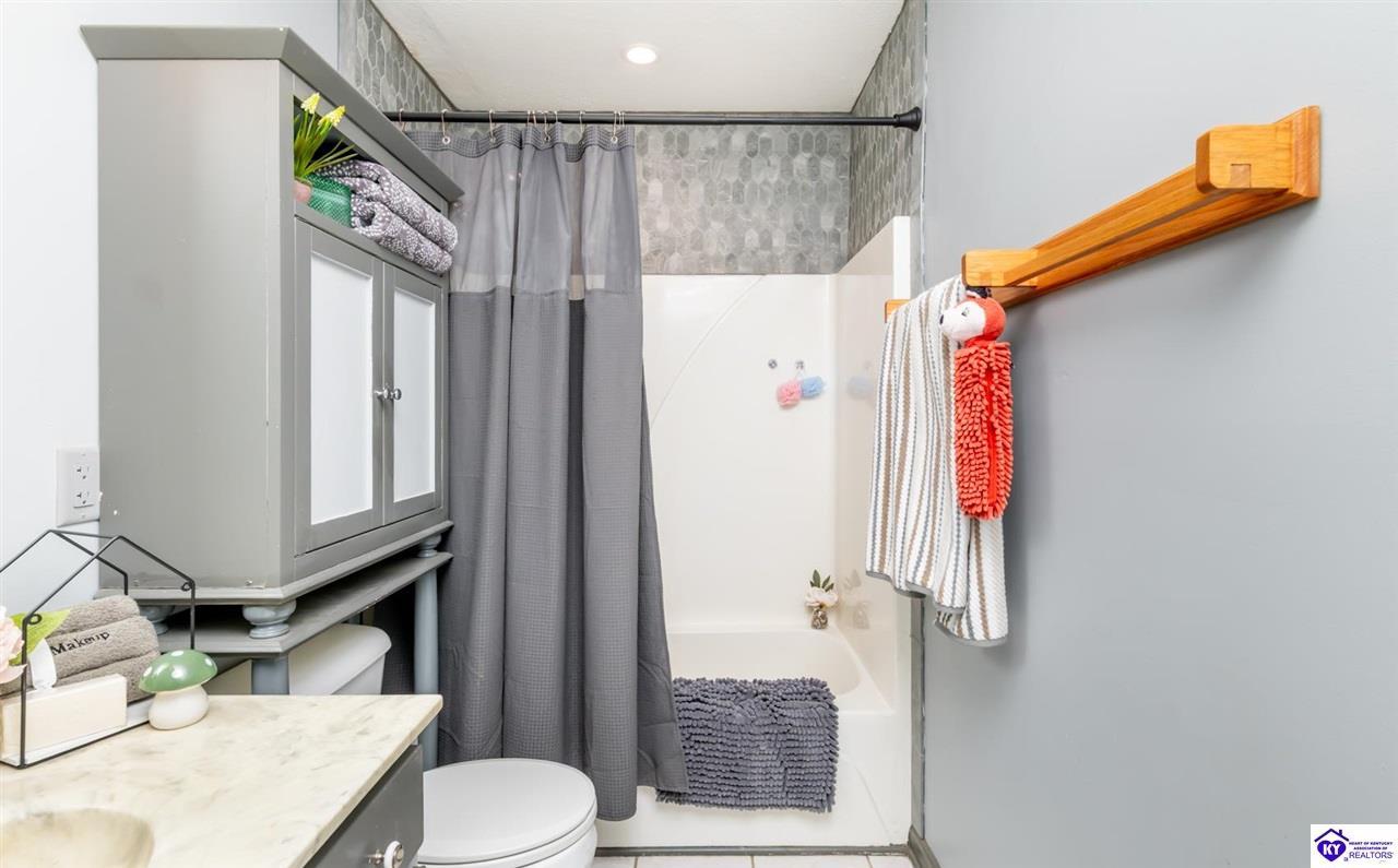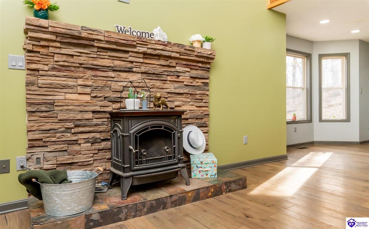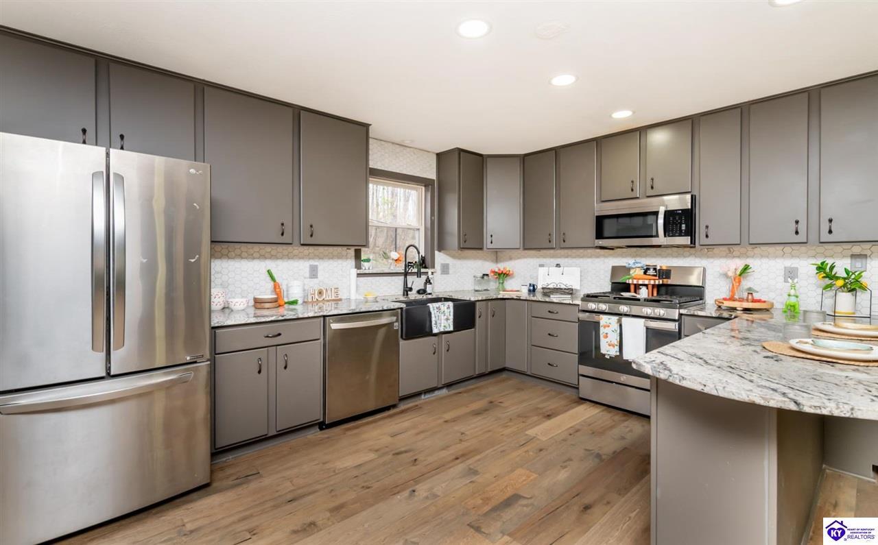 Realtor's notes: This Cape-style home features a unique and thoughtfully designed floorplan that stands apart from the typical Cape layout. Situated on a beautifully landscaped, wooded, and private park-like acre in Elizabethtown, KY, the home offers approximately 2,700 square feet with 3 bedrooms and 3 full bathrooms. The main living area showcases vaulted ceilings and an open layout with a dedicated dining area. The updated kitchen features granite countertops, a gorgeous tile backsplash, and a large eat-in bar. An open loft adds flexible space, while two propane fireplaces provide warmth and character. The home is equipped with an efficient gas furnace and central air conditioning to help keep utility costs manageable. The partially finished basement includes additional living or recreational space, a full bathroom, and an in-home tornado shelter. Outdoor features include a fenced backyard, a deck off the back of the home, and a large covered front porch overlooking the peaceful setting. The property offers exceptional garage and workspace options, including an attached 1-car garage with workshop area and a 32x40 detached garage built by Phillips Homes in 2015. This structure includes one 16 door, one 10 door, matching exterior finishes, loft space, a 100-amp panel, ventless propane heater, and reinforced concrete walls. With solid construction, a distinctive layout, and a wide range of functional features, this property presents a rare opportunity in a desirable Elizabethtown location.