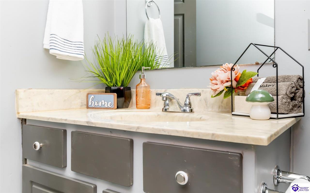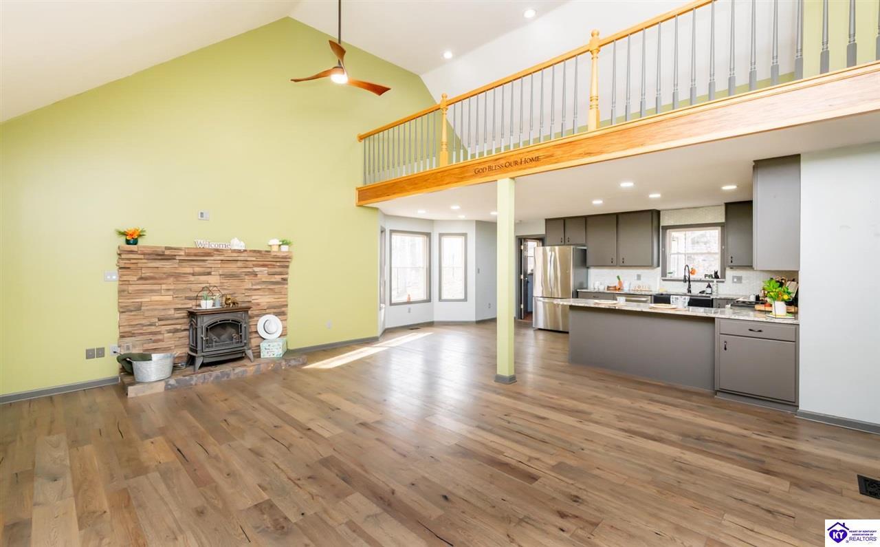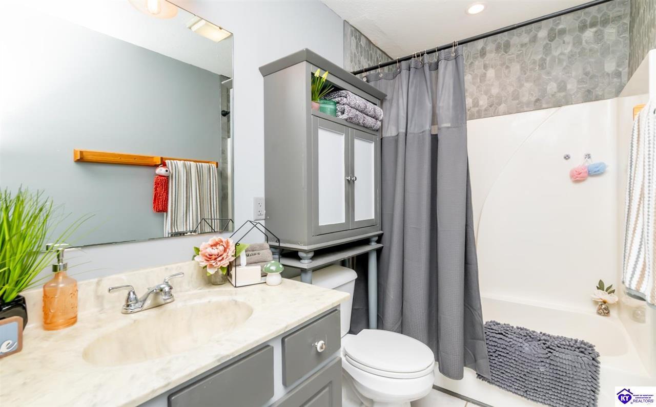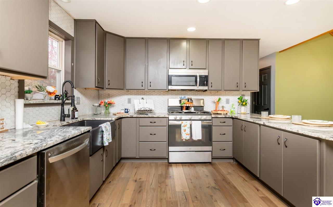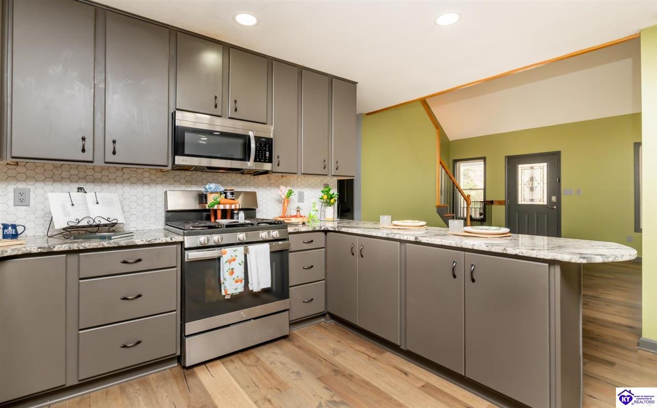 Realtor's notes: This Cape-style home features a unique and thoughtfully designed floorplan that stands apart from the typical Cape layout. Situated on a beautifully landscaped, wooded, and private park-like acre in Elizabethtown, KY, the home offers approximately 2,700 square feet with 3 bedrooms and 3 full bathrooms. The main living area showcases vaulted ceilings and an open layout with a dedicated dining area. The updated kitchen features granite countertops, a gorgeous tile backsplash, and a large eat-in bar. An open loft adds flexible space, while two propane fireplaces provide warmth and character. The home is equipped with an efficient gas furnace and central air conditioning to help keep utility costs manageable. The partially finished basement includes additional living or recreational space, a full bathroom, and an in-home tornado shelter. Outdoor features include a fenced backyard, a deck off the back of the home, and a large covered front porch overlooking the peaceful setting. The property offers exceptional garage and workspace options, including an attached 1-car garage with workshop area and a 32x40 detached garage built by Phillips Homes in 2015. This structure includes one 16 door, one 10 door, matching exterior finishes, loft space, a 100-amp panel, ventless propane heater, and reinforced concrete walls. With solid construction, a distinctive layout, and a wide range of functional features, this property presents a rare opportunity in a desirable Elizabethtown location.
