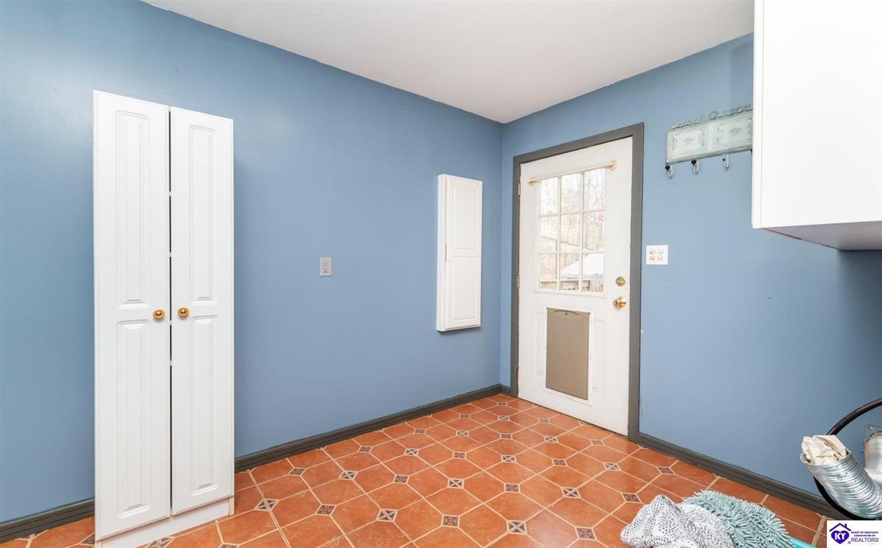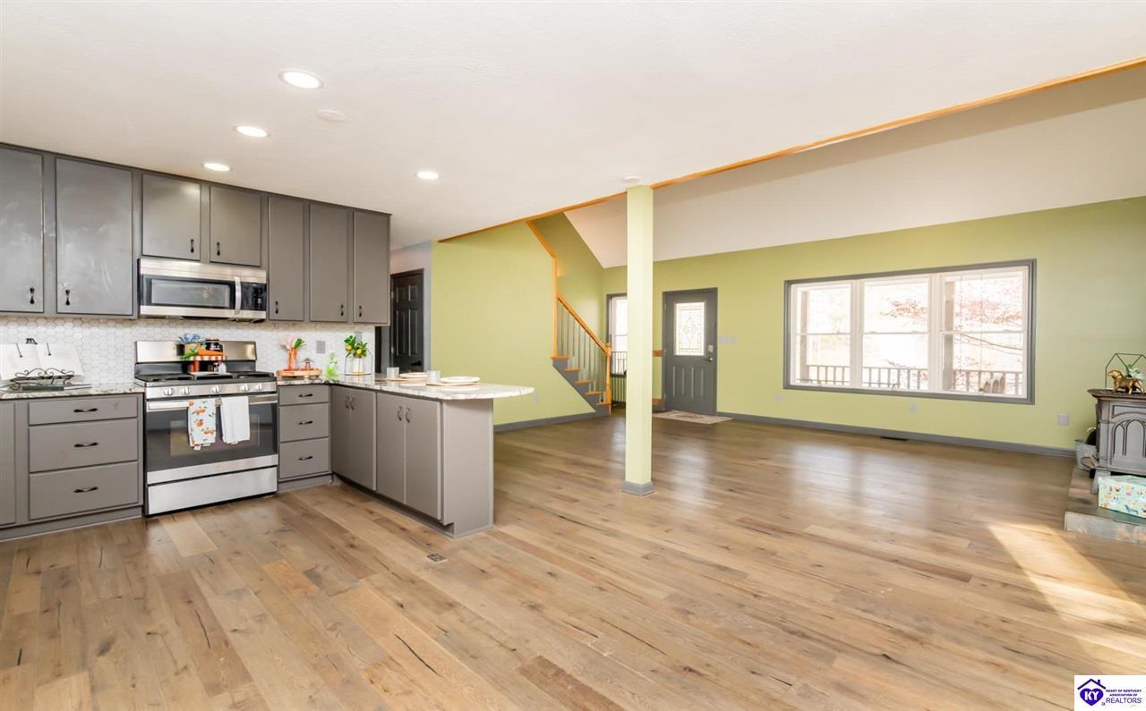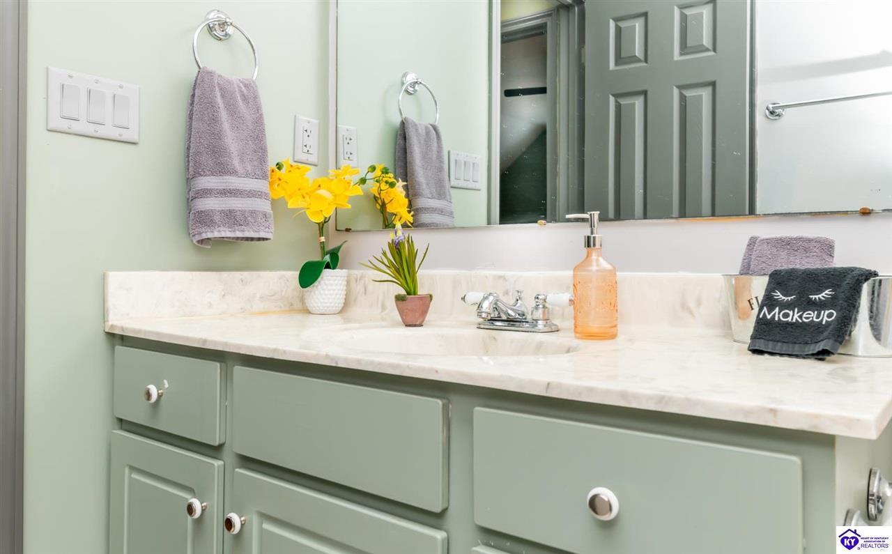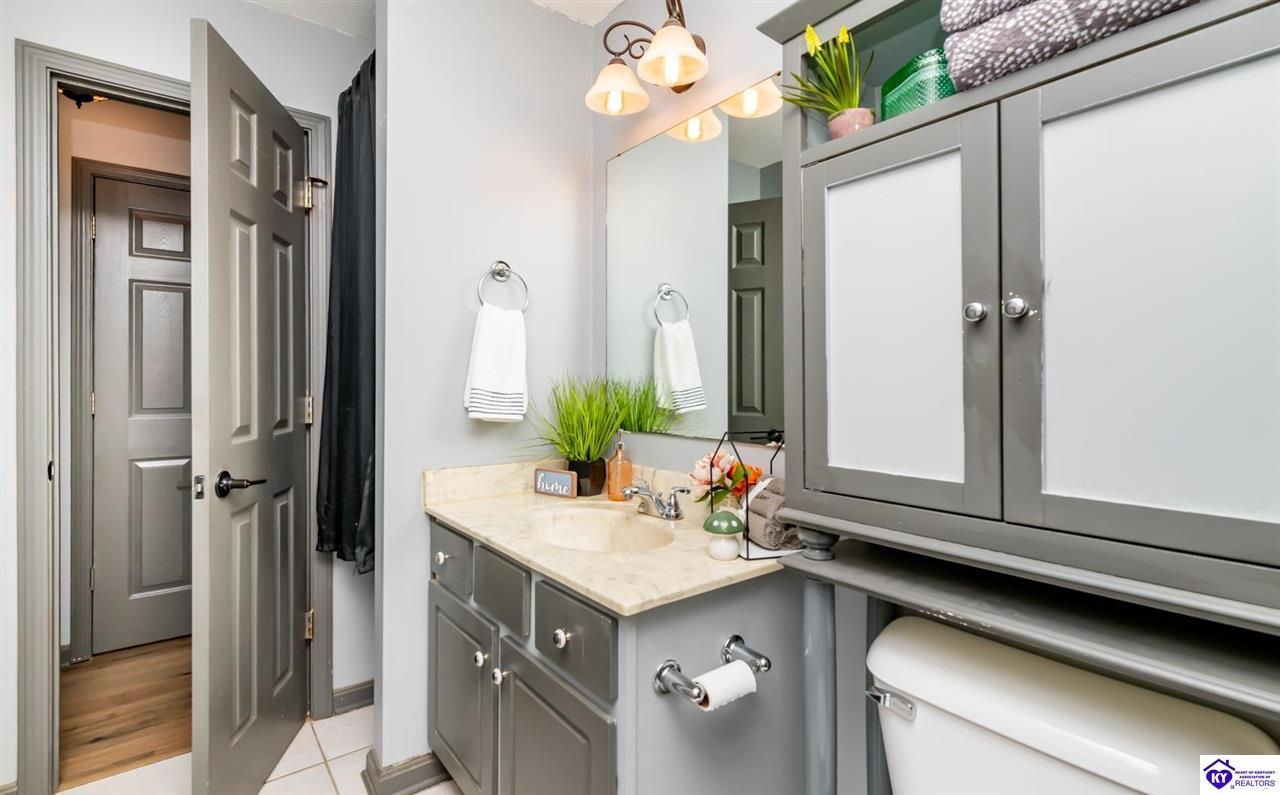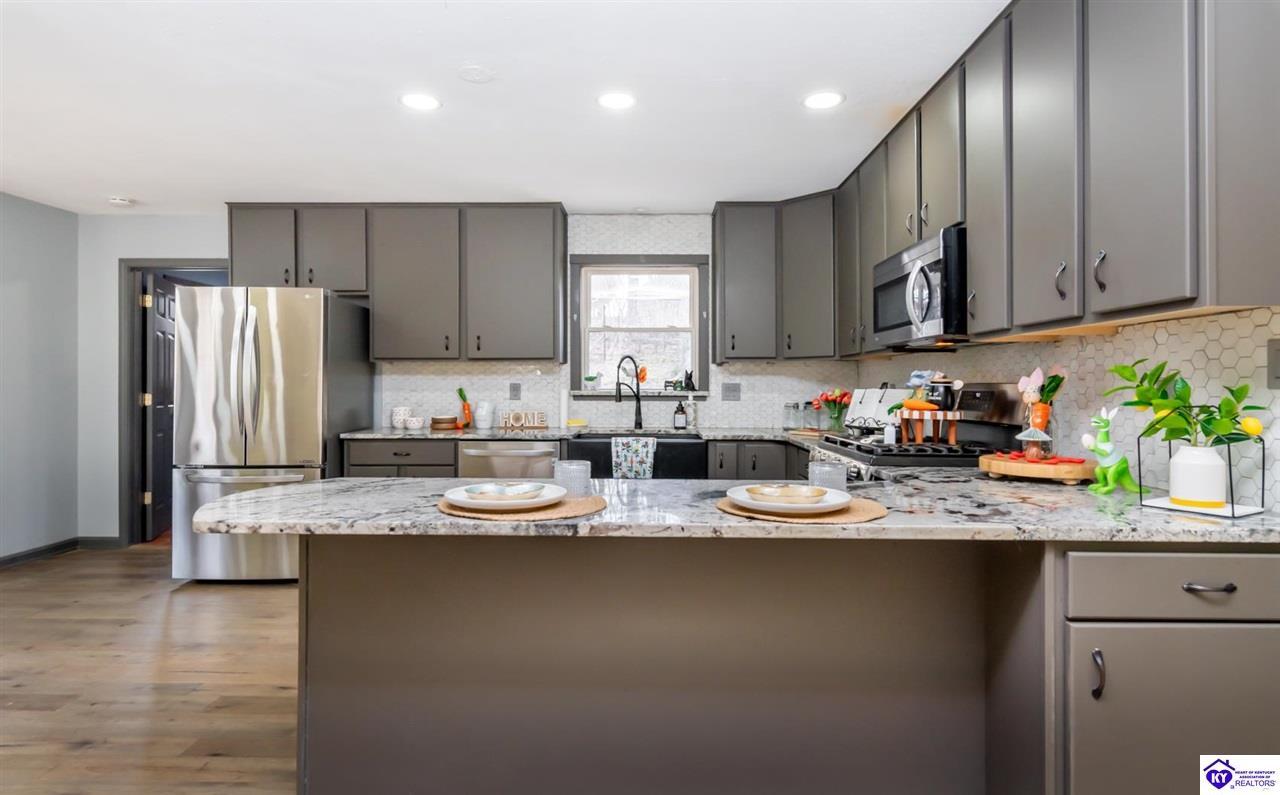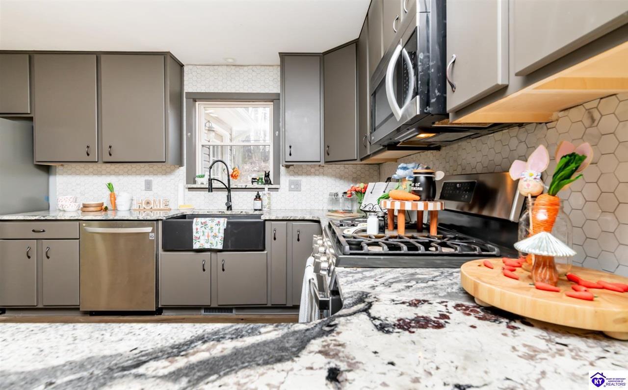 Realtor's notes: This Cape-style home features a unique and thoughtfully designed floorplan that stands apart from the typical Cape layout. Situated on a beautifully landscaped, wooded, and private park-like acre in Elizabethtown, KY, the home offers approximately 2,700 square feet with 3 bedrooms and 3 full bathrooms. The main living area showcases vaulted ceilings and an open layout with a dedicated dining area. The updated kitchen features granite countertops, a gorgeous tile backsplash, and a large eat-in bar. An open loft adds flexible space, while two propane fireplaces provide warmth and character. The home is equipped with an efficient gas furnace and central air conditioning to help keep utility costs manageable. The partially finished basement includes additional living or recreational space, a full bathroom, and an in-home tornado shelter. Outdoor features include a fenced backyard, a deck off the back of the home, and a large covered front porch overlooking the peaceful setting. The property offers exceptional garage and workspace options, including an attached 1-car garage with workshop area and a 32x40 detached garage built by Phillips Homes in 2015. This structure includes one 16 door, one 10 door, matching exterior finishes, loft space, a 100-amp panel, ventless propane heater, and reinforced concrete walls. With solid construction, a distinctive layout, and a wide range of functional features, this property presents a rare opportunity in a desirable Elizabethtown location.
