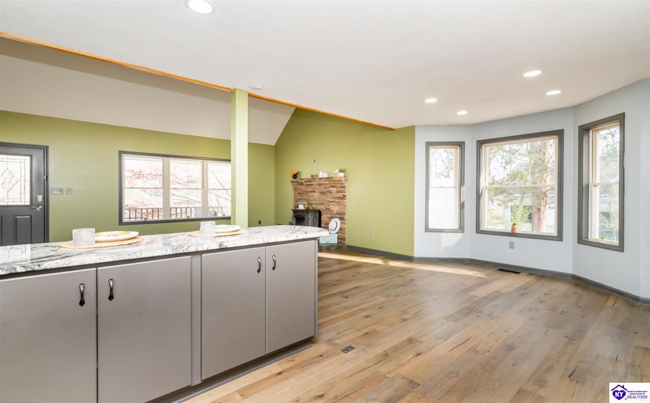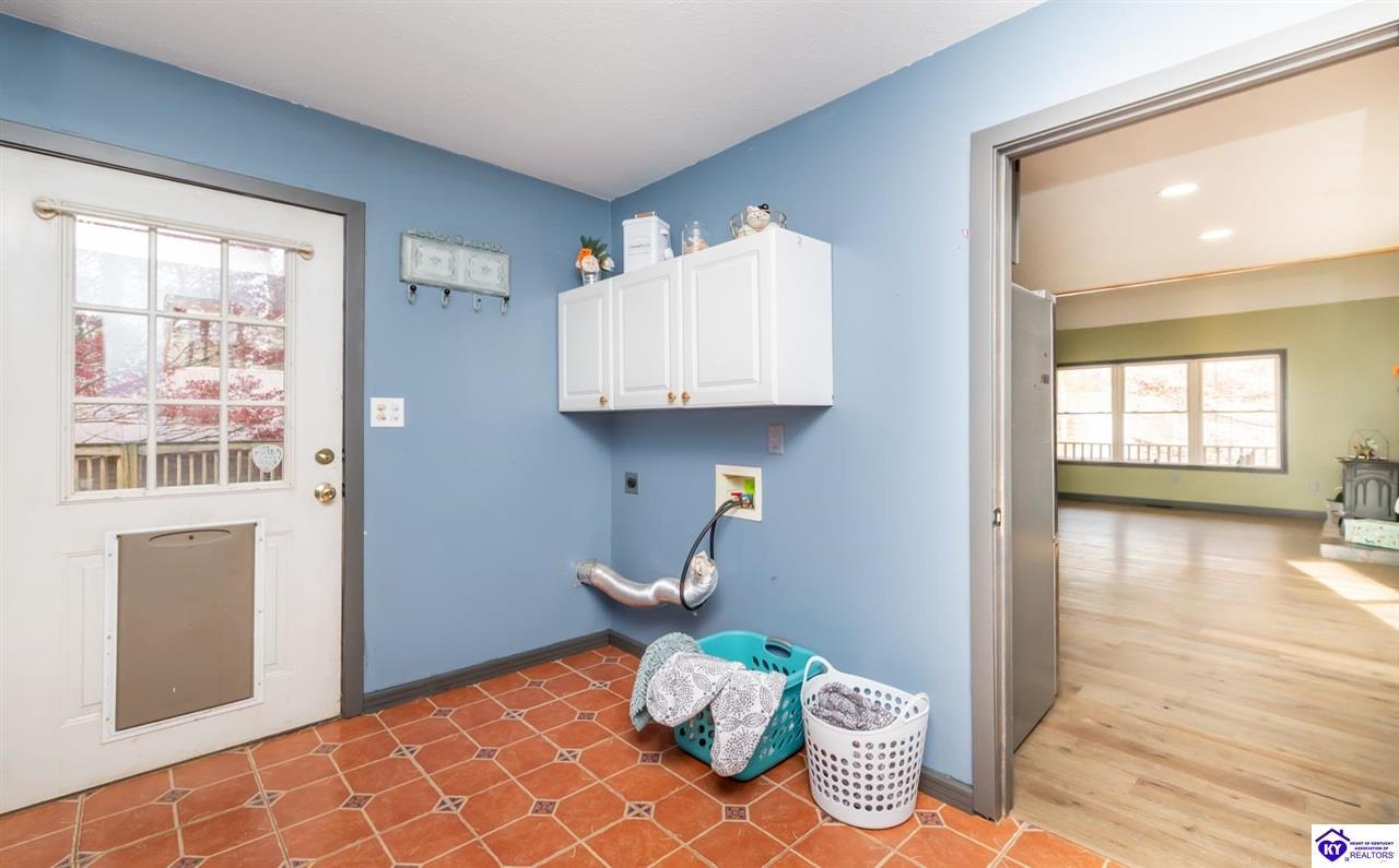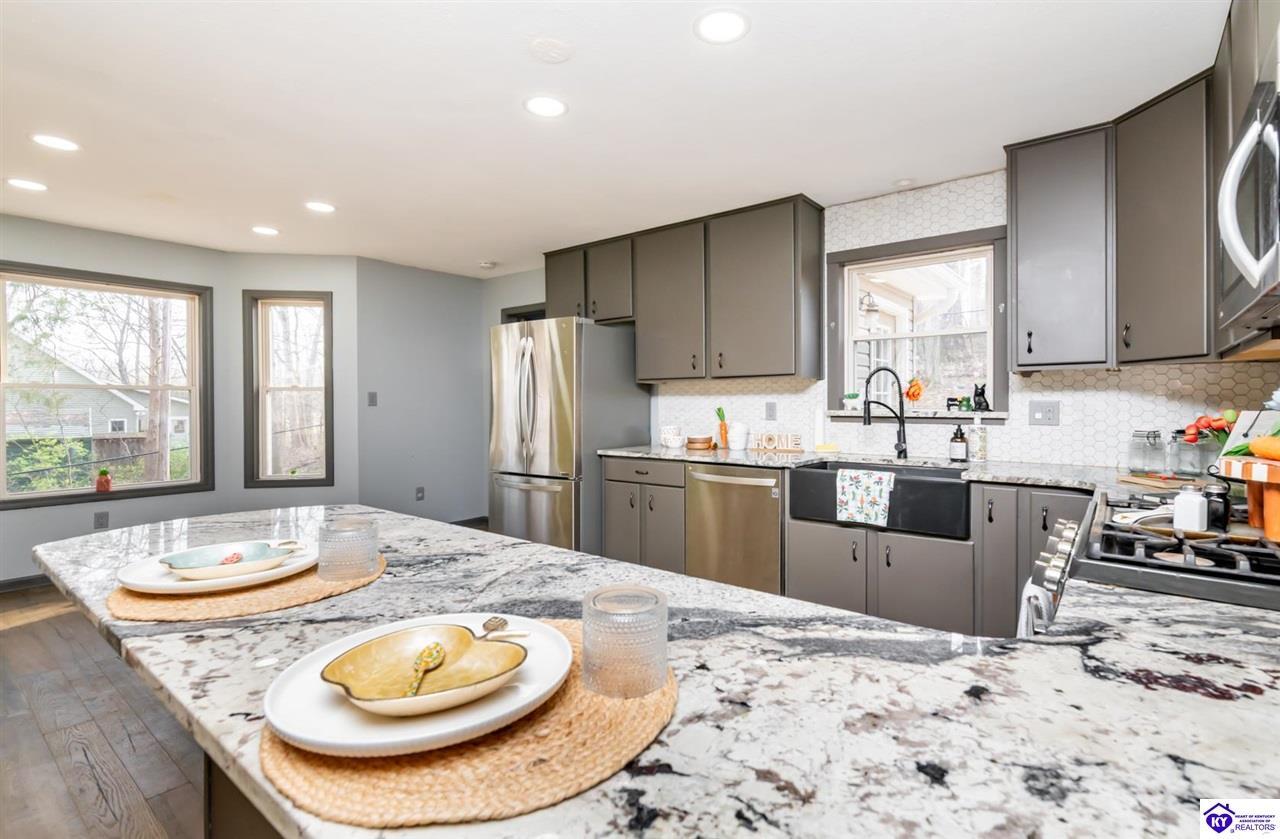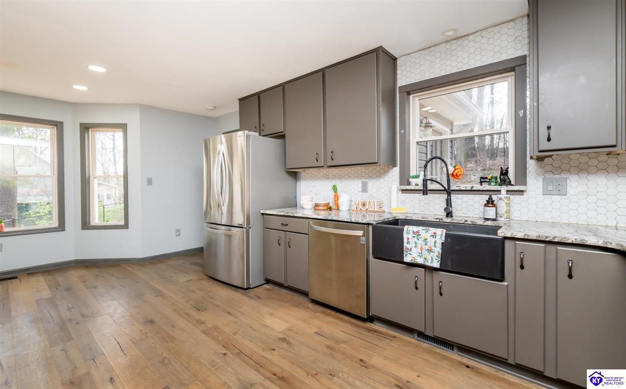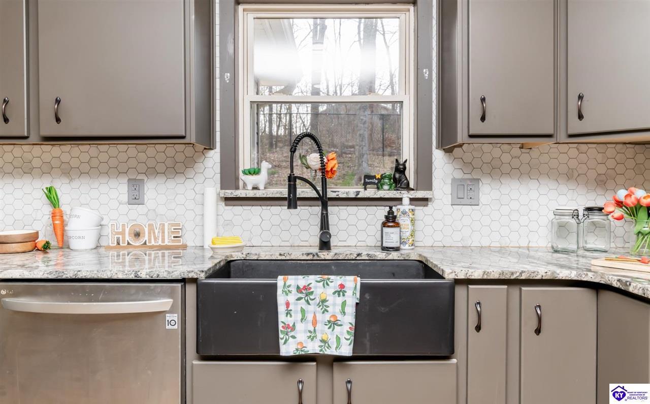 Realtor's notes: This Cape-style home features a unique and thoughtfully designed floorplan that stands apart from the typical Cape layout. Situated on a beautifully landscaped, wooded, and private park-like acre in Elizabethtown, KY, the home offers approximately 2,700 square feet with 3 bedrooms and 3 full bathrooms. The main living area showcases vaulted ceilings and an open layout with a dedicated dining area. The updated kitchen features granite countertops, a gorgeous tile backsplash, and a large eat-in bar. An open loft adds flexible space, while two propane fireplaces provide warmth and character. The home is equipped with an efficient gas furnace and central air conditioning to help keep utility costs manageable. The partially finished basement includes additional living or recreational space, a full bathroom, and an in-home tornado shelter. Outdoor features include a fenced backyard, a deck off the back of the home, and a large covered front porch overlooking the peaceful setting. The property offers exceptional garage and workspace options, including an attached 1-car garage with workshop area and a 32x40 detached garage built by Phillips Homes in 2015. This structure includes one 16 door, one 10 door, matching exterior finishes, loft space, a 100-amp panel, ventless propane heater, and reinforced concrete walls. With solid construction, a distinctive layout, and a wide range of functional features, this property presents a rare opportunity in a desirable Elizabethtown location.