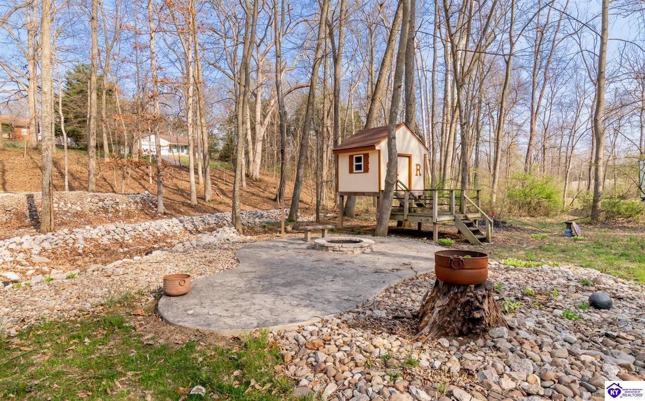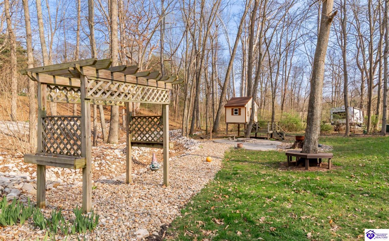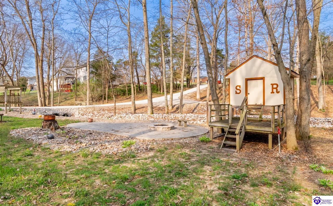 Exterior Covered Front Porch, Out Building, Workshop, Court Yard, Deck, Gazebo, Landscaping, Mature Trees, Playhouse, Sprinkler System, Trees