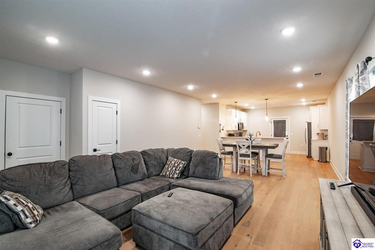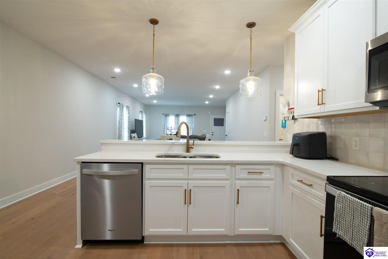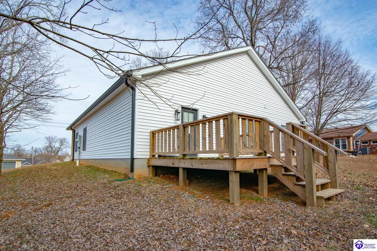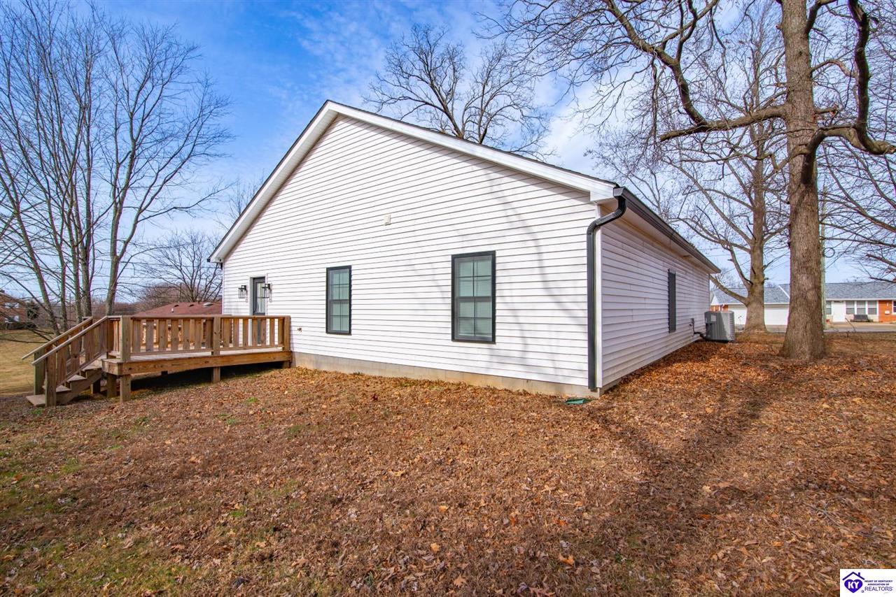 Realtor's notes: Welcome home to this well-maintained ranch located in a quiet neighborhood within the City of Vine Grove. Built just 2 years ago, this home offers the peace of mind of nearly new mechanicals and modern finishes throughout. Featuring 3 bedrooms, 2 full bathrooms, and 1,440 sq ft of comfortable, functional living space, this layout is ideal for everyday living. The open living and dining room combo includes recessed lighting and a convenient bar area connecting to the kitchen, making the space perfect for entertaining. The kitchen offers quartz countertops, soft-close drawers and cabinets, and stainless steel appliances. Both bathrooms also feature quartz countertops. A covered front porch adds curb appeal and a welcoming touch. All three bedrooms are spacious and feature carpet and ceiling fans. The primary bedroom easily accommodates a king-size bedroom suite and includes a 4x7 walk-in closet. A centrally located laundry closet is conveniently positioned in the hallway. Enjoy outdoor living on the 12x12 deck, plus an attached 2-car garage with an epoxy floor. Window blinds and curtain rods will remain (curtains do not convey). A move-in-ready home with thoughtful upgrades in a peaceful setting—don’t miss this opportunity!