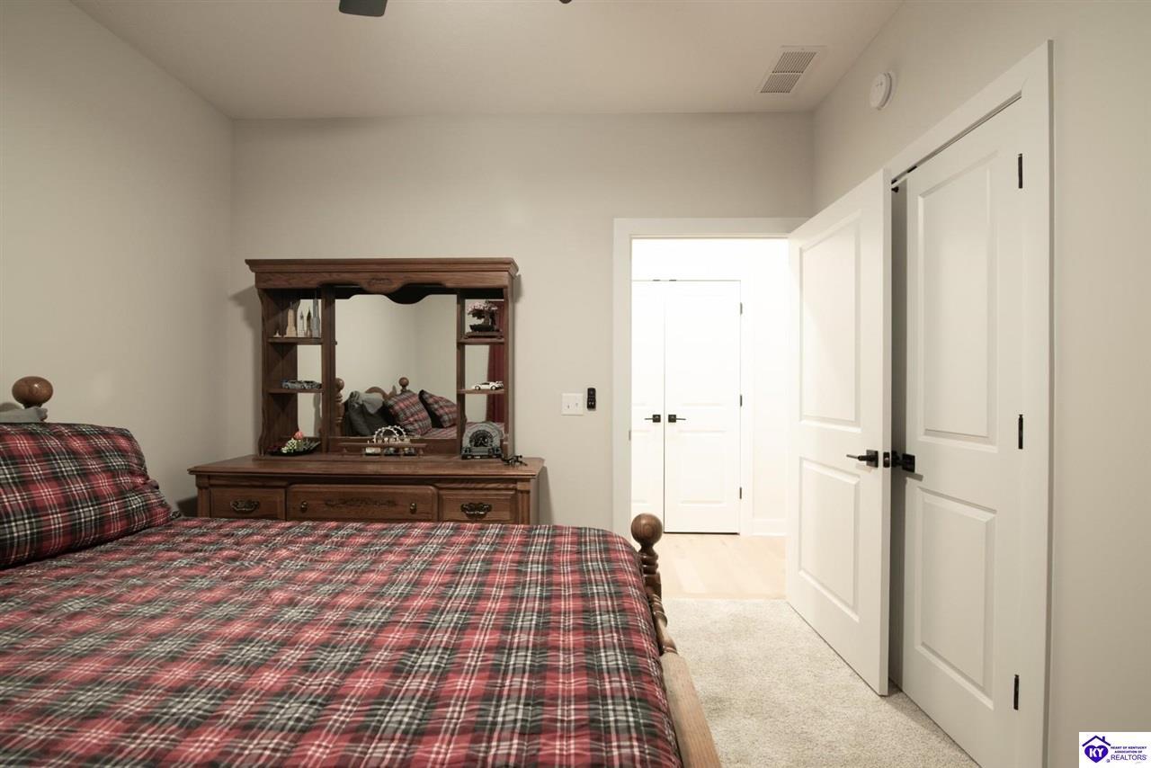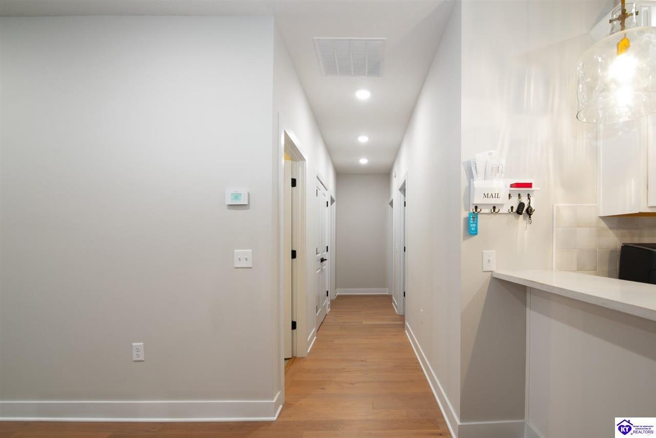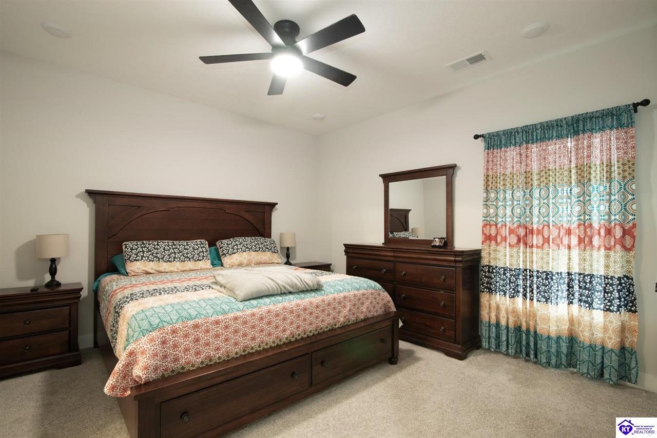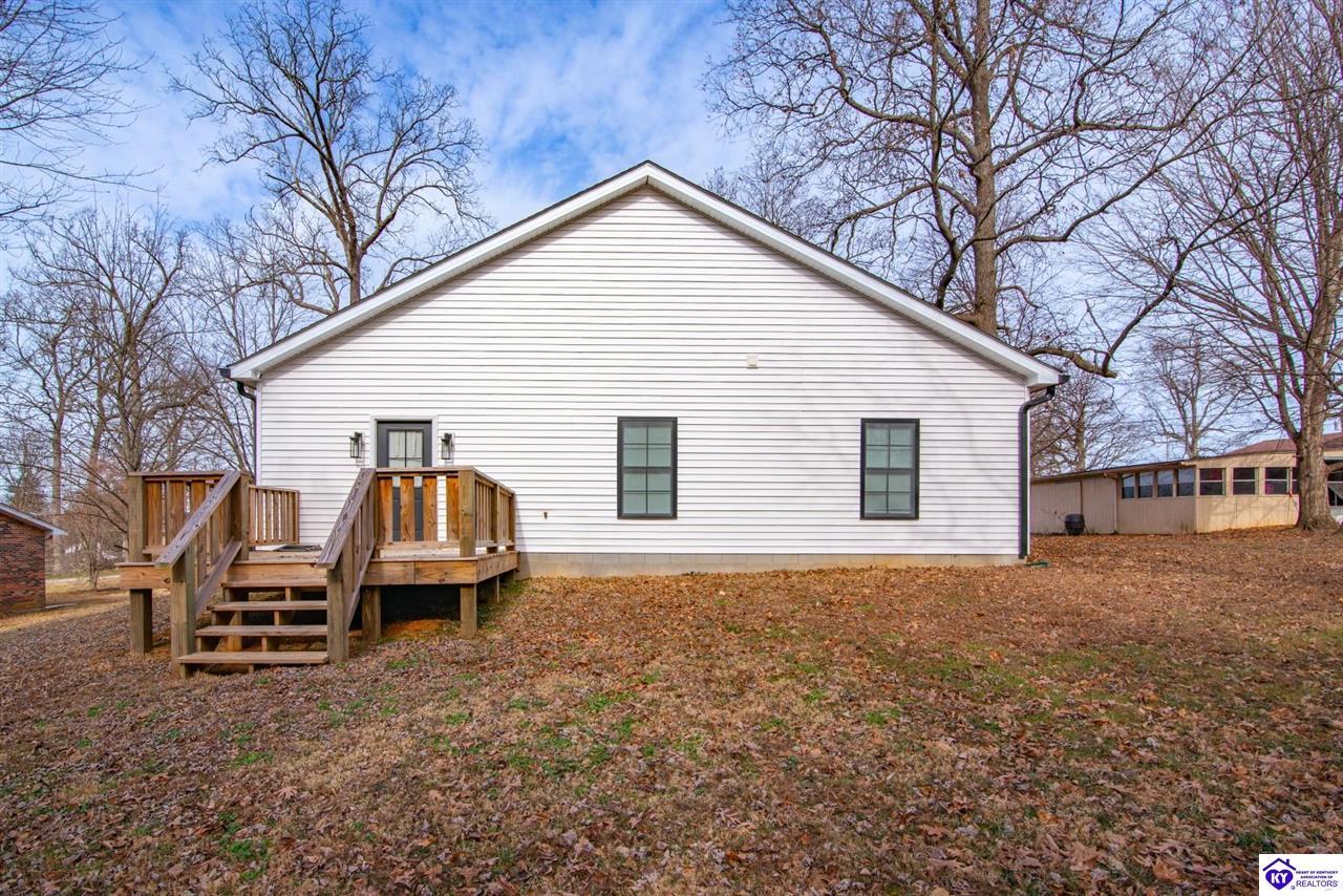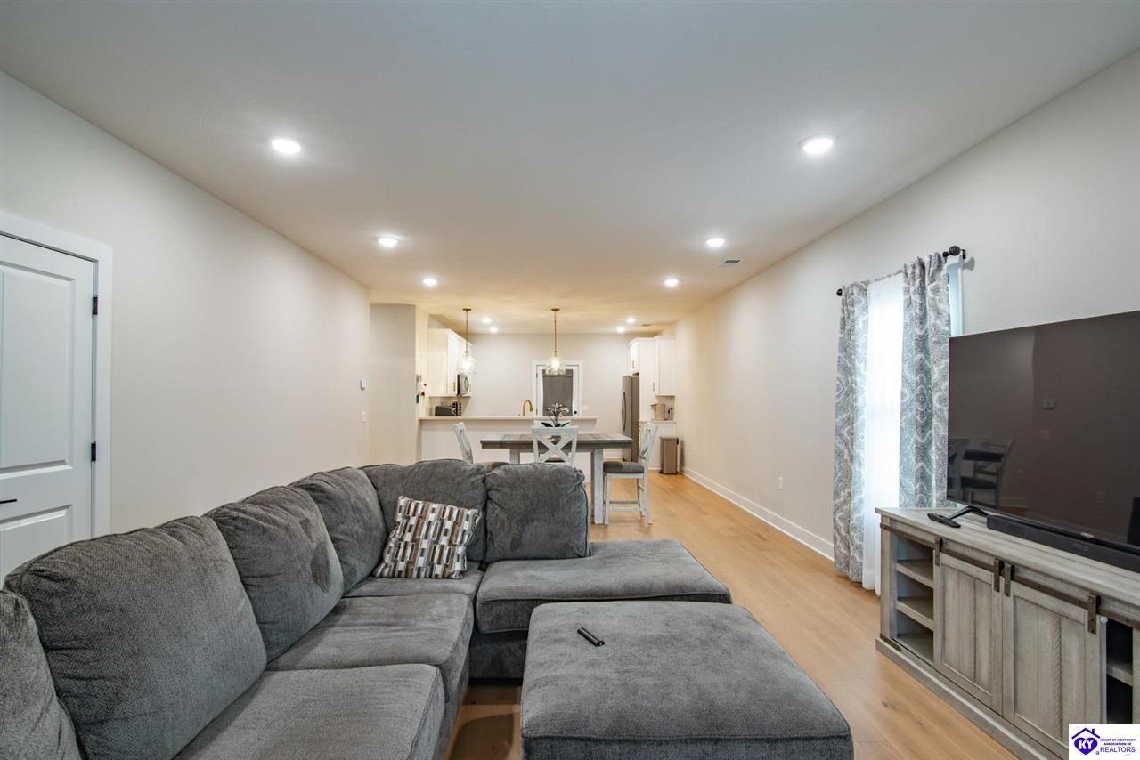 Realtor's notes: Welcome home to this well-maintained ranch located in a quiet neighborhood within the City of Vine Grove. Built just 2 years ago, this home offers the peace of mind of nearly new mechanicals and modern finishes throughout. Featuring 3 bedrooms, 2 full bathrooms, and 1,440 sq ft of comfortable, functional living space, this layout is ideal for everyday living. The open living and dining room combo includes recessed lighting and a convenient bar area connecting to the kitchen, making the space perfect for entertaining. The kitchen offers quartz countertops, soft-close drawers and cabinets, and stainless steel appliances. Both bathrooms also feature quartz countertops. A covered front porch adds curb appeal and a welcoming touch. All three bedrooms are spacious and feature carpet and ceiling fans. The primary bedroom easily accommodates a king-size bedroom suite and includes a 4x7 walk-in closet. A centrally located laundry closet is conveniently positioned in the hallway. Enjoy outdoor living on the 12x12 deck, plus an attached 2-car garage with an epoxy floor. Window blinds and curtain rods will remain (curtains do not convey). A move-in-ready home with thoughtful upgrades in a peaceful setting—don’t miss this opportunity!