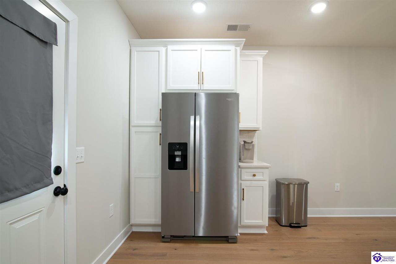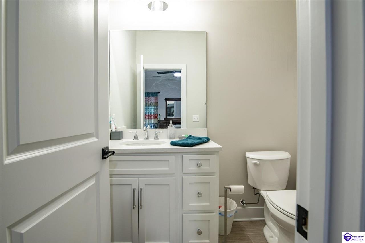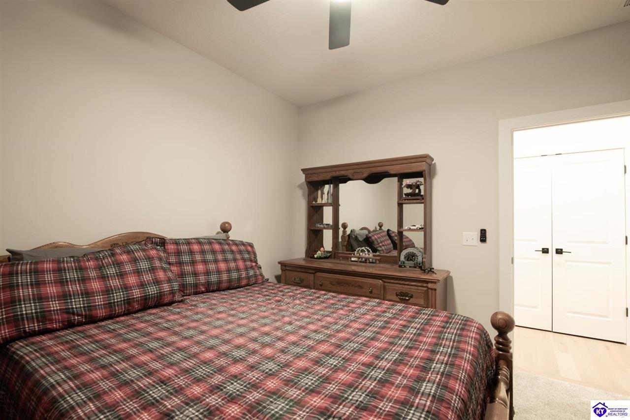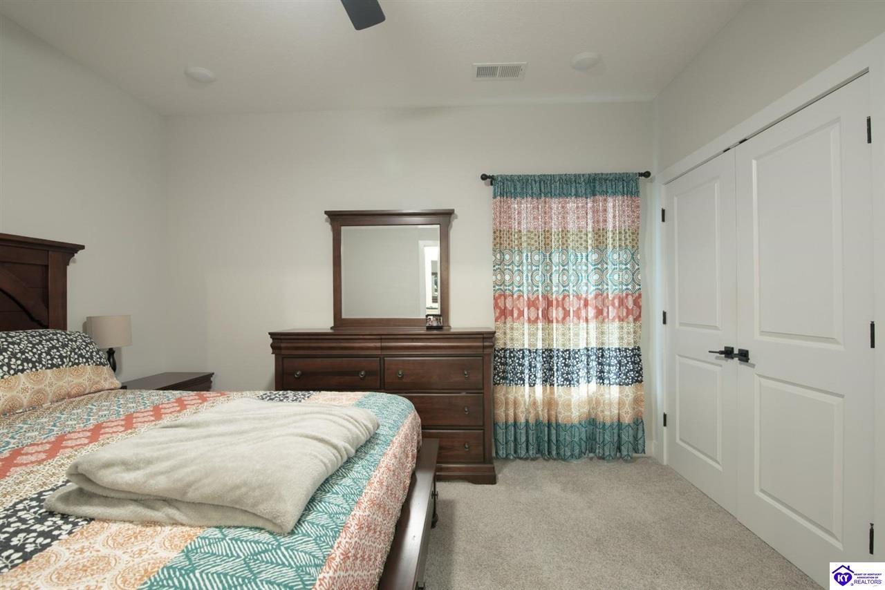 Realtor's notes: Welcome home to this well-maintained ranch located in a quiet neighborhood within the City of Vine Grove. Built just 2 years ago, this home offers the peace of mind of nearly new mechanicals and modern finishes throughout. Featuring 3 bedrooms, 2 full bathrooms, and 1,440 sq ft of comfortable, functional living space, this layout is ideal for everyday living. The open living and dining room combo includes recessed lighting and a convenient bar area connecting to the kitchen, making the space perfect for entertaining. The kitchen offers quartz countertops, soft-close drawers and cabinets, and stainless steel appliances. Both bathrooms also feature quartz countertops. A covered front porch adds curb appeal and a welcoming touch. All three bedrooms are spacious and feature carpet and ceiling fans. The primary bedroom easily accommodates a king-size bedroom suite and includes a 4x7 walk-in closet. A centrally located laundry closet is conveniently positioned in the hallway. Enjoy outdoor living on the 12x12 deck, plus an attached 2-car garage with an epoxy floor. Window blinds and curtain rods will remain (curtains do not convey). A move-in-ready home with thoughtful upgrades in a peaceful setting—don’t miss this opportunity!