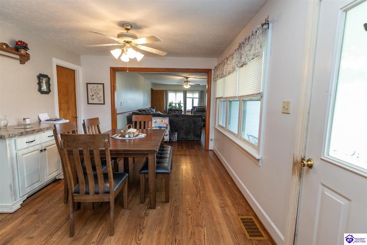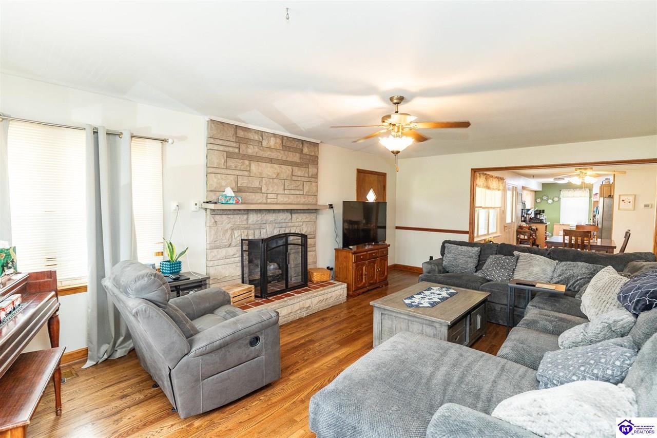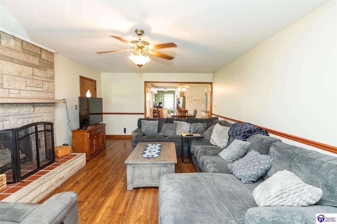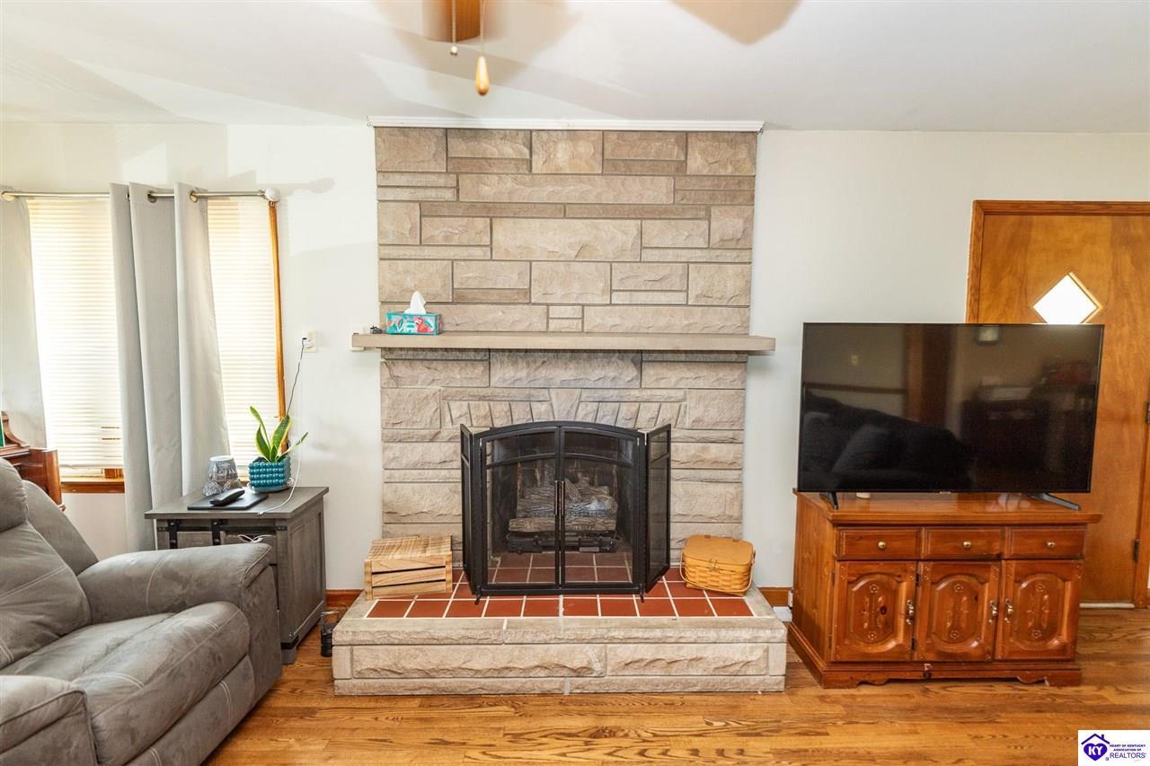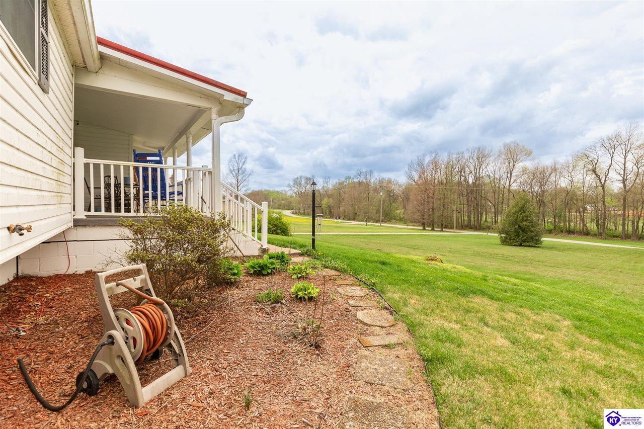 Realtor's notes: Welcome to 128 Ditto Lane! Located in Vine Grove just off of Joe Prather Hwy., this four bedroom, two bathroom home is situated on 2.7 acres and includes a barn with a lean-to and a shed. Inside the home, notice the original hardwood floors. The kitchen/dining combo includes stainless steel appliances and plenty of space for entertaining guests. The living room has a bedford stone propane fireplace perfect for cozying up on winter nights. The primary bedroom is located just off of the living room and has a door that opens to the backyard. The first of the remaining three bedrooms is also located off of the living room. Off of the dining area, there is a hallway that leads to the first floor full bathroom with a tile floor and also tile in the tub/shower combo. The two other bedrooms can be found as well. In the finished portion of the basement, there is LVP flooring. The second full bathroom is located in the laundry room and includes a shower stall. There is one bonus room that is currently being used as a storage area. In the unfinished portion, there is plenty of space for additional storage. The basement walks out to the one car garage which has an abundance of space for storage. Outside, the 2.7 acres provides plenty of space for gardening, having a mini farm, or whatever your heart desires! The barn provides storage space and can be used to house a couple of animals if needed. Don't miss out on this one, schedule your tour today!