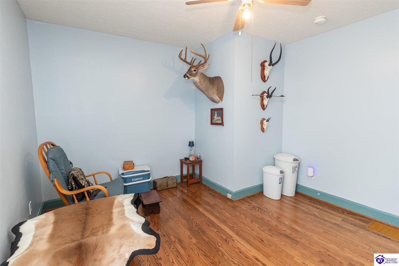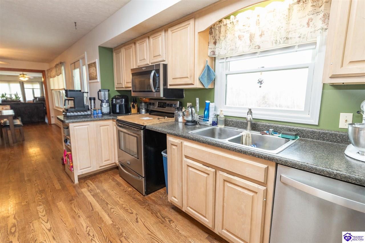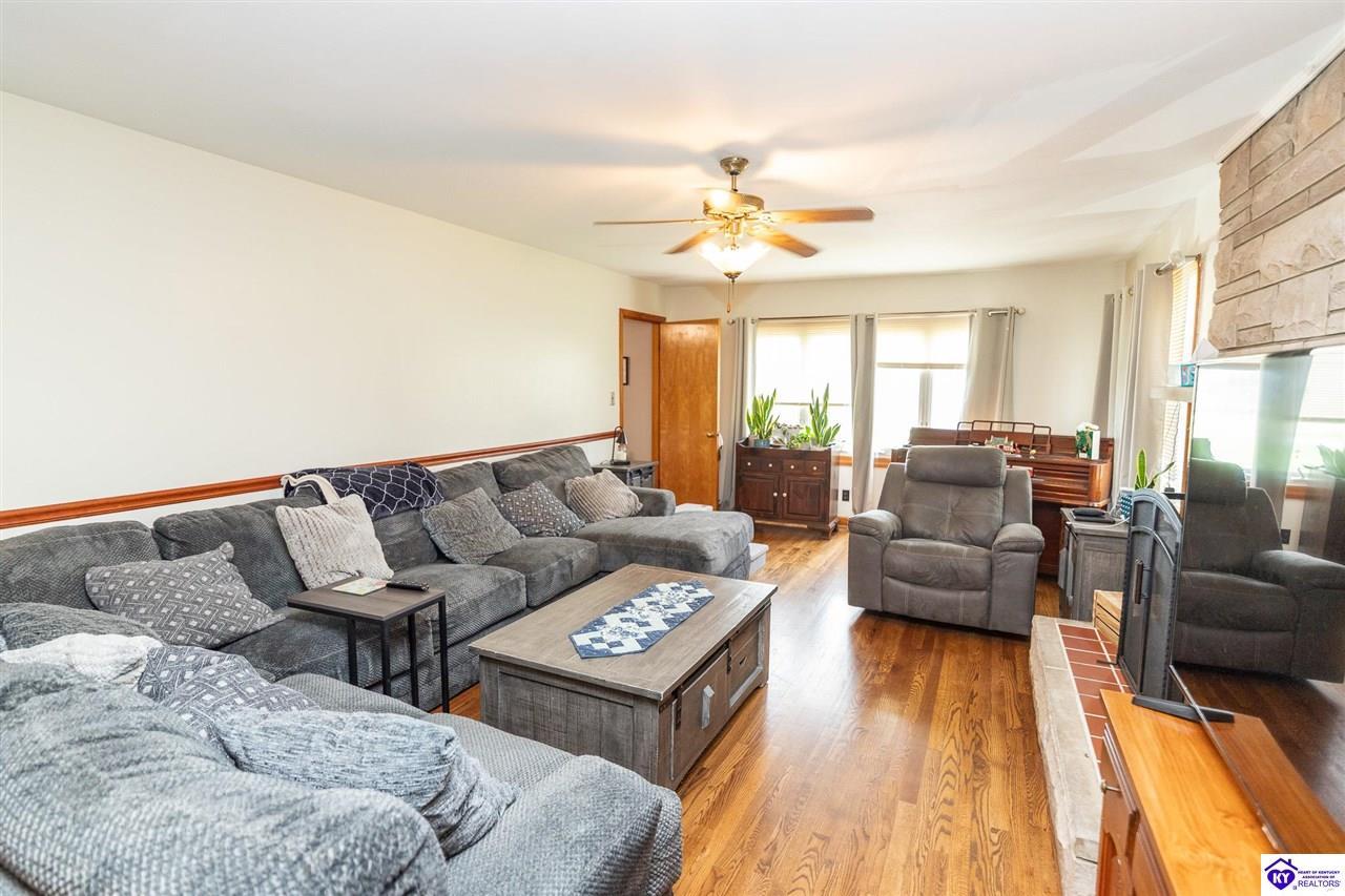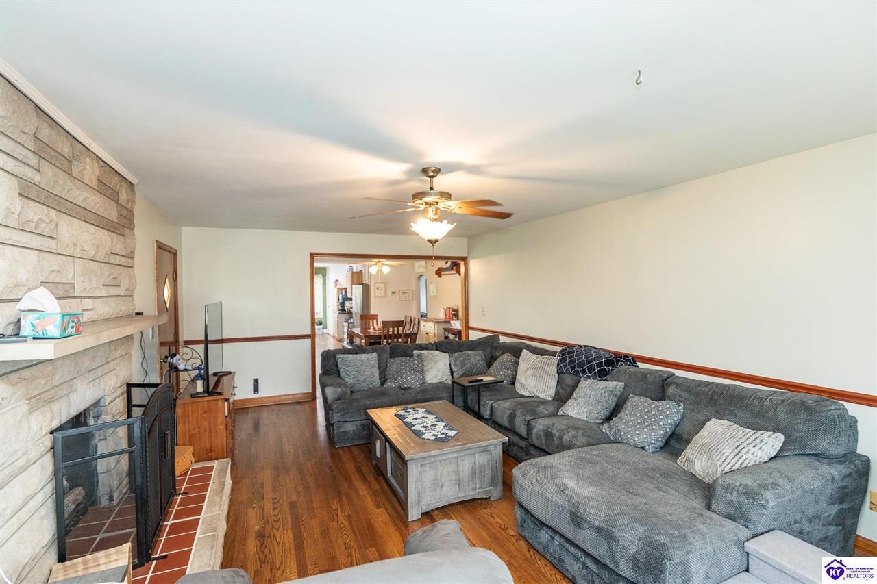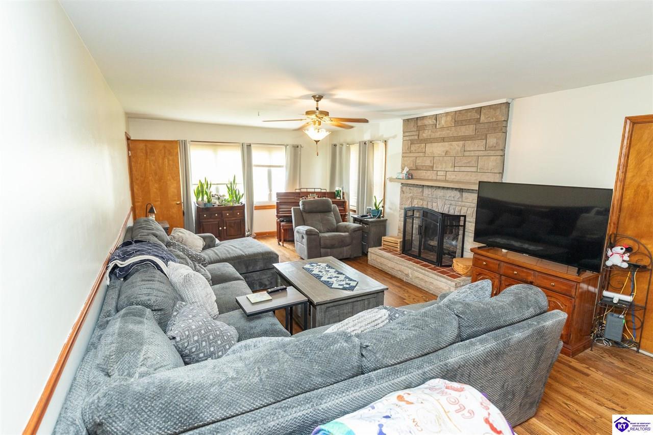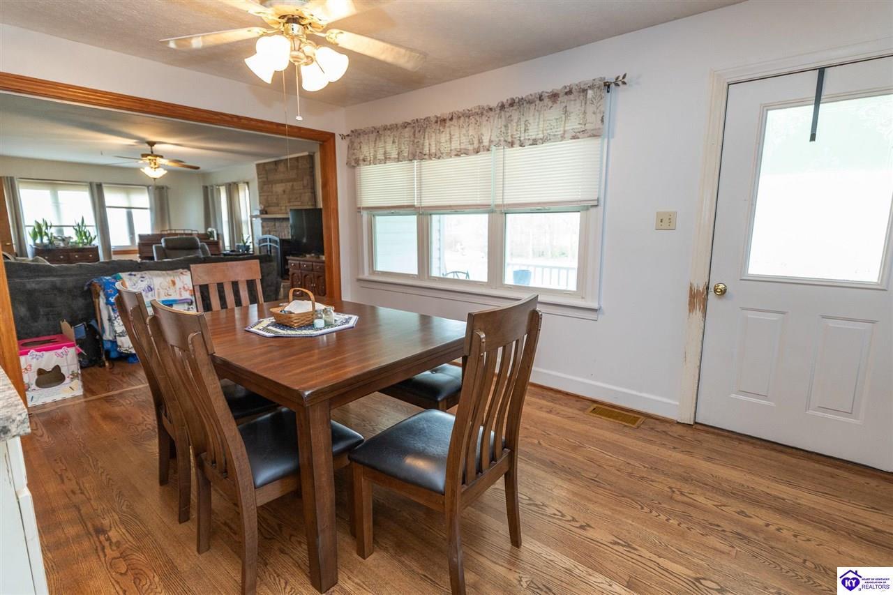 Realtor's notes: Welcome to 128 Ditto Lane! Located in Vine Grove just off of Joe Prather Hwy., this four bedroom, two bathroom home is situated on 2.7 acres and includes a barn with a lean-to and a shed. Inside the home, notice the original hardwood floors. The kitchen/dining combo includes stainless steel appliances and plenty of space for entertaining guests. The living room has a bedford stone propane fireplace perfect for cozying up on winter nights. The primary bedroom is located just off of the living room and has a door that opens to the backyard. The first of the remaining three bedrooms is also located off of the living room. Off of the dining area, there is a hallway that leads to the first floor full bathroom with a tile floor and also tile in the tub/shower combo. The two other bedrooms can be found as well. In the finished portion of the basement, there is LVP flooring. The second full bathroom is located in the laundry room and includes a shower stall. There is one bonus room that is currently being used as a storage area. In the unfinished portion, there is plenty of space for additional storage. The basement walks out to the one car garage which has an abundance of space for storage. Outside, the 2.7 acres provides plenty of space for gardening, having a mini farm, or whatever your heart desires! The barn provides storage space and can be used to house a couple of animals if needed. Don't miss out on this one, schedule your tour today!