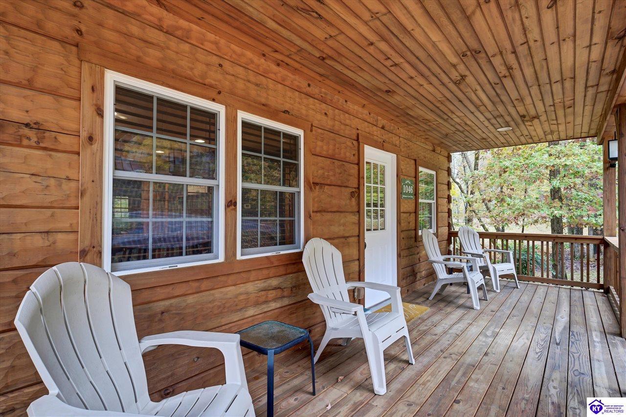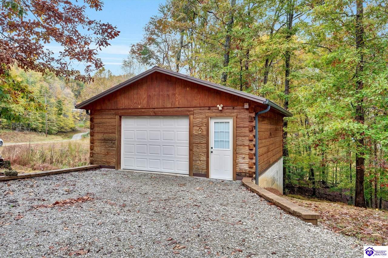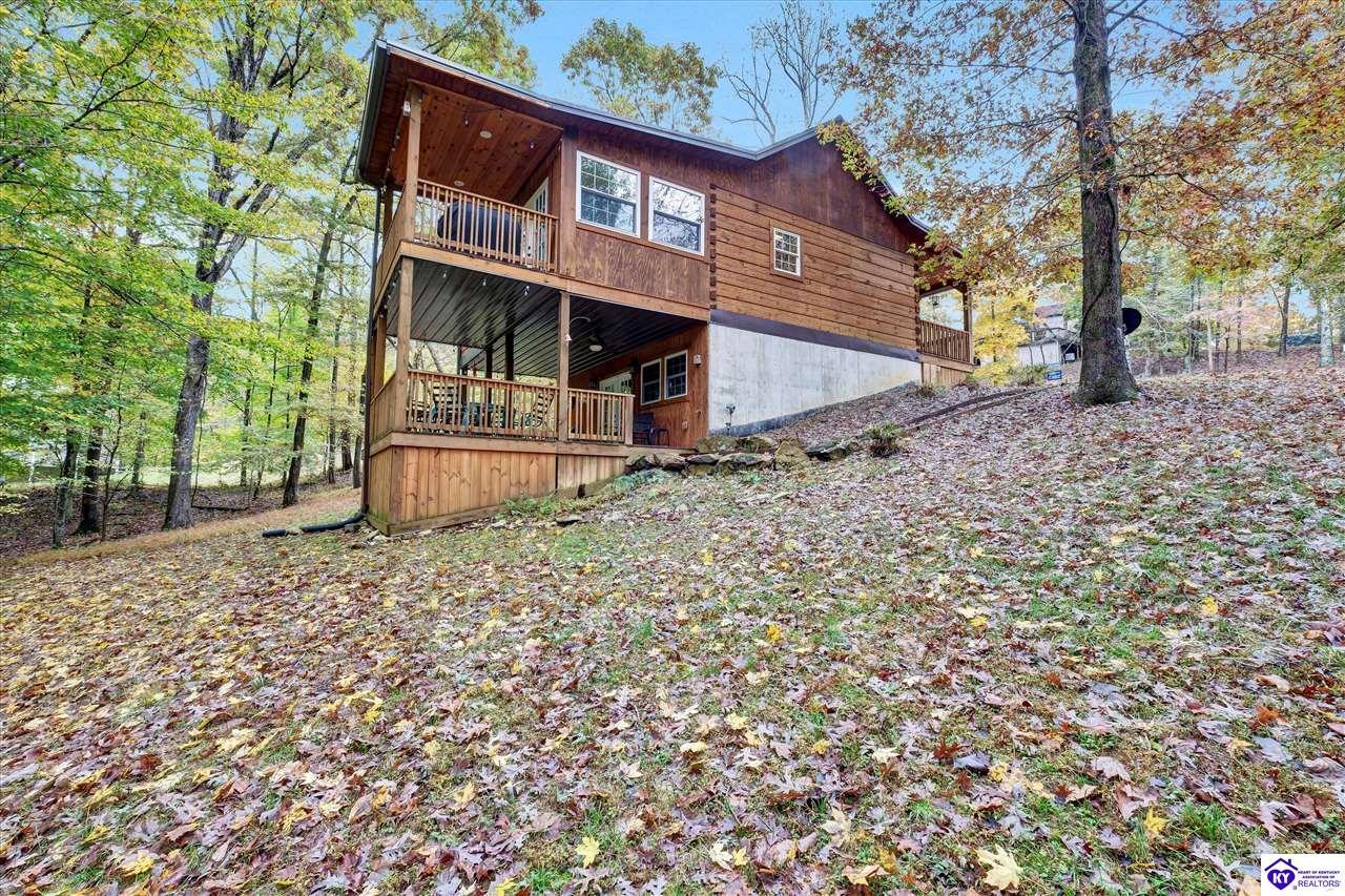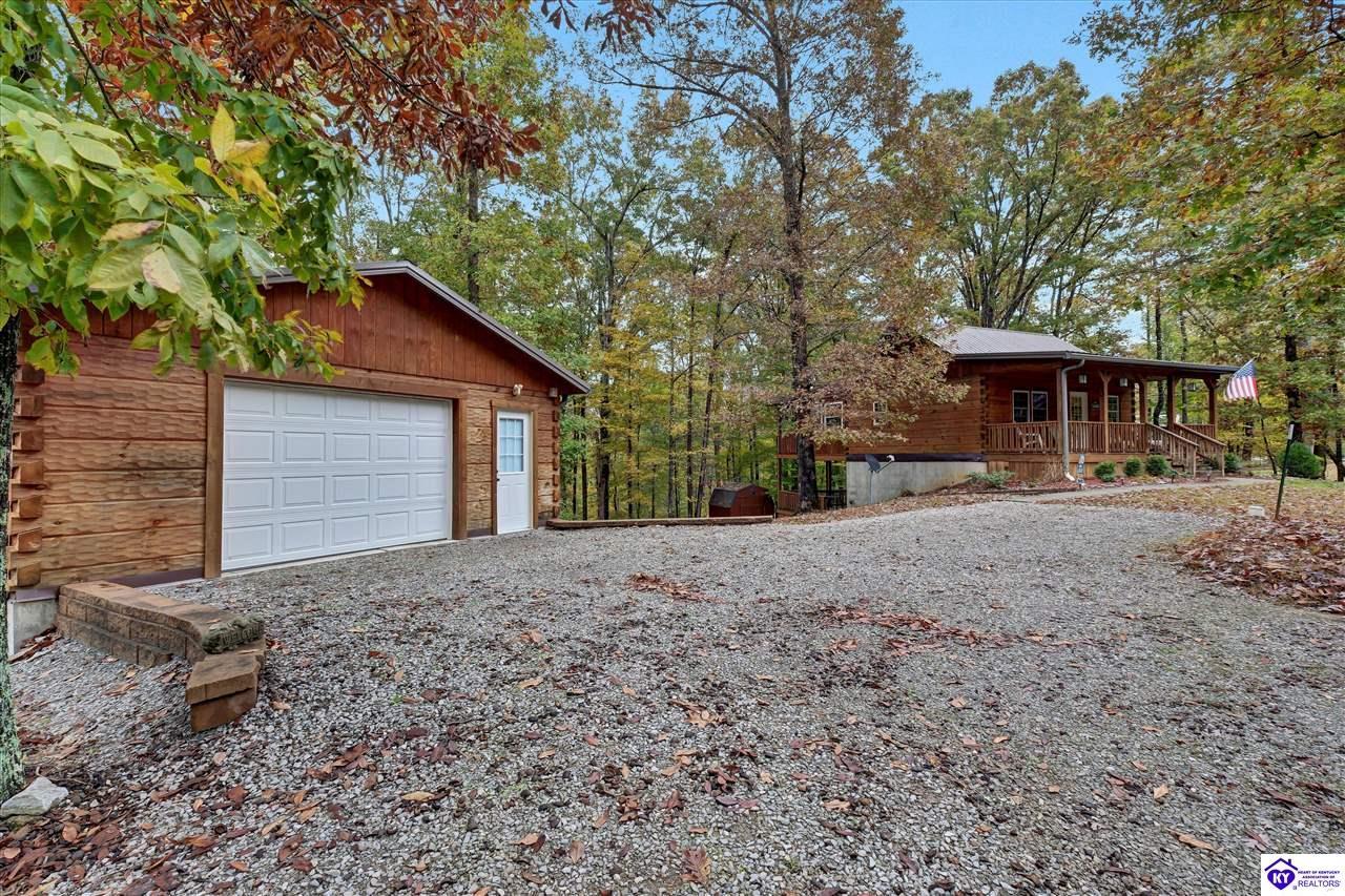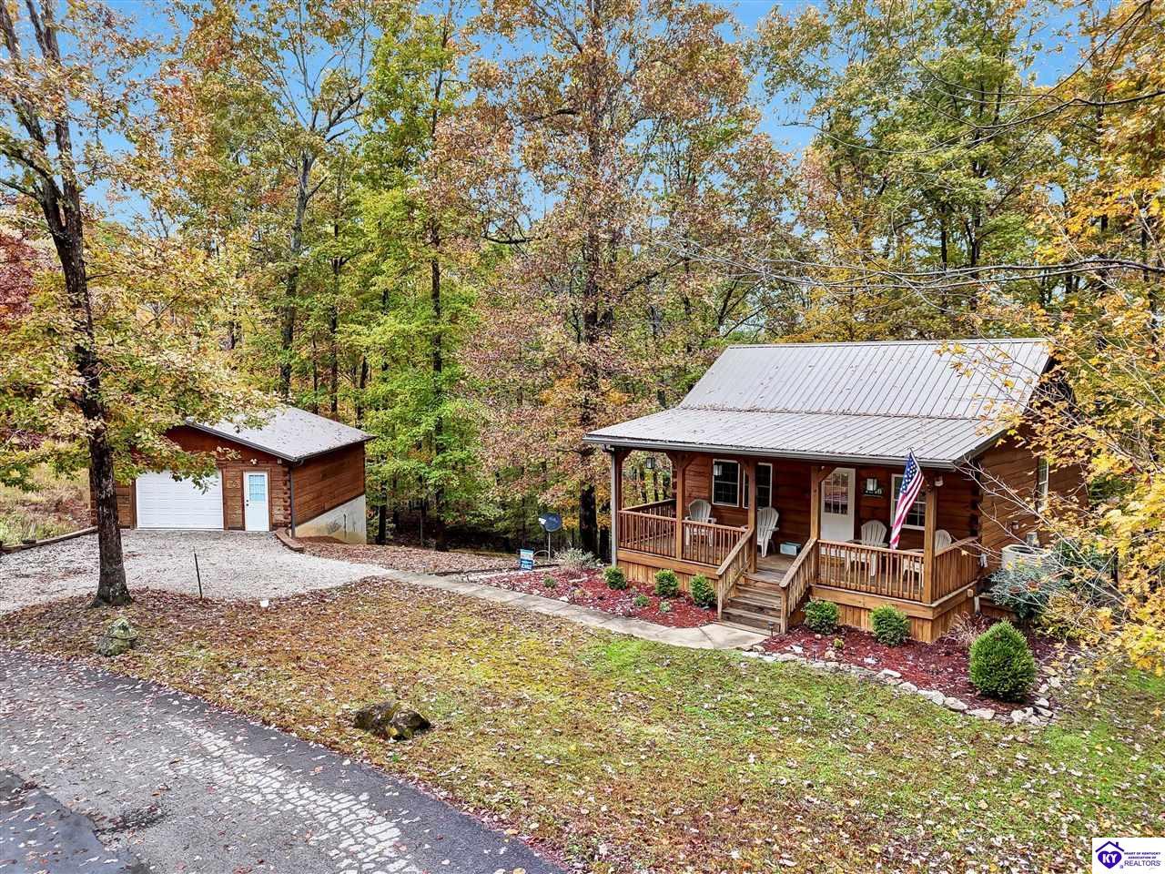 Realtor's notes: Welcome to your private log retreat at beautiful Nolin Lake! Nestled in the gated Michaels Cove Subdivision, this charming log home offers the perfect blend of rustic warmth and modern convenience. Relax on the inviting rocking chair front porch or enjoy peaceful lake evenings from the covered rear deck overlooking the wooded surroundings. Inside, the spacious kitchen with center island opens to the cozy family room and adjoining sleeping area, providing an open, cabin-style flow ideal for gatherings. The main level bedroom and full bath with a large garden tub make it easy to unwind after a fun filled day on the lake. The walkout lower level includes an additional bedroom, full bath, and laundry area—perfect for guests or extended stays. (Note: Bedrooms do not have closets and are More...non-conforming, though typical for the area.) Step outside to a covered lower deck, where you can still enjoy the great outdoors even when spring showers roll through. The detached garage with a full bath offers versatile space ideal for storing lake toys, taking a quick shower after time on the water, or transforming into a great party area for entertaining family and friends. The 10'x10' shed is perfect for extra storage. There is over 600 sq ft of decking and porch areas to enjoy the views. The home sits on two lots totaling 1.01 acres, offering privacy and space to relax. Your dock is just a short RTV ride away, and with the boat ramp and marina less than 1.5 miles away, lake days couldn't be more convenient. Dock will transfer with the Corp of Engineers approval. No rentals allowed, ensuring a peaceful neighborhood and protecting your investment. Start making lake memories to last a lifetime! Neighborhood info- https://webmasteroaklandhi.wixsite.com/mysite/bylaws-restrictions-1