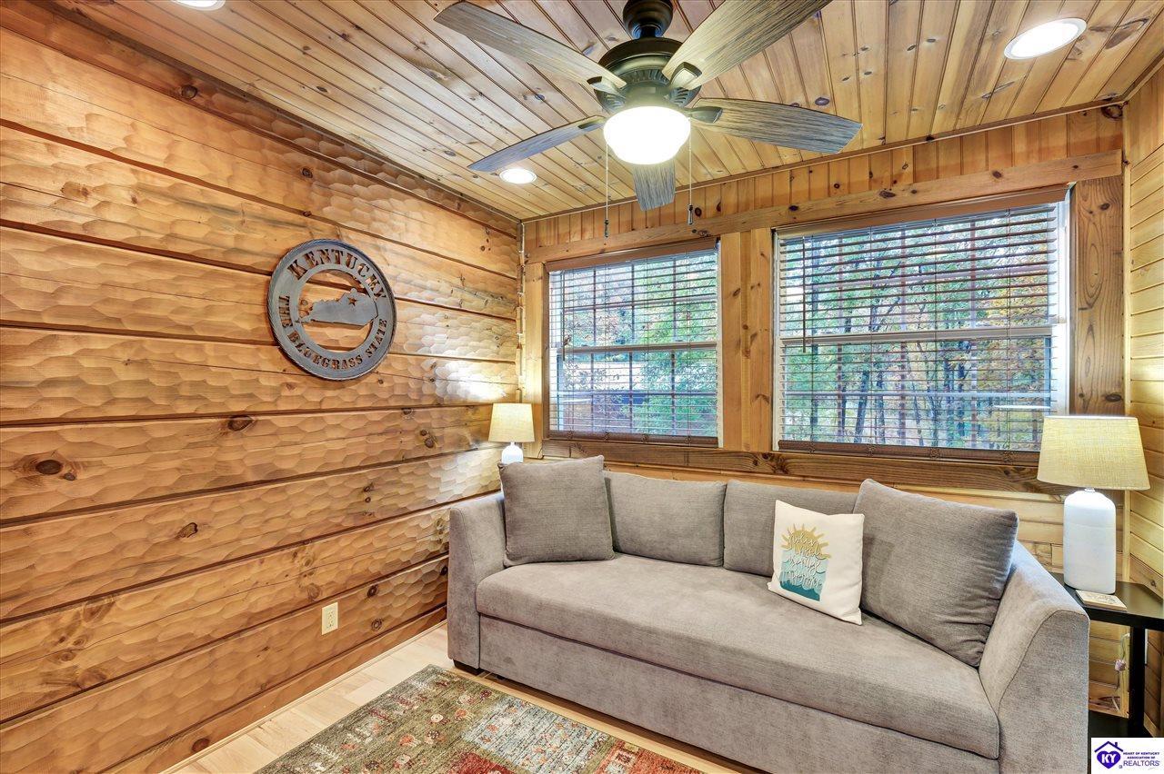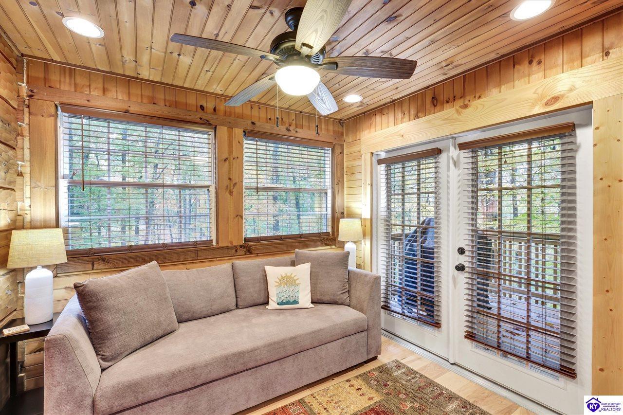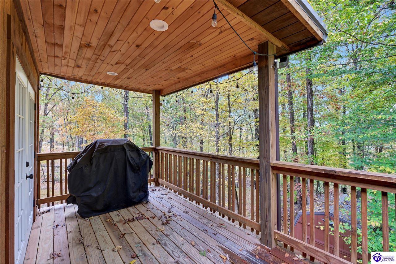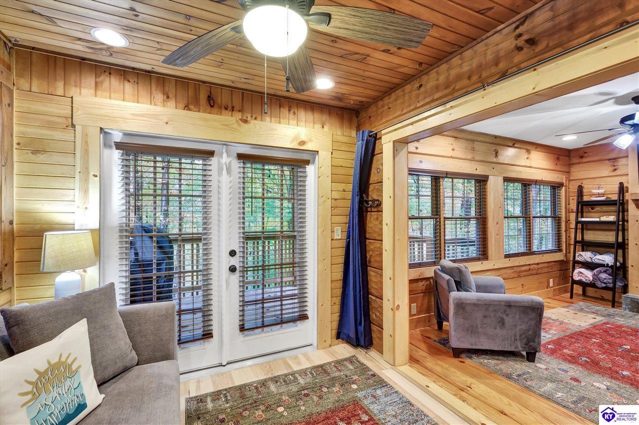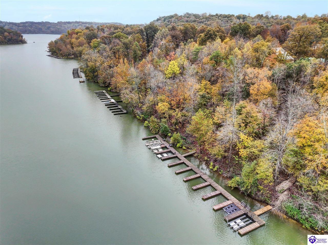 Realtor's notes: Welcome to your private log retreat at beautiful Nolin Lake! Nestled in the gated Michaels Cove Subdivision, this charming log home offers the perfect blend of rustic warmth and modern convenience. Relax on the inviting rocking chair front porch or enjoy peaceful lake evenings from the covered rear deck overlooking the wooded surroundings. Inside, the spacious kitchen with center island opens to the cozy family room and adjoining sleeping area, providing an open, cabin-style flow ideal for gatherings. The main level bedroom and full bath with a large garden tub make it easy to unwind after a fun filled day on the lake. The walkout lower level includes an additional bedroom, full bath, and laundry area—perfect for guests or extended stays. (Note: Bedrooms do not have closets and are More...non-conforming, though typical for the area.) Step outside to a covered lower deck, where you can still enjoy the great outdoors even when spring showers roll through. The detached garage with a full bath offers versatile space ideal for storing lake toys, taking a quick shower after time on the water, or transforming into a great party area for entertaining family and friends. The 10'x10' shed is perfect for extra storage. There is over 600 sq ft of decking and porch areas to enjoy the views. The home sits on two lots totaling 1.01 acres, offering privacy and space to relax. Your dock is just a short RTV ride away, and with the boat ramp and marina less than 1.5 miles away, lake days couldn't be more convenient. Dock will transfer with the Corp of Engineers approval. No rentals allowed, ensuring a peaceful neighborhood and protecting your investment. Start making lake memories to last a lifetime! Neighborhood info- https://webmasteroaklandhi.wixsite.com/mysite/bylaws-restrictions-1