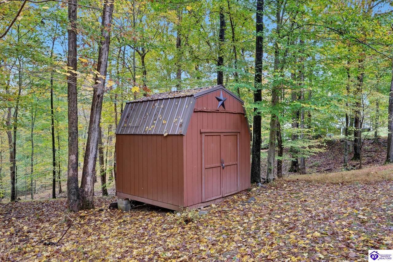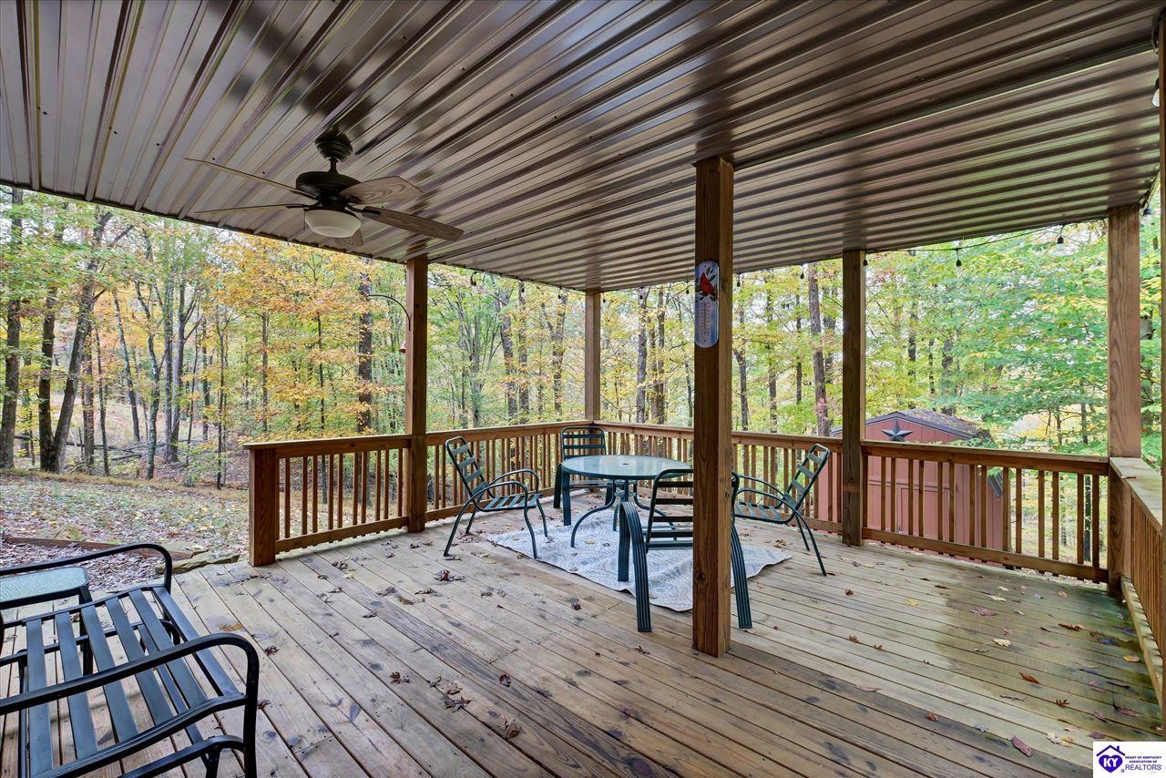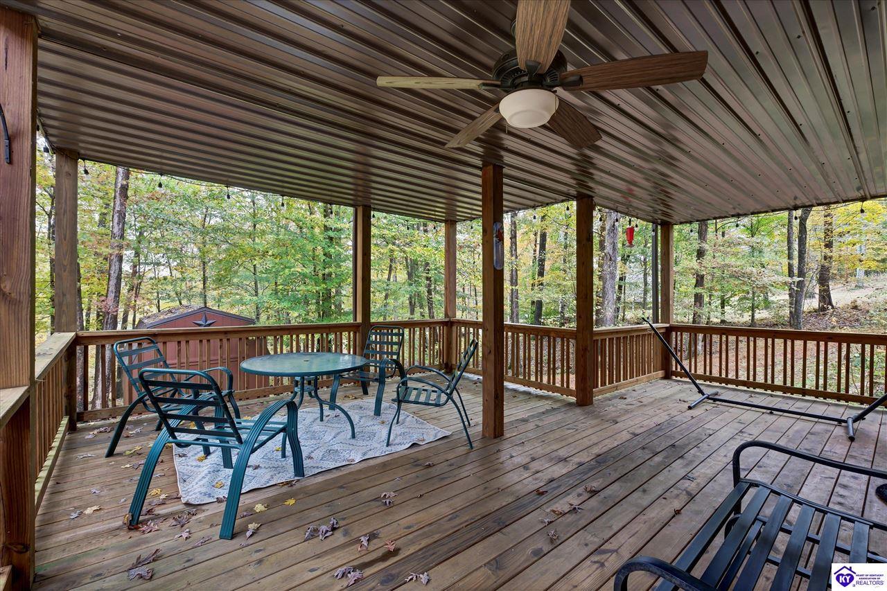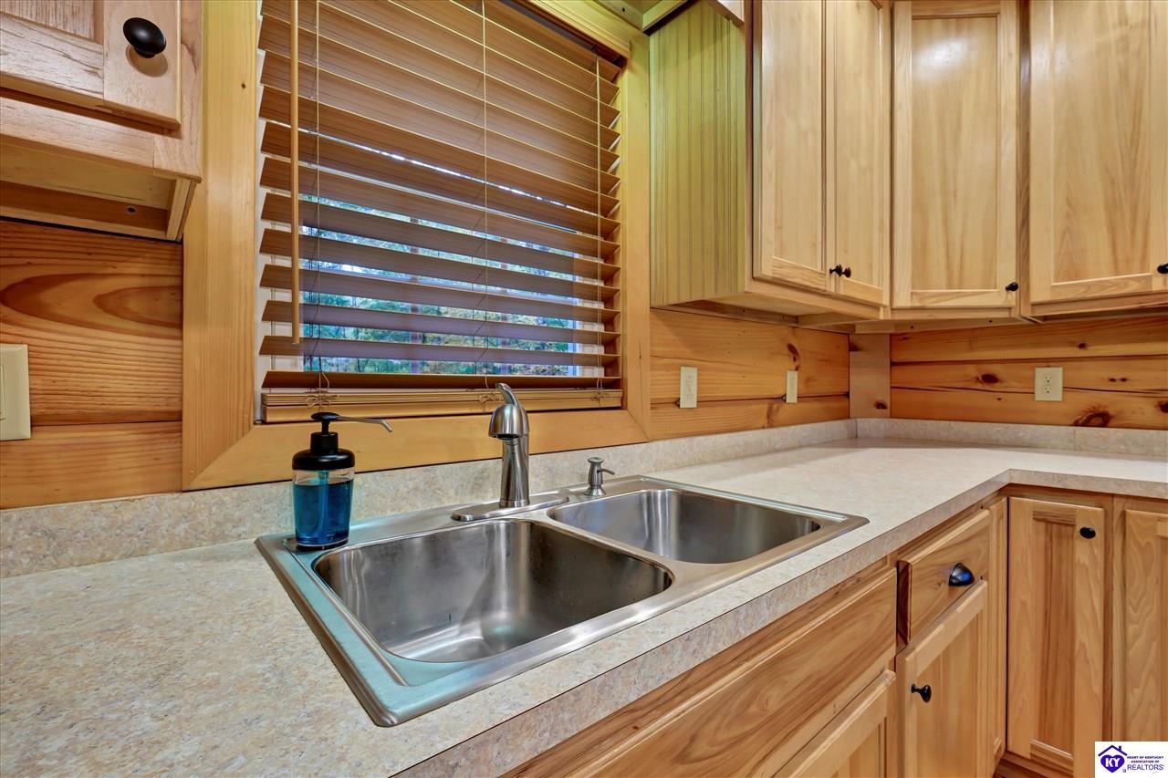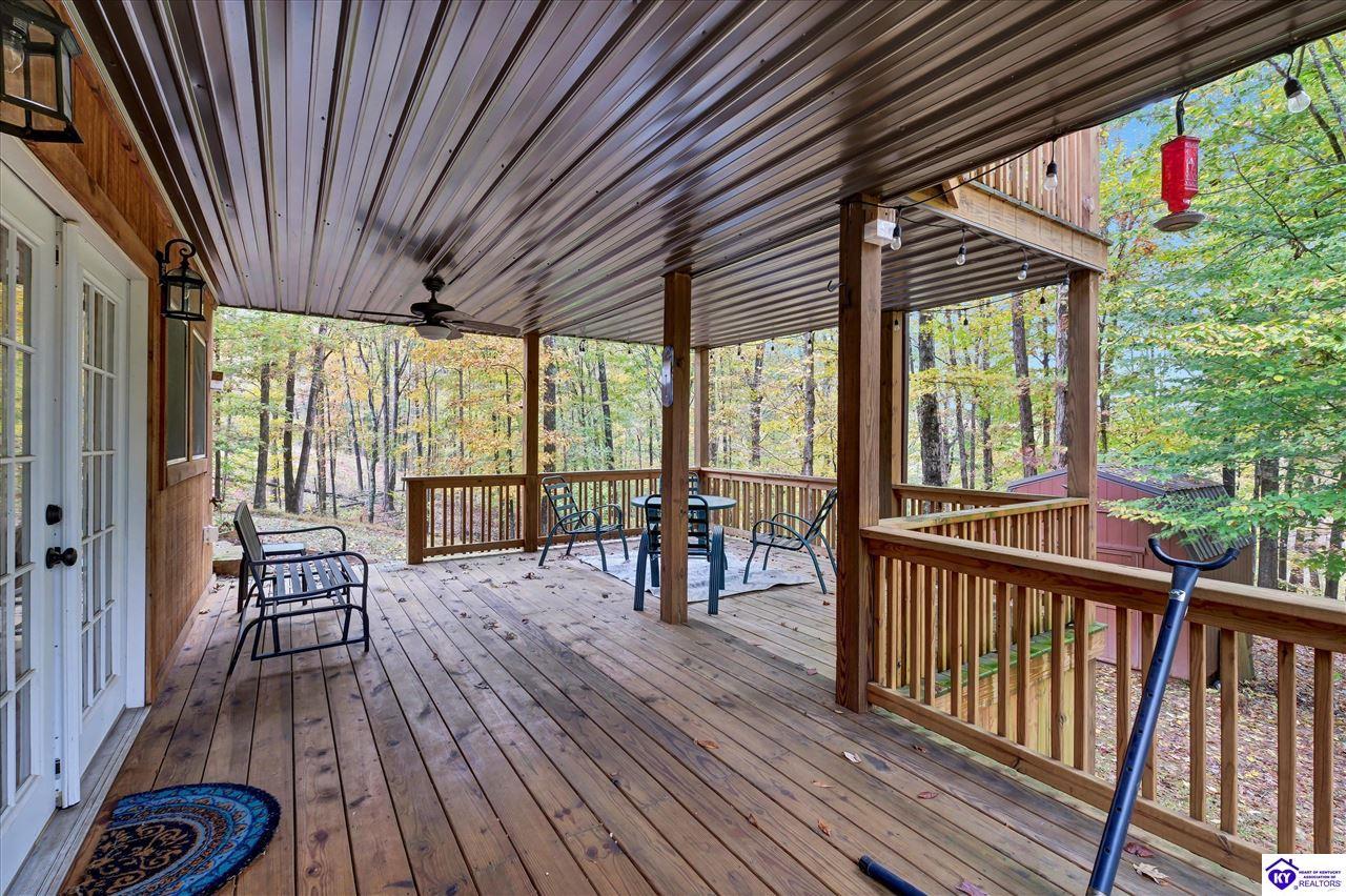 Realtor's notes: Welcome to your private log retreat at beautiful Nolin Lake! Nestled in the gated Michaels Cove Subdivision, this charming log home offers the perfect blend of rustic warmth and modern convenience. Relax on the inviting rocking chair front porch or enjoy peaceful lake evenings from the covered rear deck overlooking the wooded surroundings. Inside, the spacious kitchen with center island opens to the cozy family room and adjoining sleeping area, providing an open, cabin-style flow ideal for gatherings. The main level bedroom and full bath with a large garden tub make it easy to unwind after a fun filled day on the lake. The walkout lower level includes an additional bedroom, full bath, and laundry area—perfect for guests or extended stays. (Note: Bedrooms do not have closets and are More...non-conforming, though typical for the area.) Step outside to a covered lower deck, where you can still enjoy the great outdoors even when spring showers roll through. The detached garage with a full bath offers versatile space ideal for storing lake toys, taking a quick shower after time on the water, or transforming into a great party area for entertaining family and friends. The 10'x10' shed is perfect for extra storage. There is over 600 sq ft of decking and porch areas to enjoy the views. The home sits on two lots totaling 1.01 acres, offering privacy and space to relax. Your dock is just a short RTV ride away, and with the boat ramp and marina less than 1.5 miles away, lake days couldn't be more convenient. Dock will transfer with the Corp of Engineers approval. No rentals allowed, ensuring a peaceful neighborhood and protecting your investment. Start making lake memories to last a lifetime! Neighborhood info- https://webmasteroaklandhi.wixsite.com/mysite/bylaws-restrictions-1